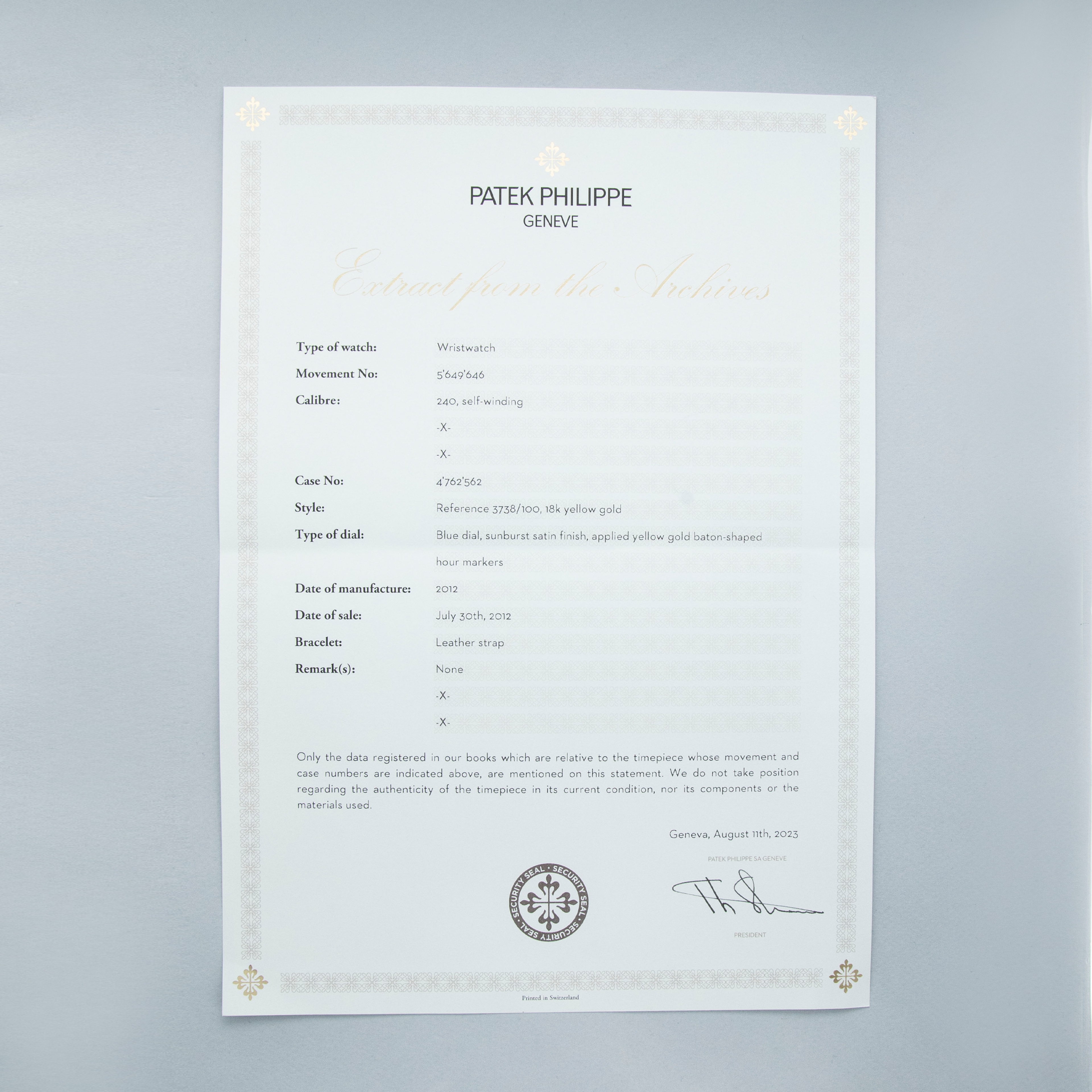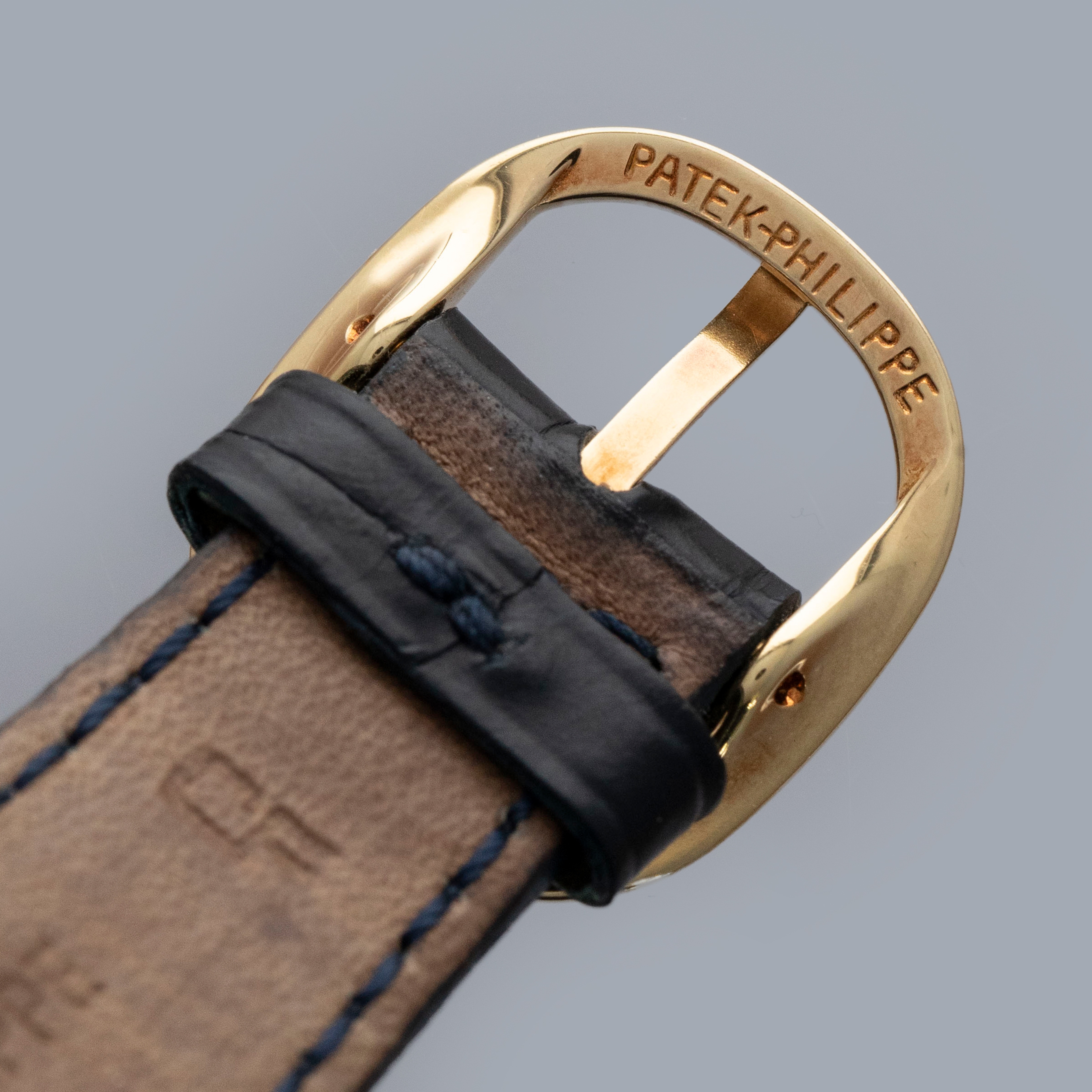 The watch is in overall excellent condition. The yellow gold case has some light marks and scratches, with additional light scratches visible on the case back. The blue dial is near-mint and the hands are very clean. It is fitted with a blue Patek Philippe alligator strap and a yellow gold Ellipse buckle in excellent condition. The watch is accompanied by a Patek Philippe Archive Extract.