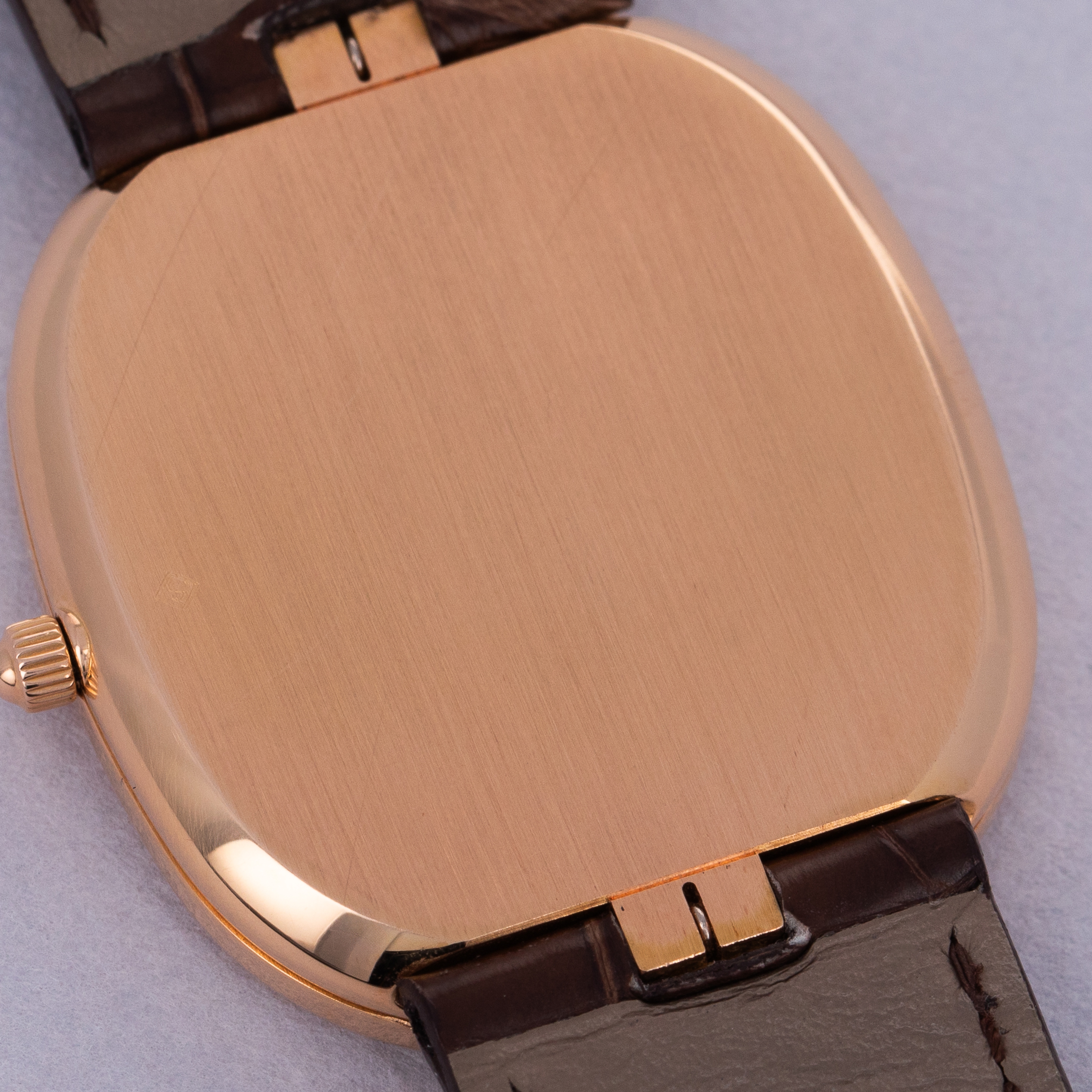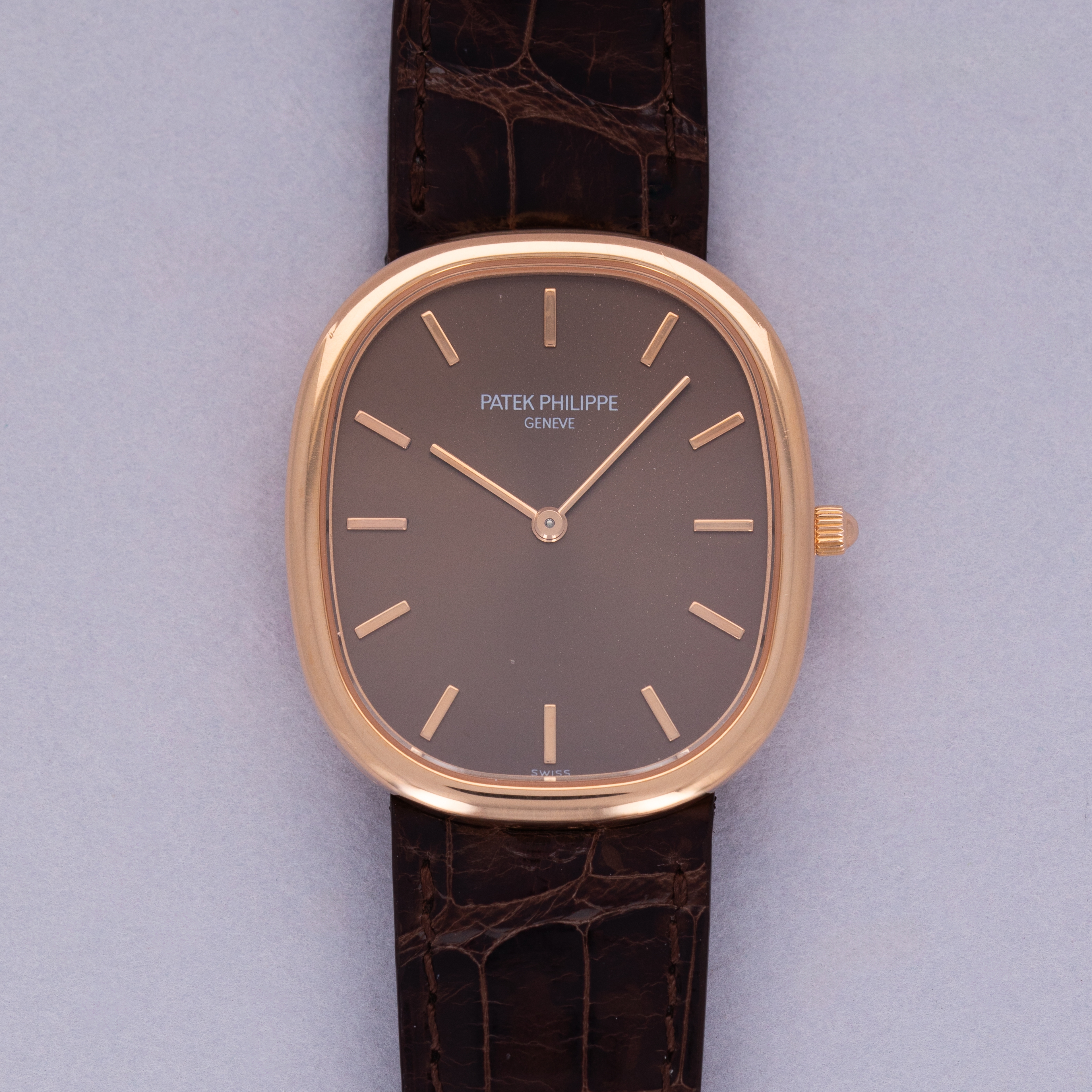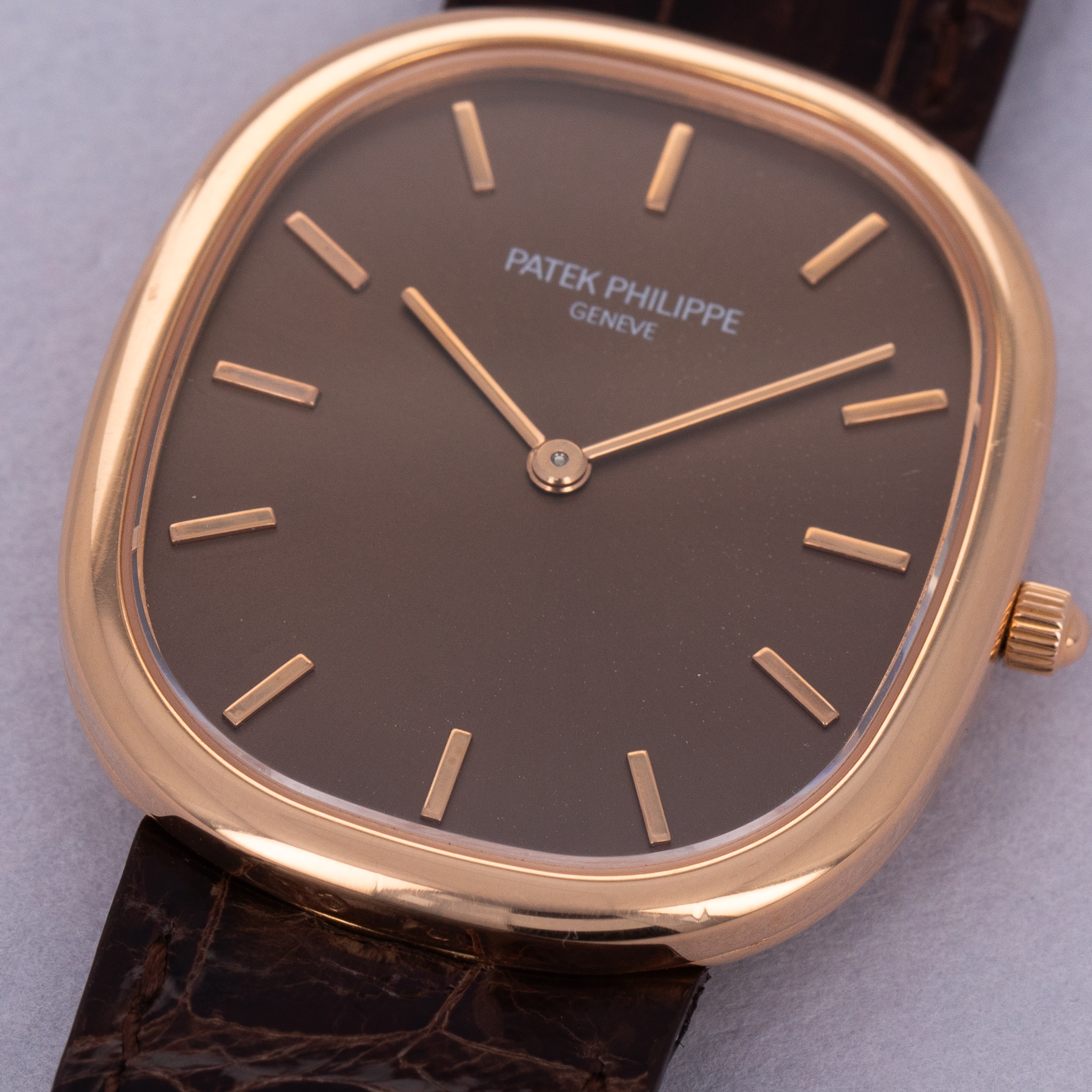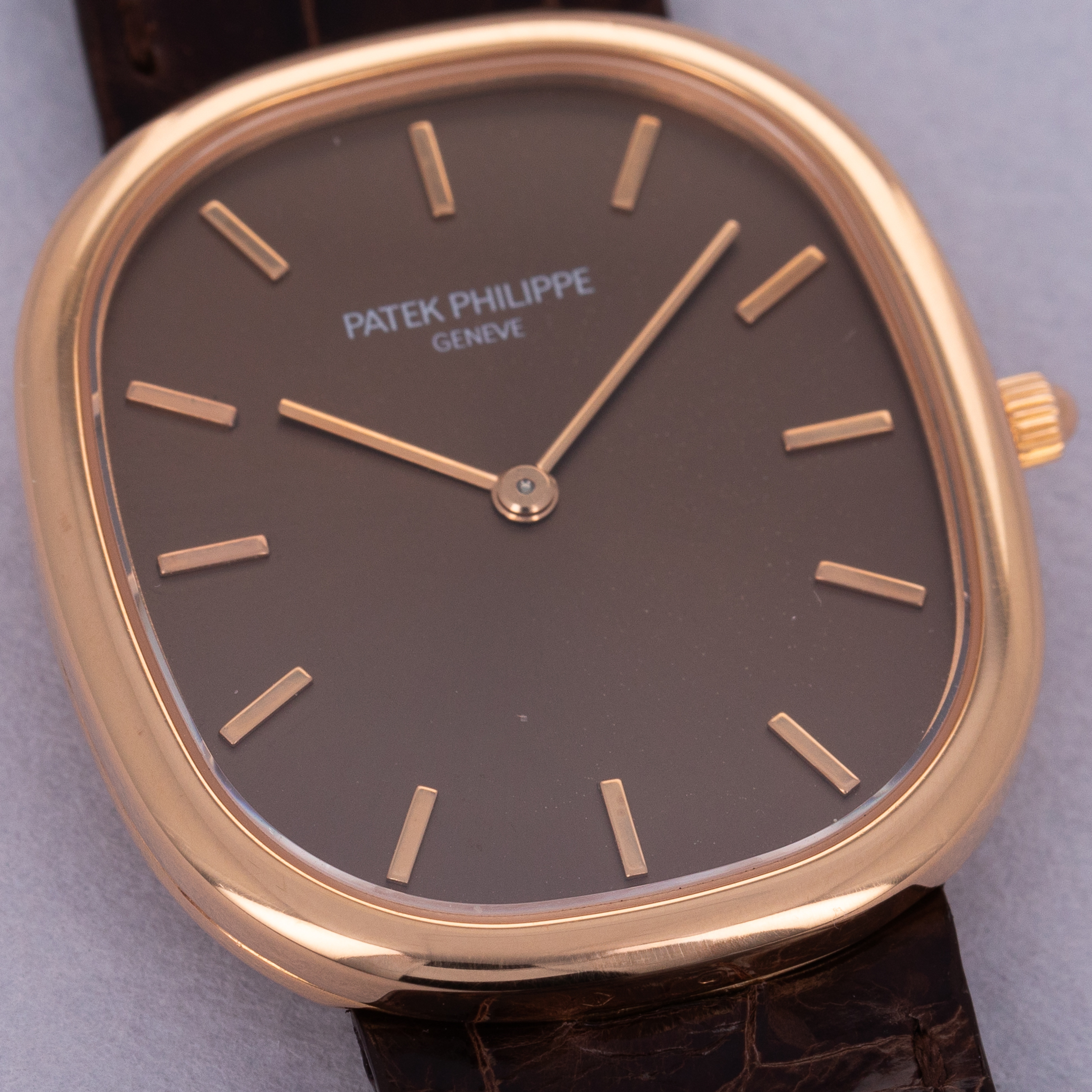 Released in 1970, two years after the introduction of the Ellipse collection to Patek's roster, the Golden Ellipse collection featured a larger and more prominent case design that coincided with the evolution of style occurring at the time as watches slowly began to grow out of the dainty cases they had been kept within. Produced from 1978 until 2009 and offered in multiple dial colors, materials and configurations, the ref. 3738 was, and still is, a naturally varied timepiece that speaks to just as wide a diaspora of collectors today as it did back in the day. Offered with a brown sunburst dial, the ref. 3738 that we have here features only rose gold in its hands and baton hour markers, which match the 18kt rose gold case that they find themselves within. Fitted with one of the thinnest automatic movements on the market at the time, the cal. 240, the ref. 3738 boasts a wonderfully thin and easily wearable profile to compound upon its classy aesthetic and operate as a splendid dress watch today, just as it did in the 1970s.