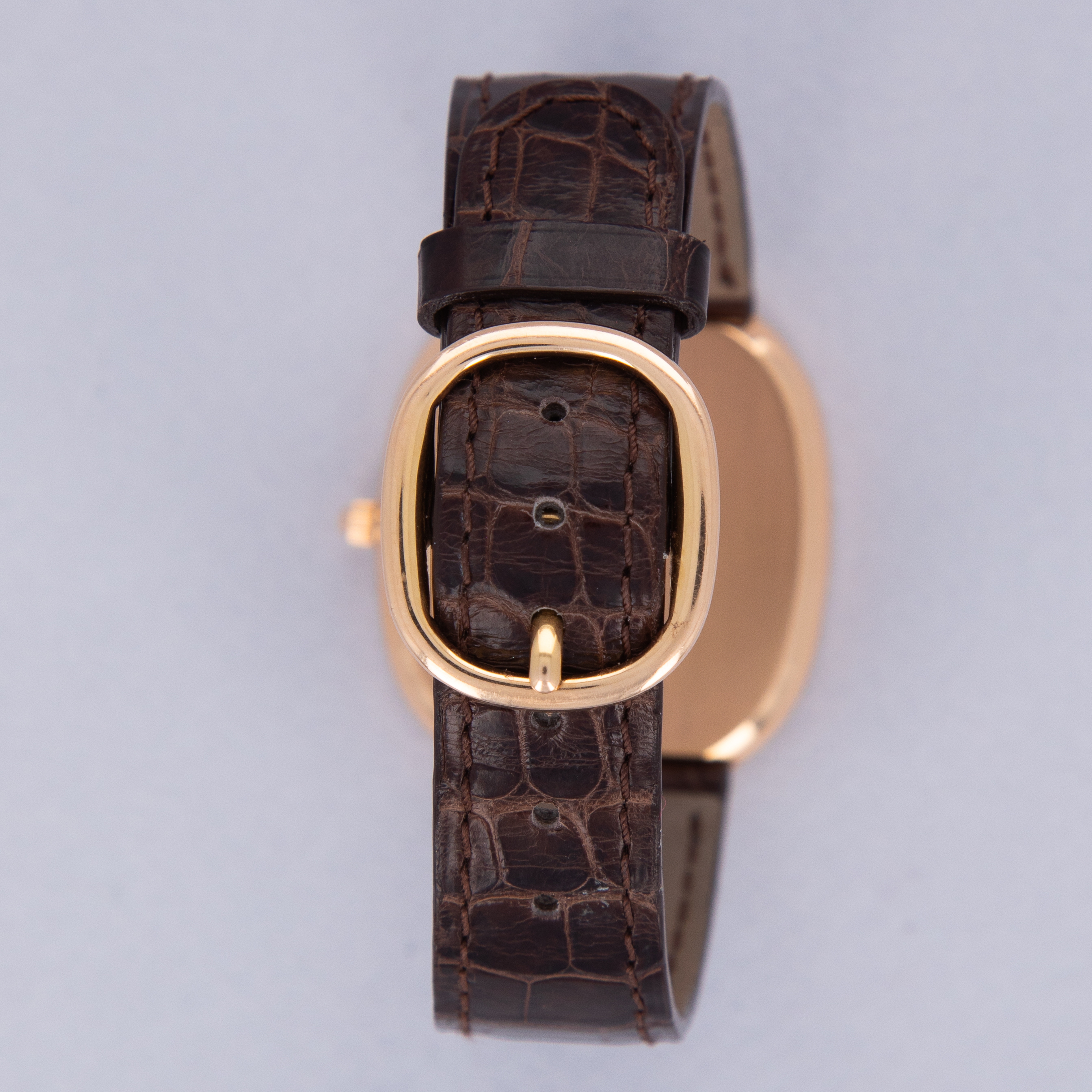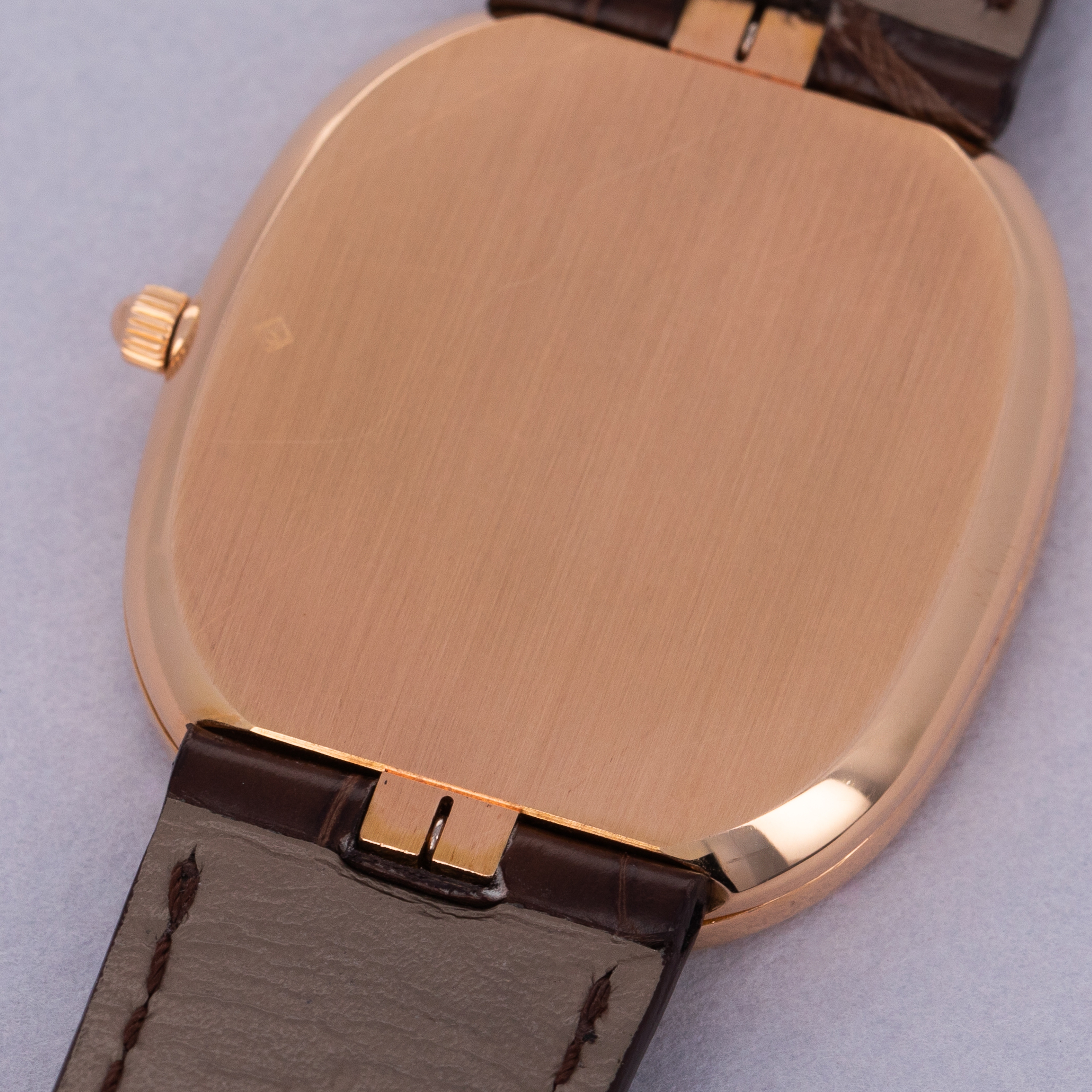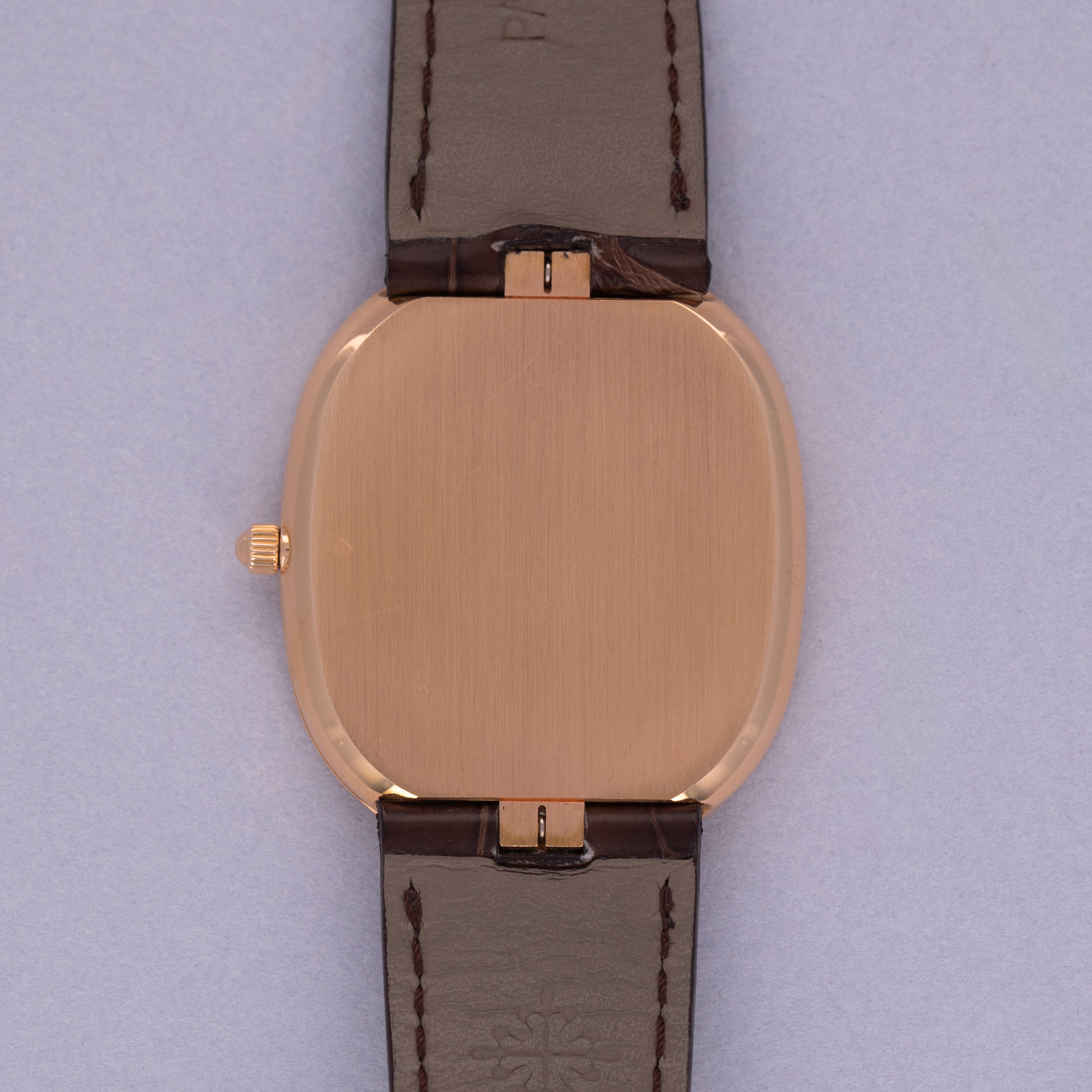 Released in 1970, two years after the introduction of the Ellipse collection to Patek's roster, the Golden Ellipse collection featured a larger and more prominent case design that coincided with the evolution of style occurring at the time as watches slowly began to grow out of the dainty cases they had been kept within. Produced from 1978 until 2009 and offered in multiple dial colors, materials and configurations, the ref. 3738 was, and still is, a naturally varied timepiece that speaks to just as wide a diaspora of collectors today as it did back in the day. Offered with a brown sunburst dial, the ref. 3738 that we have here features only rose gold in its hands and baton hour markers, which match the 18kt rose gold case that they find themselves within. Fitted with one of the thinnest automatic movements on the market at the time, the cal. 240, the ref. 3738 boasts a wonderfully thin and easily wearable profile to compound upon its classy aesthetic and operate as a splendid dress watch today, just as it did in the 1970s.