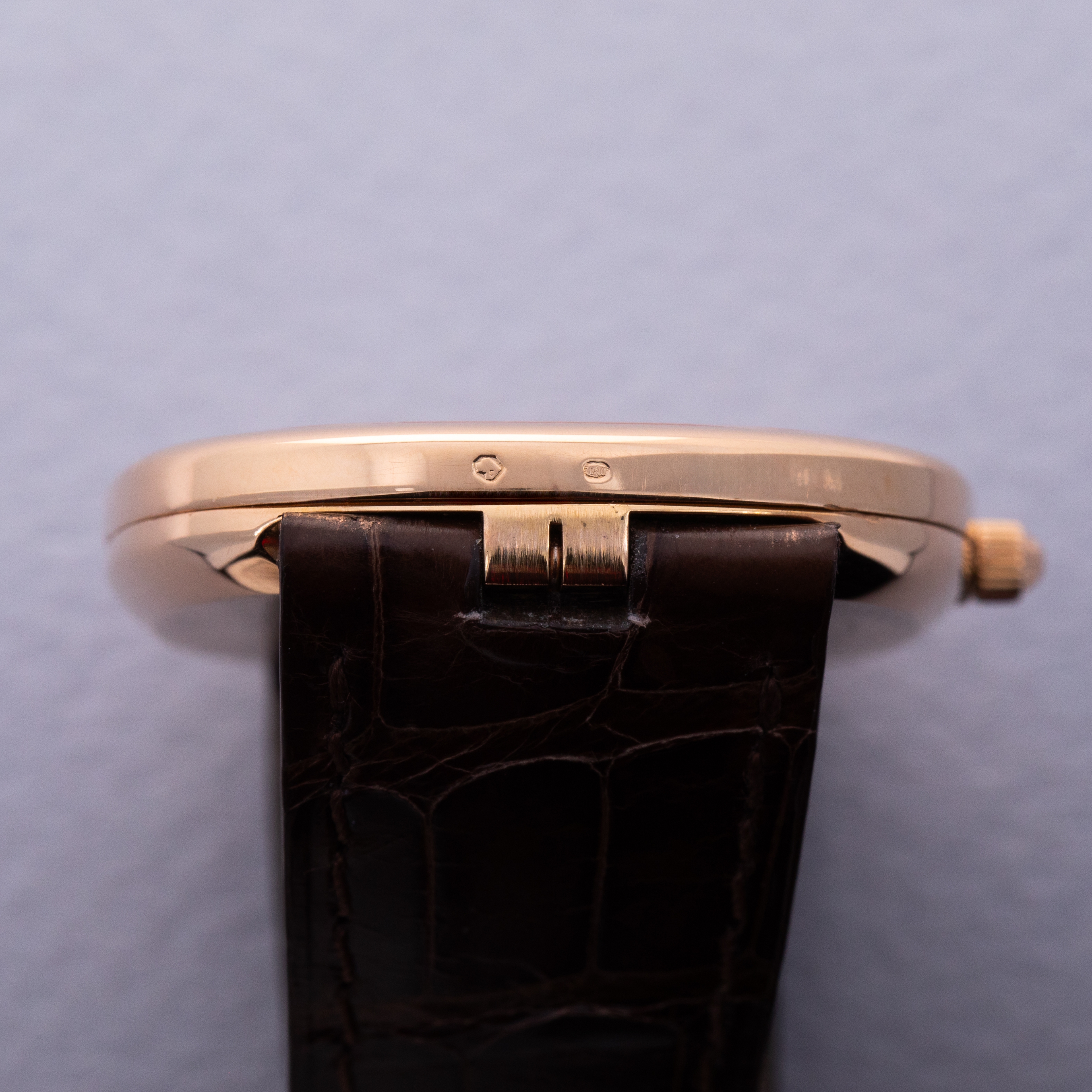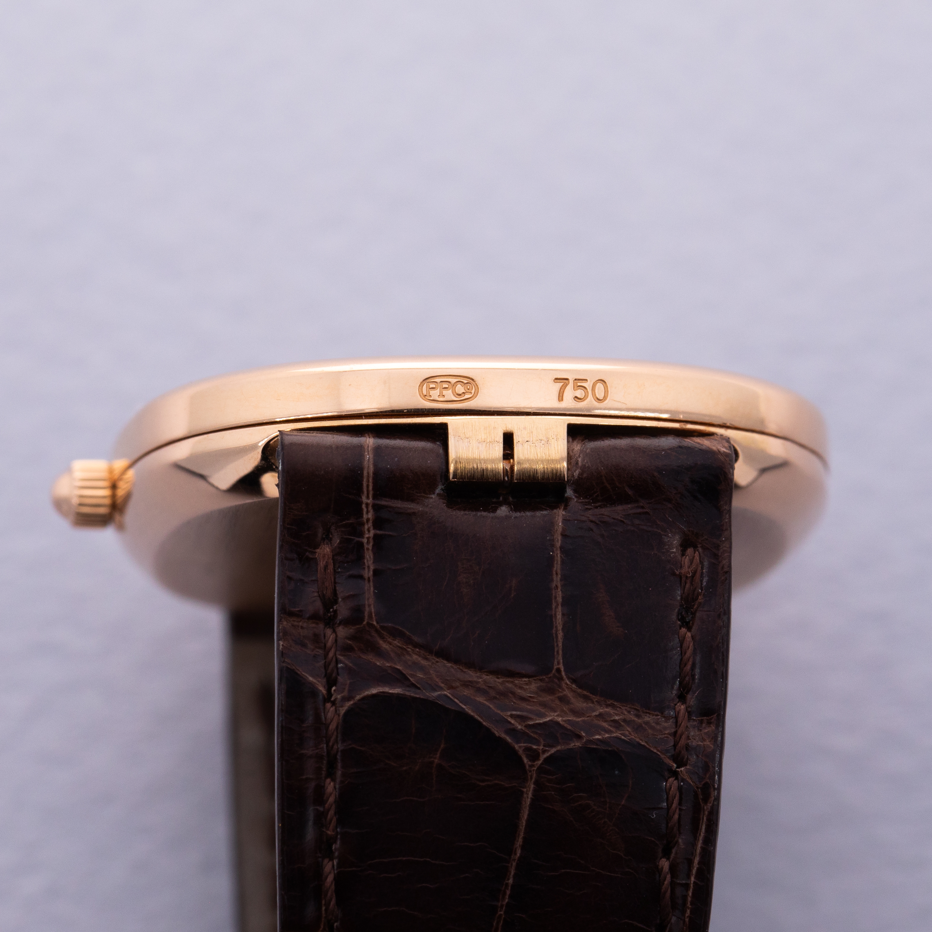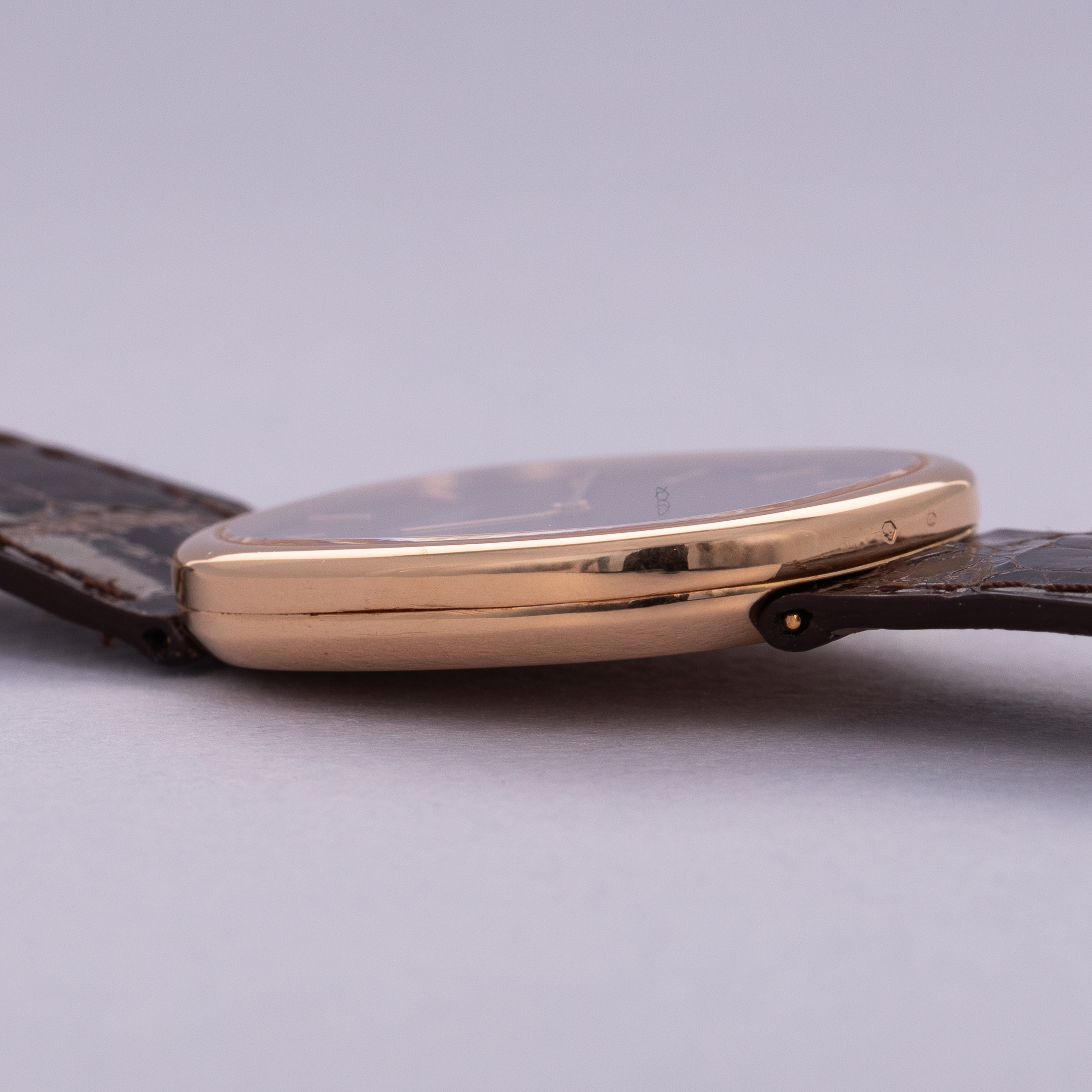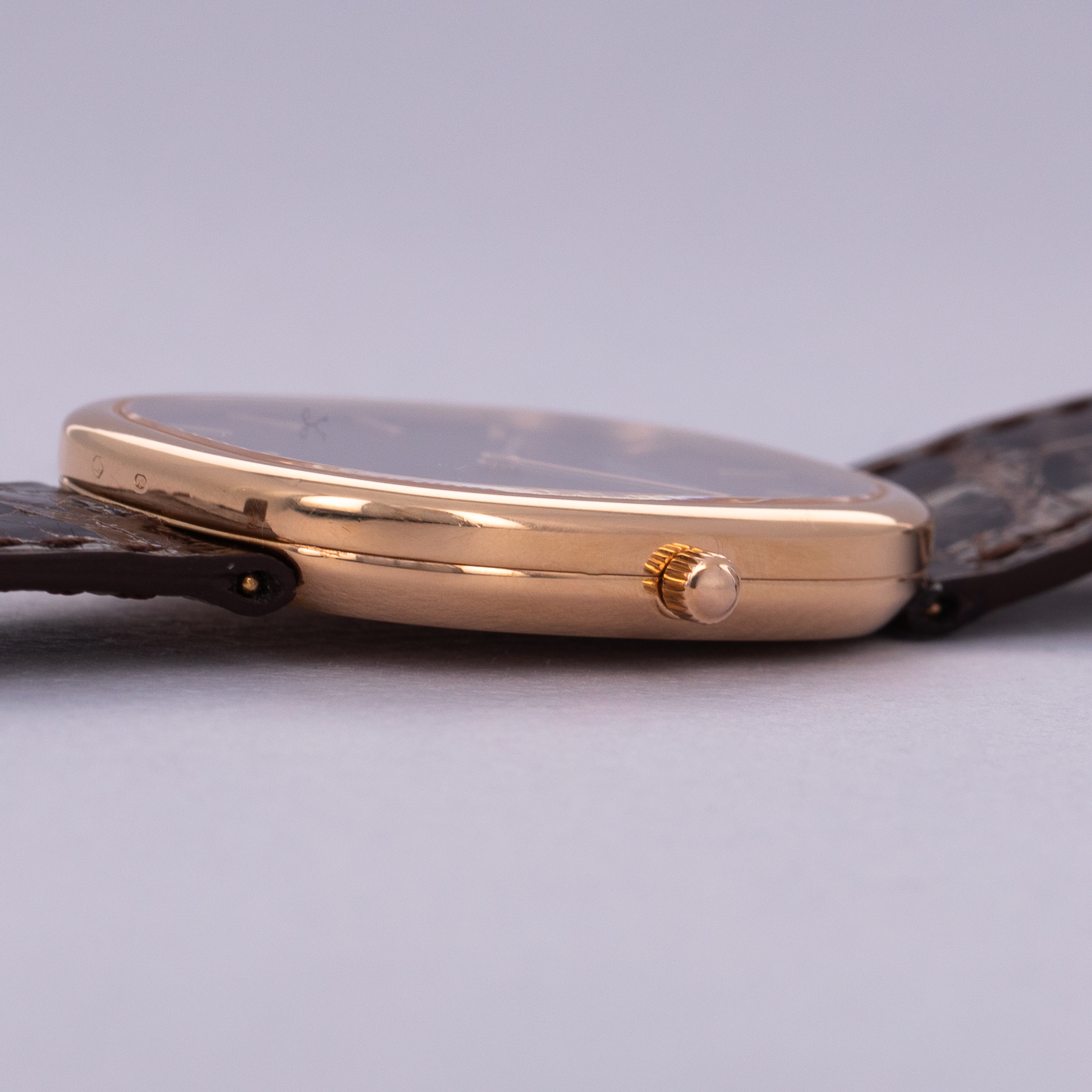 Released in 1970, two years after the introduction of the Ellipse collection to Patek's roster, the Golden Ellipse collection featured a larger and more prominent case design that coincided with the evolution of style occurring at the time as watches slowly began to grow out of the dainty cases they had been kept within. Produced from 1978 until 2009 and offered in multiple dial colors, materials and configurations, the ref. 3738 was, and still is, a naturally varied timepiece that speaks to just as wide a diaspora of collectors today as it did back in the day. Offered with a brown sunburst dial, the ref. 3738 that we have here features only rose gold in its hands and baton hour markers, which match the 18kt rose gold case that they find themselves within. Fitted with one of the thinnest automatic movements on the market at the time, the cal. 240, the ref. 3738 boasts a wonderfully thin and easily wearable profile to compound upon its classy aesthetic and operate as a splendid dress watch today, just as it did in the 1970s.