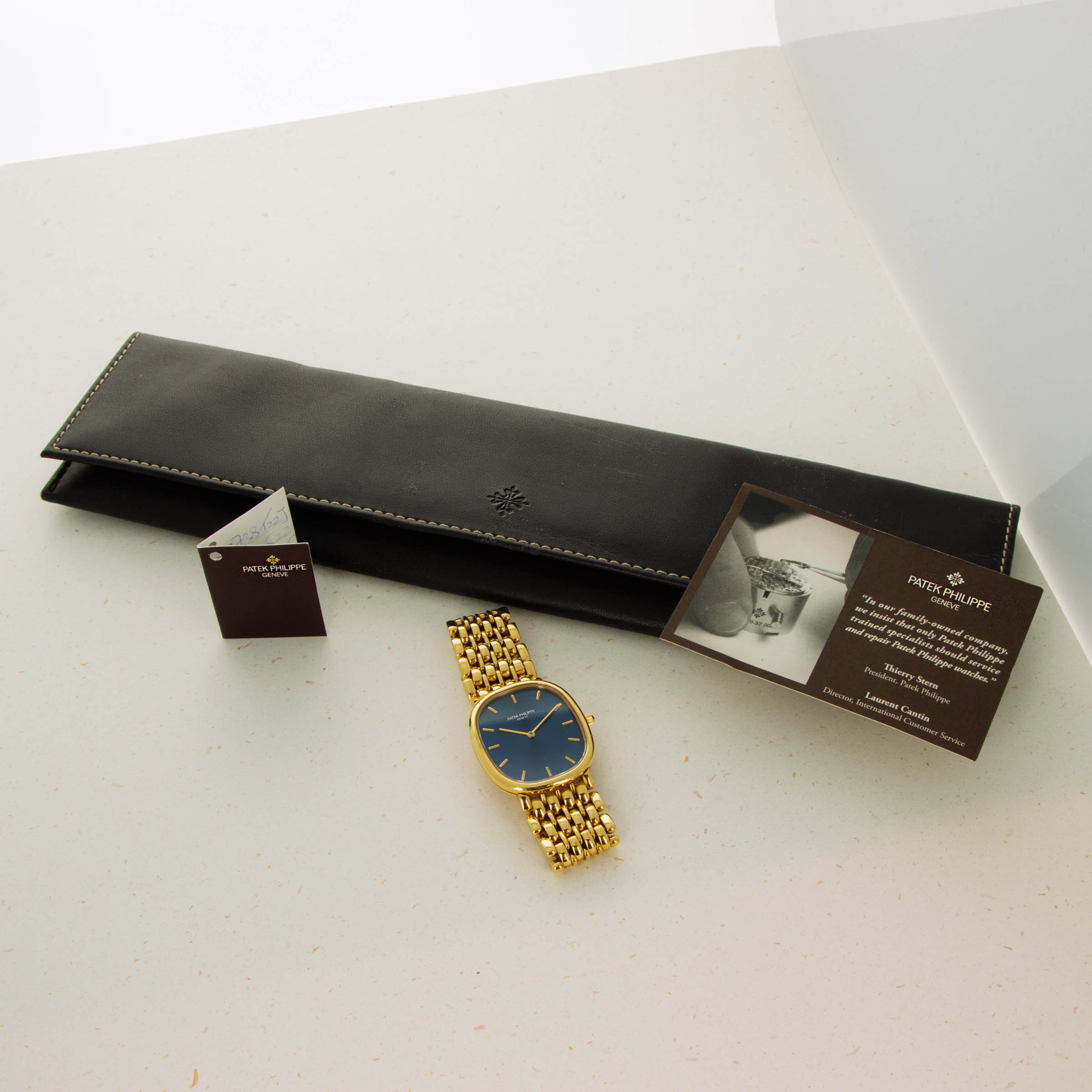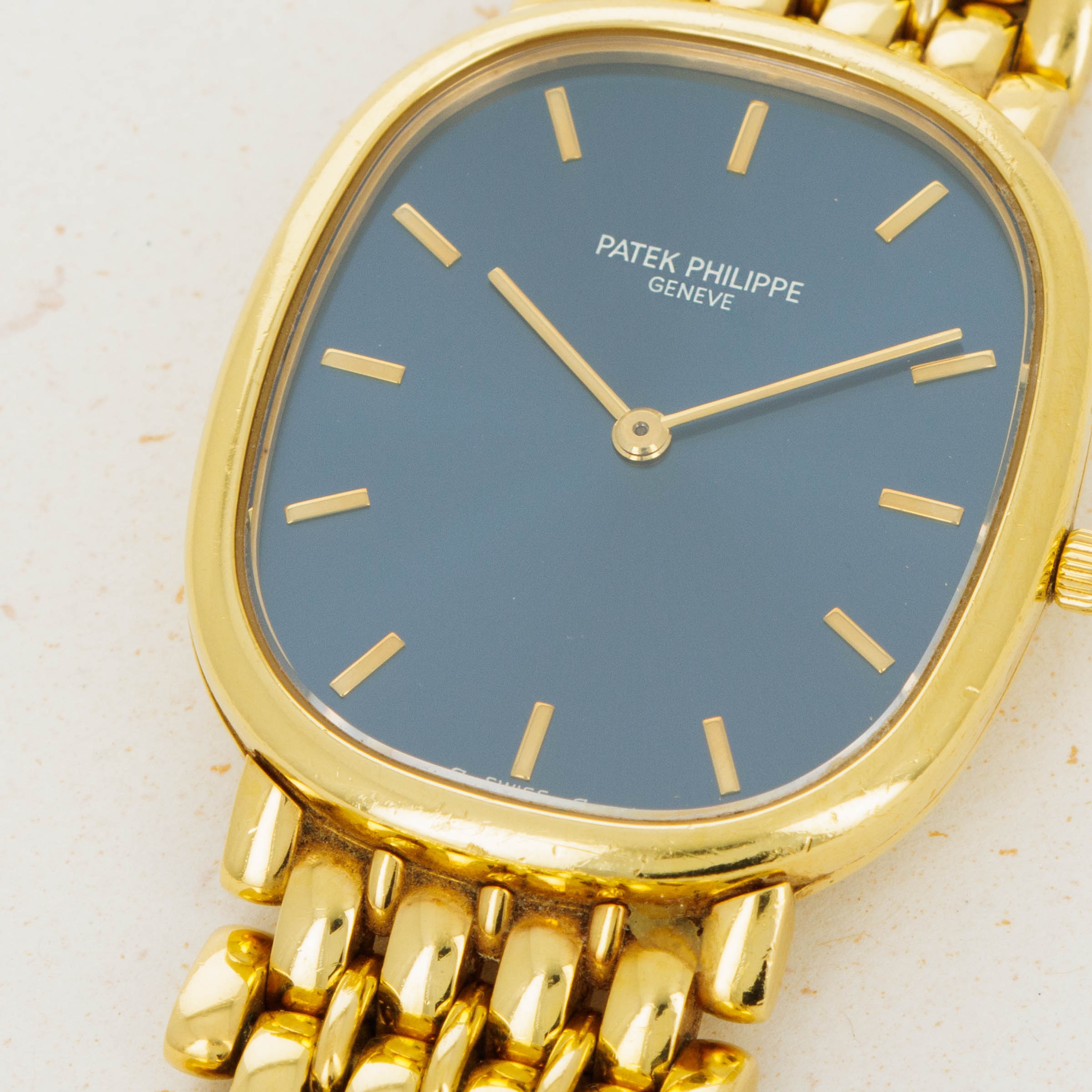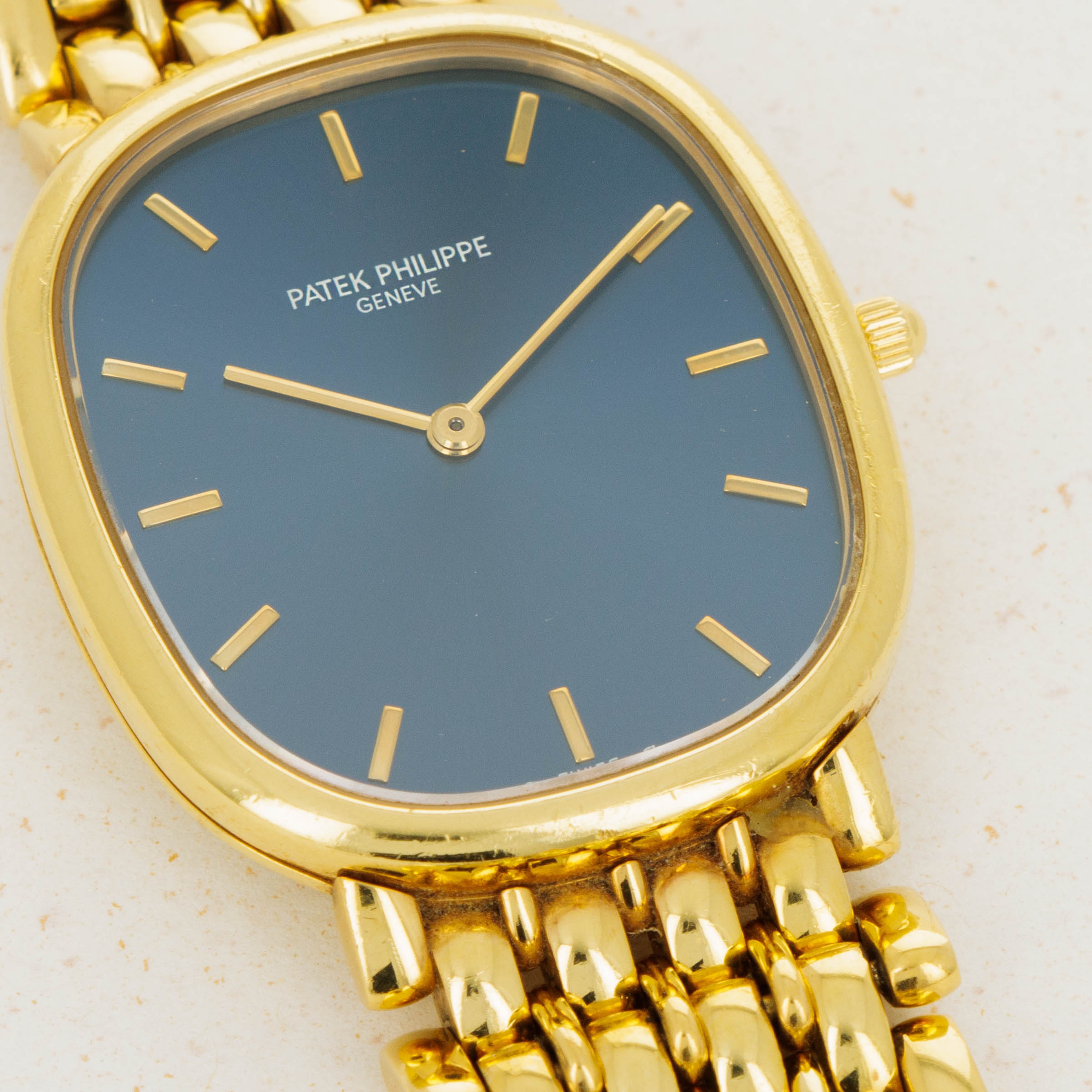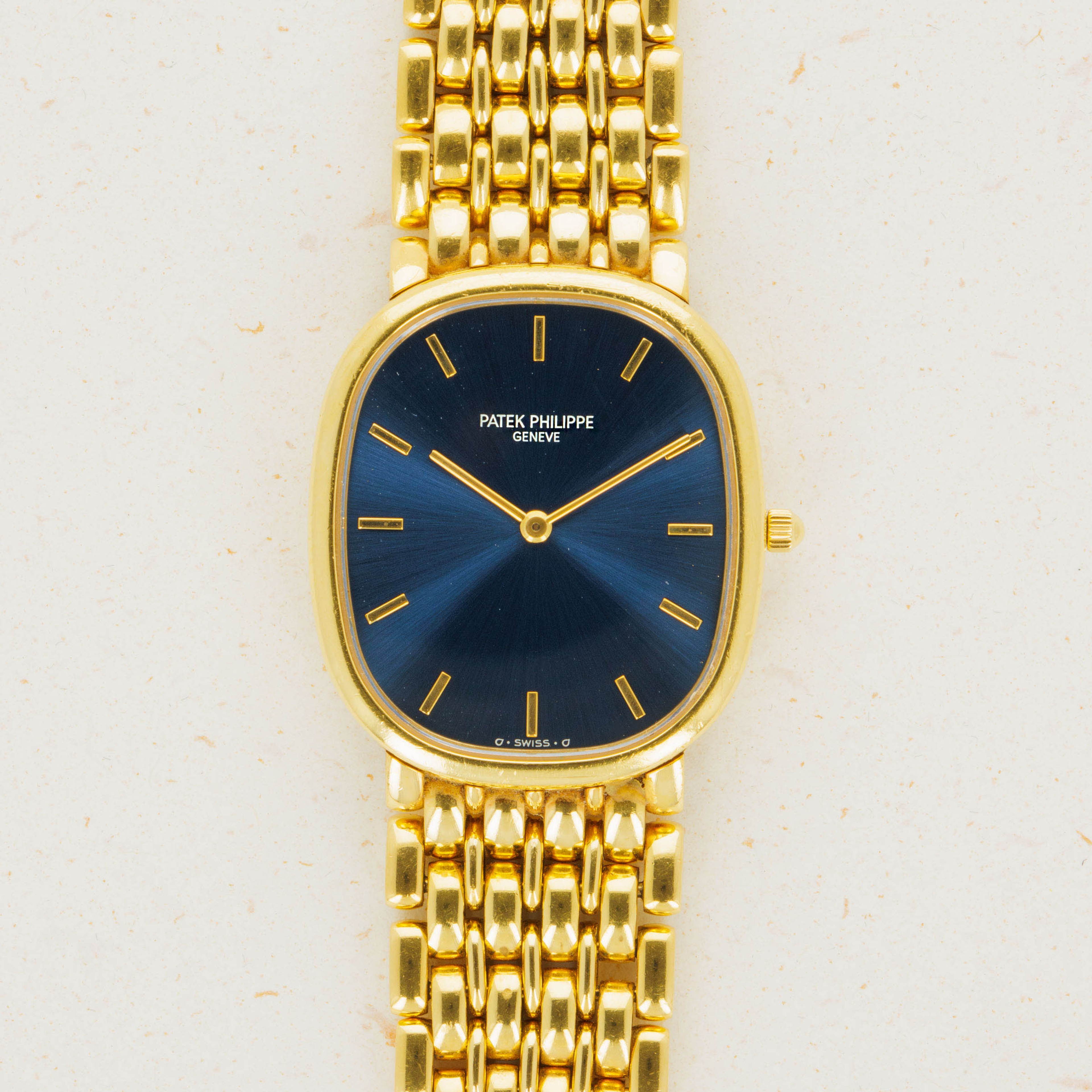 Released in 1970, two years after the introduction of the Ellipse collection to Patek's roster, the Golden Ellipse collection featured a larger and more prominent case design that coincided with the evolution of style occurring at the time as watches slowly began to grow out of the dainty cases they had been kept within. Launched in 1978 and offered in multiple dial colors, materials and configurations, the ref. 3738 was, and still is, a naturally varied timepiece that speaks to just as wide a diaspora of collectors today as it did back in the day. Offered with its blue “Sigma” dial, the ref. 3738 that we have here features only yellow gold in its hands and baton hour markers, making it a collectable timepiece for its tarnish and rust-resistant qualities. Fitted with one of the thinnest automatic movements on the market at the time, the cal. 240, the ref. 3738 boasts a wonderfully thin and easily wearable profile to compound upon its classy aesthetic and operate as a splendid dress watch today, just as it did in the 1970s. Alongside its wearable proportions, the example we have here also sits on a wonderfully ornate 18kt yellow gold bracelet that only compounds upon its luxurious aesthetic and sets it apart as a truly luxurious timepiece.