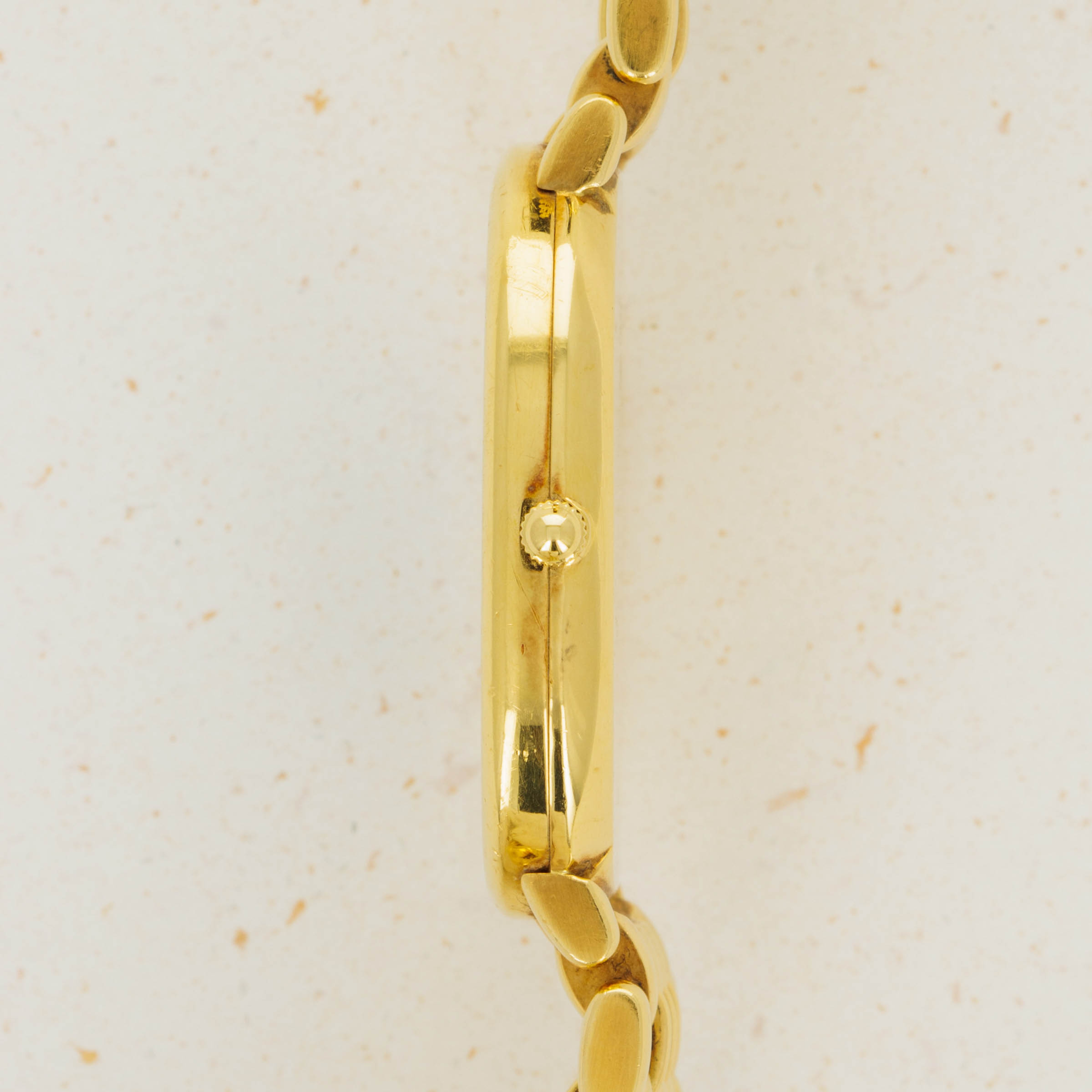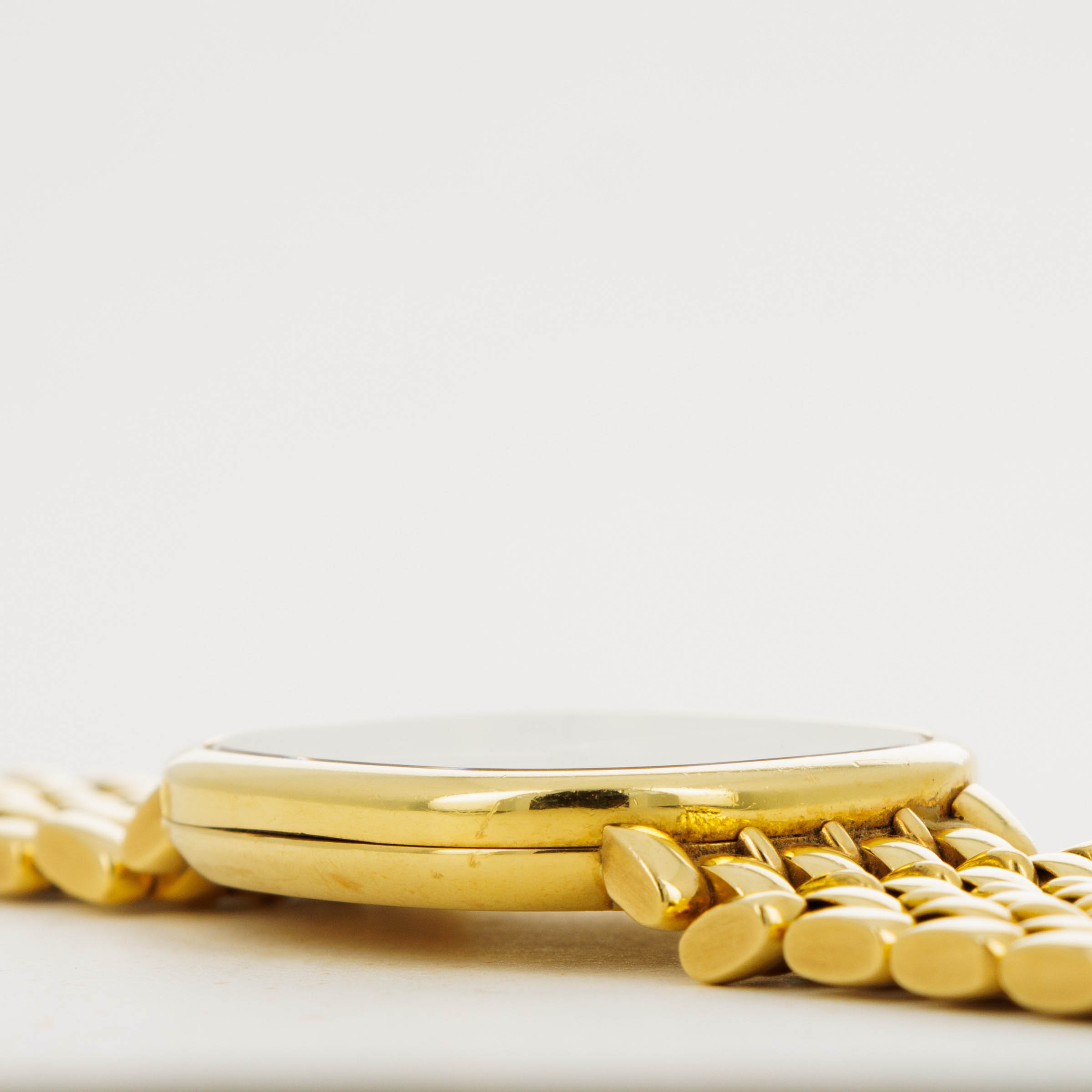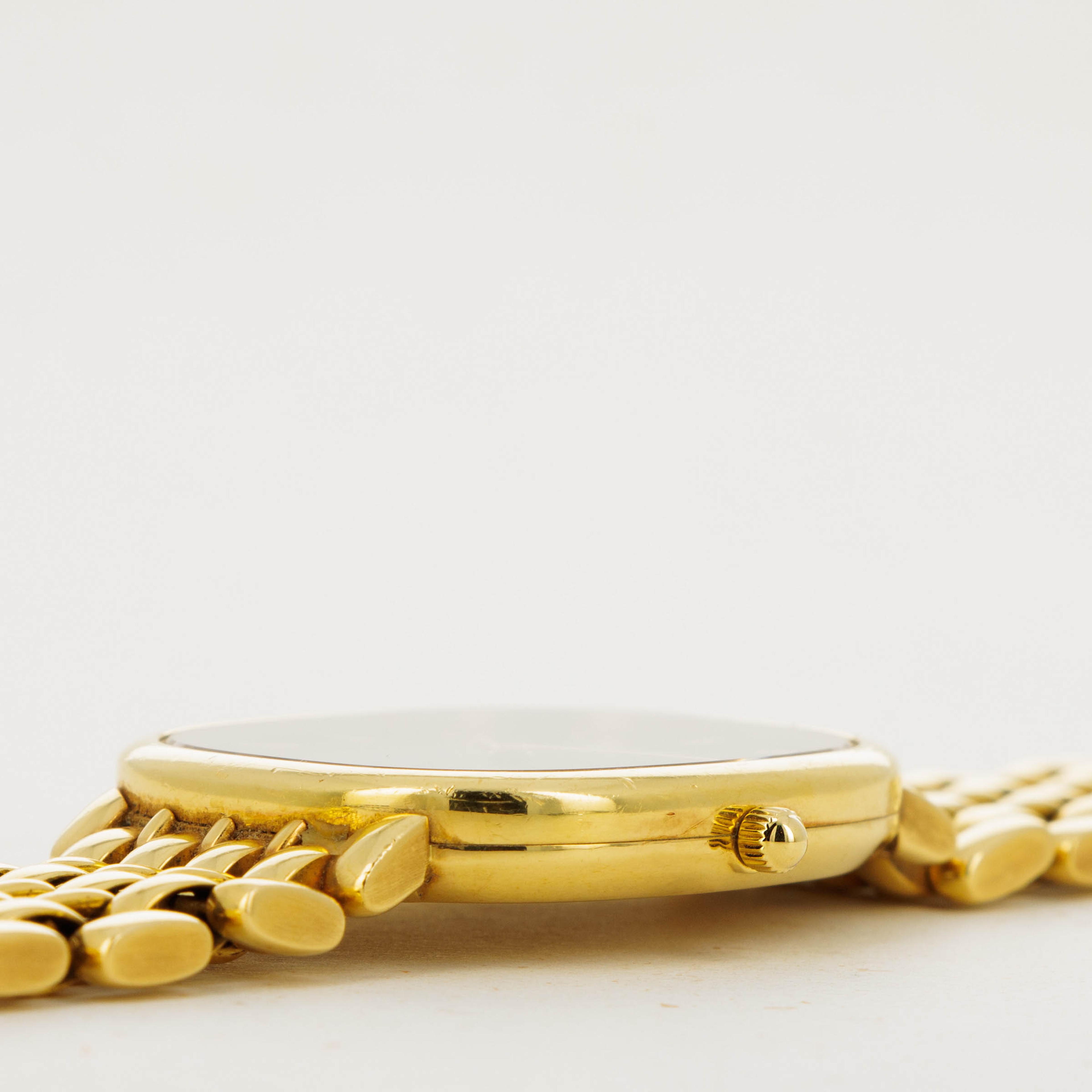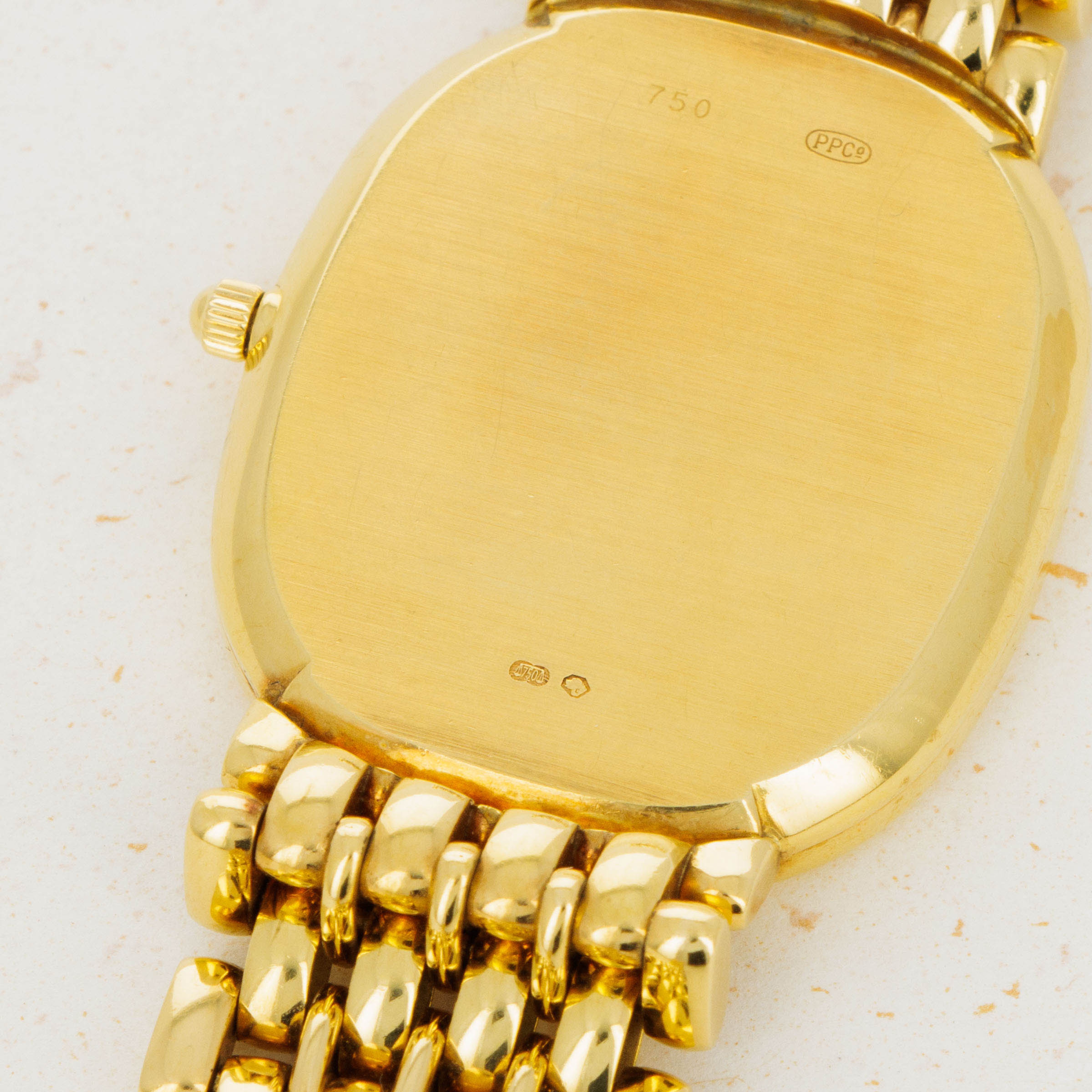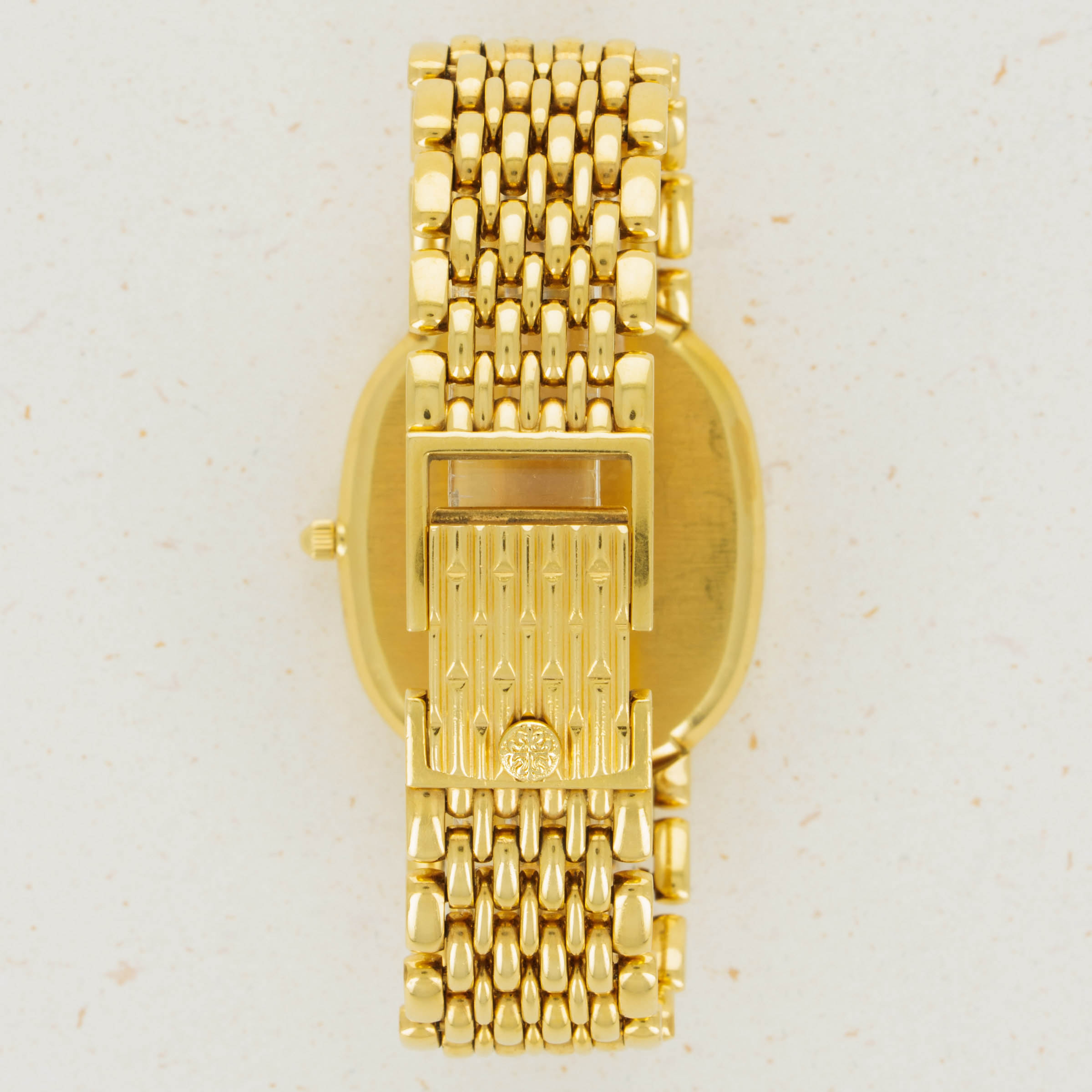 Released in 1970, two years after the introduction of the Ellipse collection to Patek's roster, the Golden Ellipse collection featured a larger and more prominent case design that coincided with the evolution of style occurring at the time as watches slowly began to grow out of the dainty cases they had been kept within. Launched in 1978 and offered in multiple dial colors, materials and configurations, the ref. 3738 was, and still is, a naturally varied timepiece that speaks to just as wide a diaspora of collectors today as it did back in the day. Offered with its blue “Sigma” dial, the ref. 3738 that we have here features only yellow gold in its hands and baton hour markers, making it a collectable timepiece for its tarnish and rust-resistant qualities. Fitted with one of the thinnest automatic movements on the market at the time, the cal. 240, the ref. 3738 boasts a wonderfully thin and easily wearable profile to compound upon its classy aesthetic and operate as a splendid dress watch today, just as it did in the 1970s. Alongside its wearable proportions, the example we have here also sits on a wonderfully ornate 18kt yellow gold bracelet that only compounds upon its luxurious aesthetic and sets it apart as a truly luxurious timepiece.