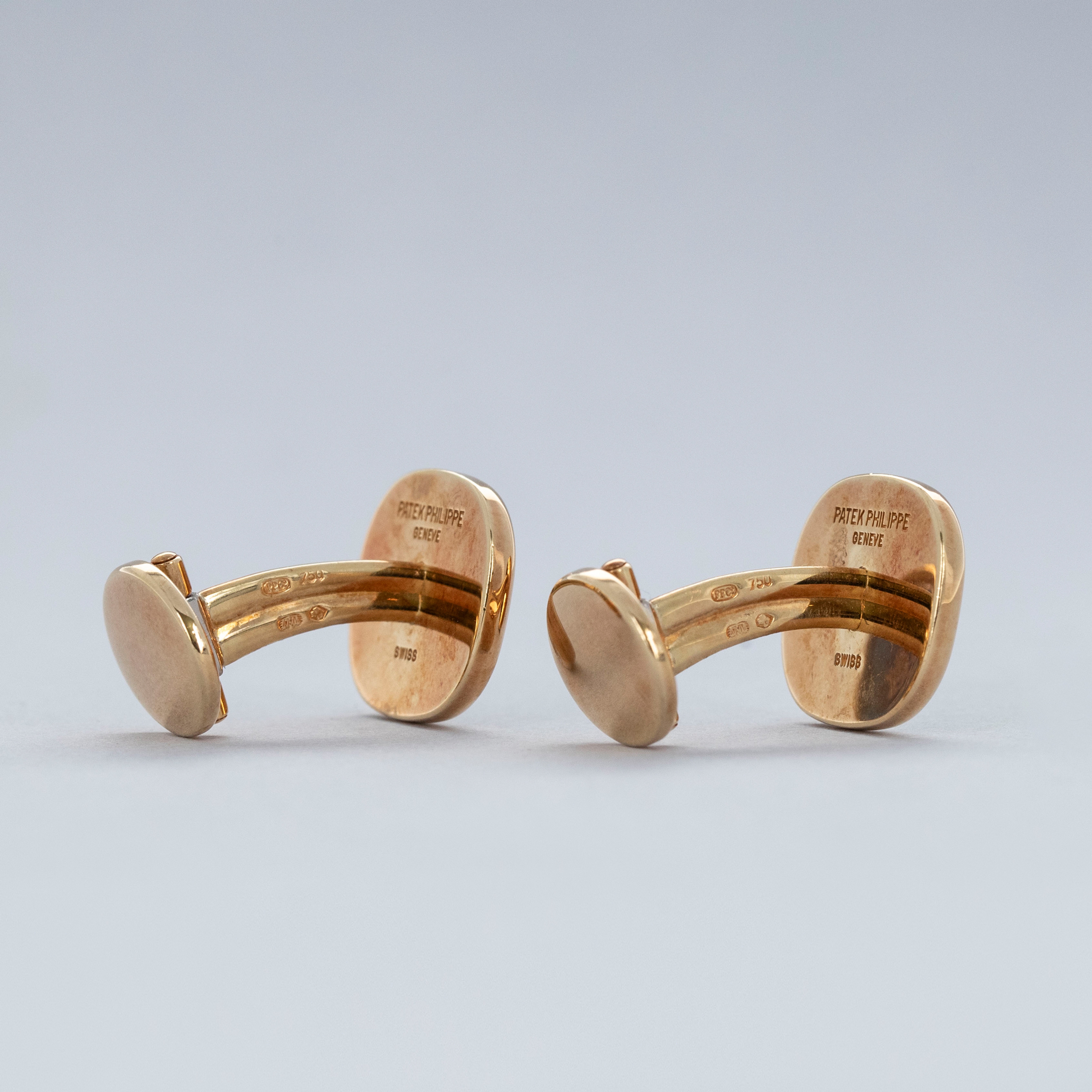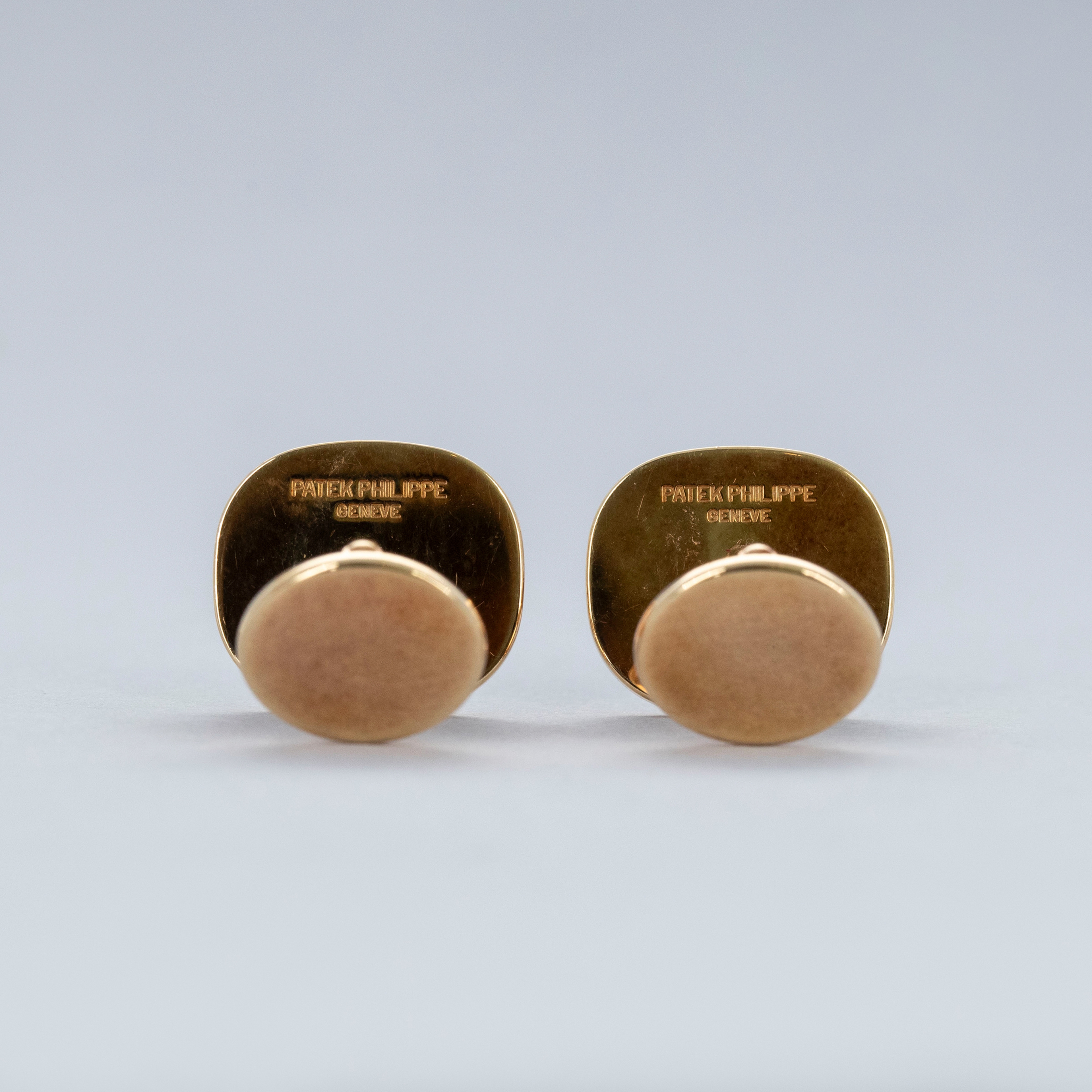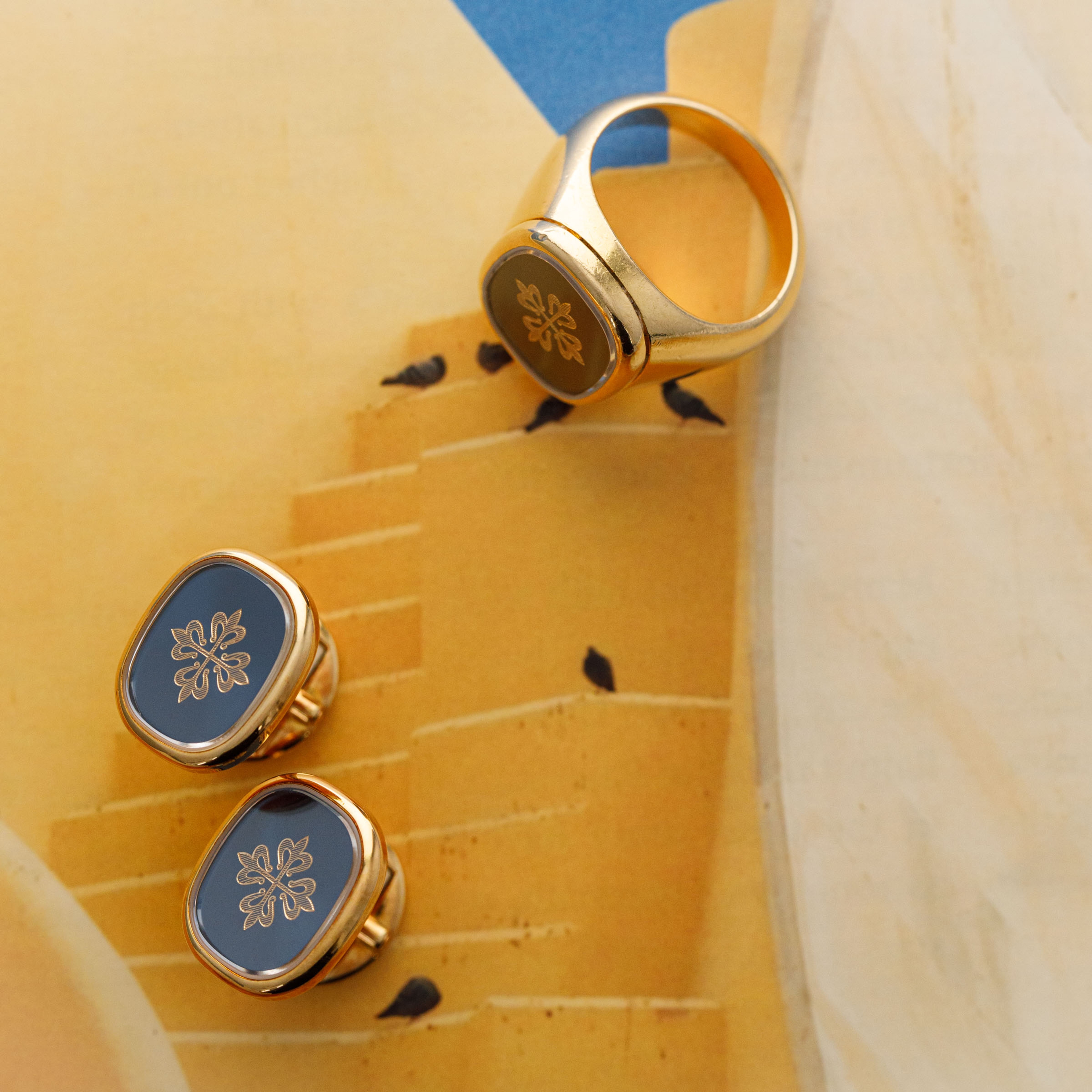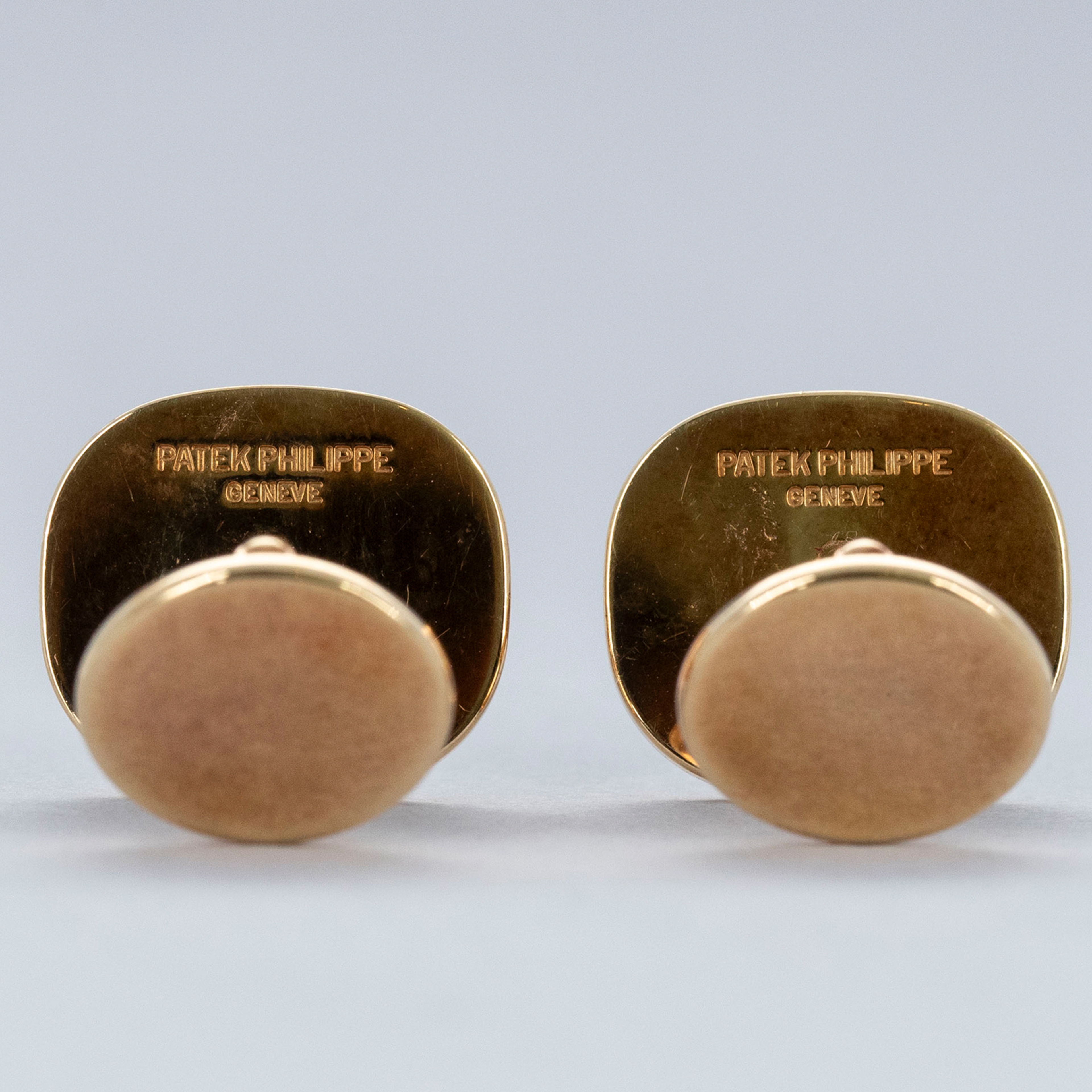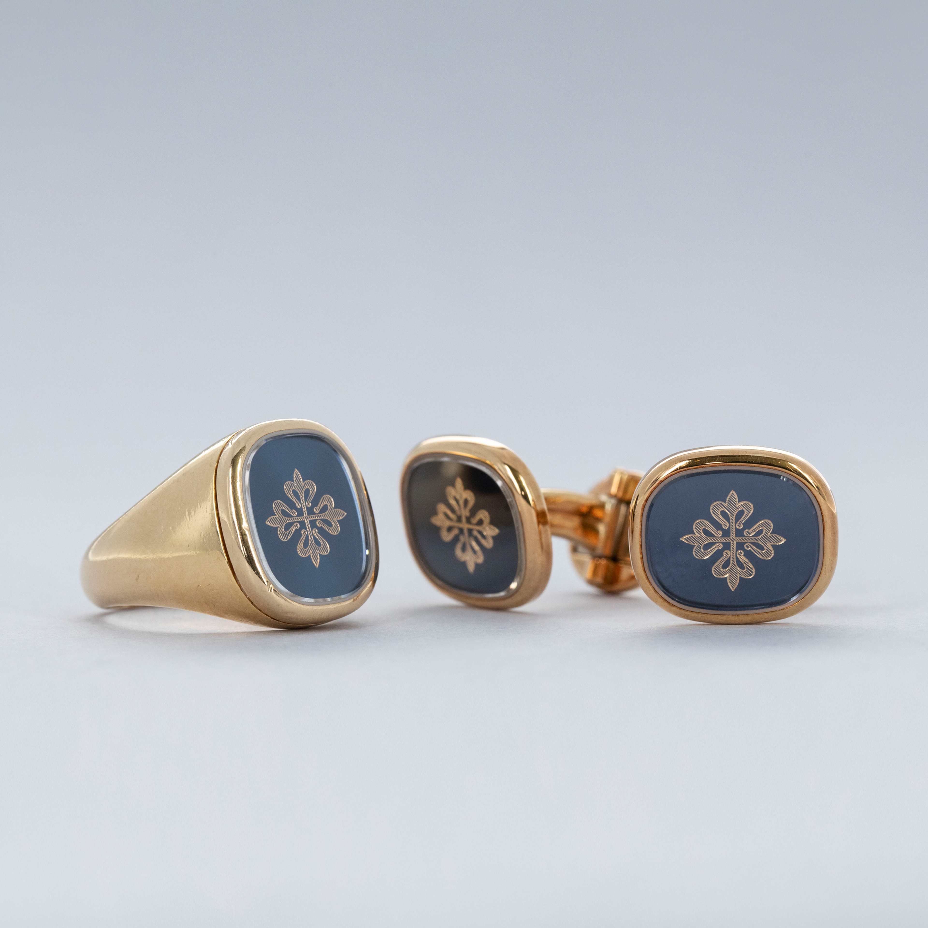 The set is in overall excellent condition. The yellow gold cufflinks show light marks and feature an insert in excellent condition. The yellow gold ring has some scratches and light nicks, with an insert bearing the Patek Philippe logo that remains in excellent condition.