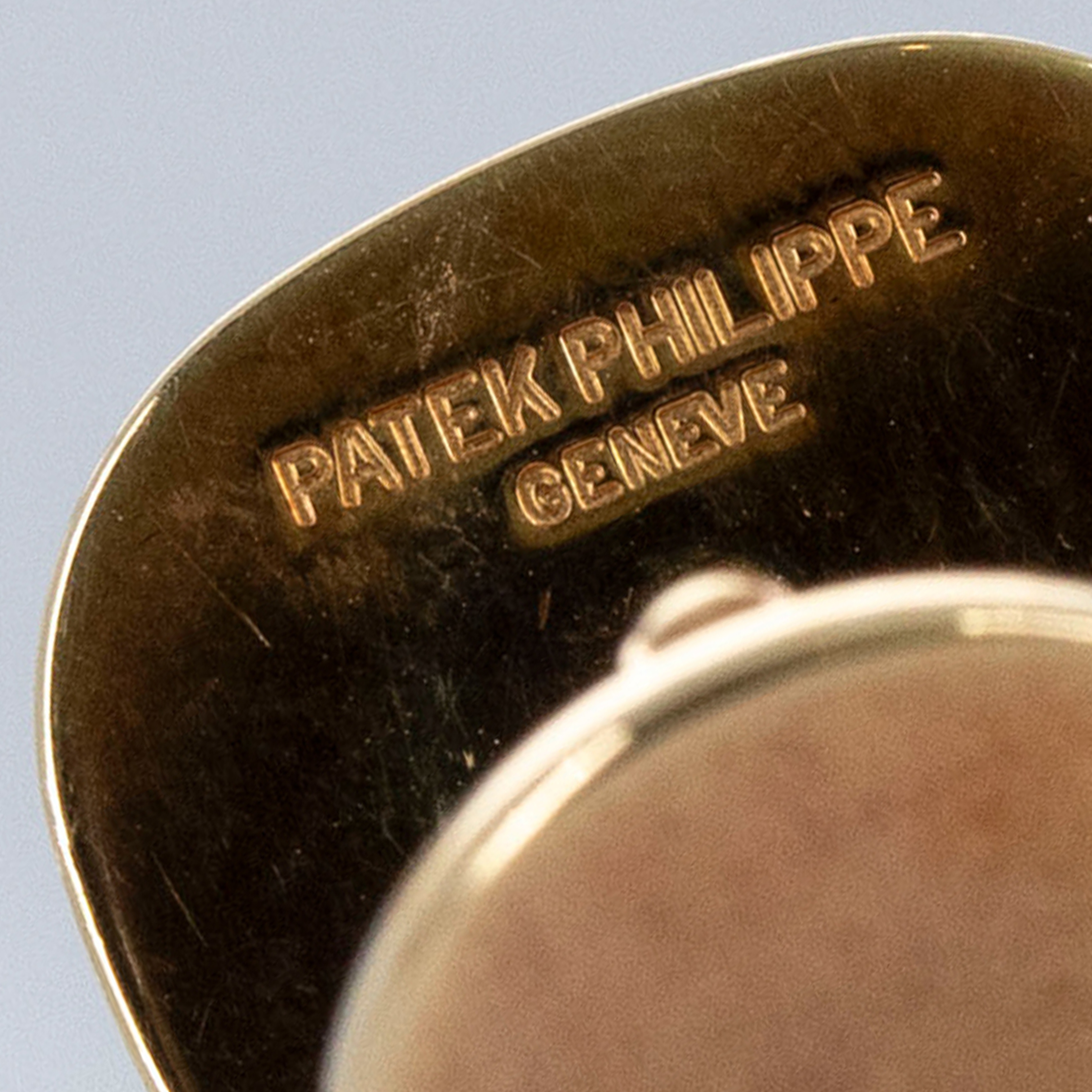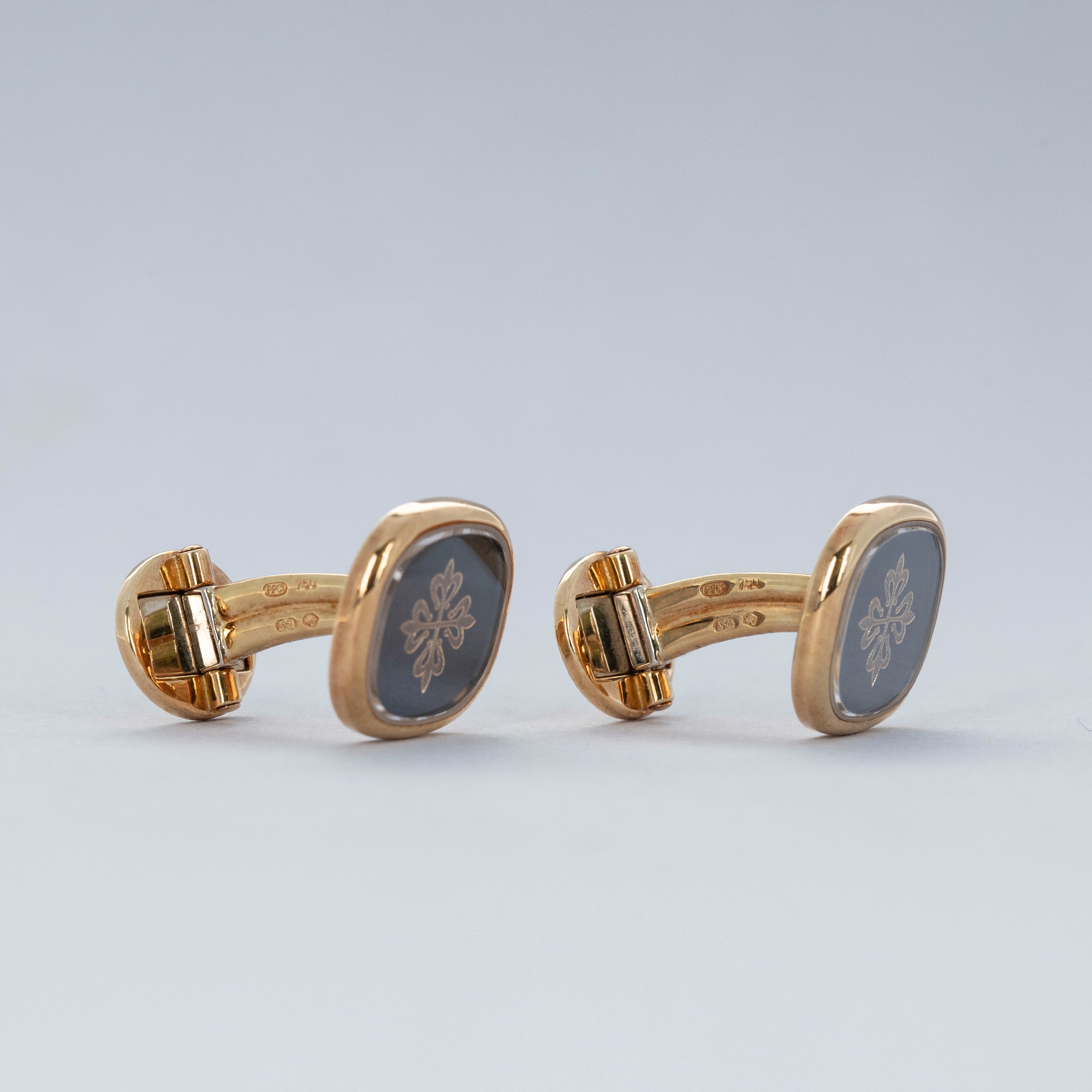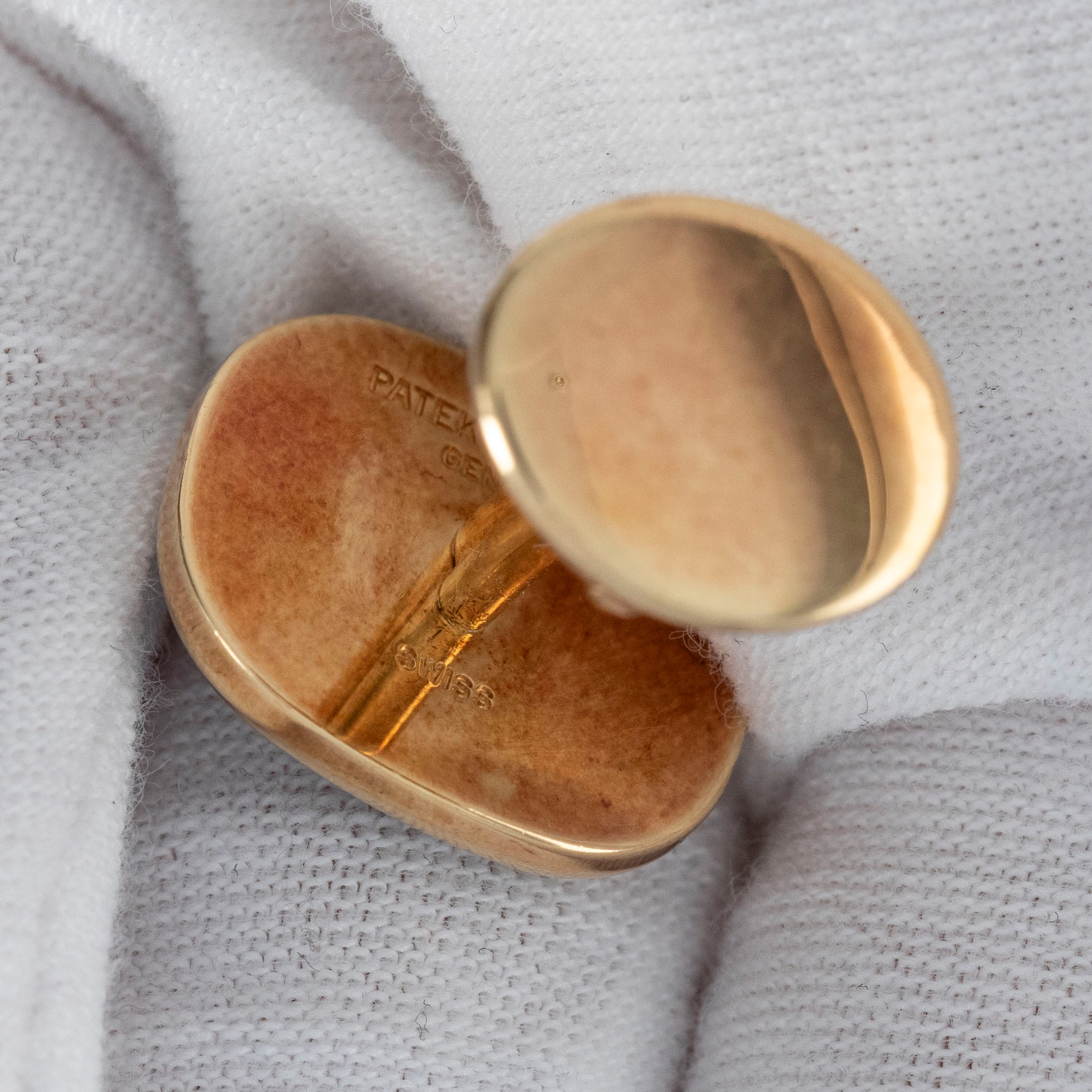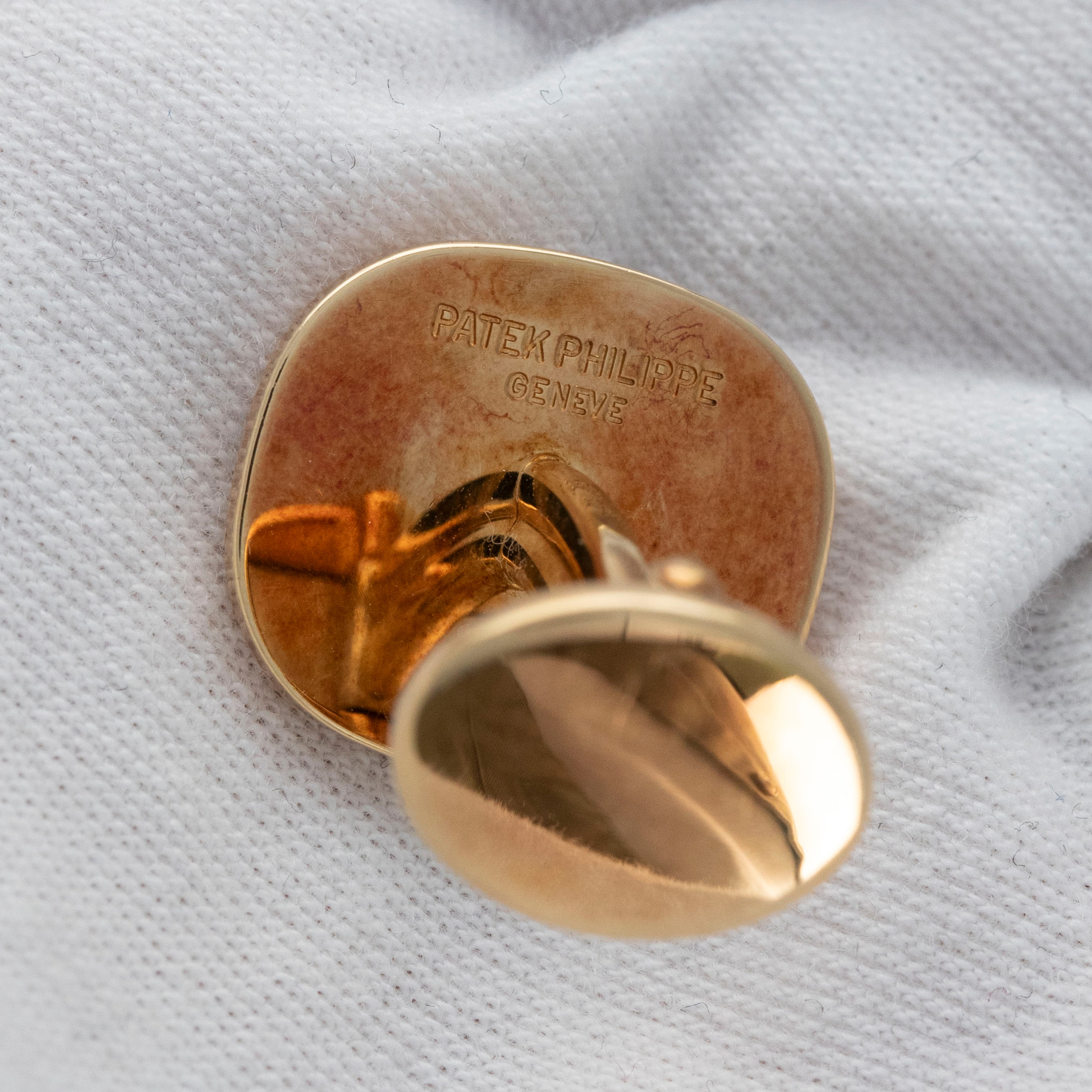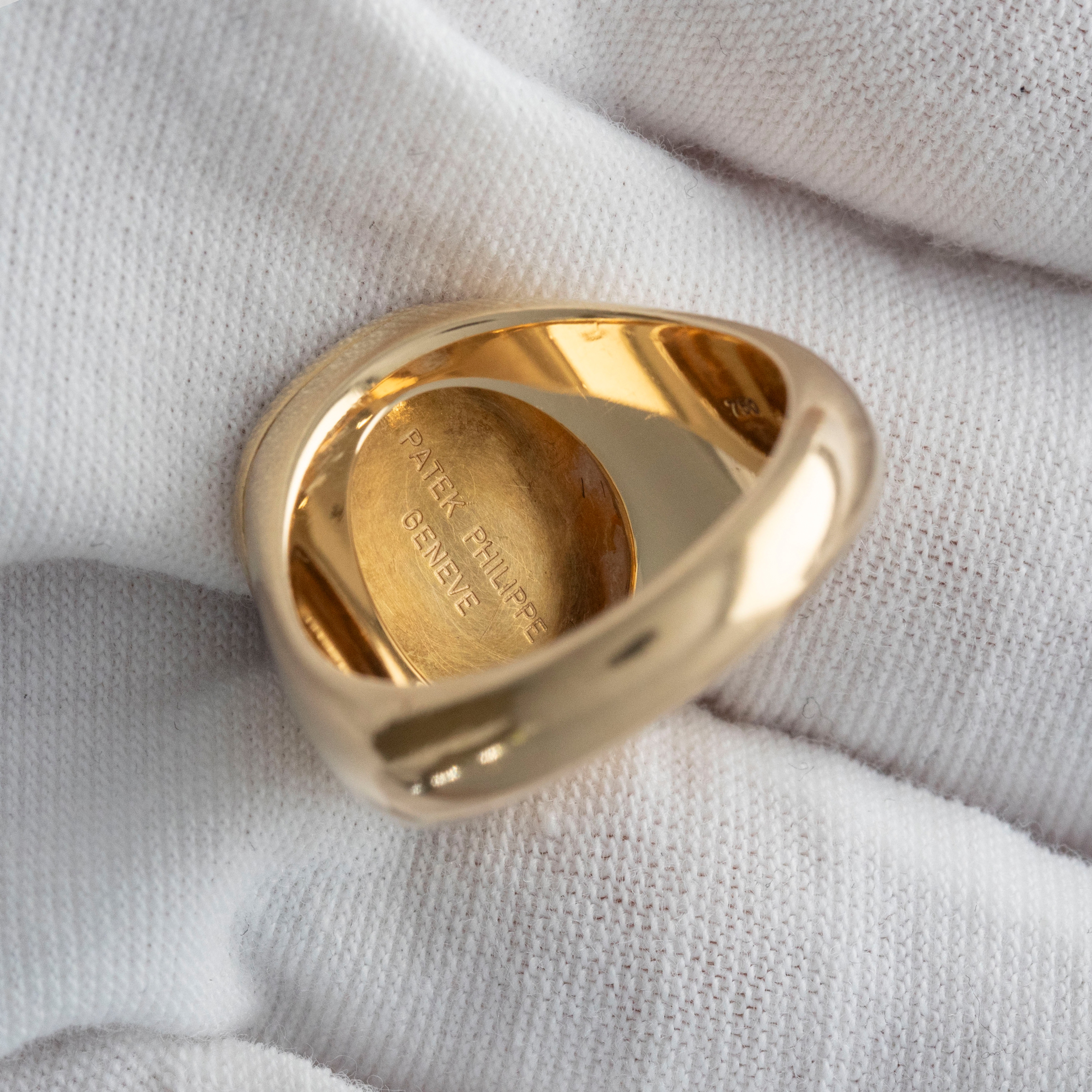 The set is in overall excellent condition. The yellow gold cufflinks show light marks and feature an insert in excellent condition. The yellow gold ring has some scratches and light nicks, with an insert bearing the Patek Philippe logo that remains in excellent condition.