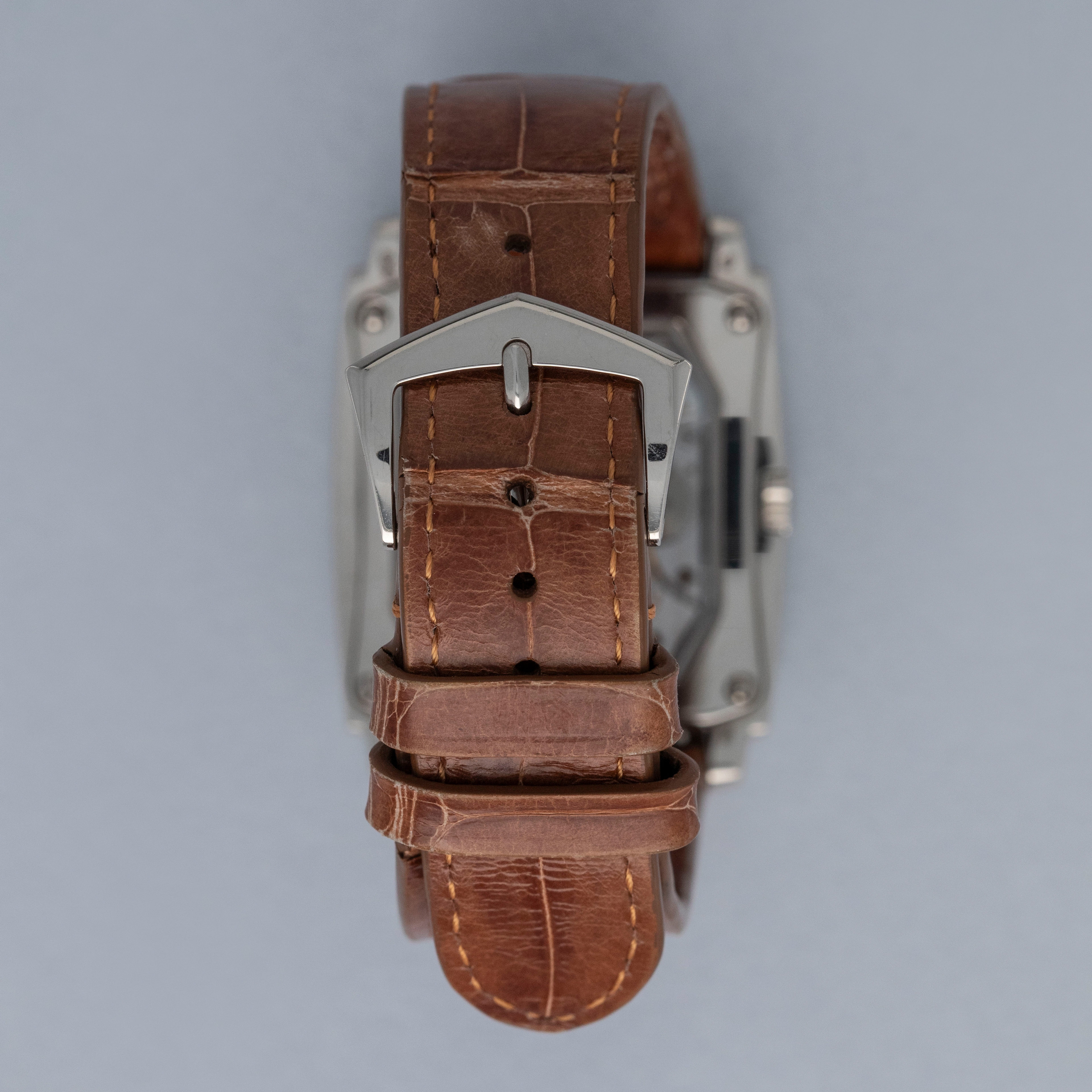 While seemingly small at 33.4mm wide, the Gondolo benefits from its rectangular design to wear larger on the wrist than its measurements suggest, with its stepped design filling the wrist wonderfully.