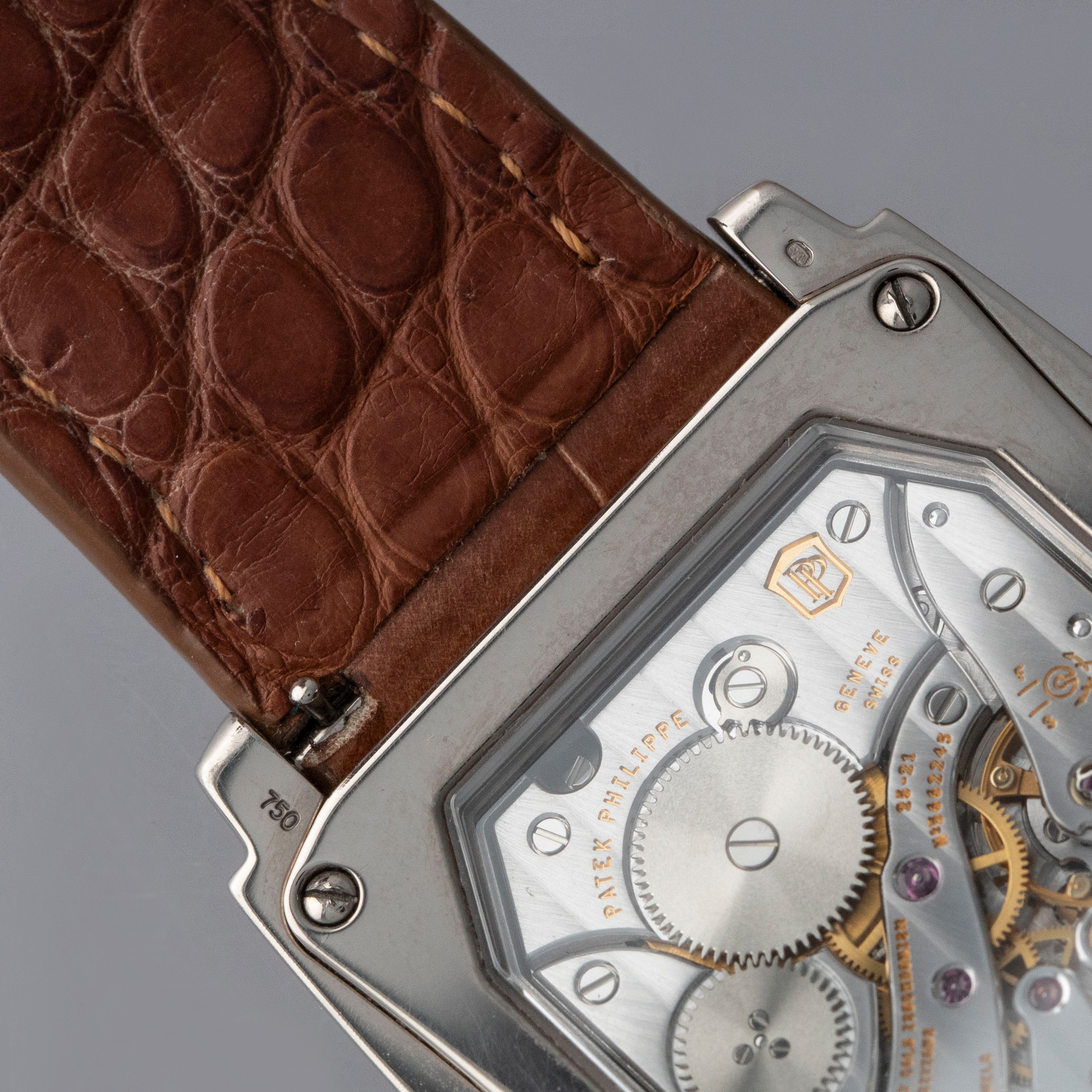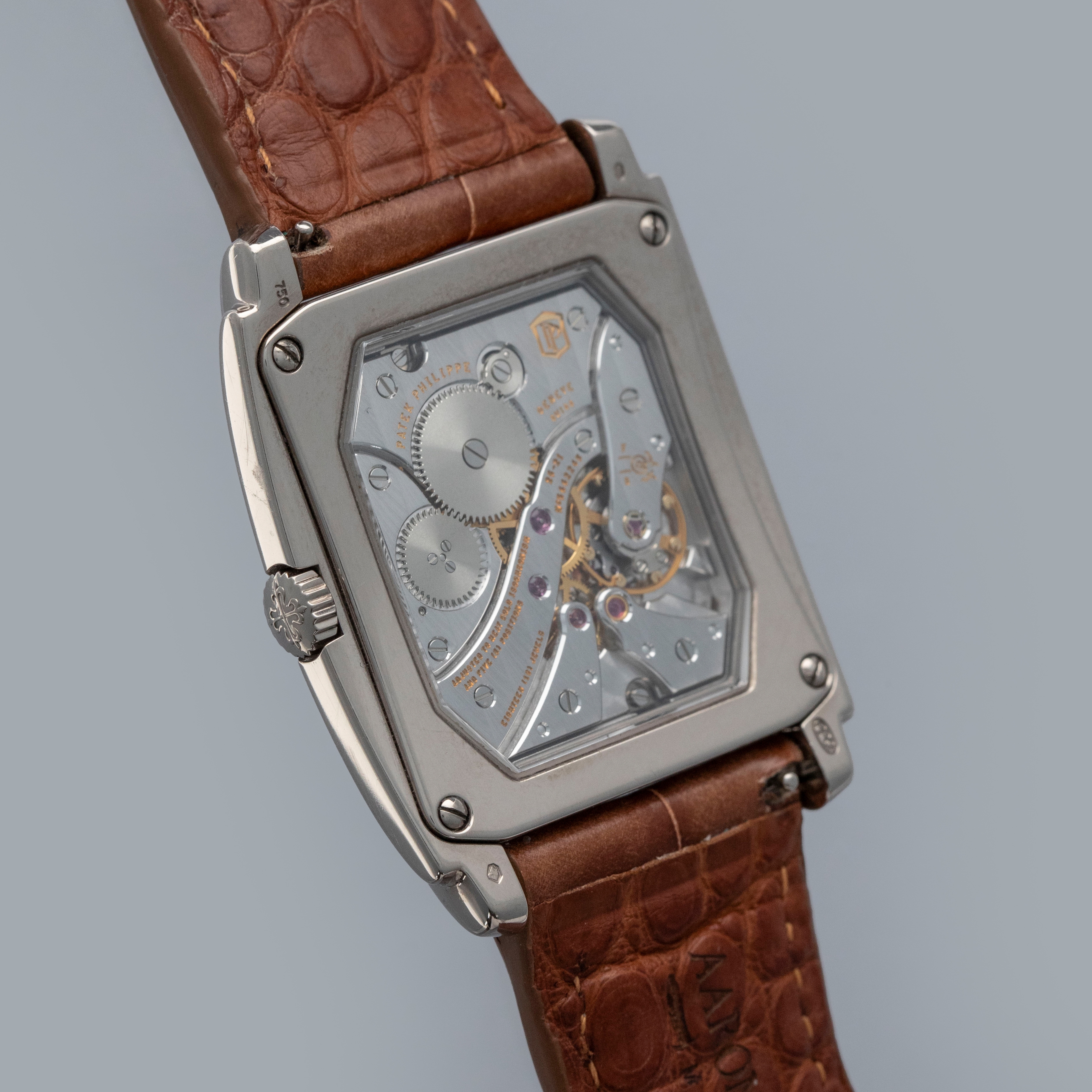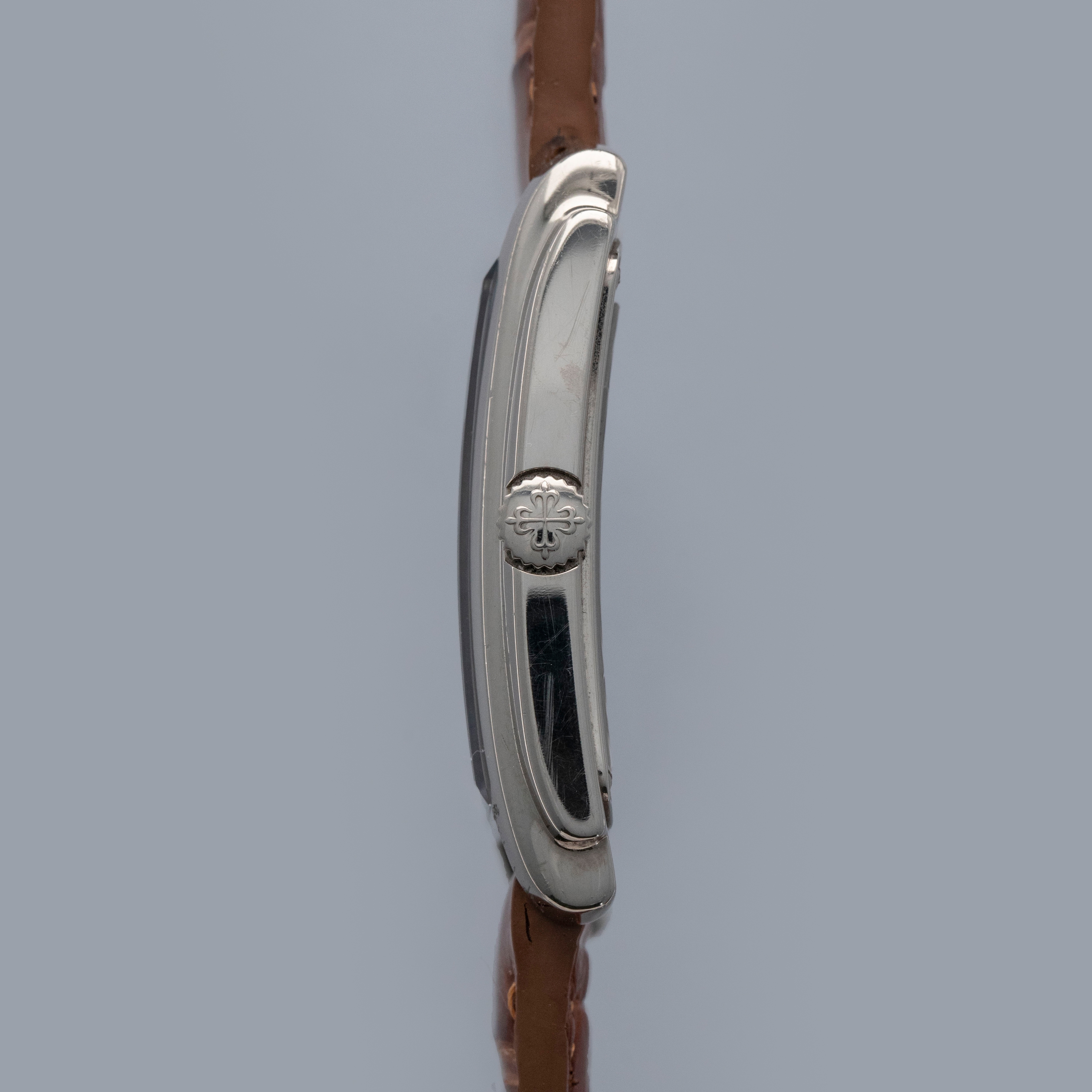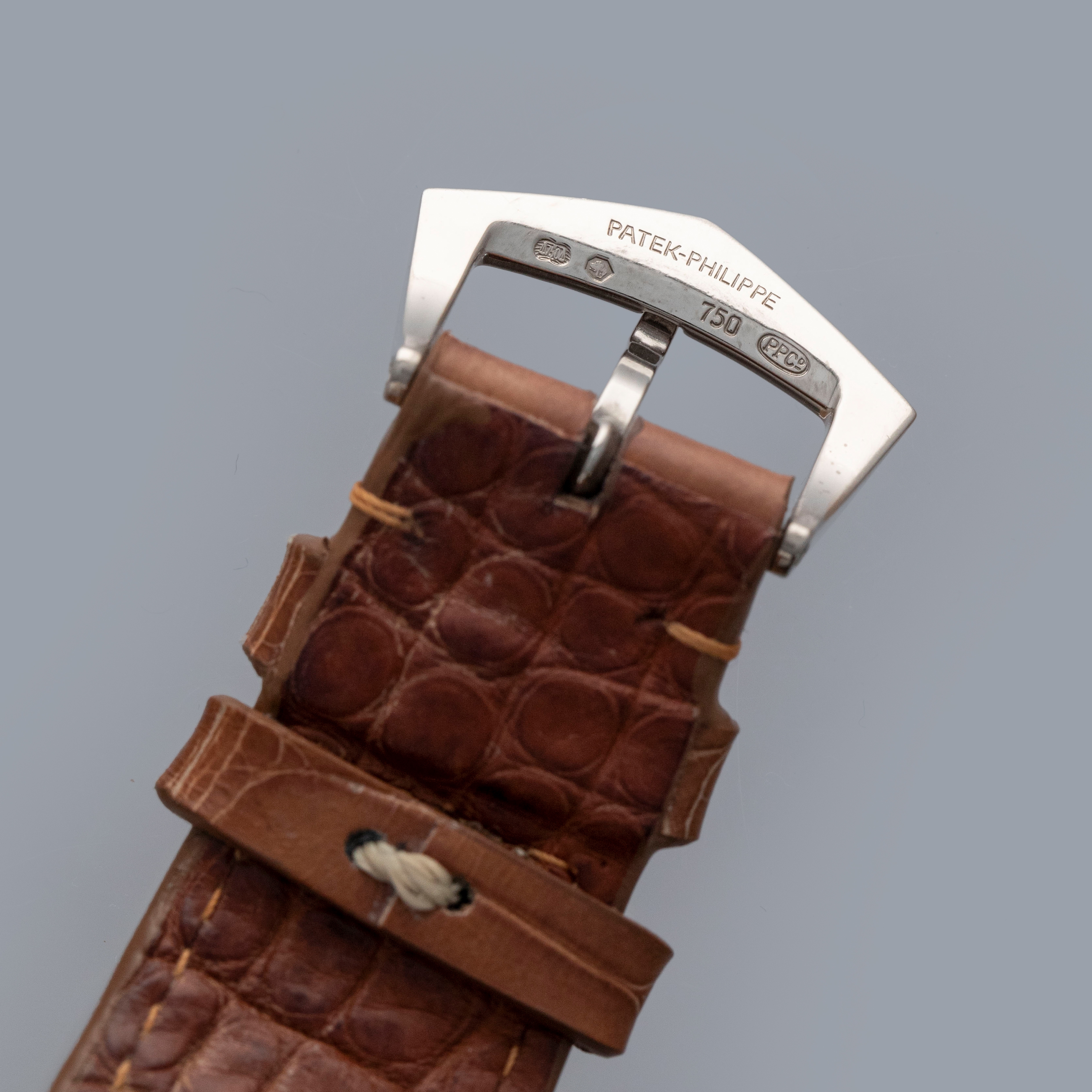 Watch is in overall excellent condition. The white gold case shows surface scratches and scuffs, while the case back displays signs of wear with light wear visible to the screw heads, and the hallmarks on the backs of the lugs remain crisp and well defined. The dial and hands remain near mint. It is fitted with a brown alligator strap and a white gold Patek pin buckle, both remaining in excellent condition, and includes an additional strap. Comes complete with box, certificate of origin, booklets, and document holder. Name on certificate of origin has been covered with white-out.