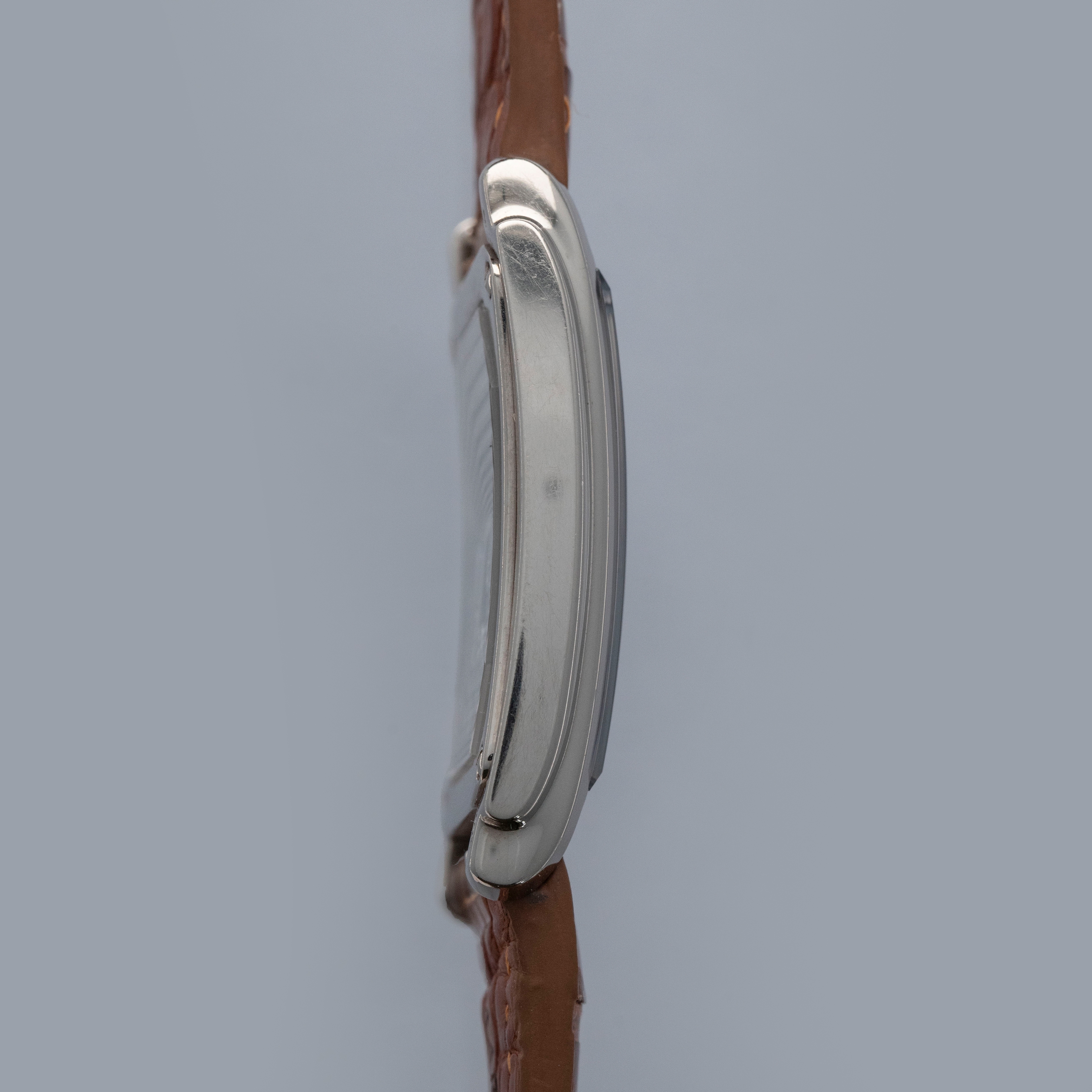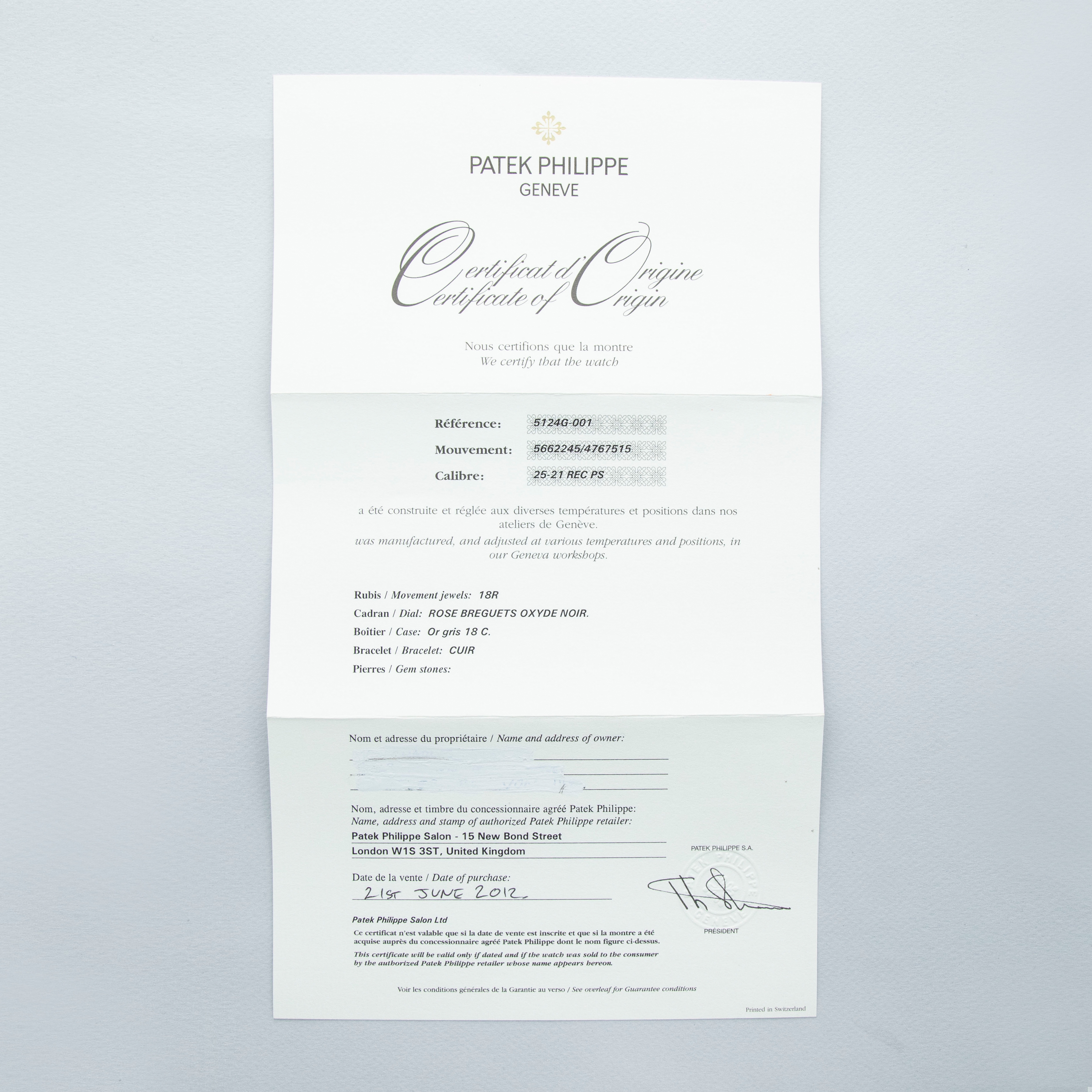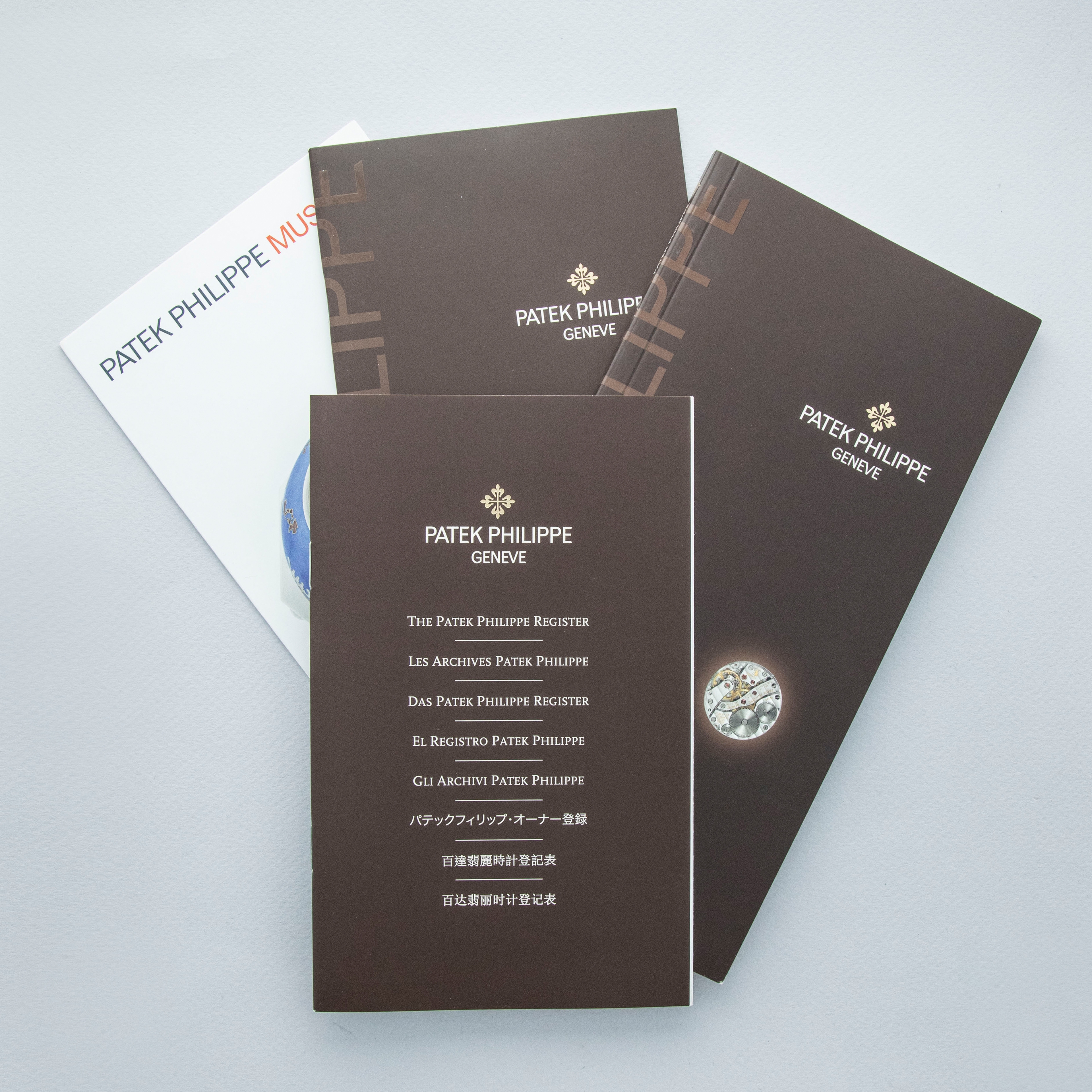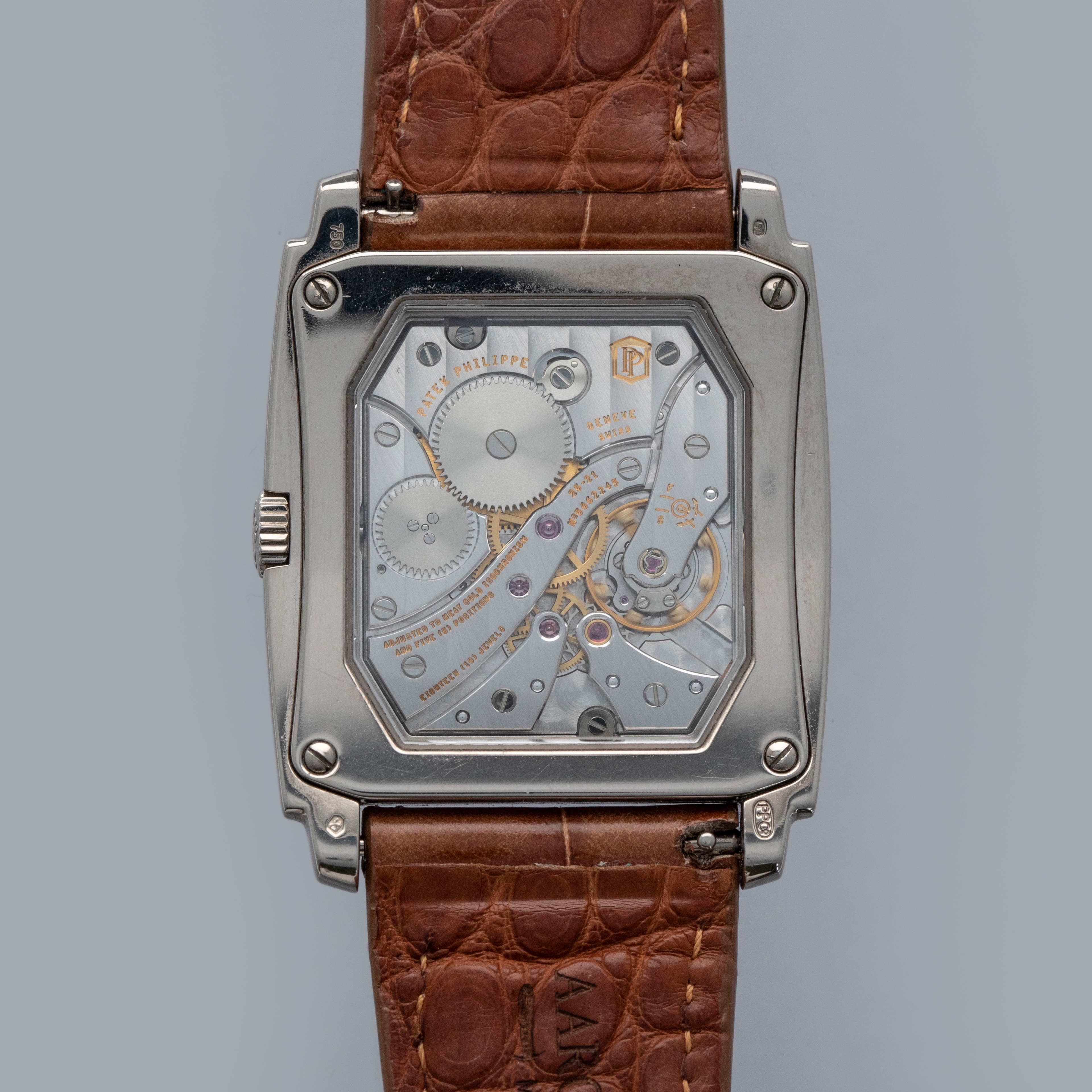 Watch is in overall excellent condition. The white gold case shows surface scratches and scuffs, while the case back displays signs of wear with light wear visible to the screw heads, and the hallmarks on the backs of the lugs remain crisp and well defined. The dial and hands remain near mint. It is fitted with a brown alligator strap and a white gold Patek pin buckle, both remaining in excellent condition, and includes an additional strap. Comes complete with box, certificate of origin, booklets, and document holder. Name on certificate of origin has been covered with white-out.