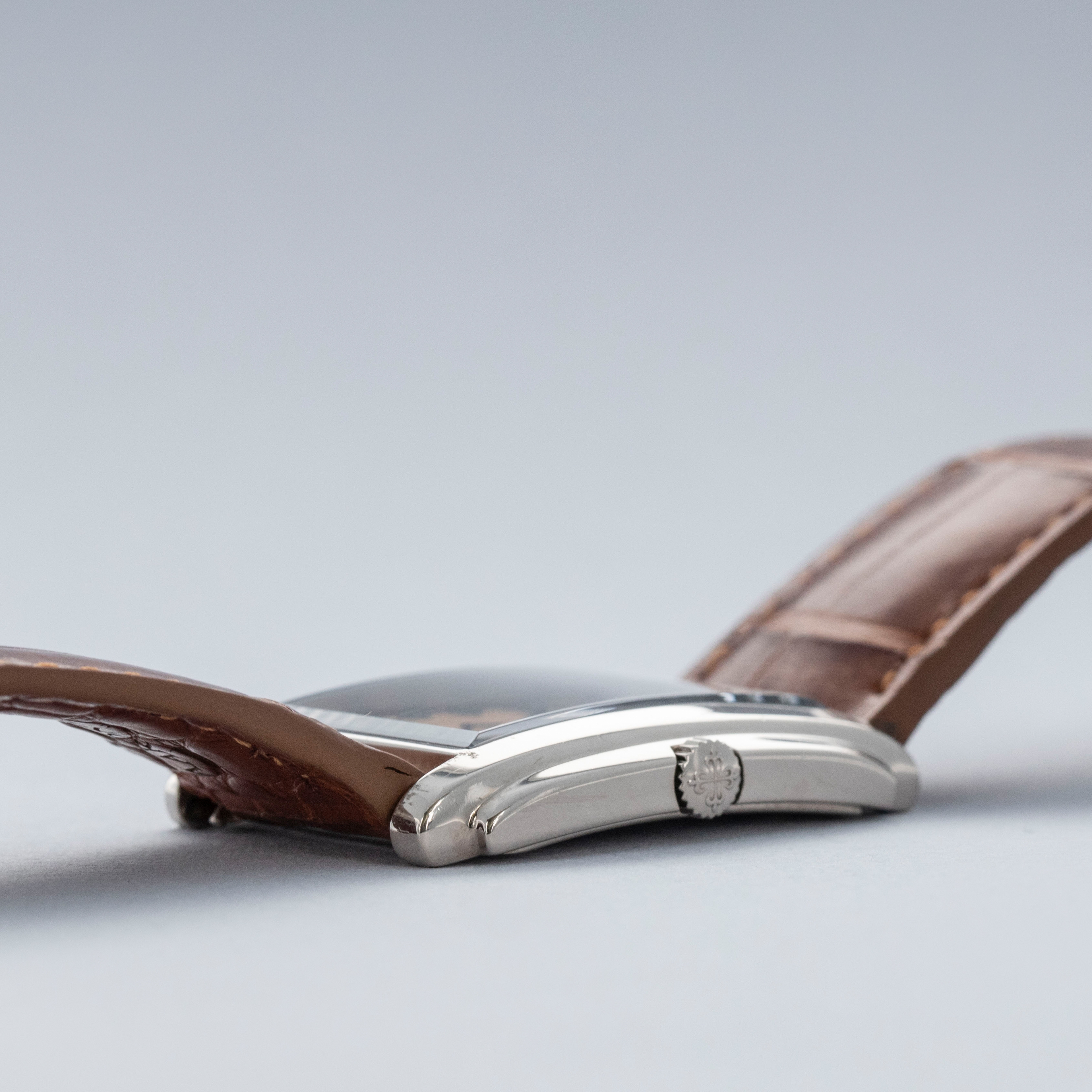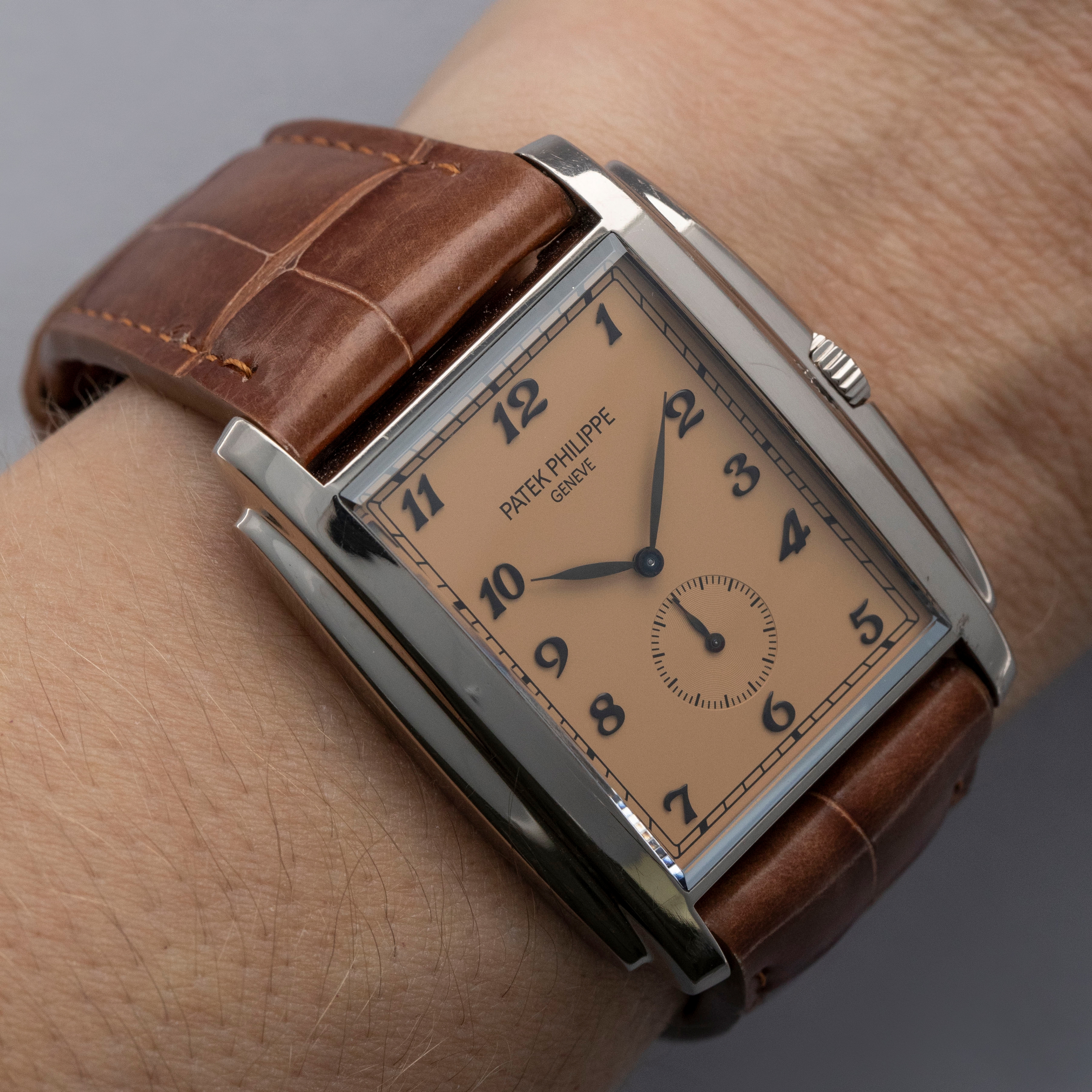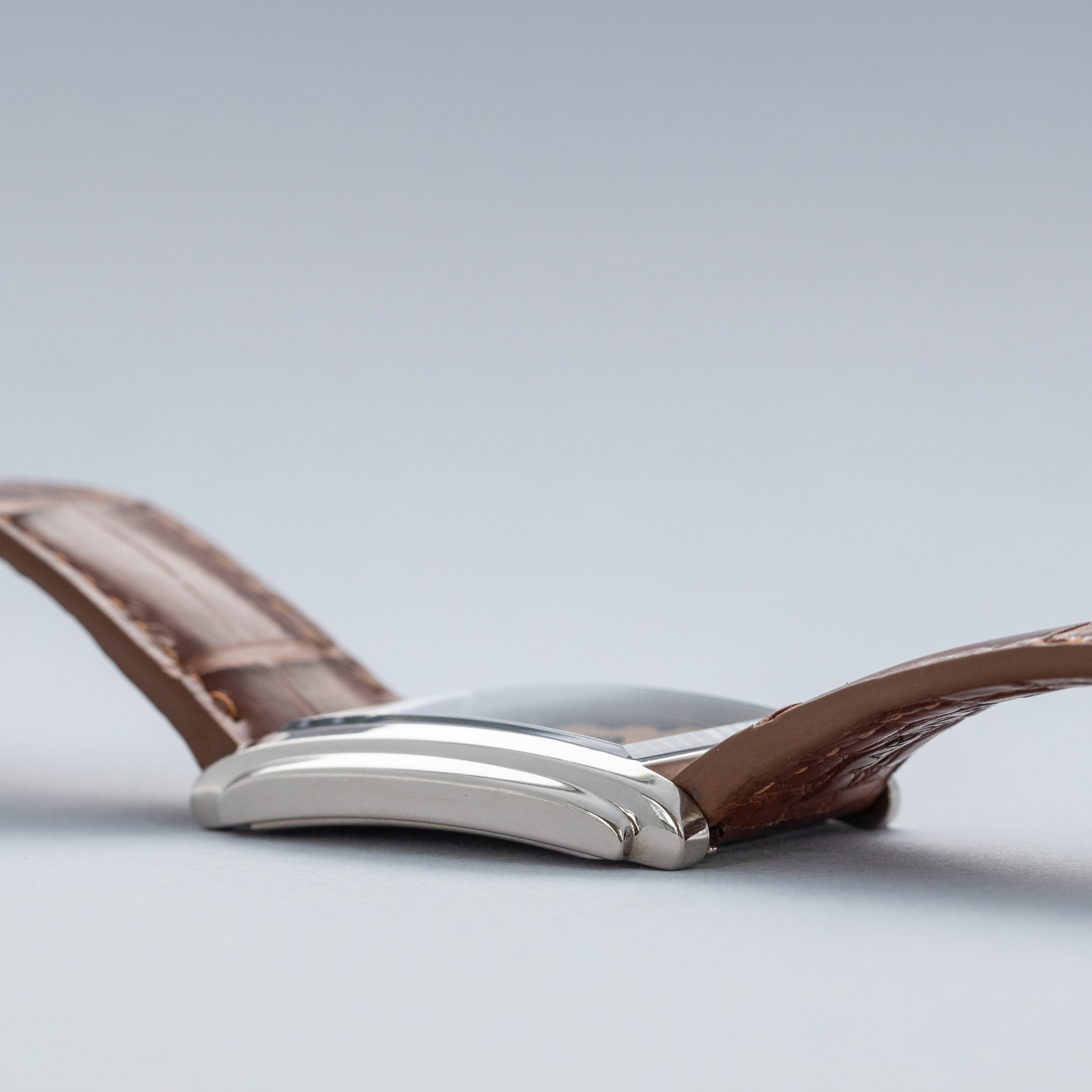 Inspired by the “Chronometro Gondolo” collection that Patek had created in the early 1900s for upscale Brazilian importer “Gondolo & Labourier,” the Patek Philippe Gondolo was launched in 1993 as a means for Patek to embrace the Art Deco designs that were once again becoming popular in the world of watchmaking thanks to brands like JLC, Rolex and others with their Reversos, Cellini Princes and various other watches. Using the Art Deco skyscrapers that split the skylines of the world’s major citites, the Gondolo boasts a beautifully fashioned case that features a stepped bezel and soft curves in between these contrasting surfaces. A dress watch that is removed from the world of plainer round dress watches, the Gondolo adds some flair to the category of watch that is typically more refined, all the while maintaining the tenets of dress watch design, such as its understated dial design, manual-wind movement and precious metal construction on a leather strap. In keeping with these parameters, the ref. 5124G that we have here sports an 18kt white gold case, a stunning salmon dial with a running seconds subdial and a manual-wind cal. 25-21 REC PS movement that exhibits some of Patek’s beautiful finishing beneath its sapphire crystal caseback. A truly stunning watch, this beauty speaks to the elaborate designs of the Art Deco period without going overboard and trying too hard, which demonstrates Patek’s ability as a watchmaker and designer to remain faithful to the adage that sometimes less is more.