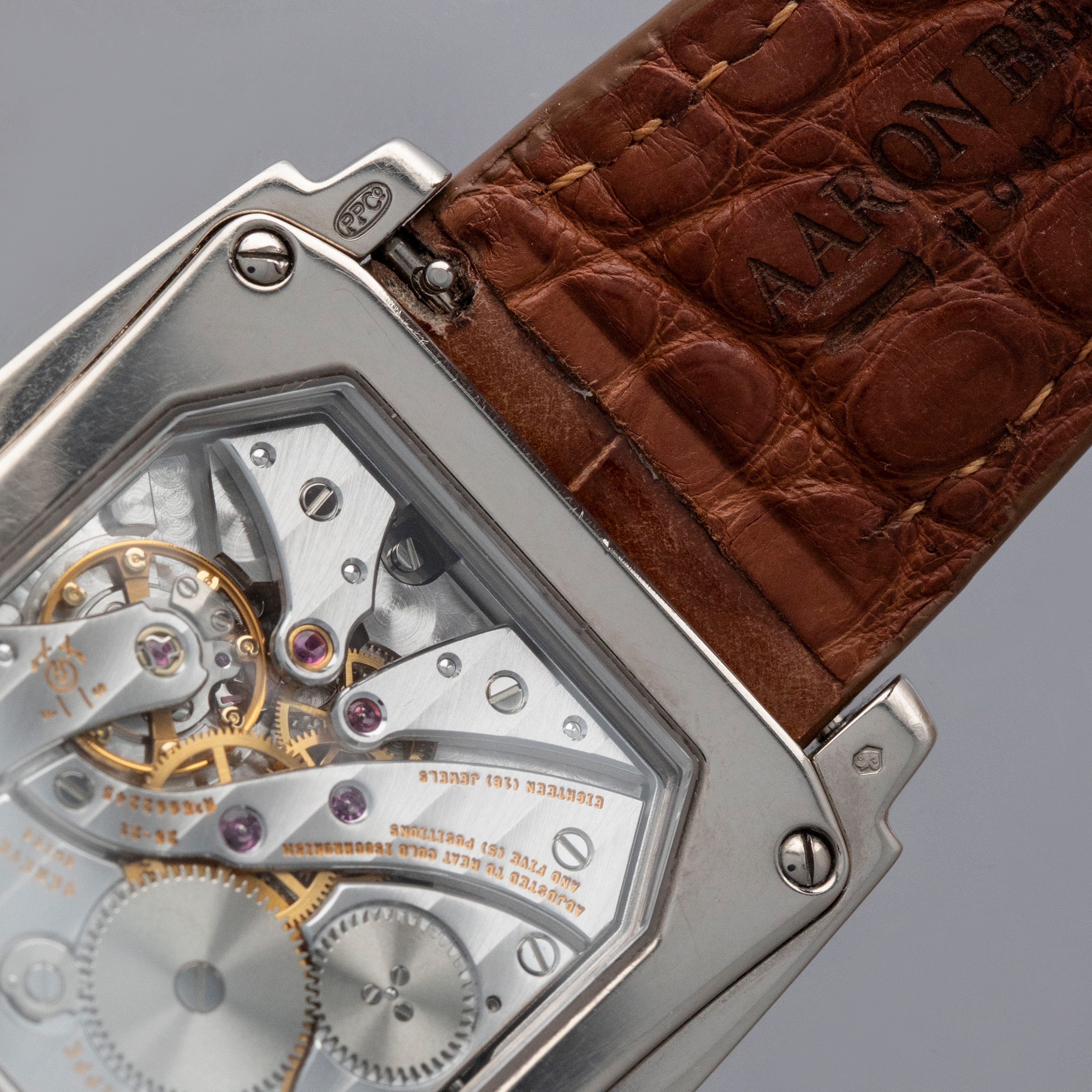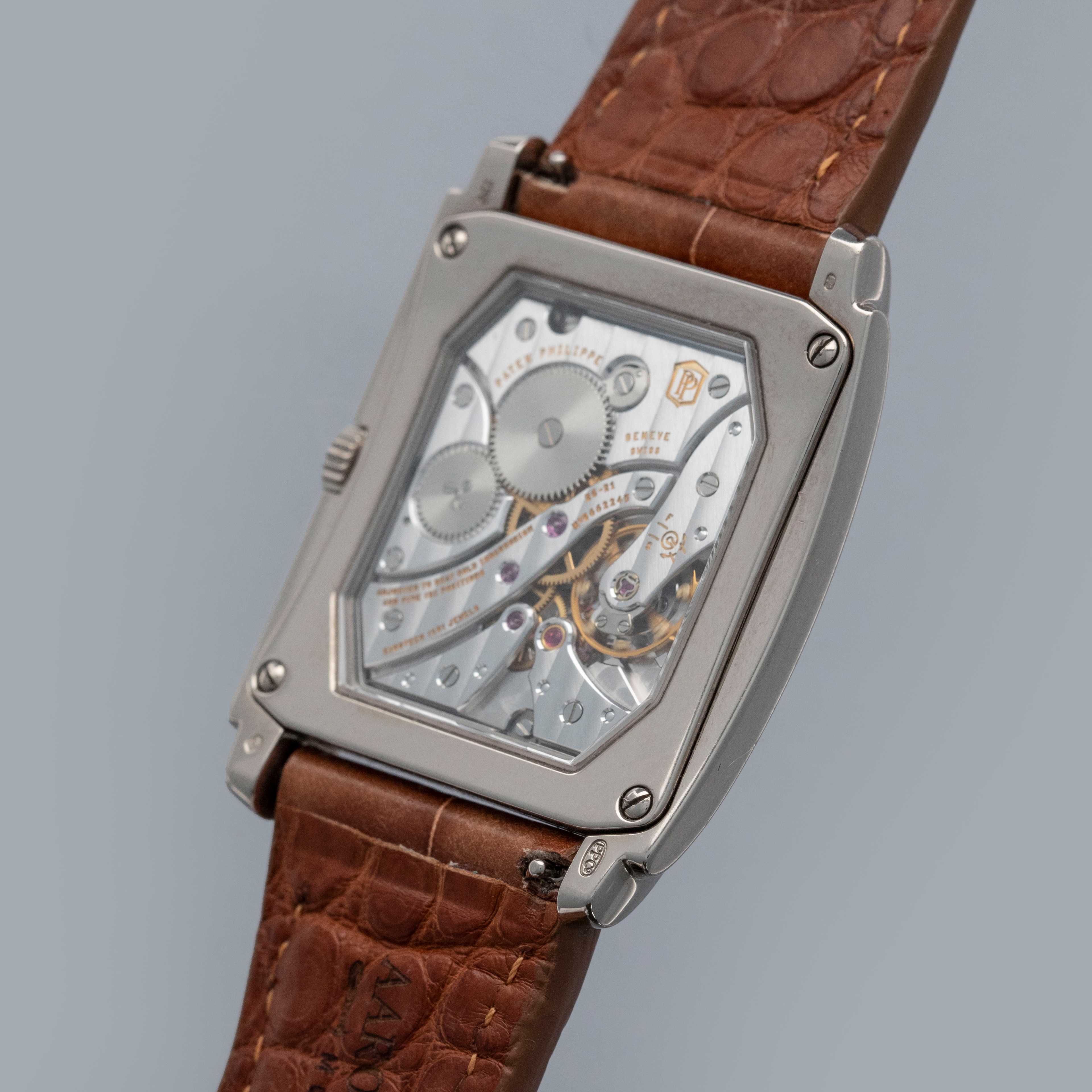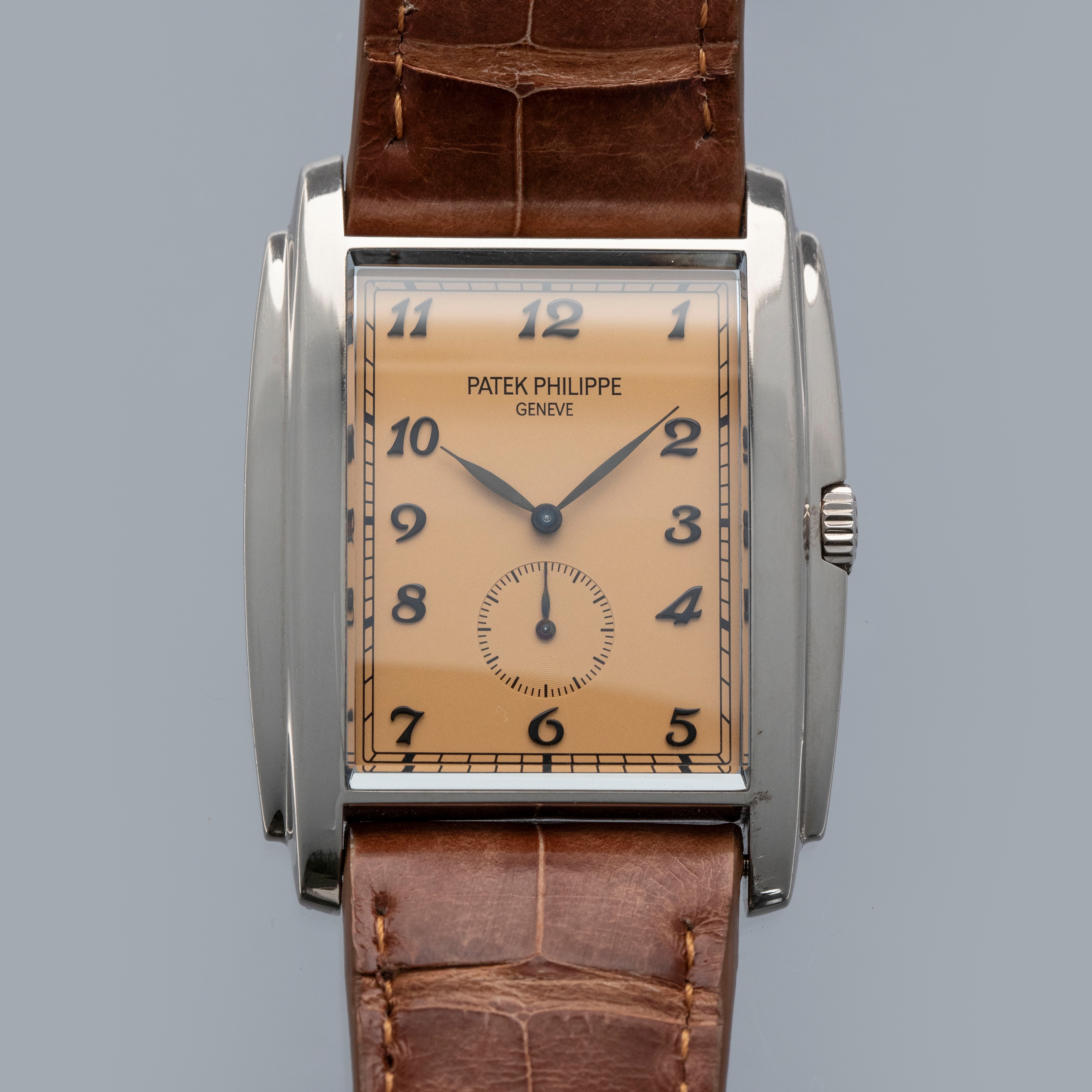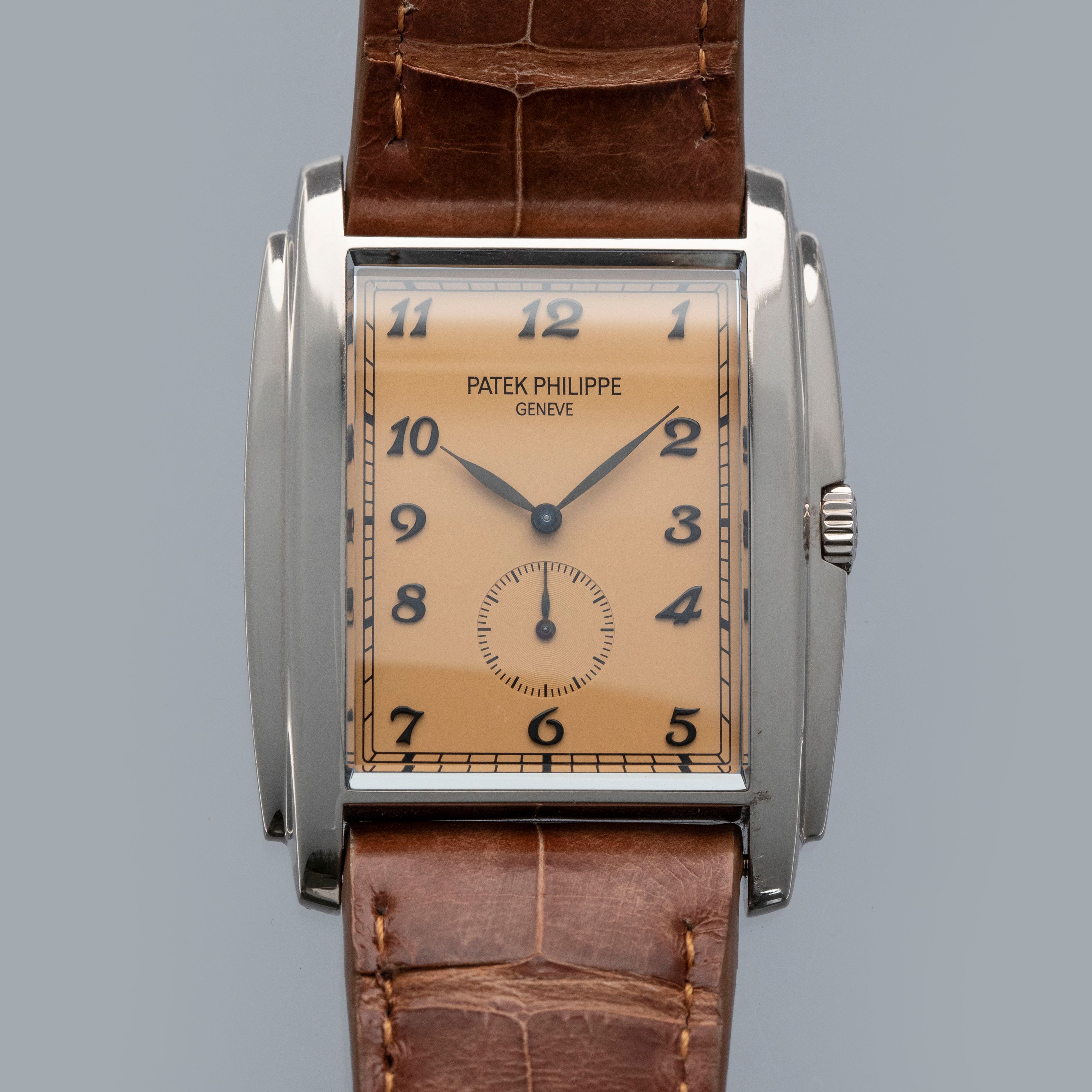 Inspired by the “Chronometro Gondolo” collection that Patek had created in the early 1900s for upscale Brazilian importer “Gondolo & Labourier,” the Patek Philippe Gondolo was launched in 1993 as a means for Patek to embrace the Art Deco designs that were once again becoming popular in the world of watchmaking thanks to brands like JLC, Rolex and others with their Reversos, Cellini Princes and various other watches. Using the Art Deco skyscrapers that split the skylines of the world’s major citites, the Gondolo boasts a beautifully fashioned case that features a stepped bezel and soft curves in between these contrasting surfaces. A dress watch that is removed from the world of plainer round dress watches, the Gondolo adds some flair to the category of watch that is typically more refined, all the while maintaining the tenets of dress watch design, such as its understated dial design, manual-wind movement and precious metal construction on a leather strap. In keeping with these parameters, the ref. 5124G that we have here sports an 18kt white gold case, a stunning salmon dial with a running seconds subdial and a manual-wind cal. 25-21 REC PS movement that exhibits some of Patek’s beautiful finishing beneath its sapphire crystal caseback. A truly stunning watch, this beauty speaks to the elaborate designs of the Art Deco period without going overboard and trying too hard, which demonstrates Patek’s ability as a watchmaker and designer to remain faithful to the adage that sometimes less is more.
