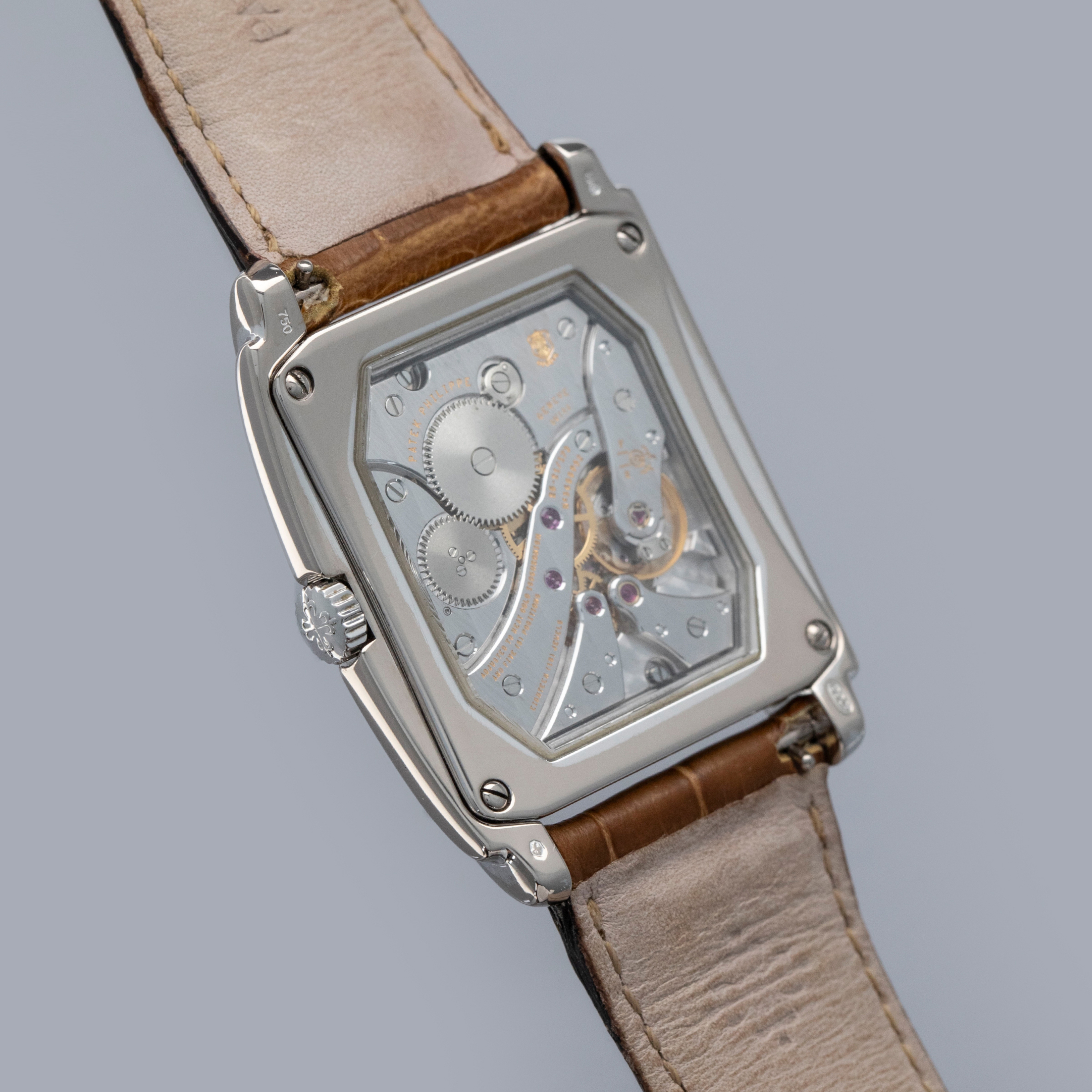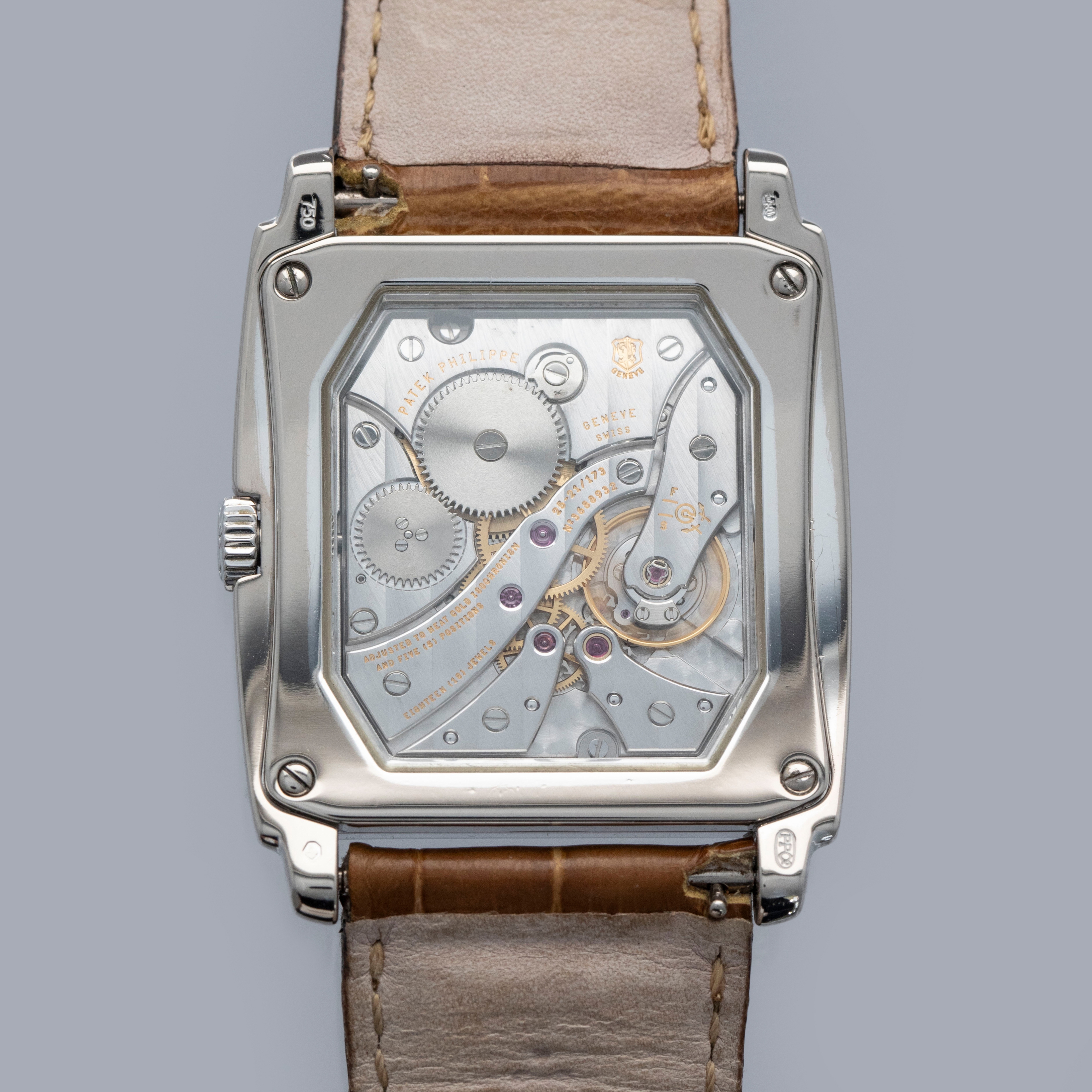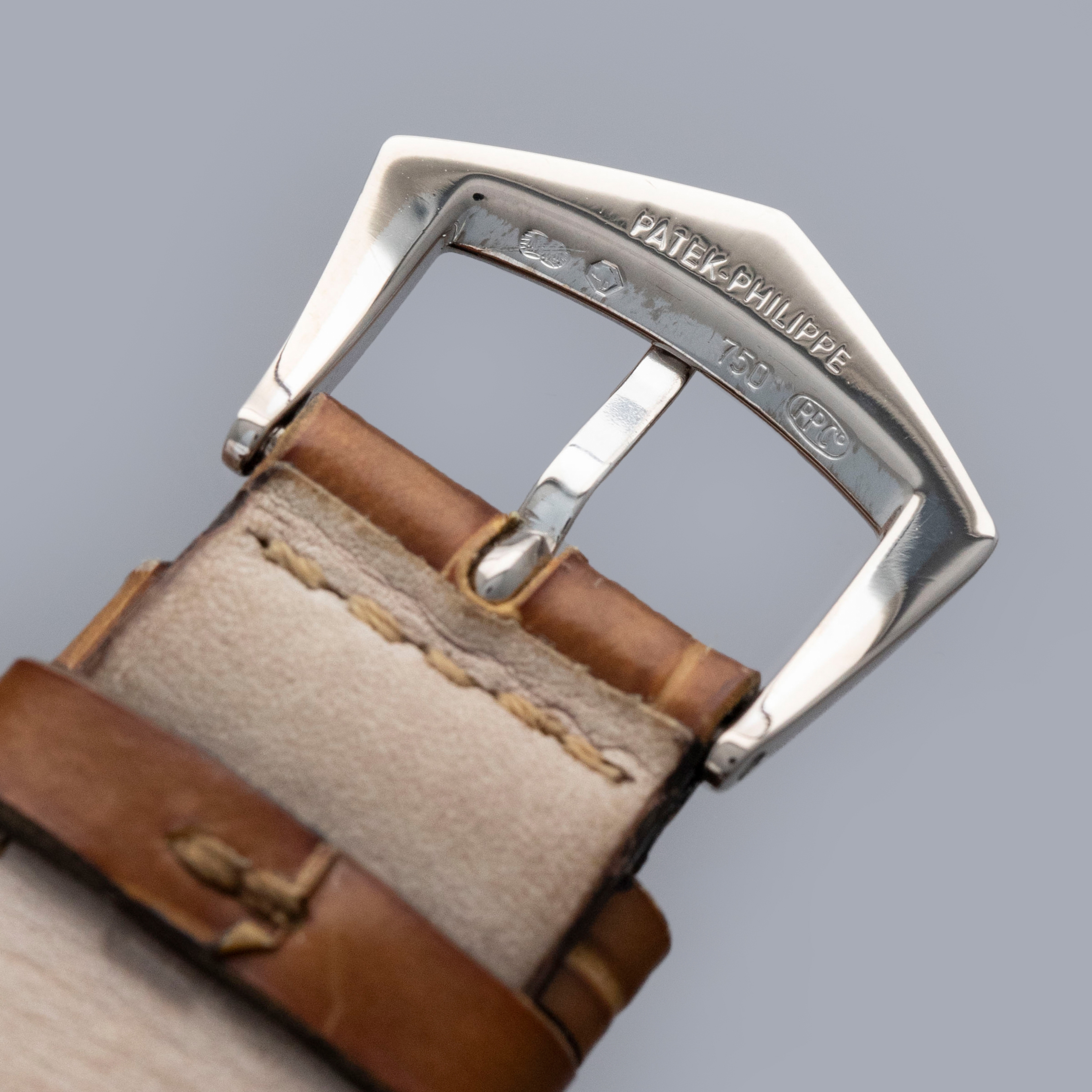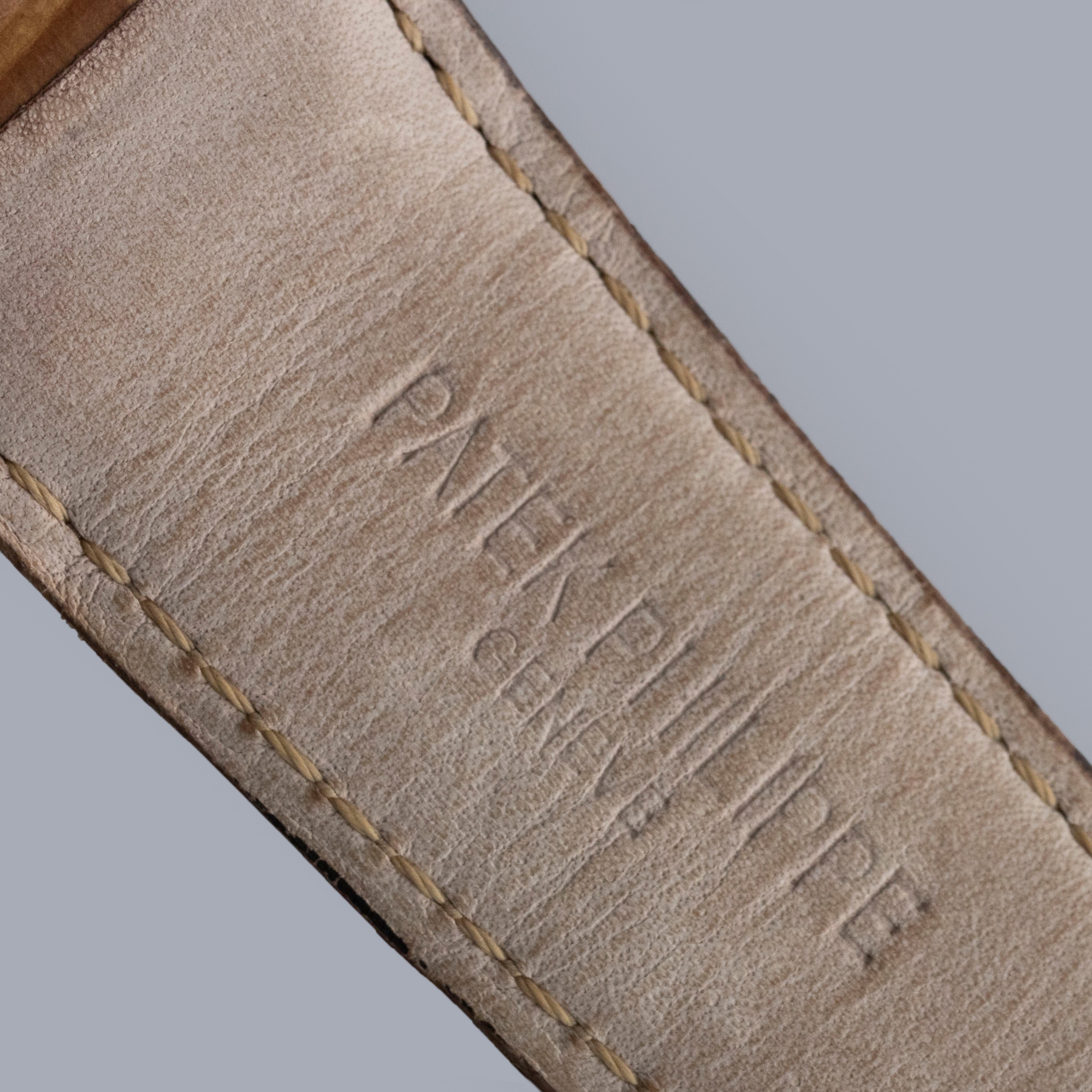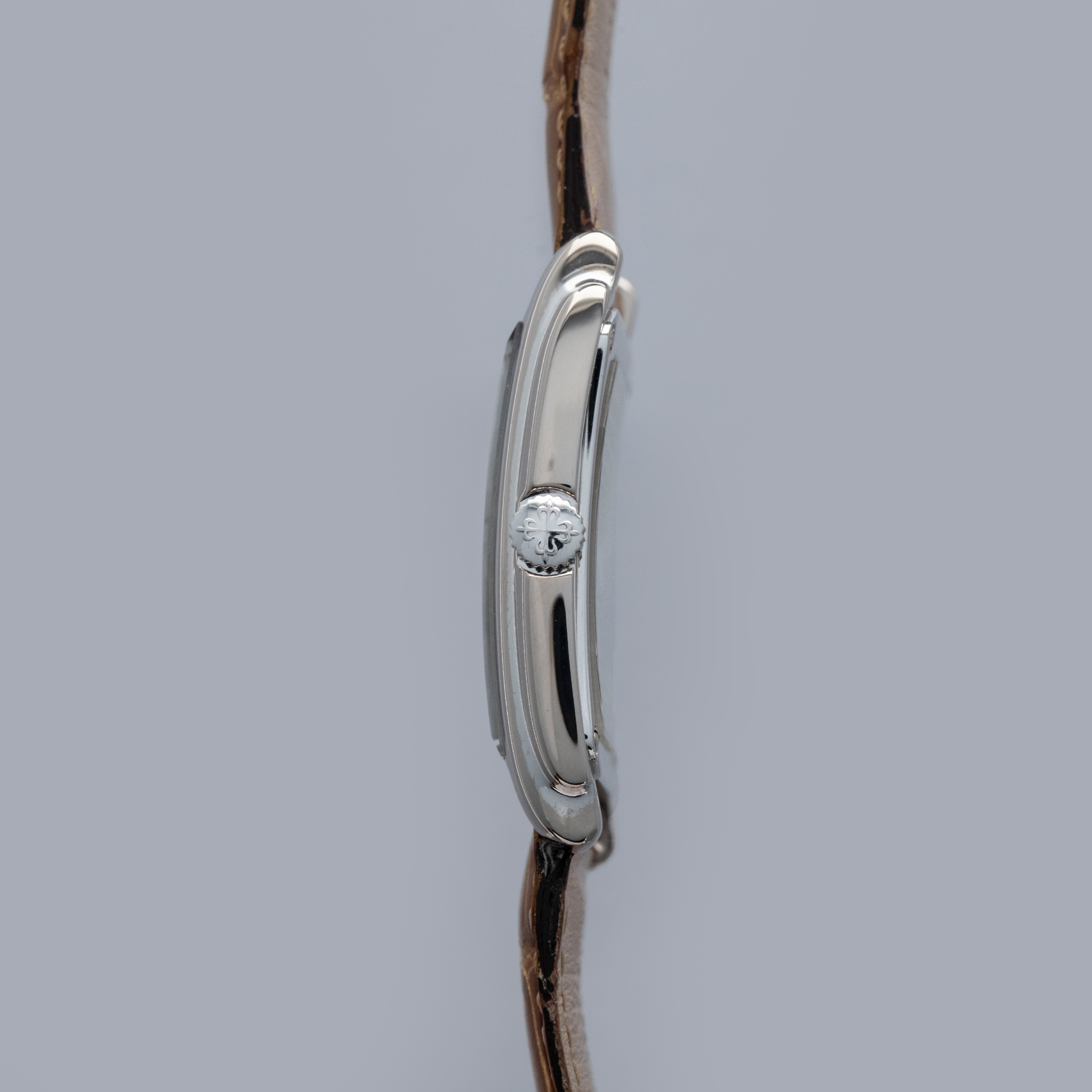 The watch is in overall excellent condition. The white gold case has some light scratches and a couple of tiny nicks, with crisp hallmarks throughout. There is some very light wear on the screw heads in the case back. The dial and hands are near-mint. It is fitted with a brown Patek Philippe crocodile strap in good condition and a white gold Patek Philippe buckle in excellent condition. The watch is accompanied by its original certificate, booklets, and hangtag.
