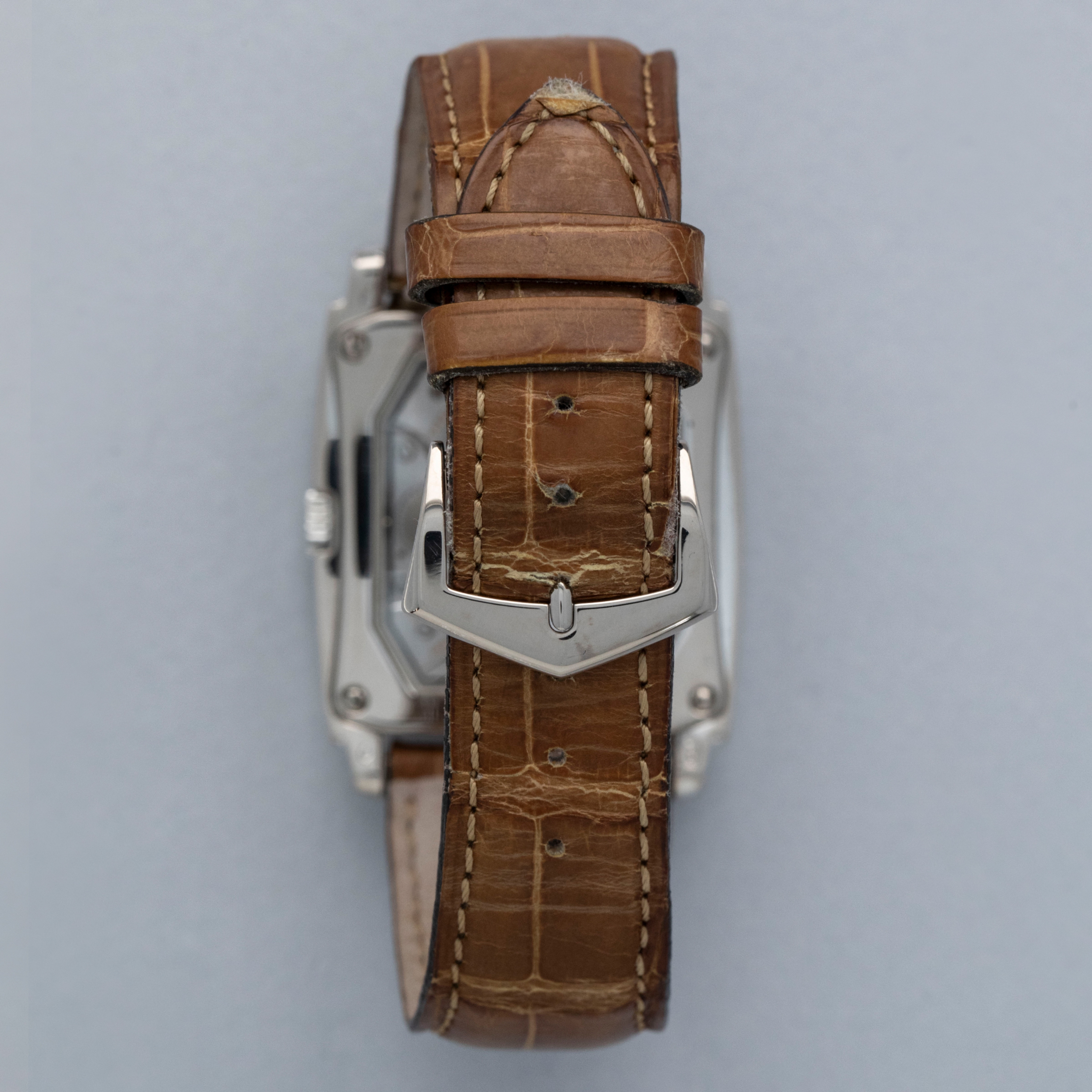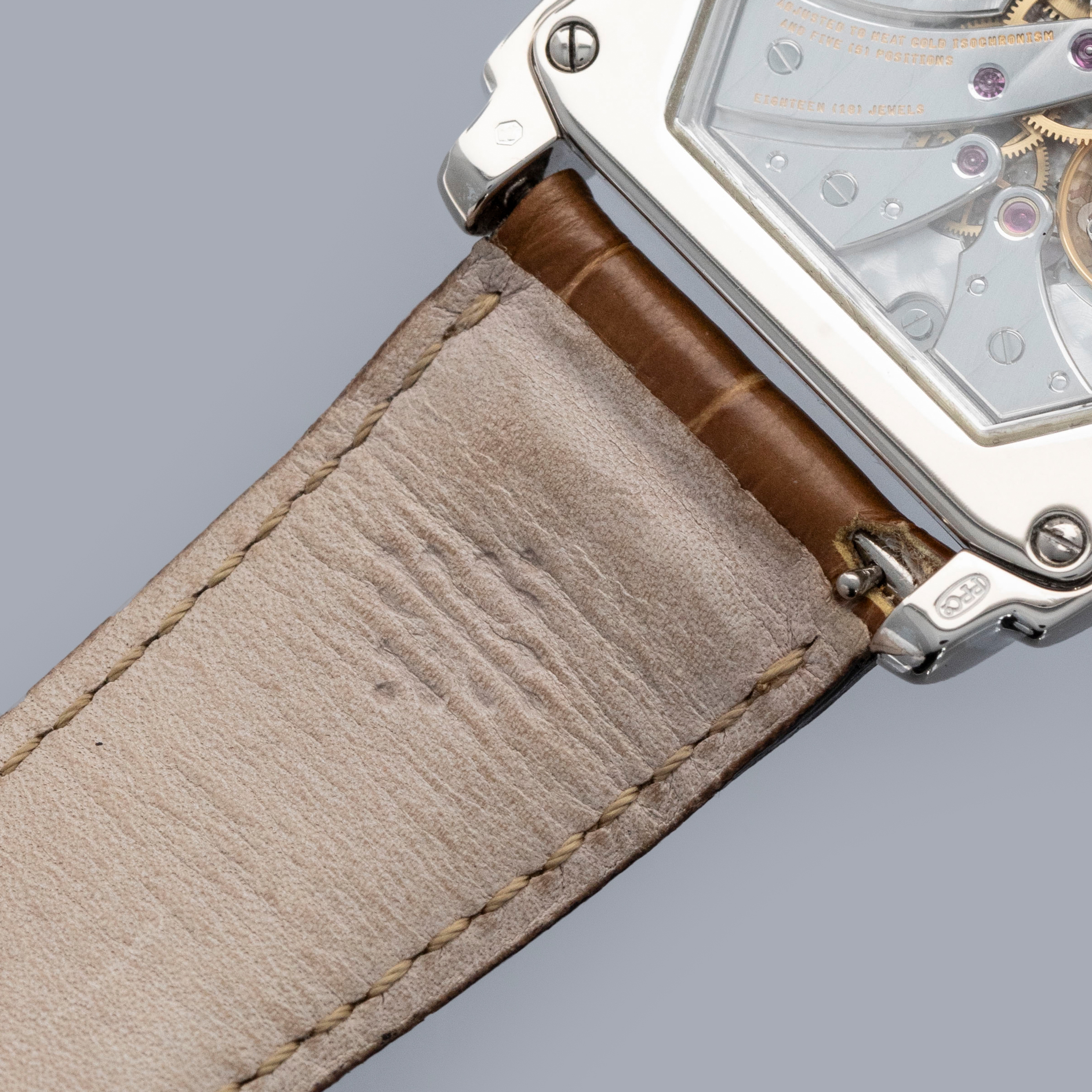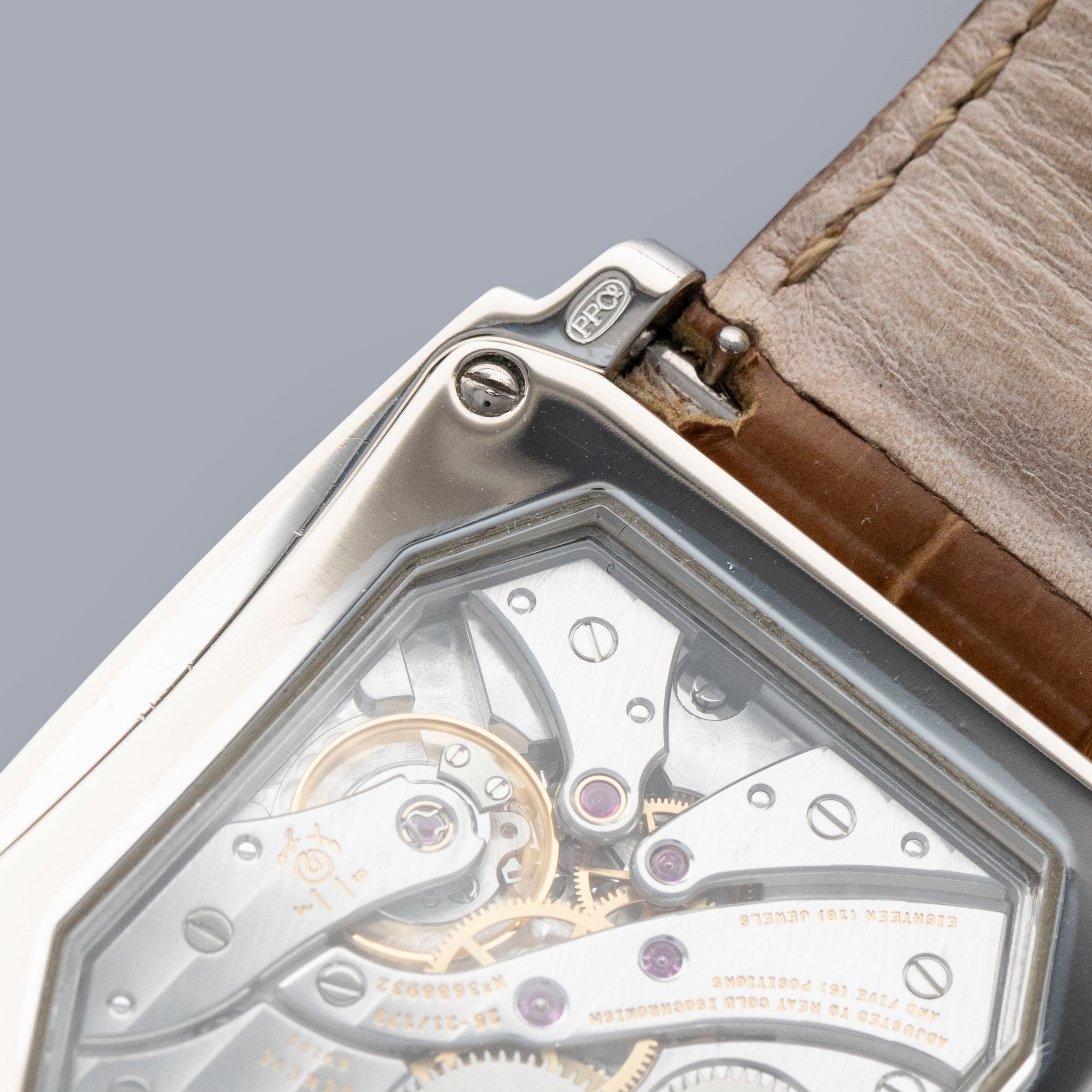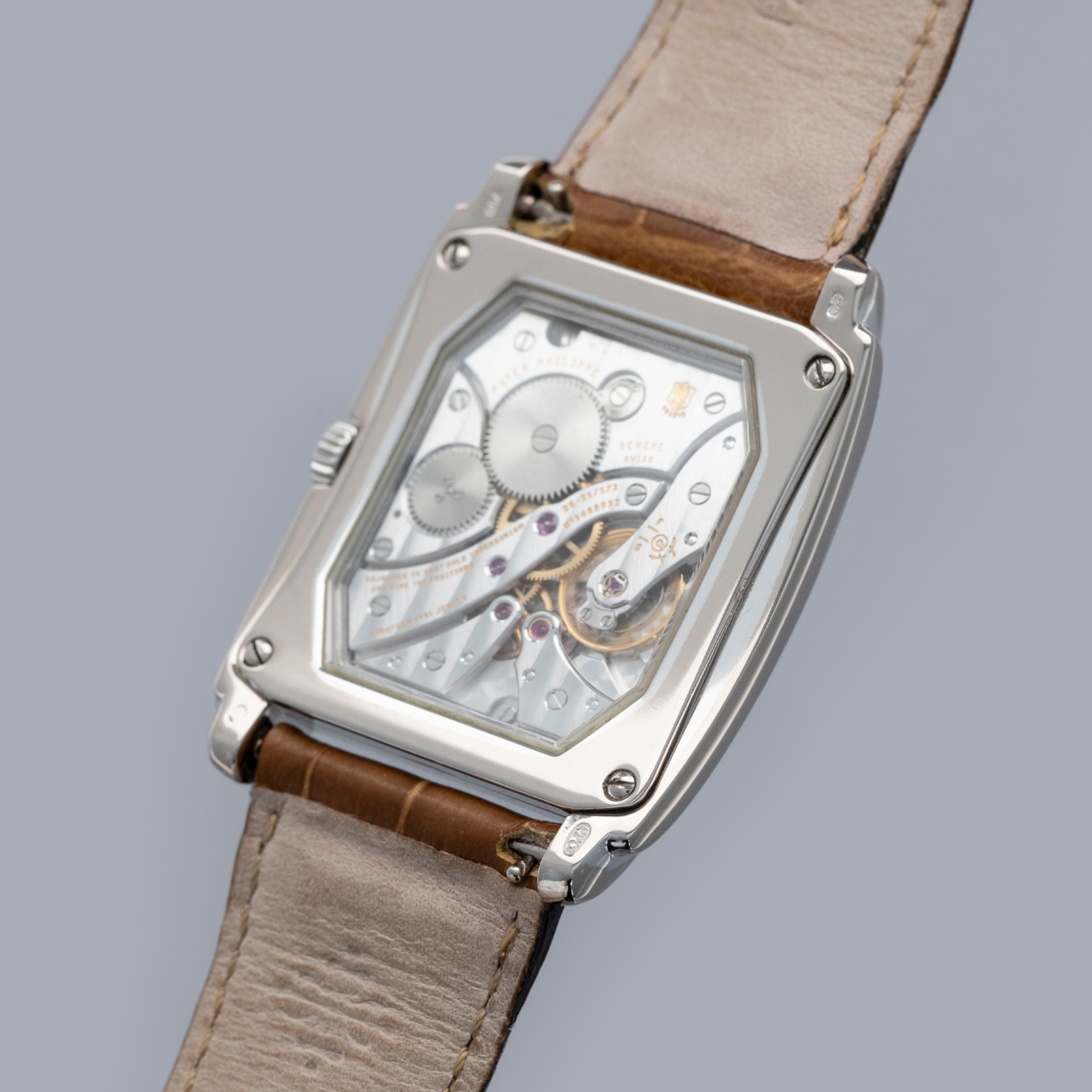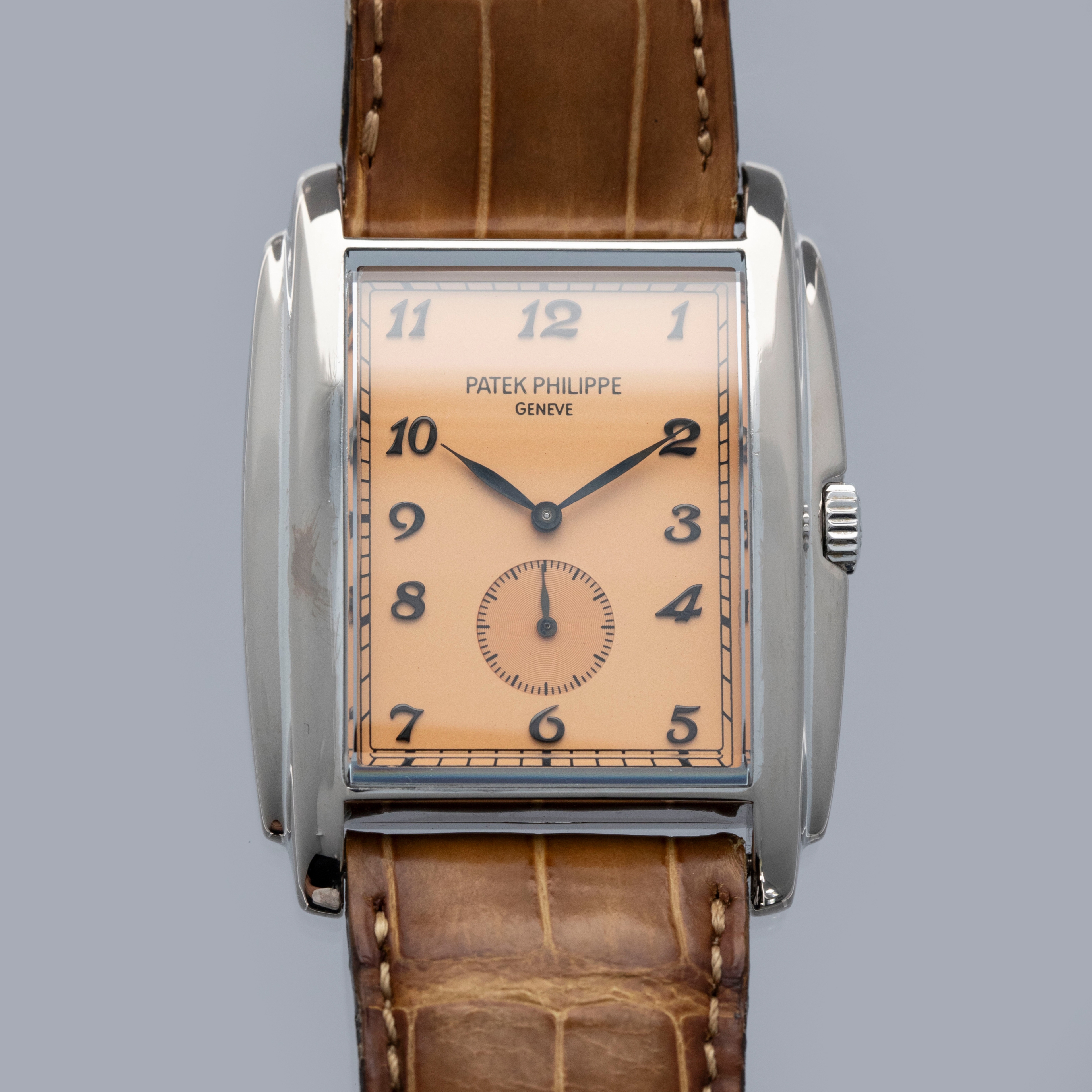 The watch is in overall excellent condition. The white gold case has some light scratches and a couple of tiny nicks, with crisp hallmarks throughout. There is some very light wear on the screw heads in the case back. The dial and hands are near-mint. It is fitted with a brown Patek Philippe crocodile strap in good condition and a white gold Patek Philippe buckle in excellent condition. The watch is accompanied by its original certificate, booklets, and hangtag.