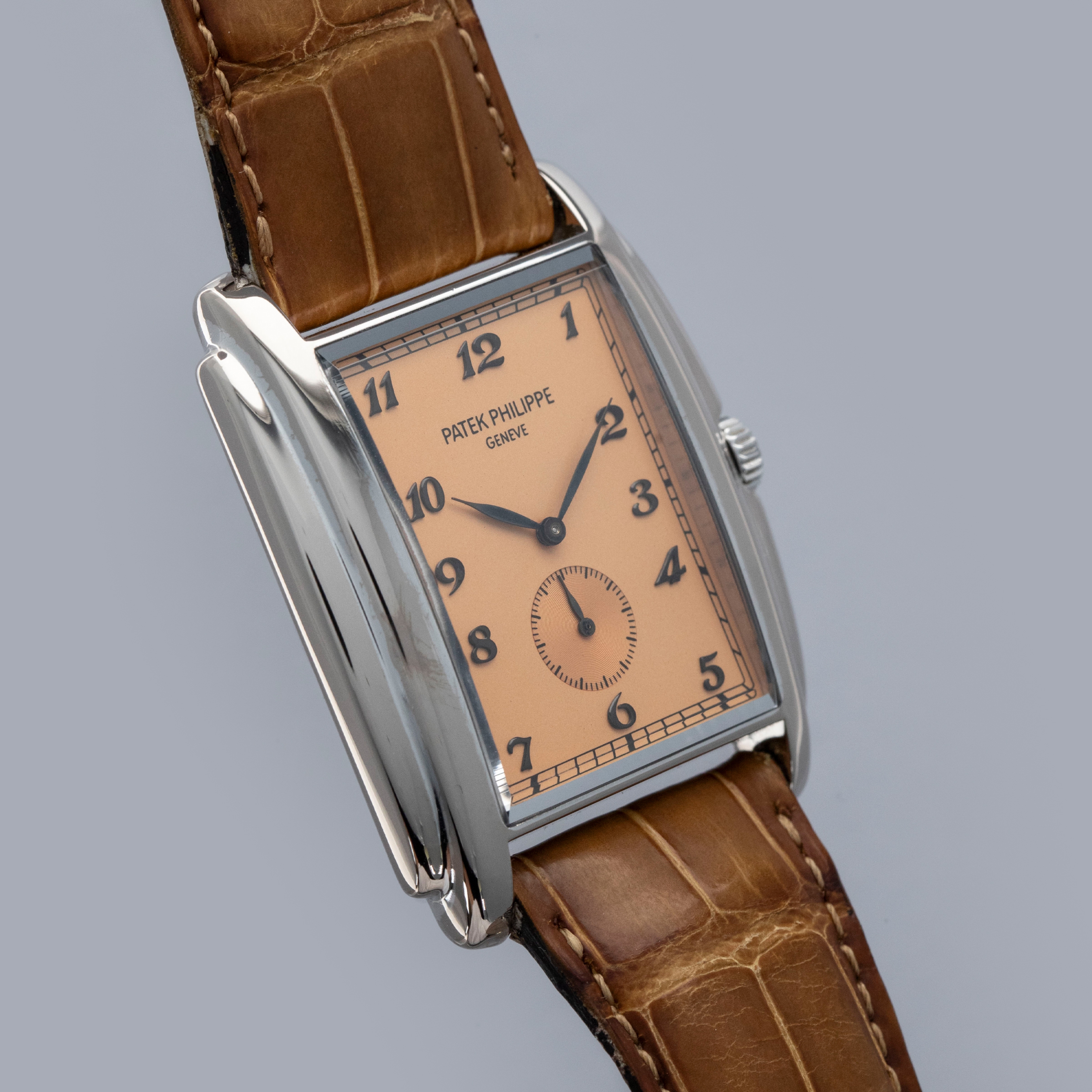 Inspired by the “Chronometro Gondolo” collection that Patek had created in the early 1900s for upscale Brazilian importer “Gondolo & Labourier,” the Patek Philippe Gondolo was launched in 1993 as a means for Patek to embrace the Art Deco designs that were once again becoming popular in the world of watchmaking thanks to brands like JLC, Rolex and others with their Reversos, Cellini Princes and various other watches. Using the Art Deco skyscrapers that split the skylines of the world’s major citites, the Gondolo boasts a beautifully fashioned case that features a stepped bezel and soft curves in between these contrasting surfaces. A dress watch that is removed from the world of plainer round dress watches, the Gondolo adds some flair to the category of watch that is typically more refined, all the while maintaining the tenets of dress watch design, such as its understated dial design, manual-wind movement and precious metal construction on a leather strap. In keeping with these parameters, the ref. 5124G that we have here sports an 18kt white gold case, a stunning salmon dial with a running seconds subdial and a manual-wind cal. 25-21 REC PS movement that exhibits some of Patek’s beautiful finishing beneath its sapphire crystal caseback. A truly stunning watch, this beauty speaks to the elaborate designs of the Art Deco period without going overboard and trying too hard, which demonstrates Patek’s ability as a watchmaker and designer to remain faithful to the adage that sometimes less is more.