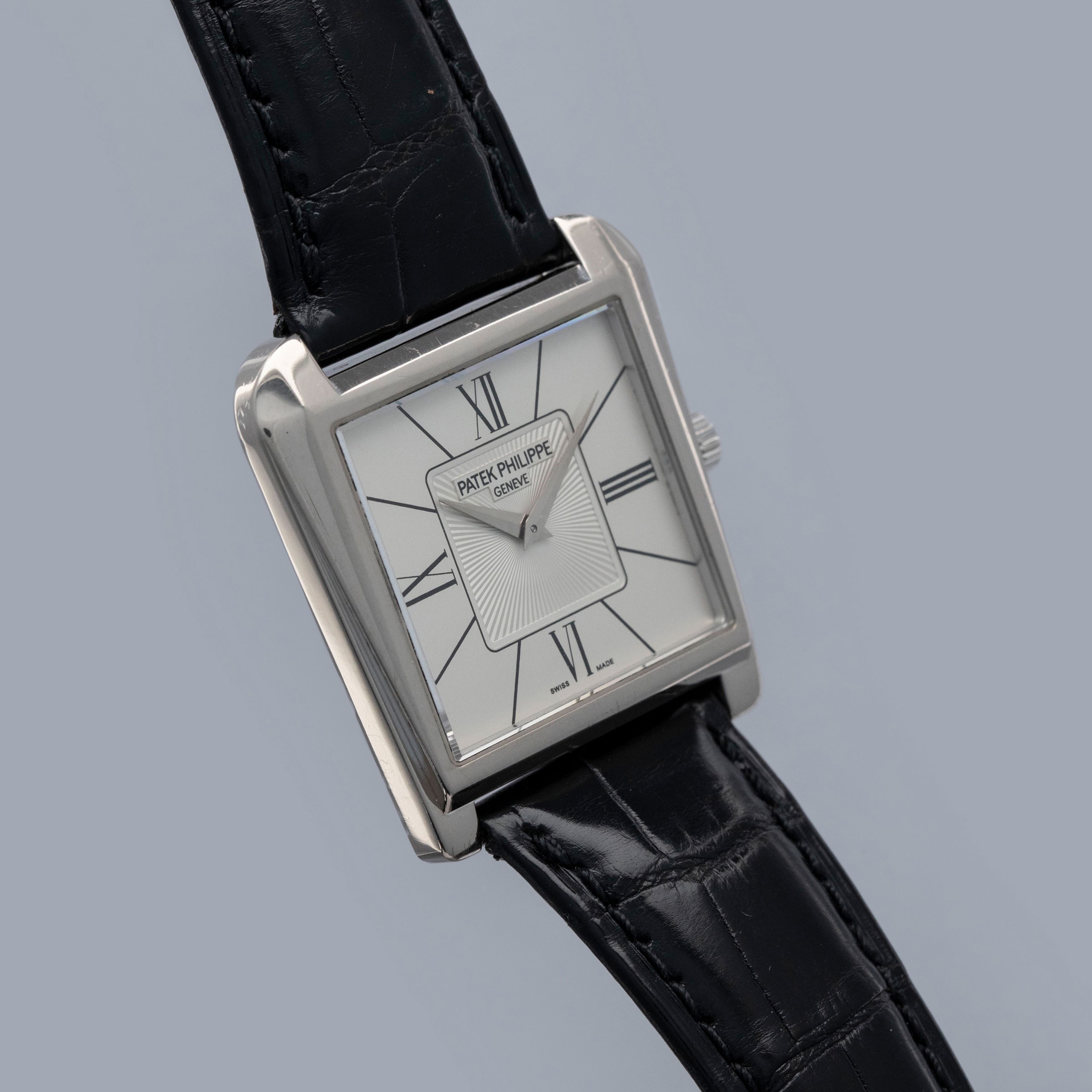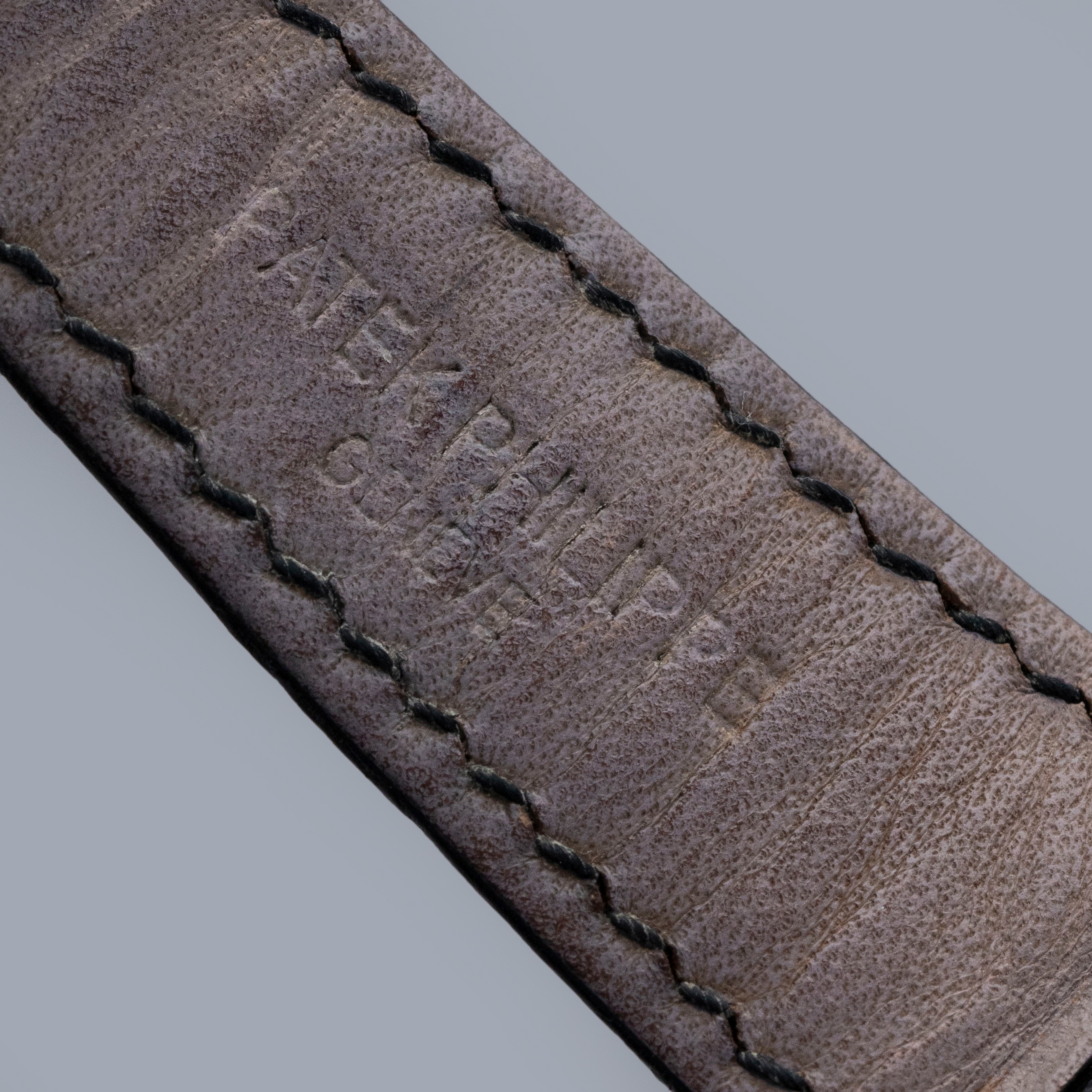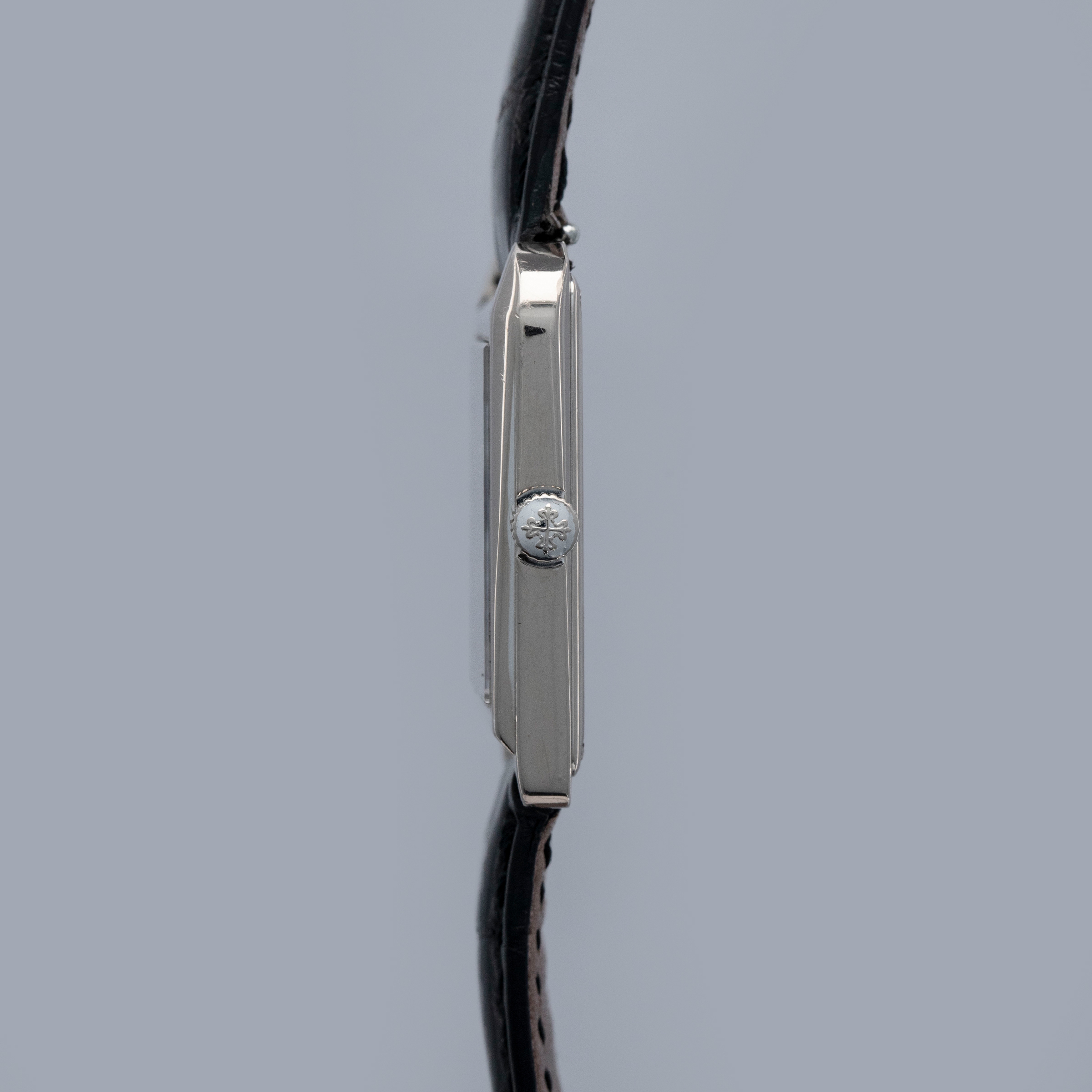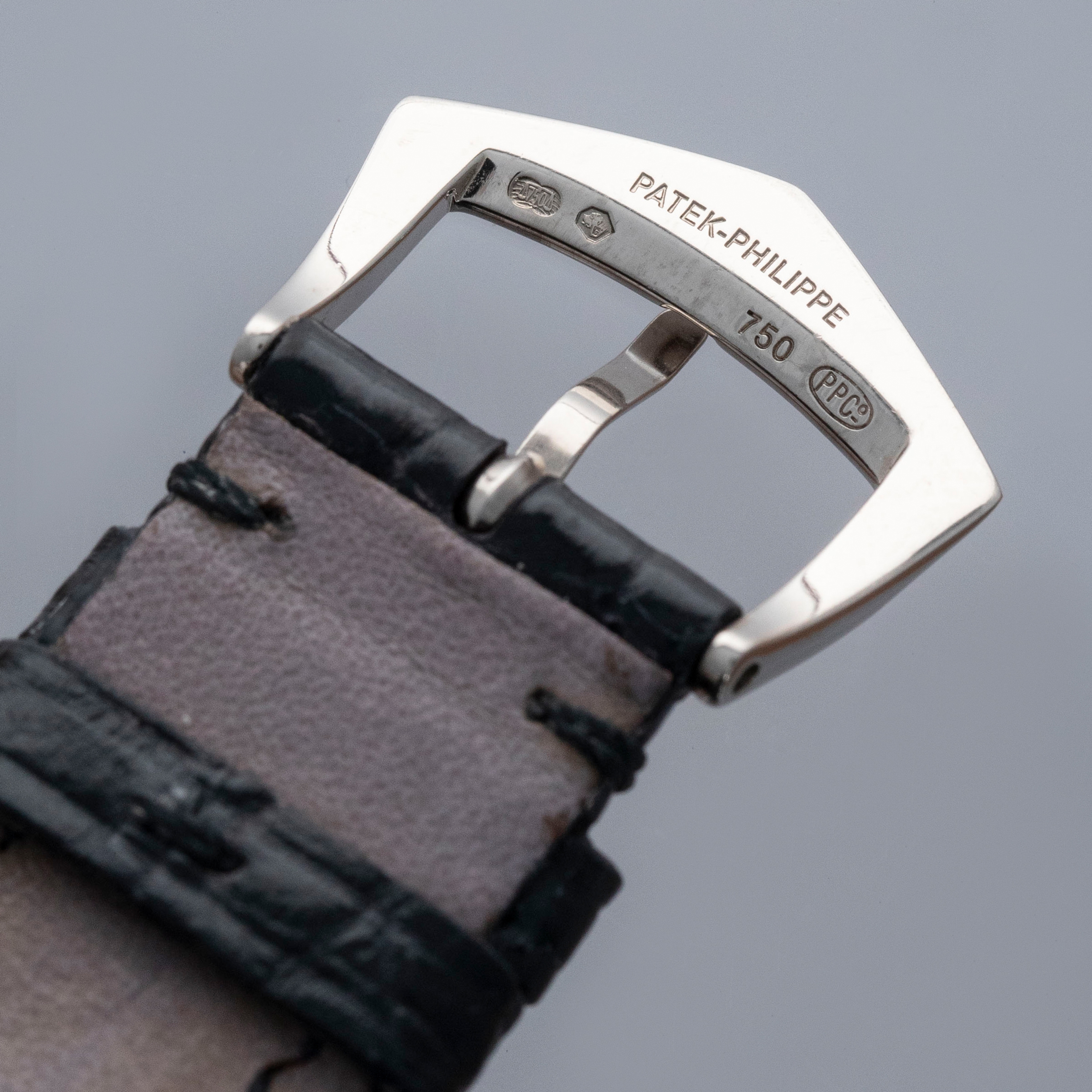 The watch is in overall excellent condition. The white gold case shows some light scratches and a few small nicks, with light wear visible on the screw heads in the case back. The Patek Philippe logo winding crown is well defined. The dial and hands are near-mint. It is fitted with a black Patek Philippe alligator strap in very good condition and a white gold Patek Philippe pin buckle in excellent condition.