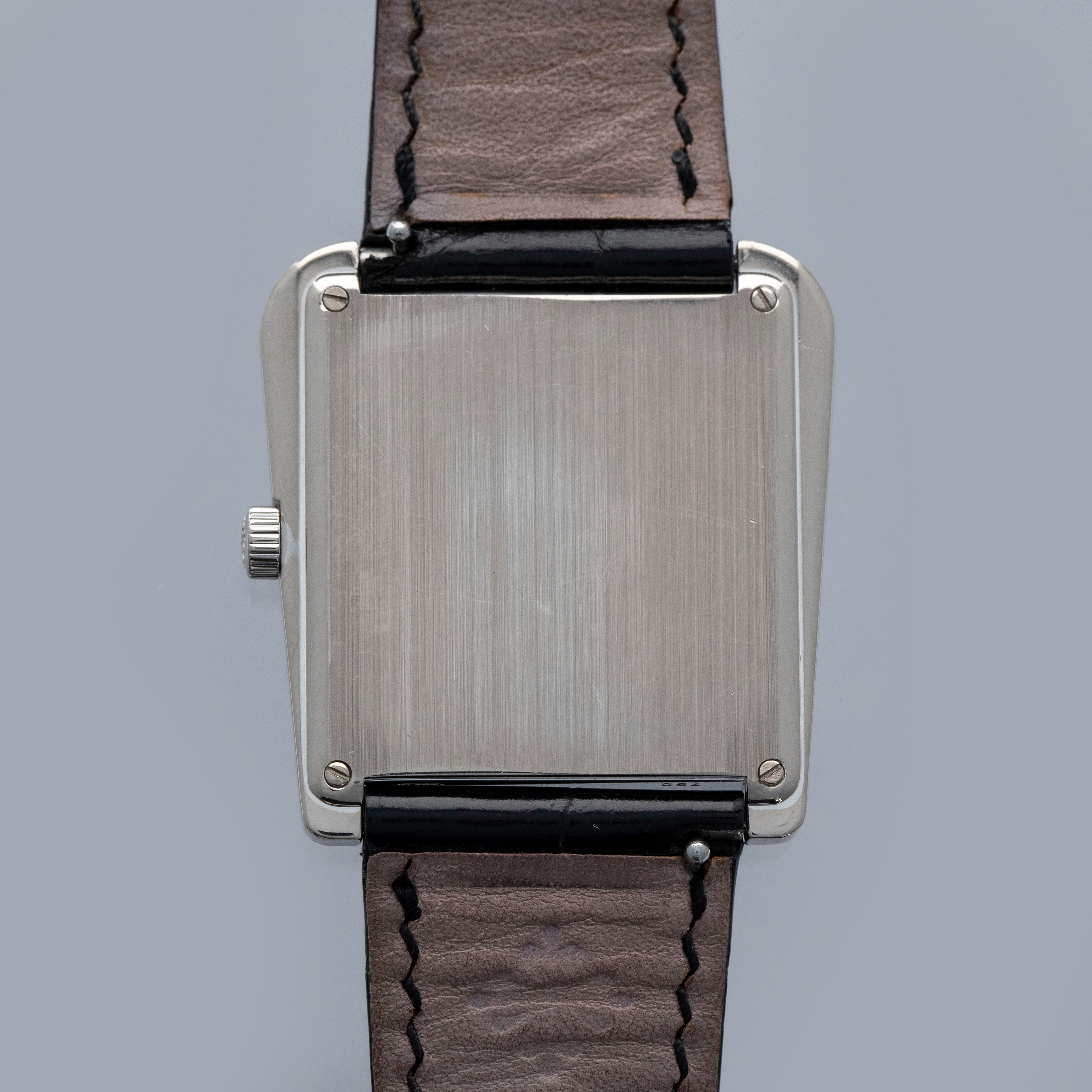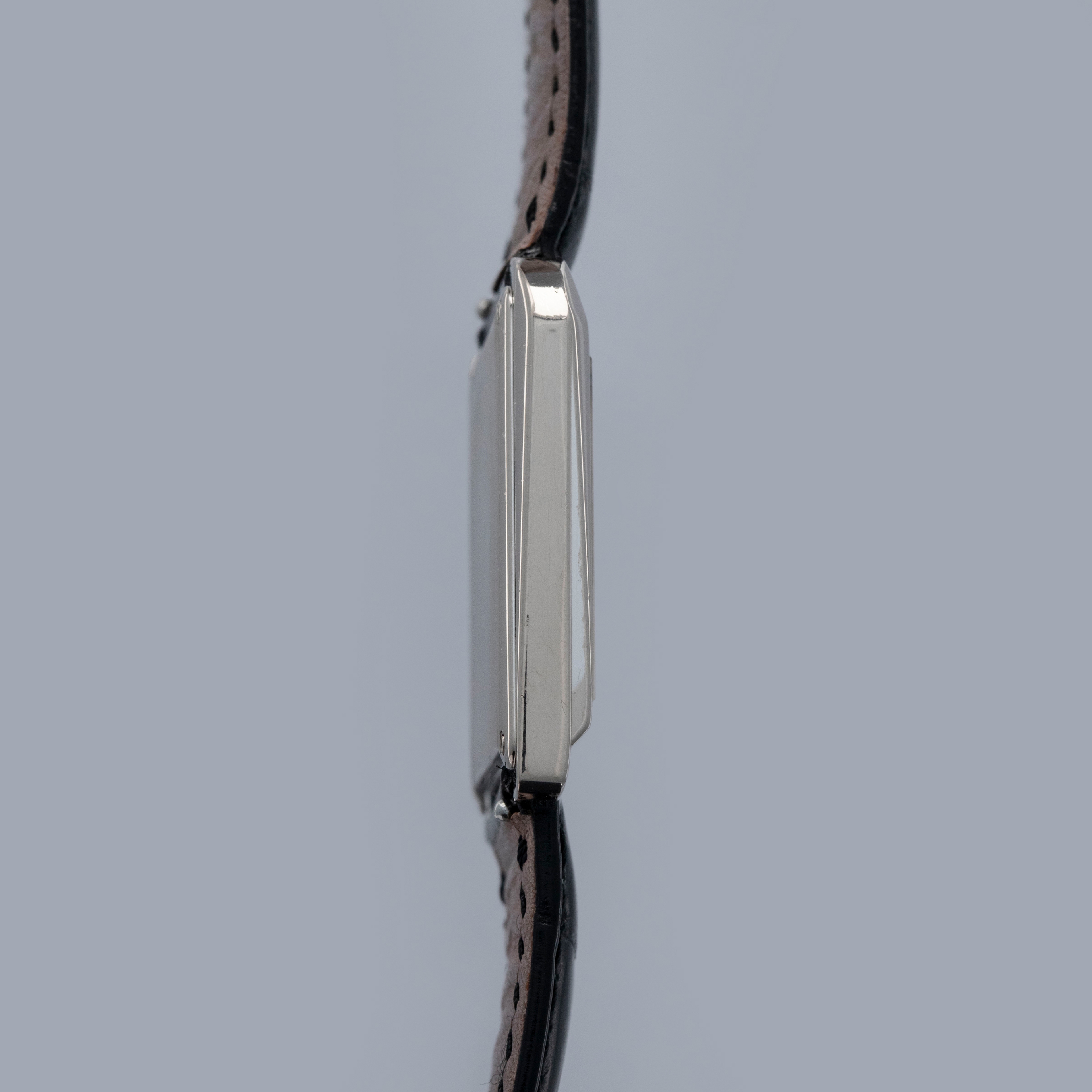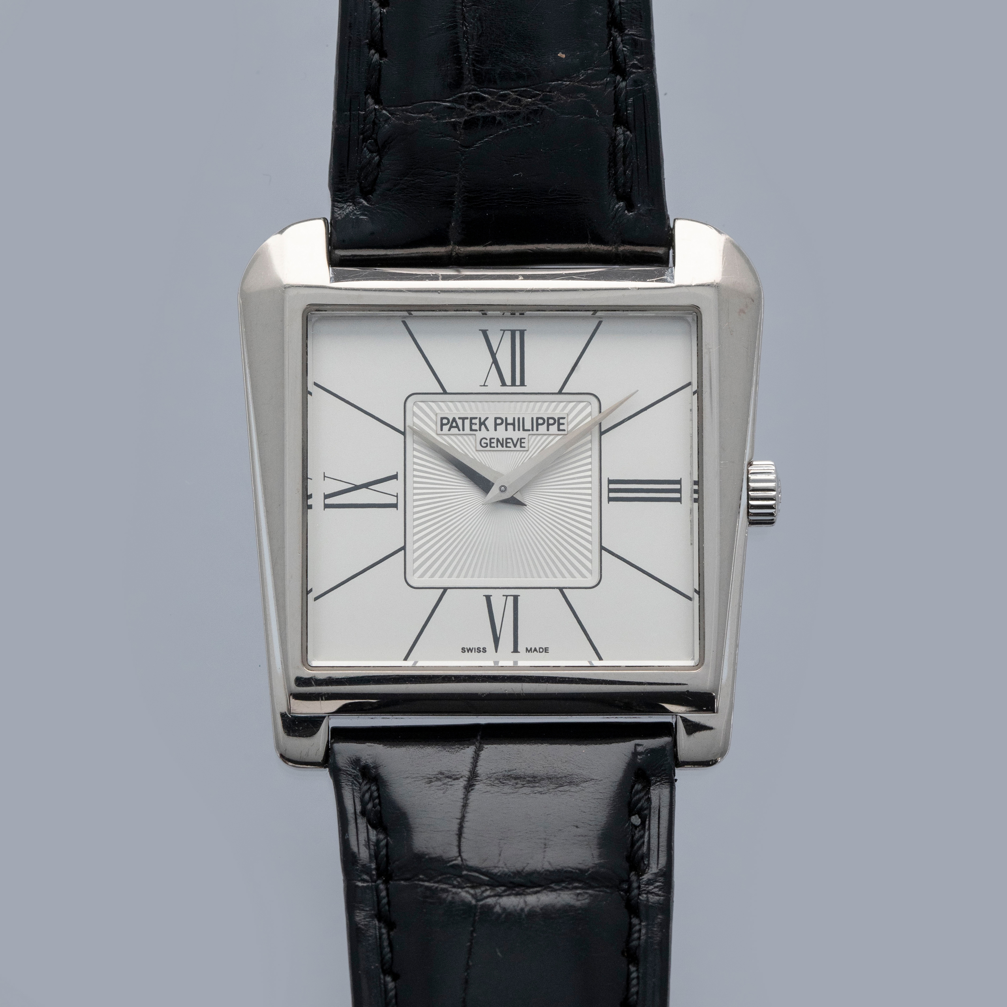 The watch is in overall excellent condition. The white gold case shows some light scratches and a few small nicks, with light wear visible on the screw heads in the case back. The Patek Philippe logo winding crown is well defined. The dial and hands are near-mint. It is fitted with a black Patek Philippe alligator strap in very good condition and a white gold Patek Philippe pin buckle in excellent condition.
