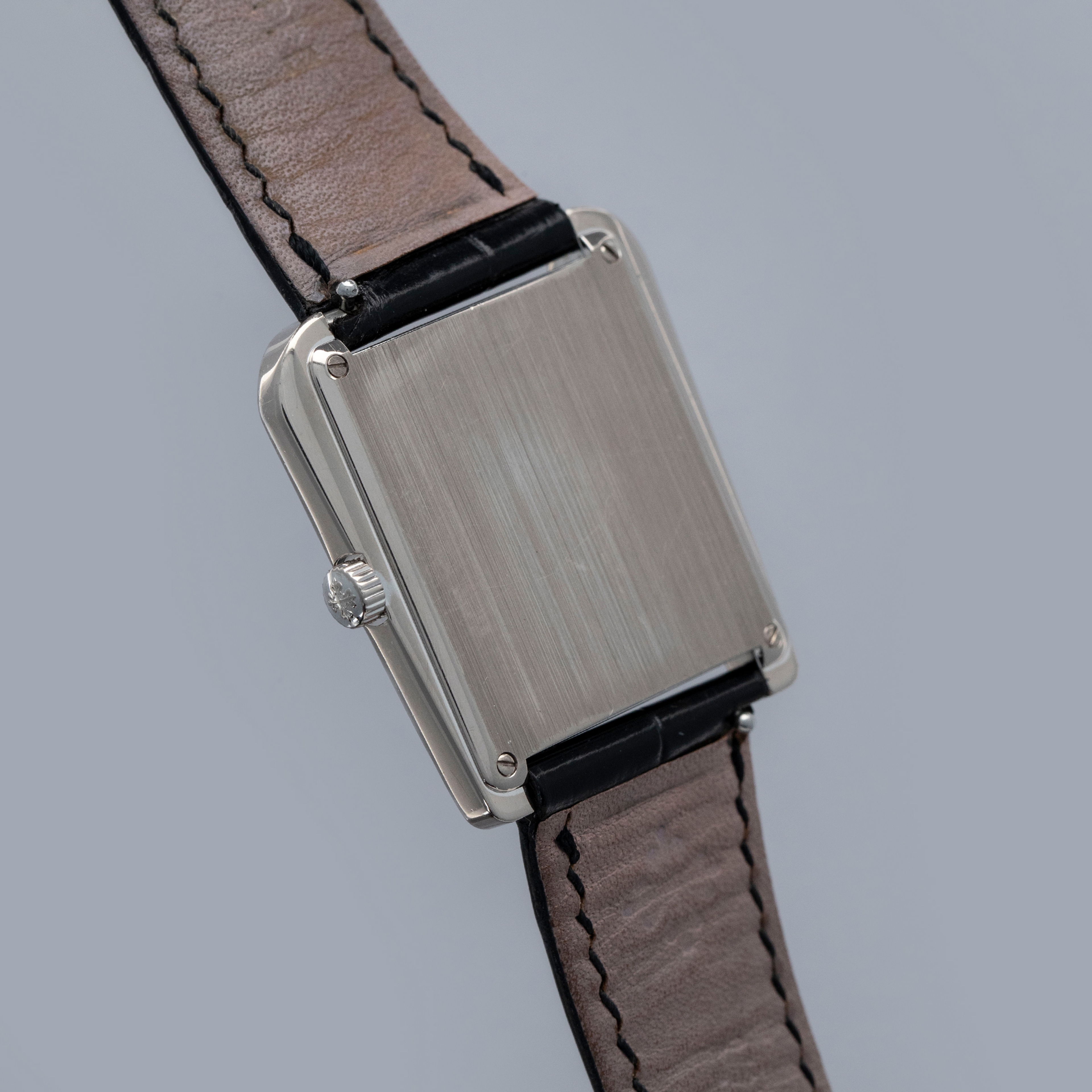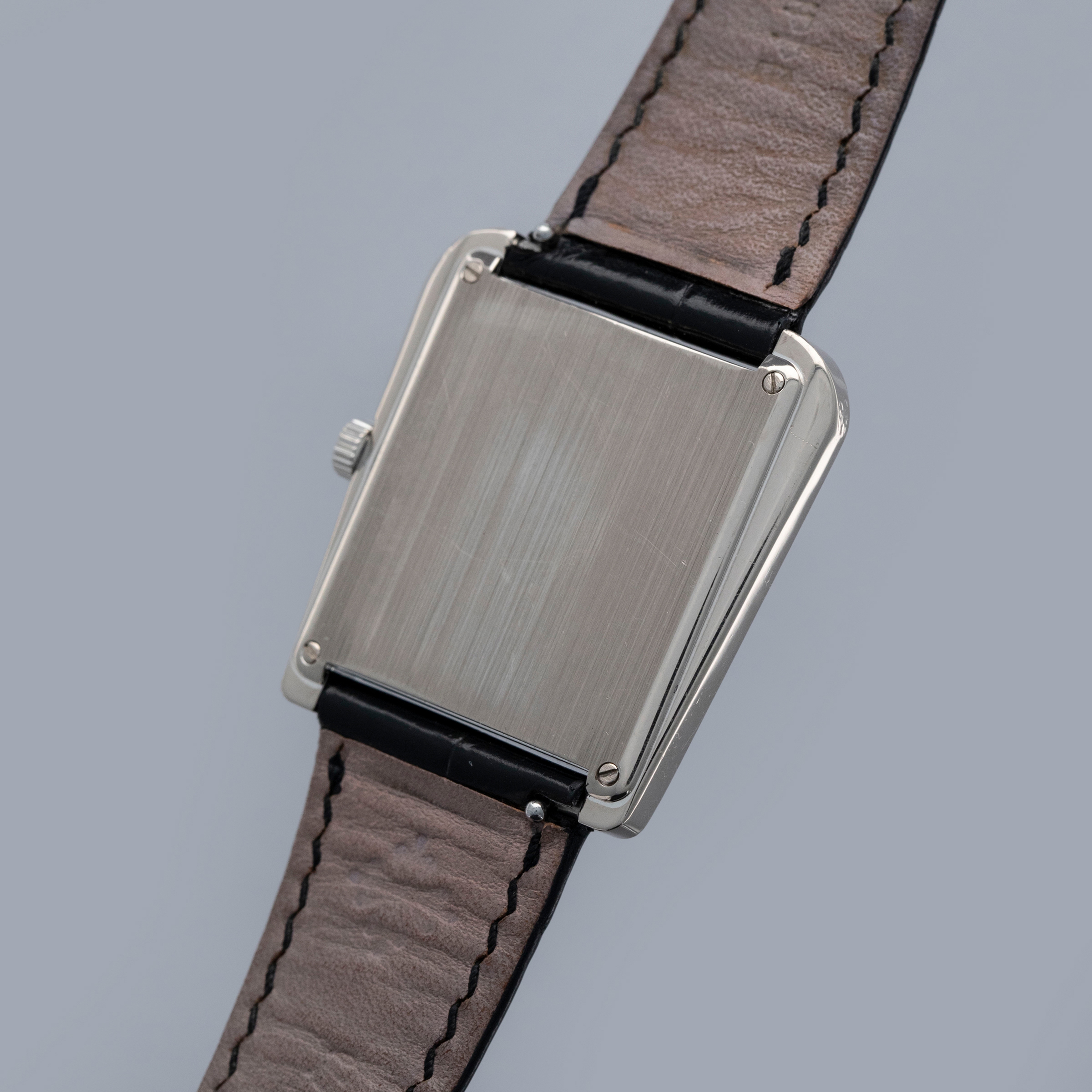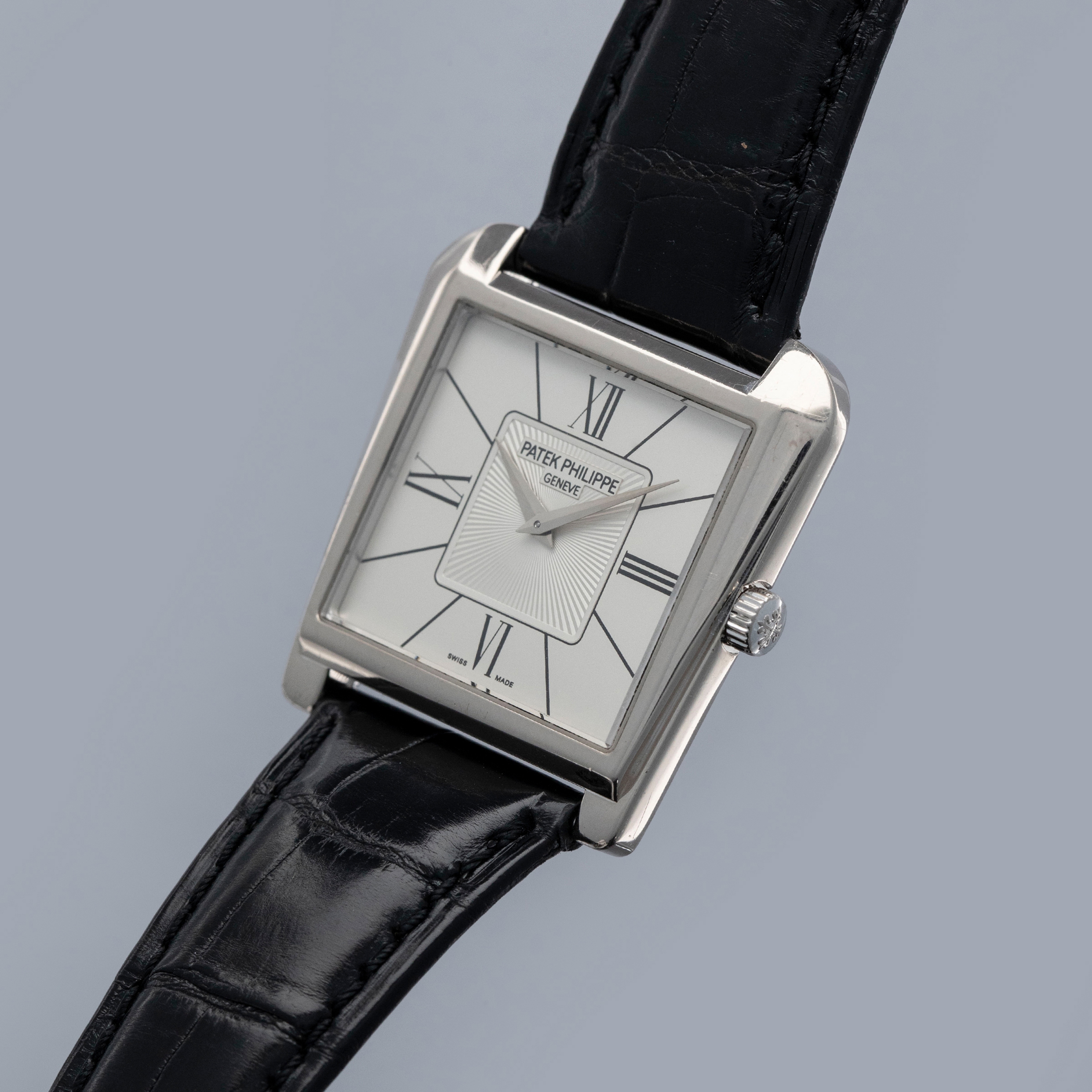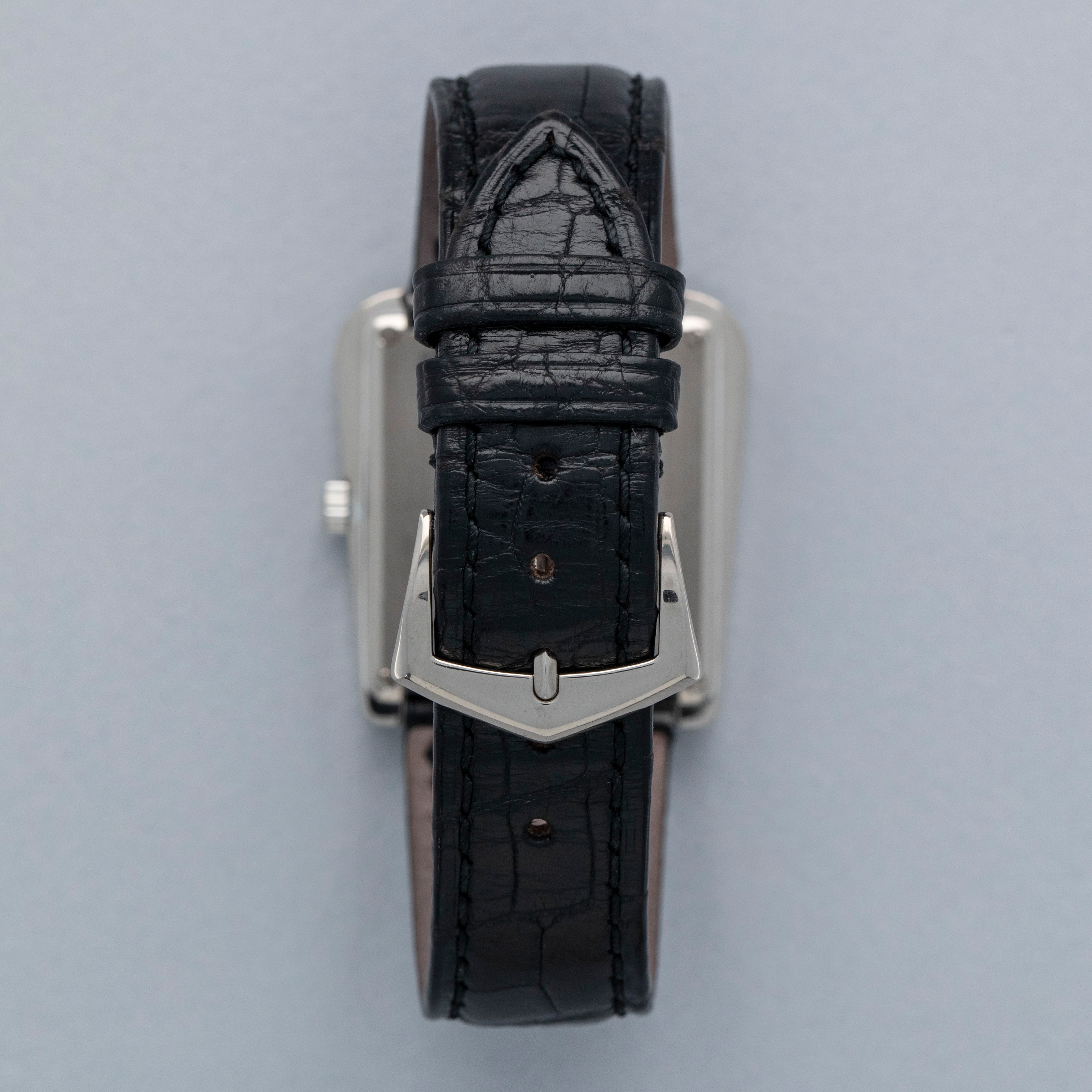 The watch is in overall excellent condition. The white gold case shows some light scratches and a few small nicks, with light wear visible on the screw heads in the case back. The Patek Philippe logo winding crown is well defined. The dial and hands are near-mint. It is fitted with a black Patek Philippe alligator strap in very good condition and a white gold Patek Philippe pin buckle in excellent condition.
