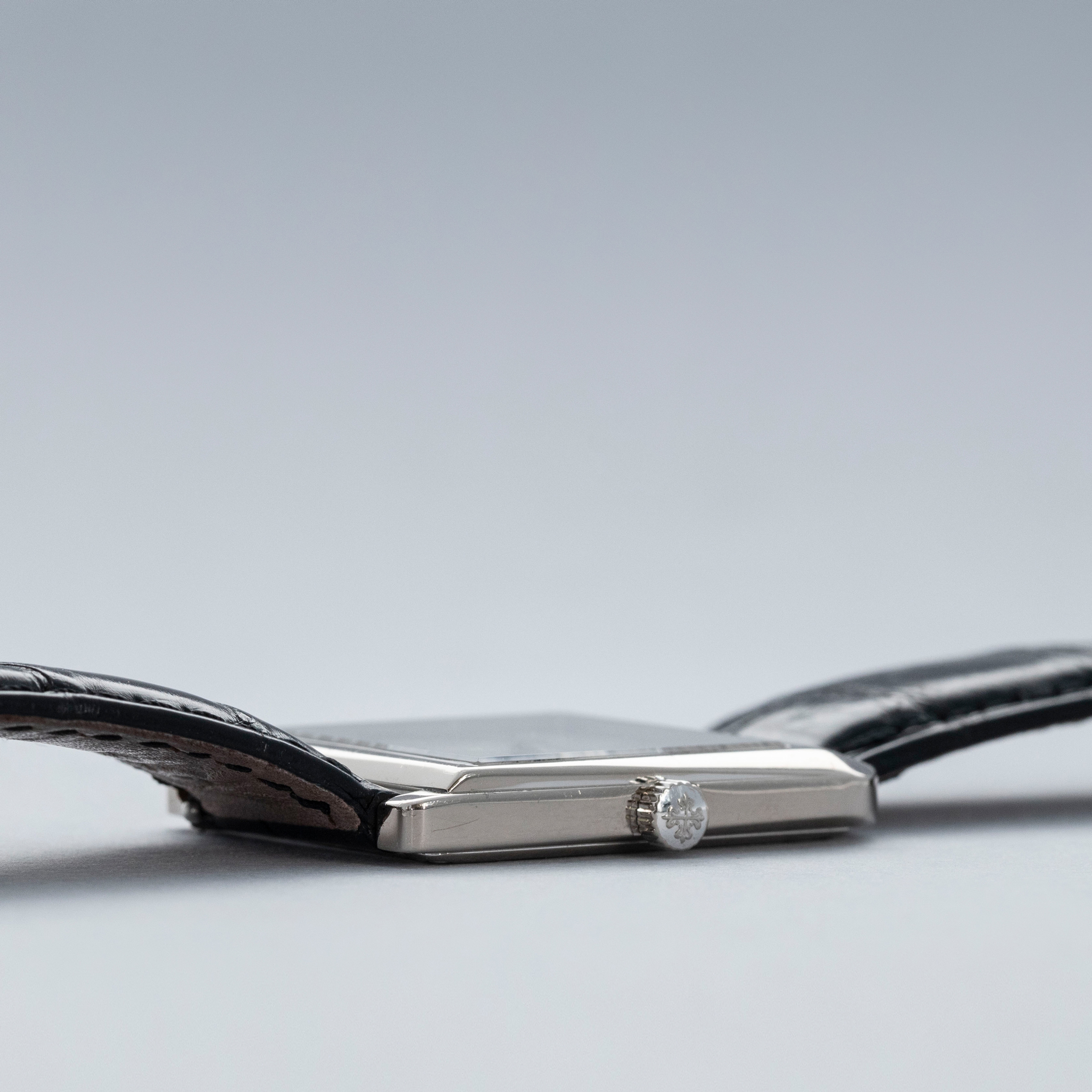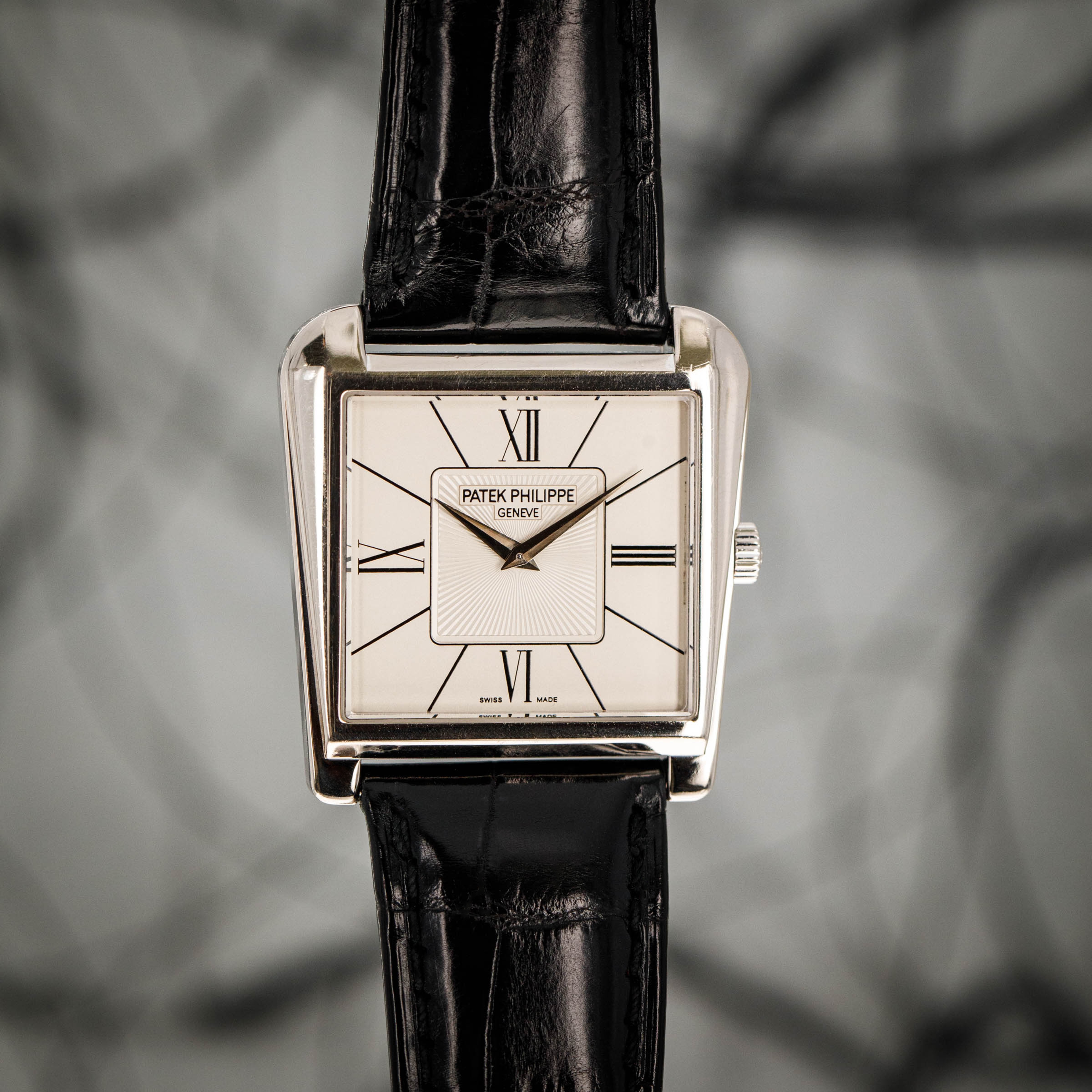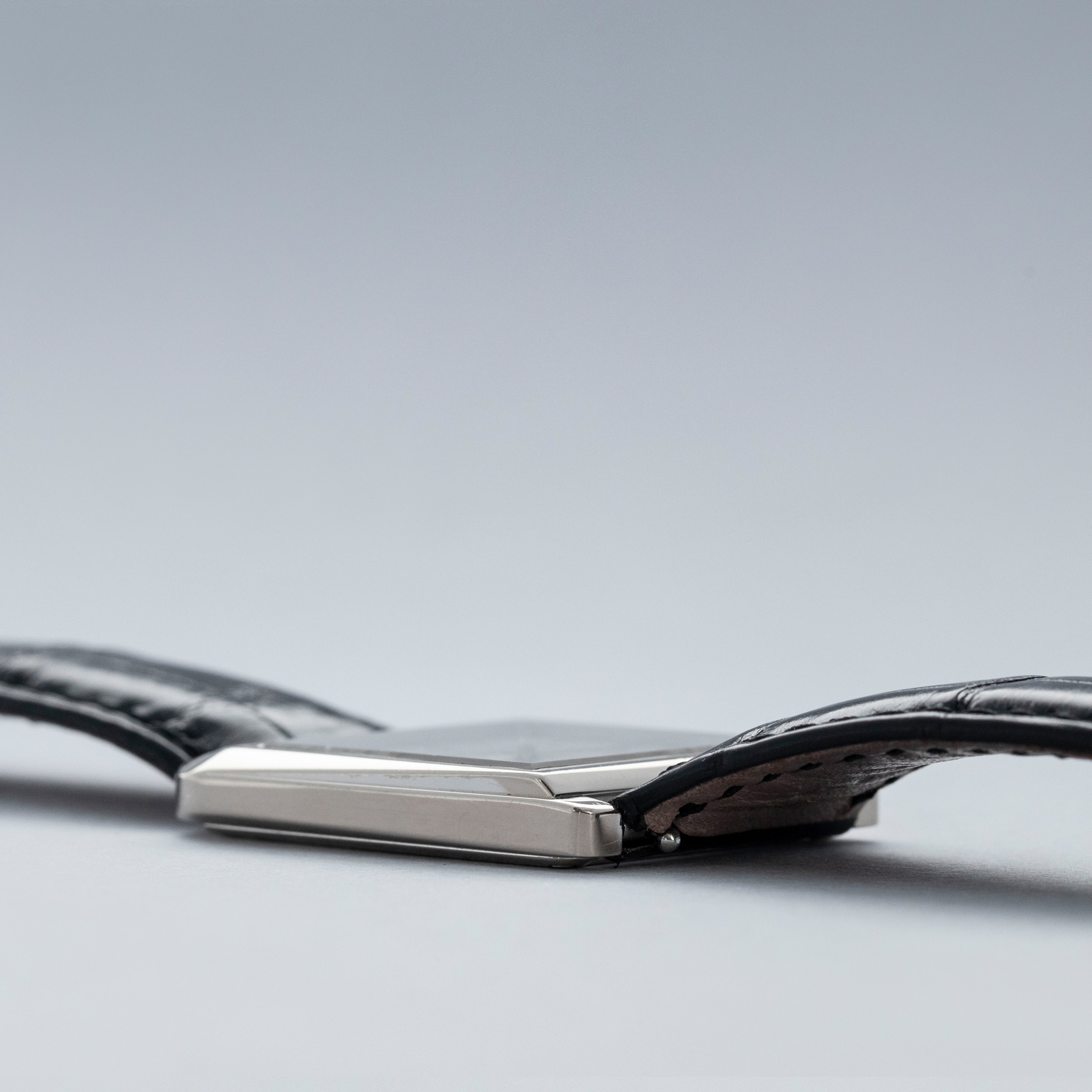 Inspired by the “Chronometro Gondolo” collection that Patek had created in the early 1900s for upscale Brazilian importer “Gondolo & Labourier,” the Patek Philippe Gondolo was launched in 1993 as a means for Patek to embrace the Art Deco designs that were once again becoming popular in the world of watchmaking thanks to brands like JLC, Rolex and others with their Reversos, Cellini Princes and various other watches. Using the Art Deco skyscrapers that split the skylines of the world’s major citites, the Gondolo boasts a beautifully fashioned case that features a stepped bezel and soft curves in between these contrasting surfaces. A dress watch that is removed from the world of plainer round dress watches, the Gondolo adds some flair to the category of watch that is typically more refined, all the while maintaining the tenets of dress watch design, such as its understated dial design, manual-wind movement and precious metal construction on a leather strap. In keeping with these parameters, the ref. 5489G that we have here sports an asymmetrical “Trapeze” 18kt white gold case inspired by the legendary designs by Gilbert Albert from the 50s and 60s and a stunning silver sector dial with a guilloche center. A truly stunning watch, the ref. 5489G speaks to the elaborate designs of the Art Deco period without going overboard and trying too hard, which demonstrates Patek’s ability as a watchmaker and designer to remain faithful to the adage that sometimes less is more.