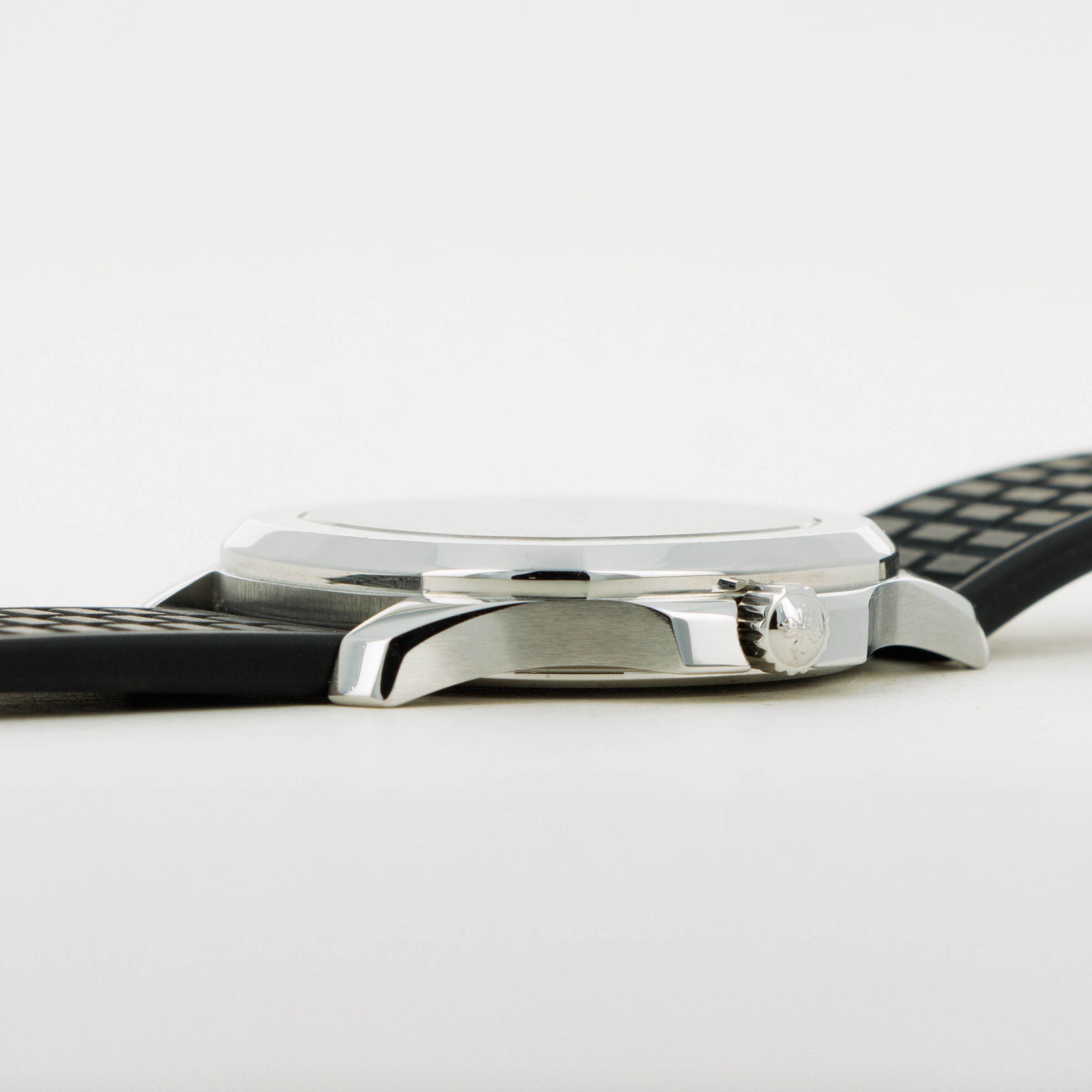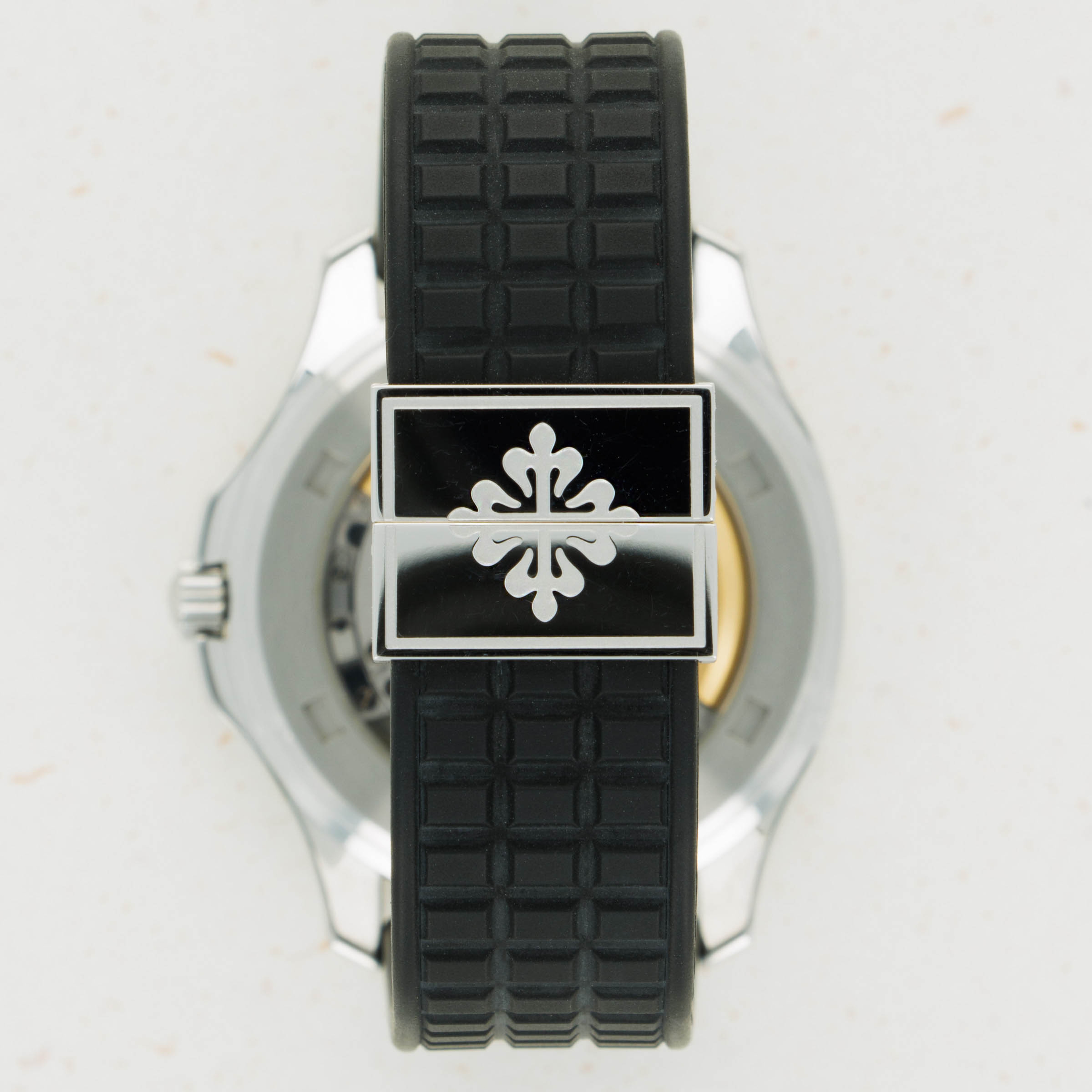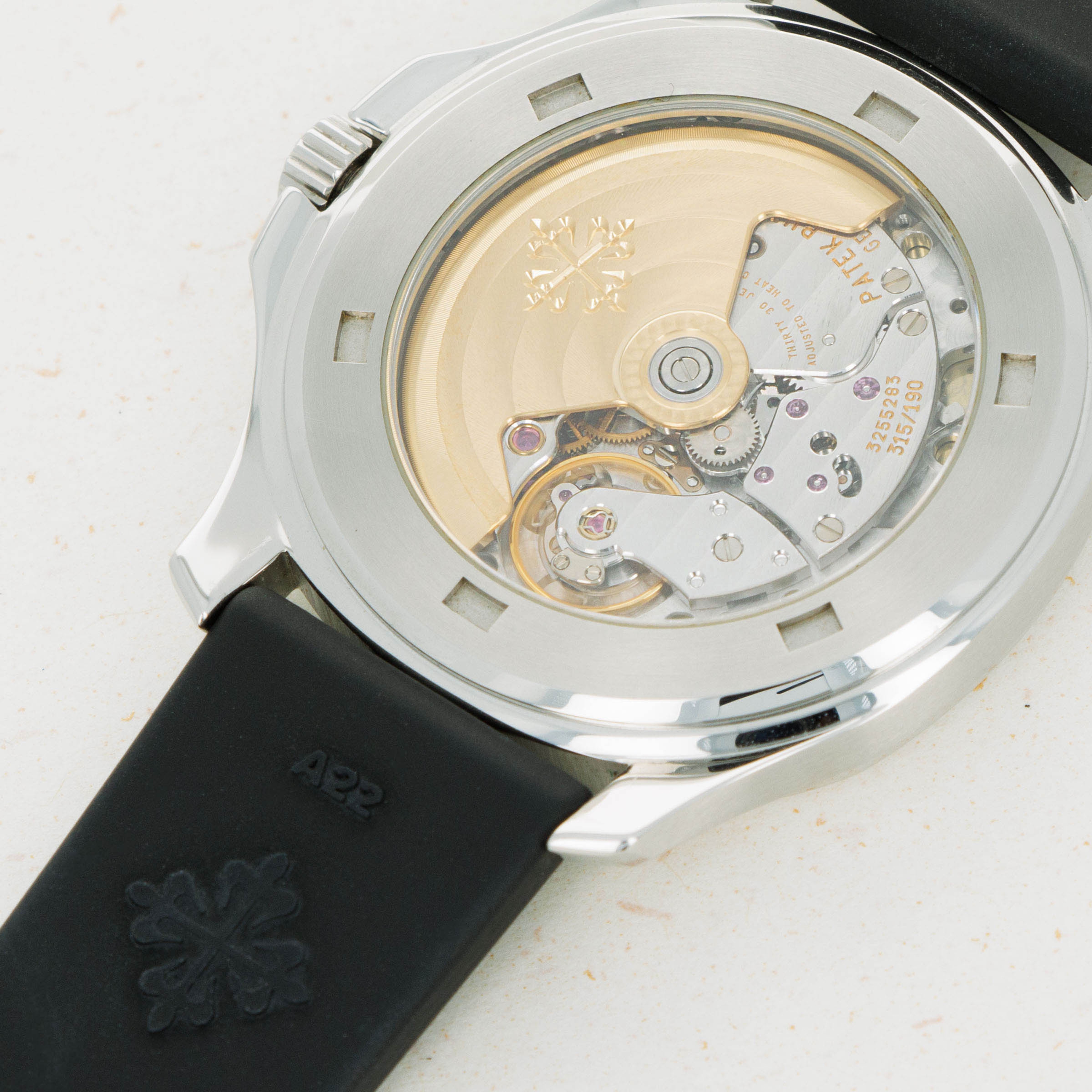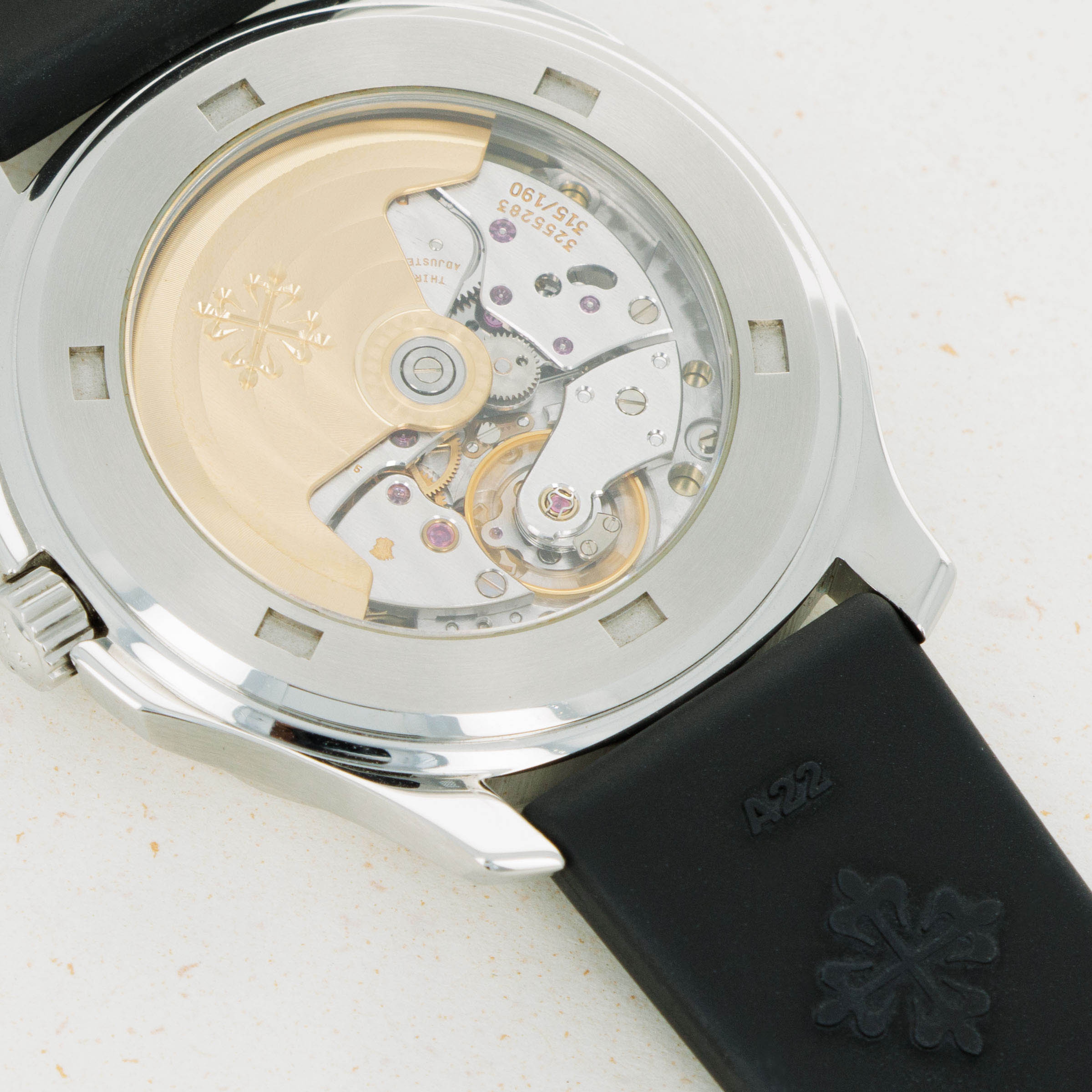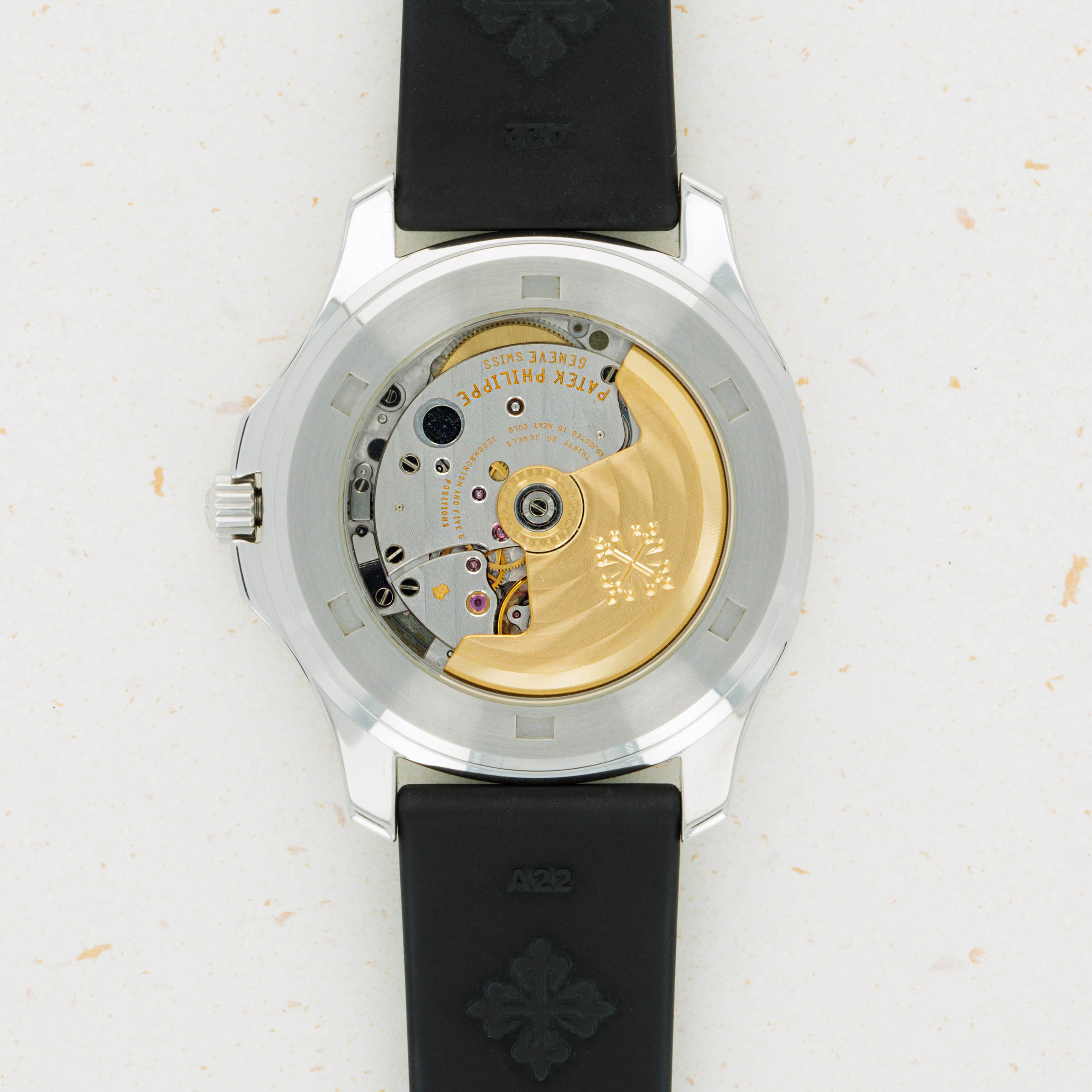Debuting in 1997, the Patek Philippe Aquanaut was released to engage with a new kind of clientele - a younger, sportier, and trendier watch collector that was newly minted on the back of the “dot com” stock market explosion. Released under the same premise as the Nautilus when it was released in 1976 – a trendy watch for a new clientele, the Aquanaut raised suspicions from Patek’s traditional collectors with its position as the first Patek to feature a rubber strap – something collectors saw as a cheap design option at the time. With the Aquanaut’s black rectangle-filled rubber strap and matching supposed-grenade-inspired dial, the Aquanaut is a smart and trendy option for the collector who wants their timepiece to fly under the radar while still packing a hefty punch of horological history and an iconic design that has since become one of Patek Philippe’s most emblematic offerings. Launched in 1998, just one year after the model’s initial debut, the ref. 5065A introduced two significant changes to the collection over its predecessor, the ref. 5060. These two changes were a 2mm larger case – now weighing in at 38mm, and a sapphire crystal exhibition caseback. With its larger display providing a better balance between case and dial and its new sapphire caseback providing a very real view of the stunning movement that powered the ref. 5065, the Aquanaut continued to grow as one of Patek’s best value propositions. Today, it exists as one of their most sought-after models, and the ref. 5065 was instrumental in kickstarting its popularity.
