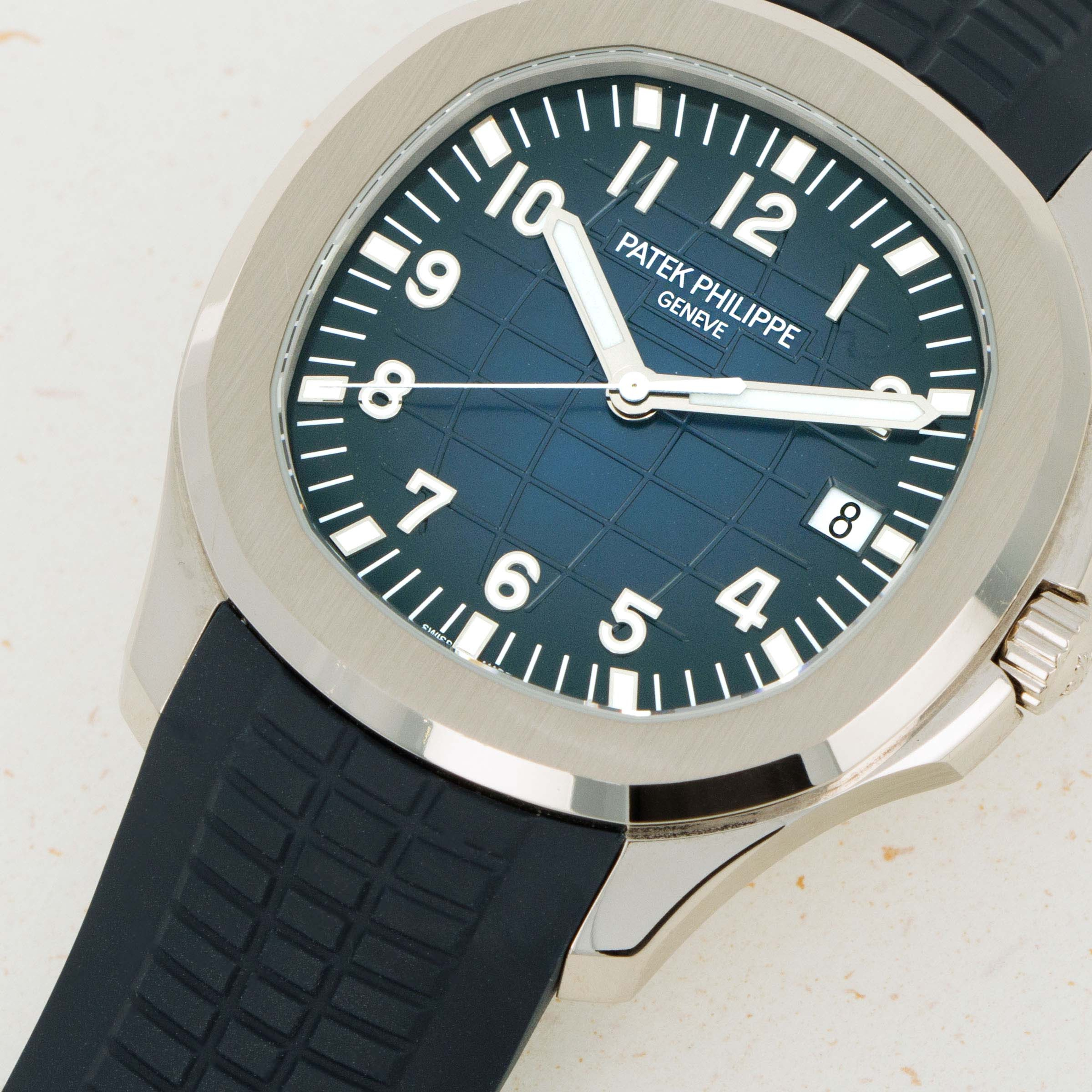 The ref. 5168G's sleek blue dial features an engraved crosshatch pattern that flows onto the tropical rubber strap, giving the Aquanaut an entirely integrated aesthetic.