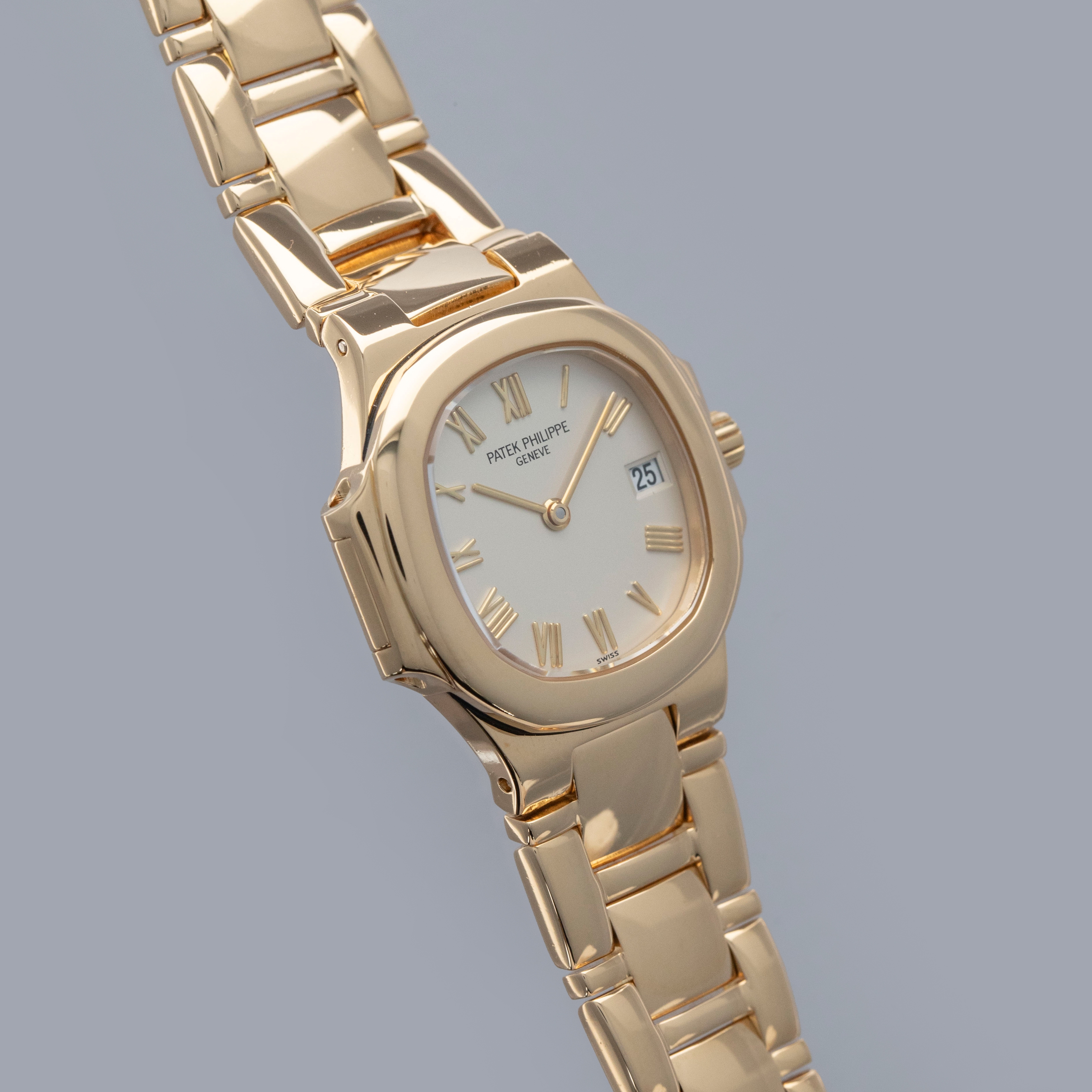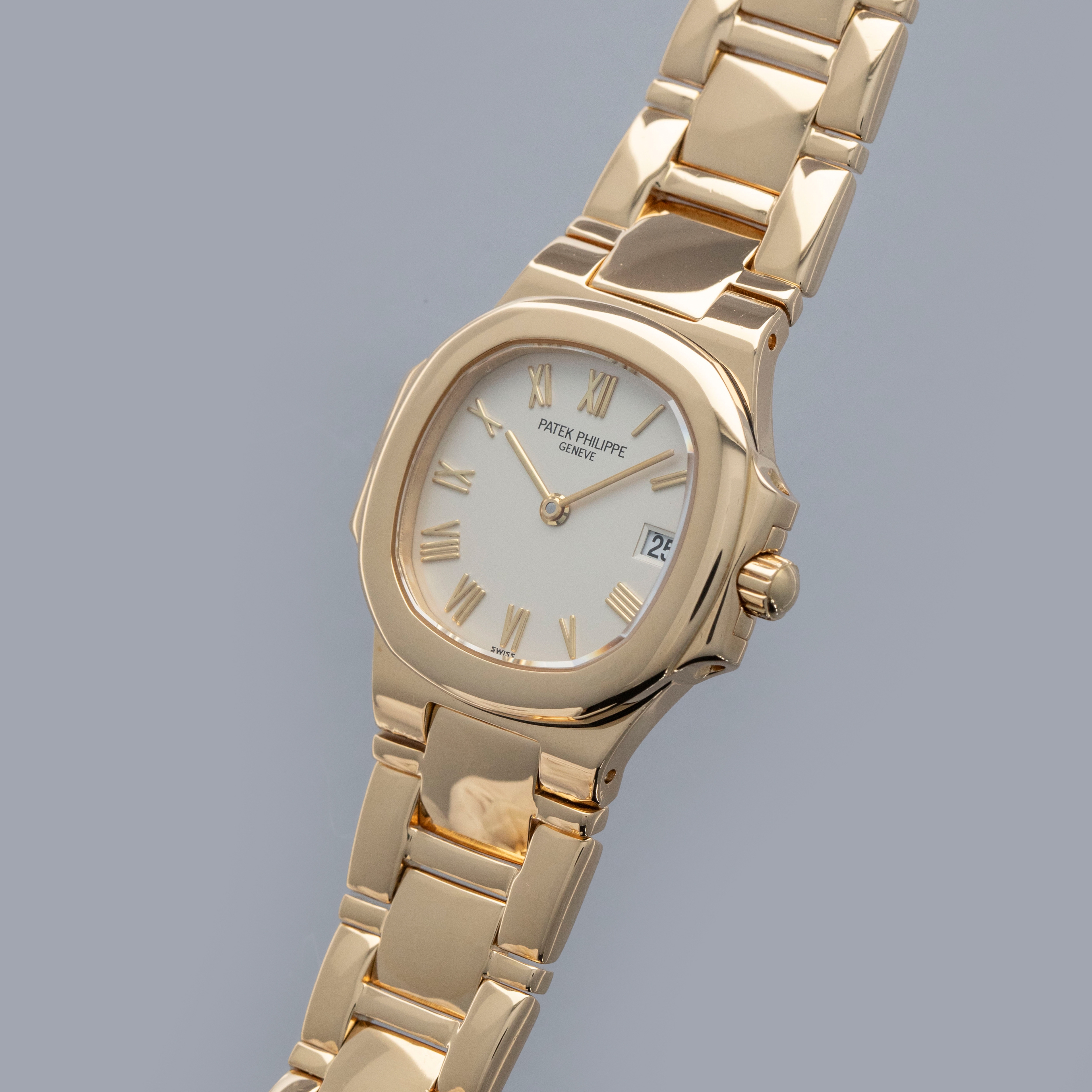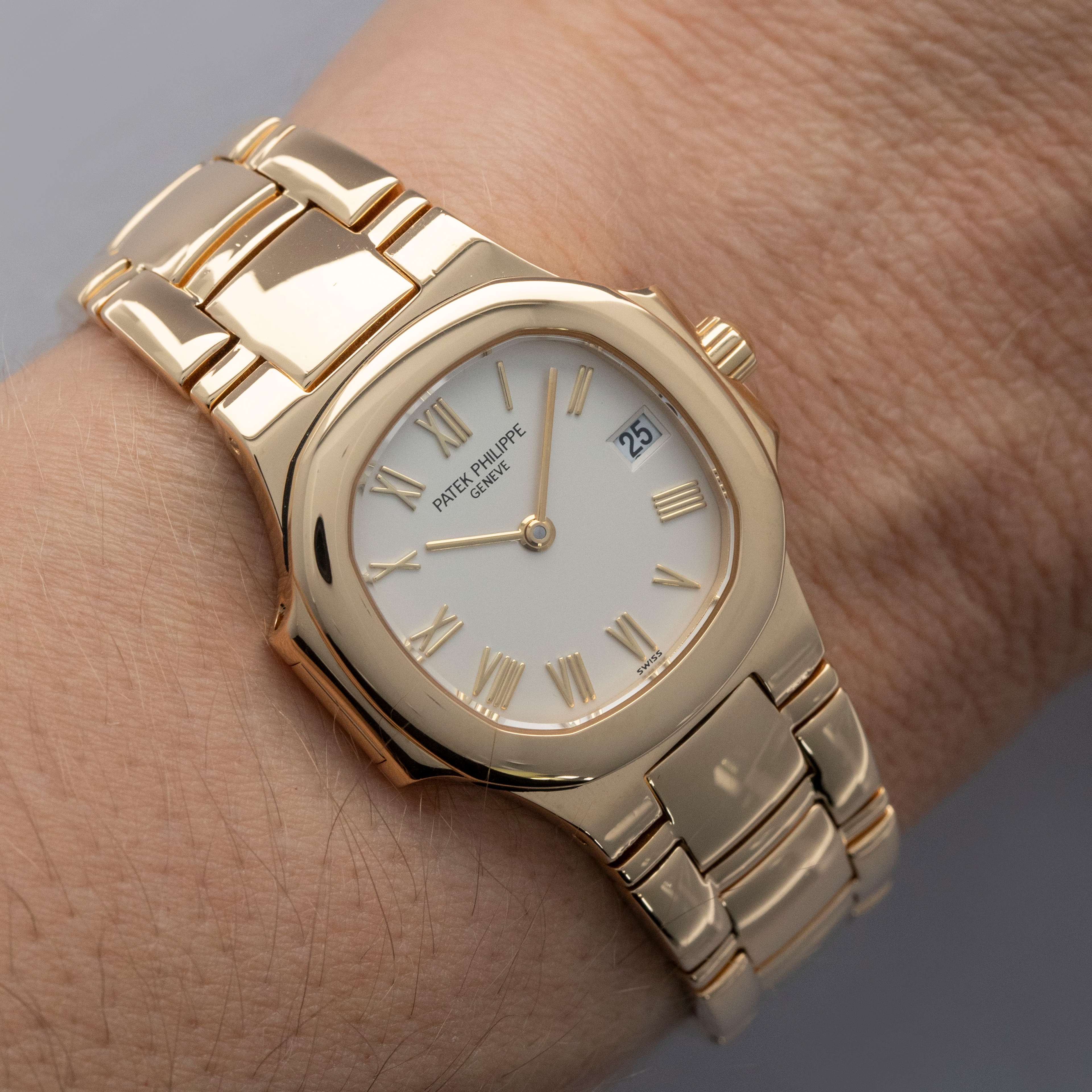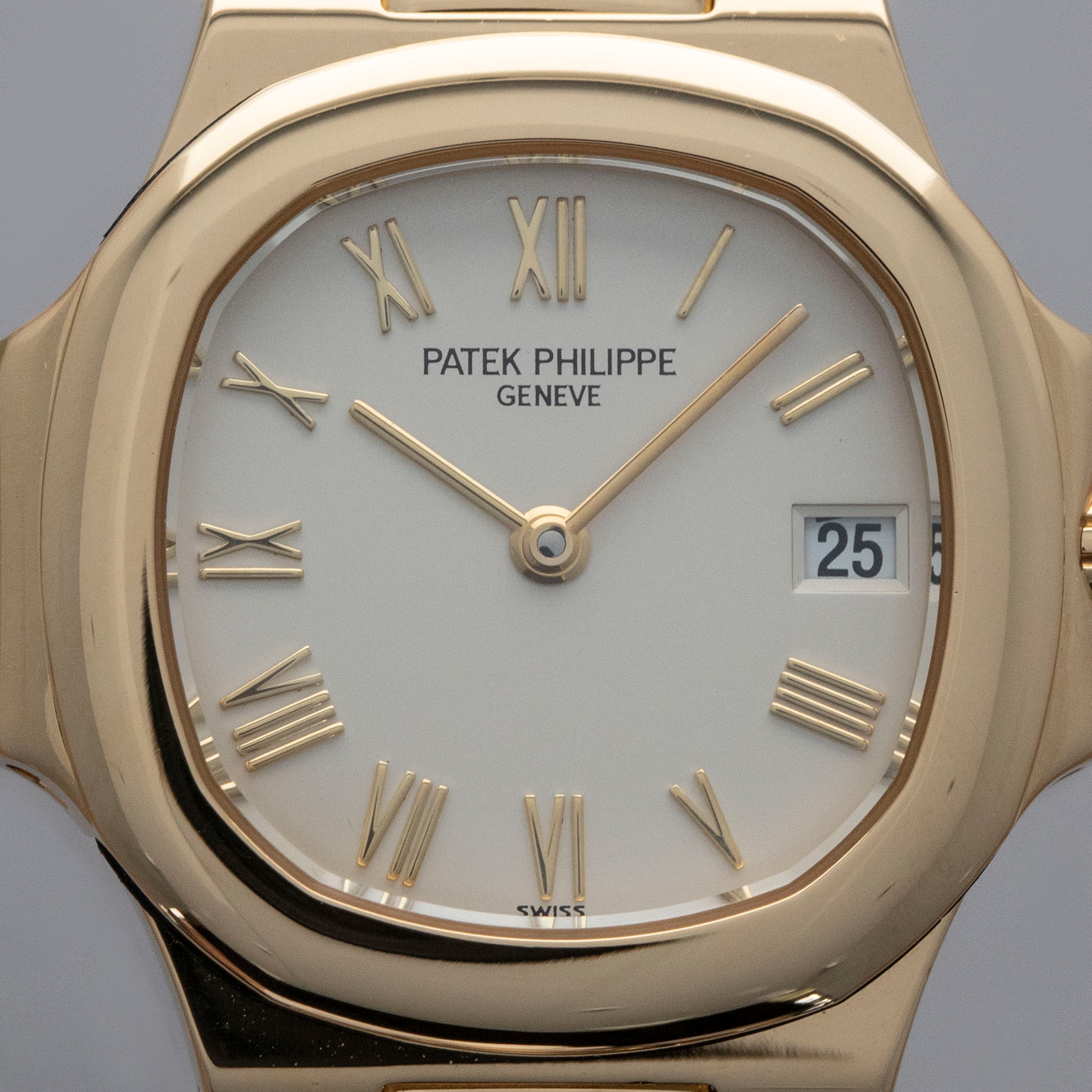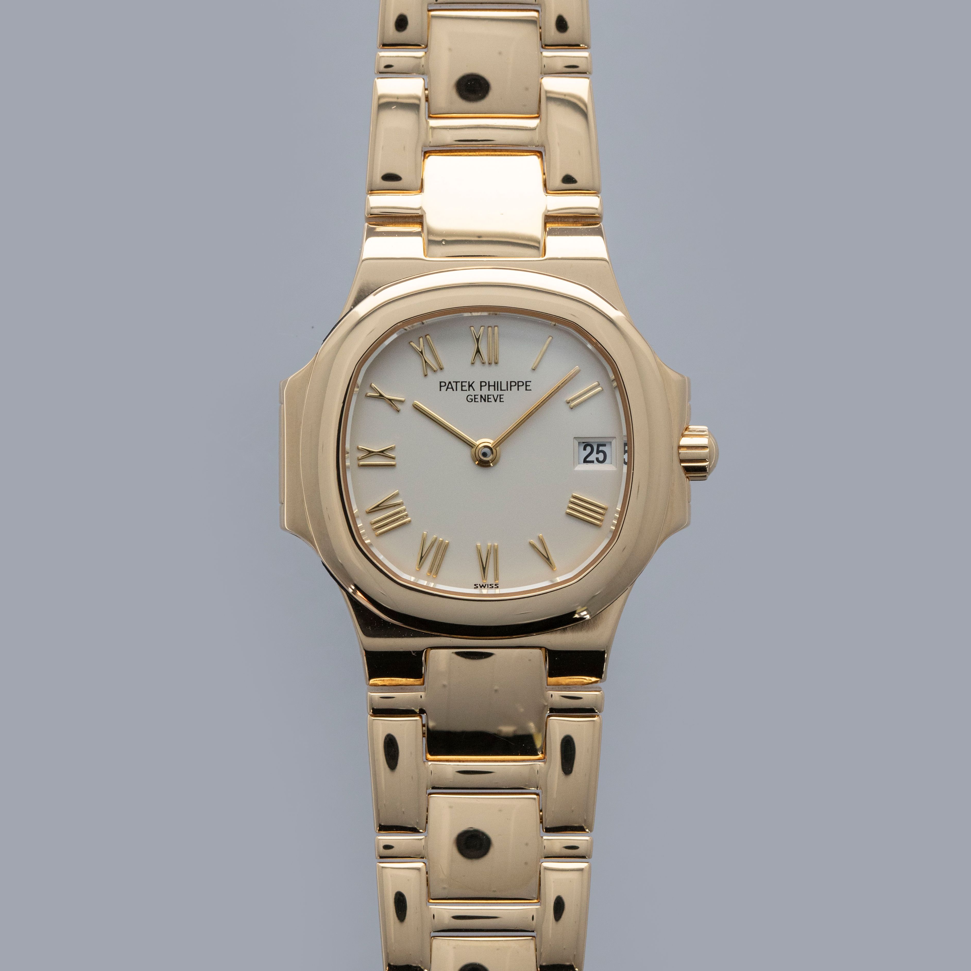 With its cream dial lacking the Nautilus' horizontally embossed stripes and featuring yellow gold applied Roman numeral hour markers and thin sword hour hands, this example's aesthetic is that of true luxury and a deviation from the Nautilus' typical dial design.