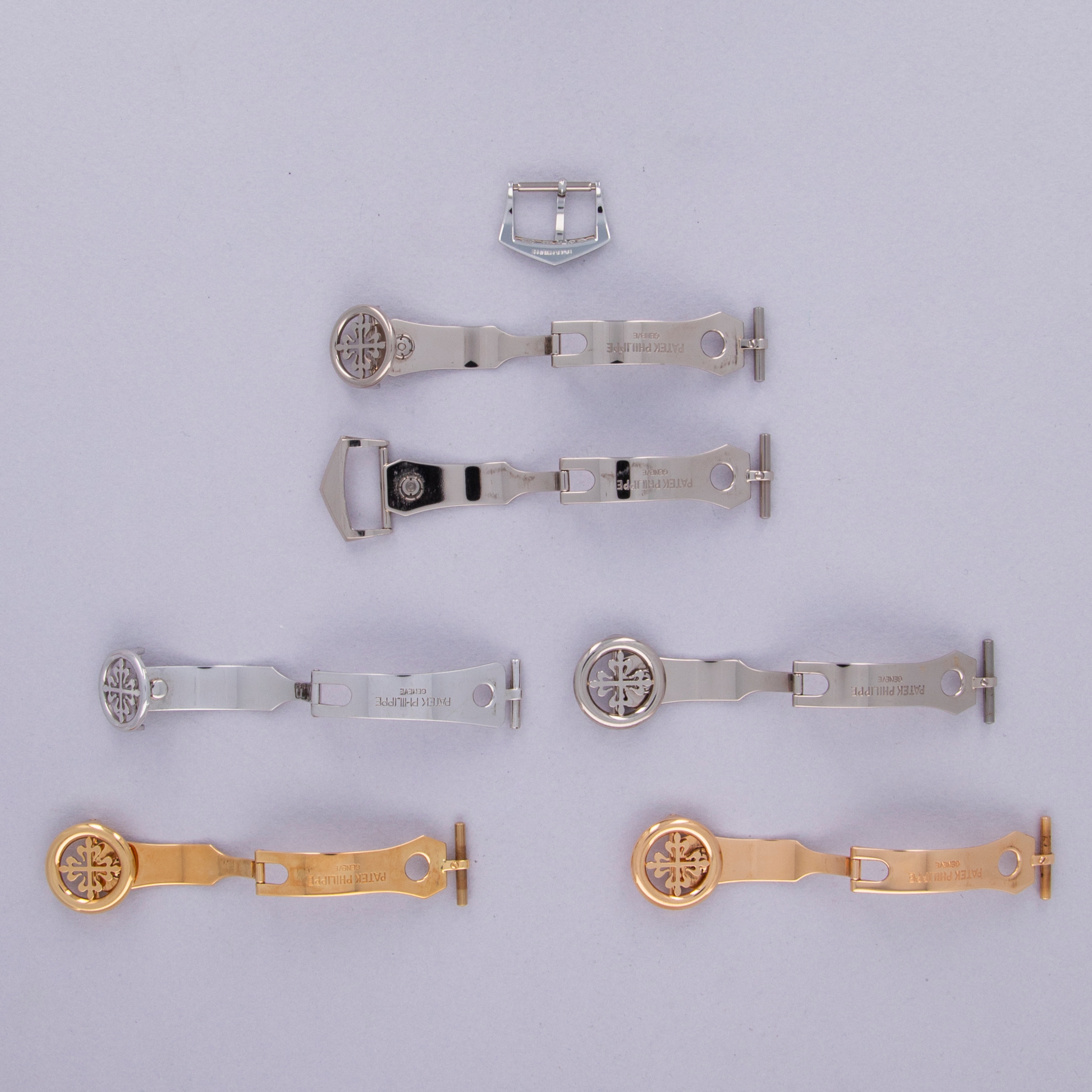 Crafted with the precision and craftsmanship that we have come to expect from Patek Philippe, offered here we have a total of 7 buckles across a mix of metals and styles. 6 of the buckles are deployant buckles, with the Calatrava cross on 5 of them and Patek's signature V-shape across one of them. Offered in platinum, the lone pin buckle, made of platinum, is in Patek's signature V-shape.