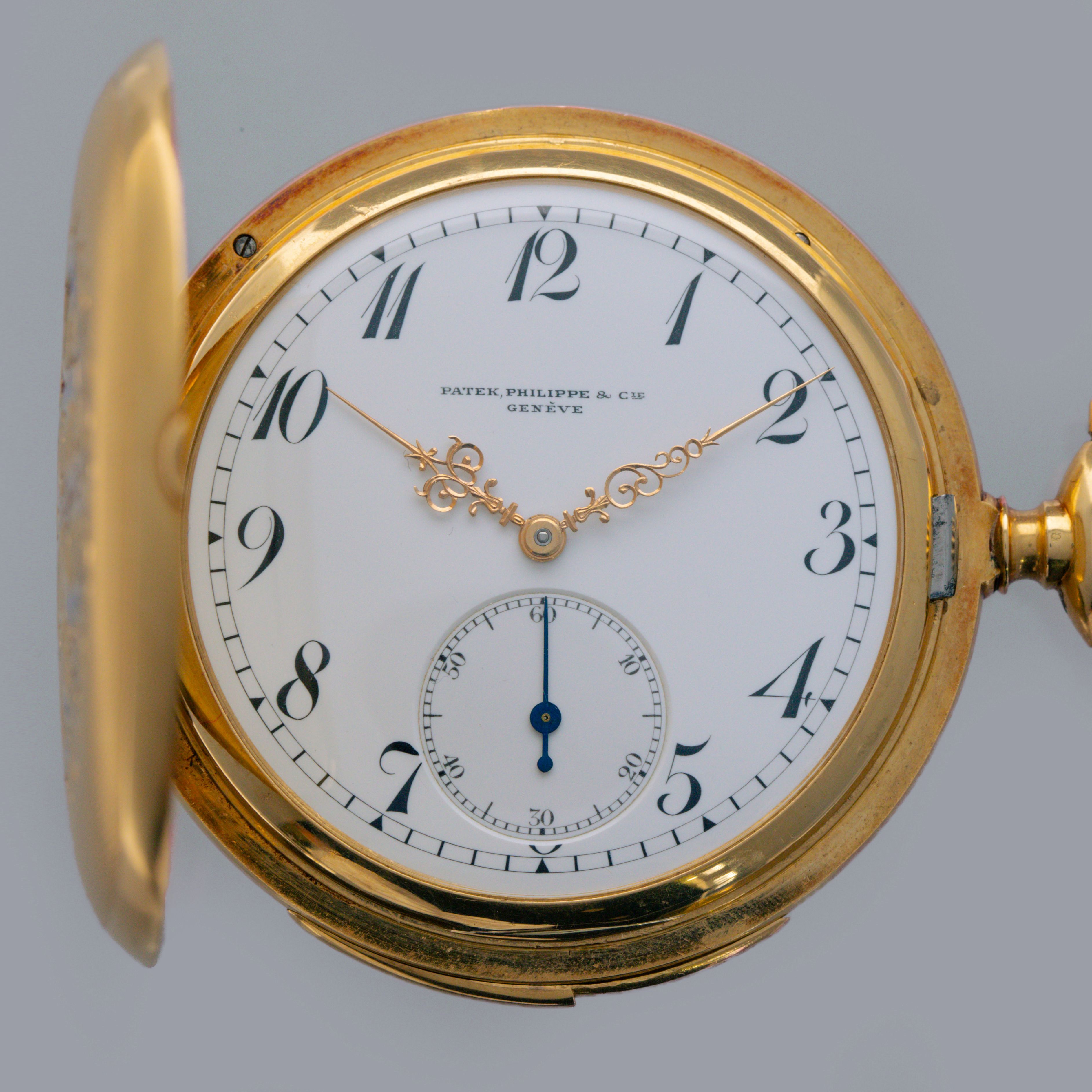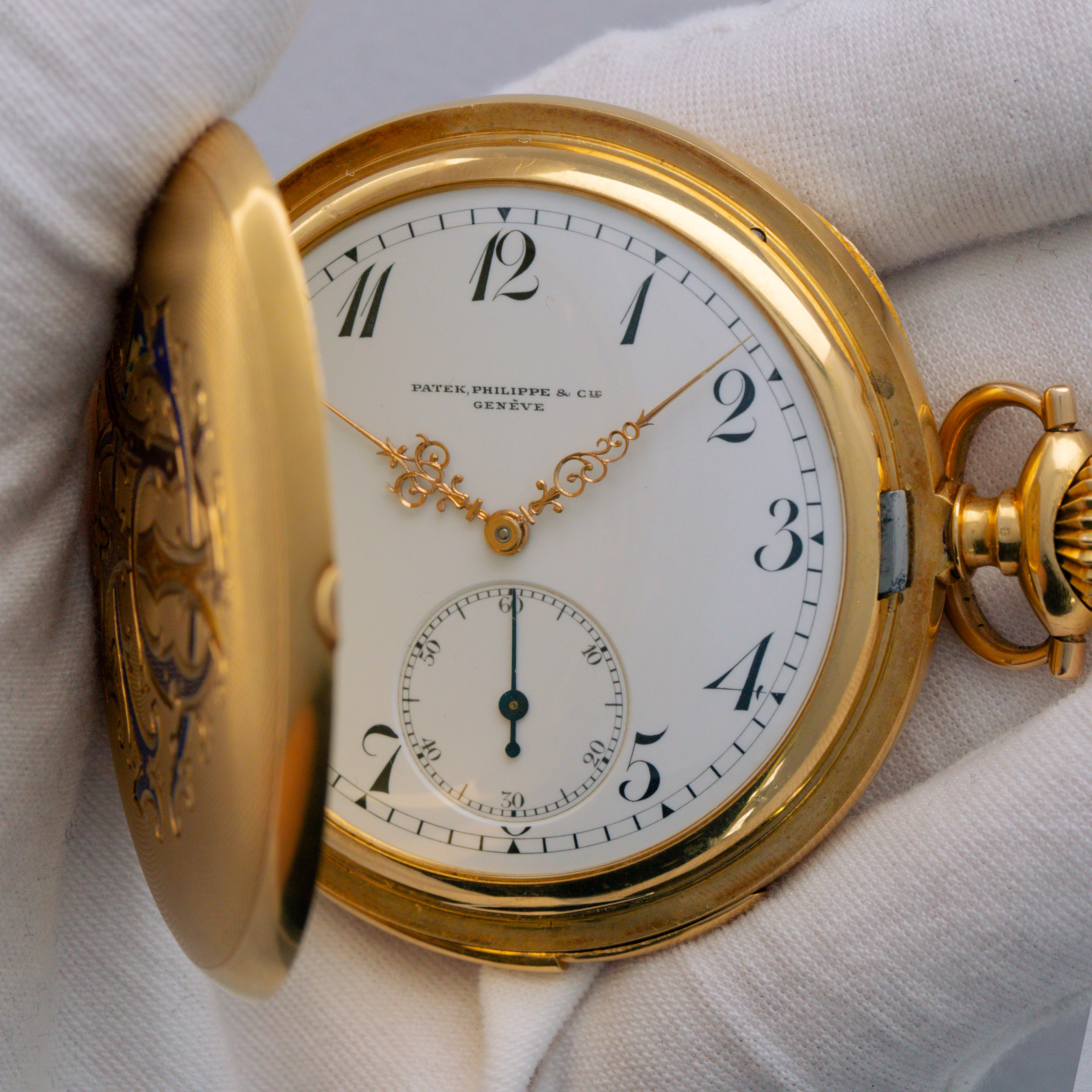 The watch is in overall excellent condition. The yellow gold case shows some light scratches and marks, while the guilloché pattern on both sides remains very well defined. The hunter case features enamel work on both sides, which is in excellent condition overall, with only a small area of blue enamel loss on the monogrammed side. The enamel dial is near-mint, as are the ornate yellow gold hands. The hallmarks on the inside of the covers are crisp. It is accompanied by a yellow gold chain in excellent condition and a Patek Philippe Archive Extract. Please note that the watch ticks at time of cataloging, but timekeeping is poor and a service is recommended.