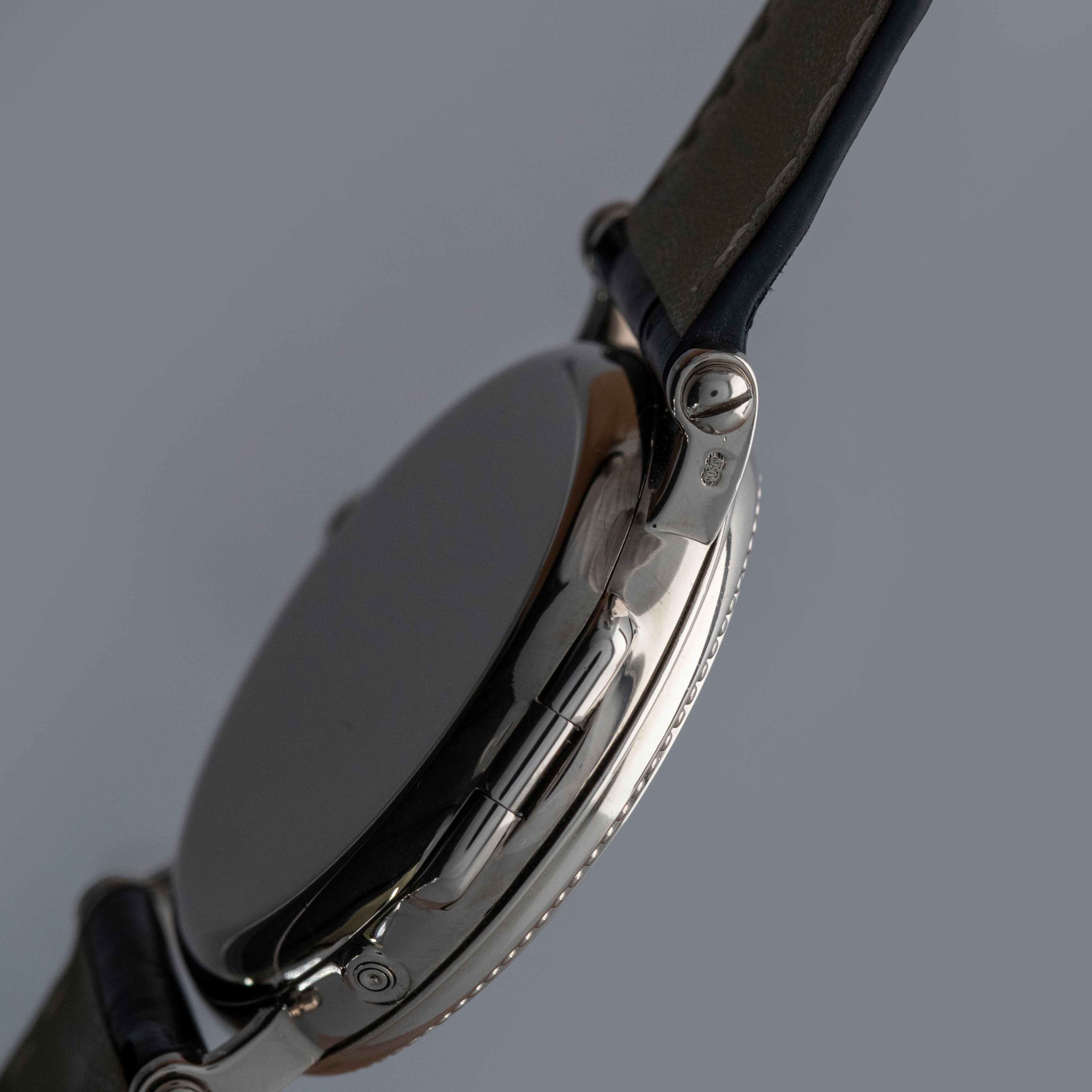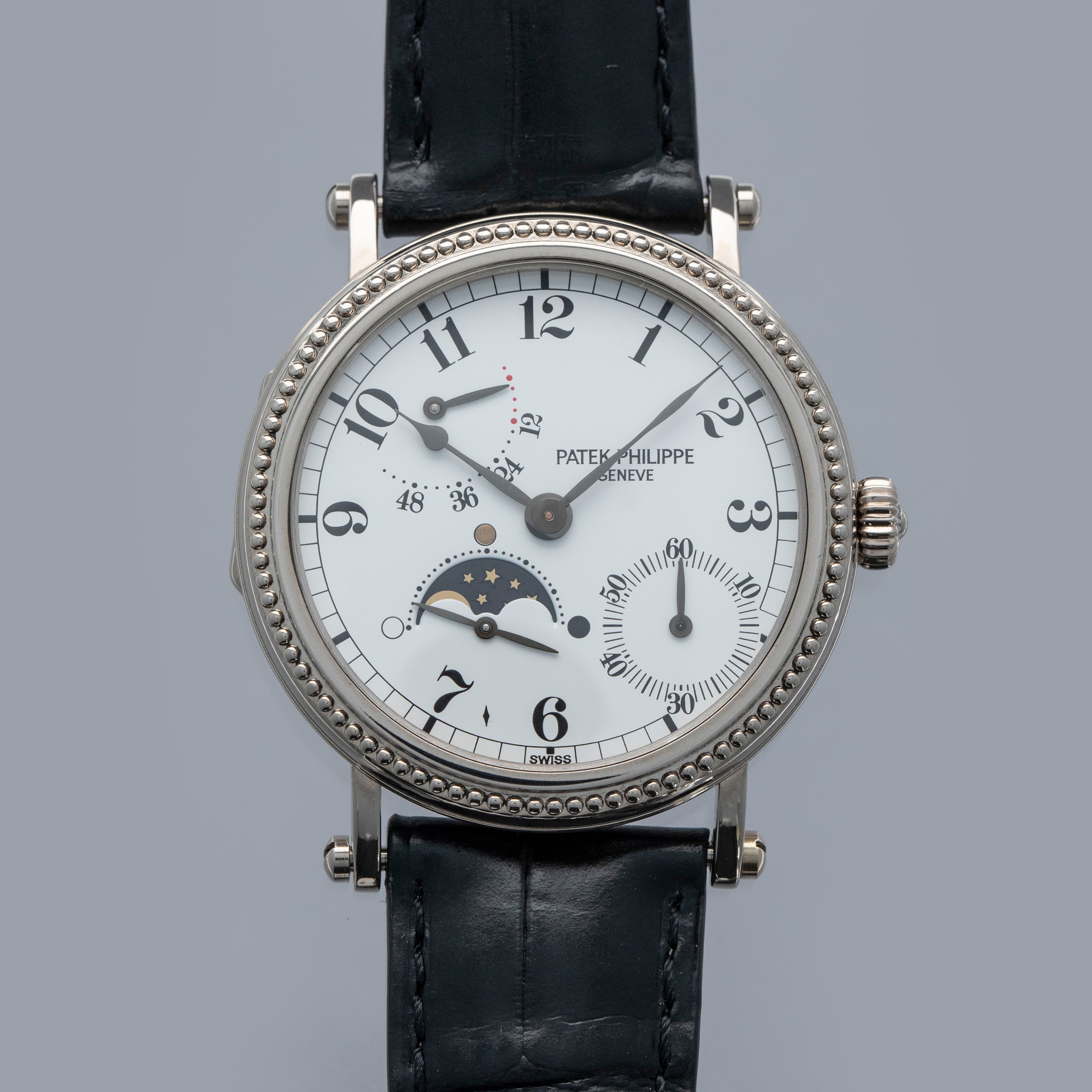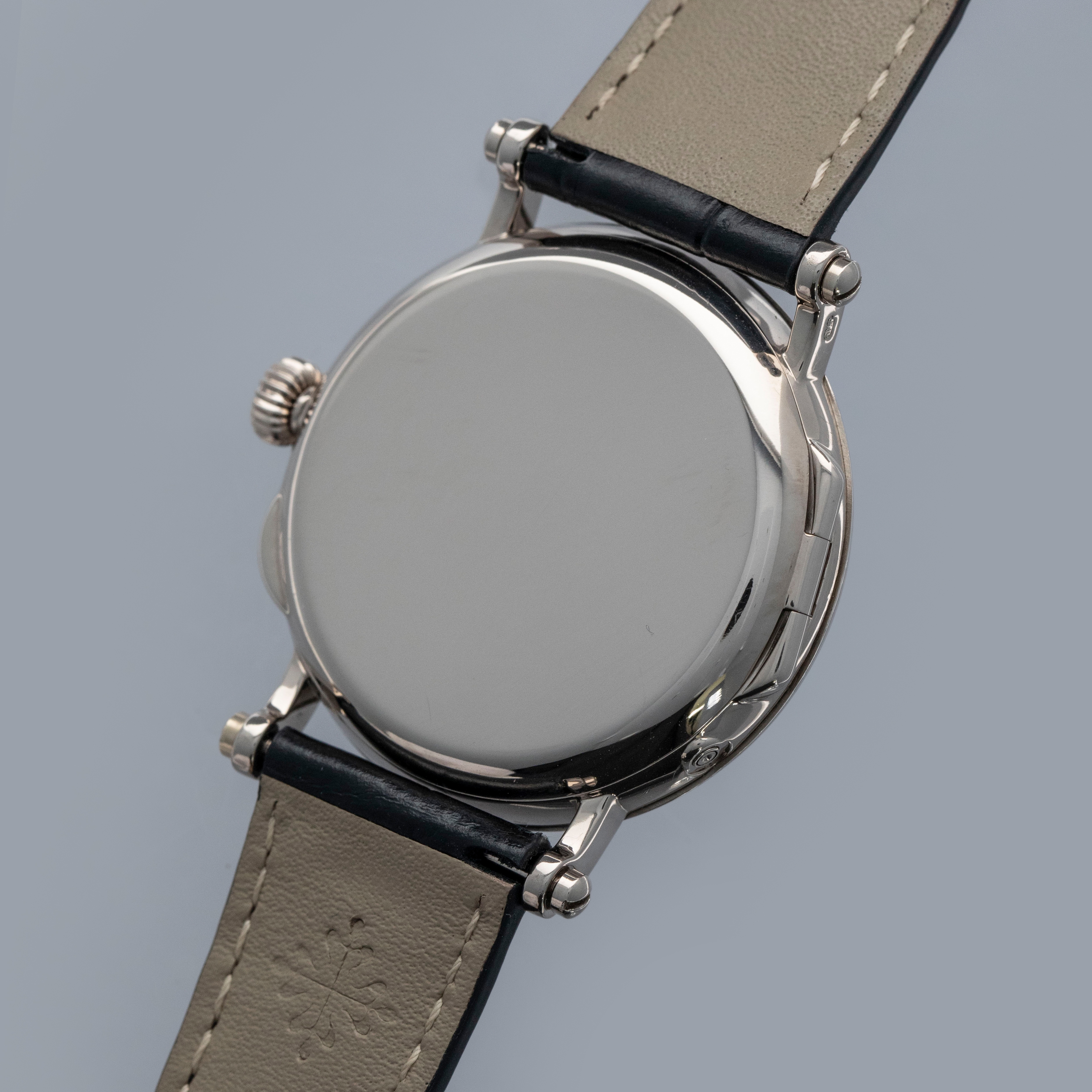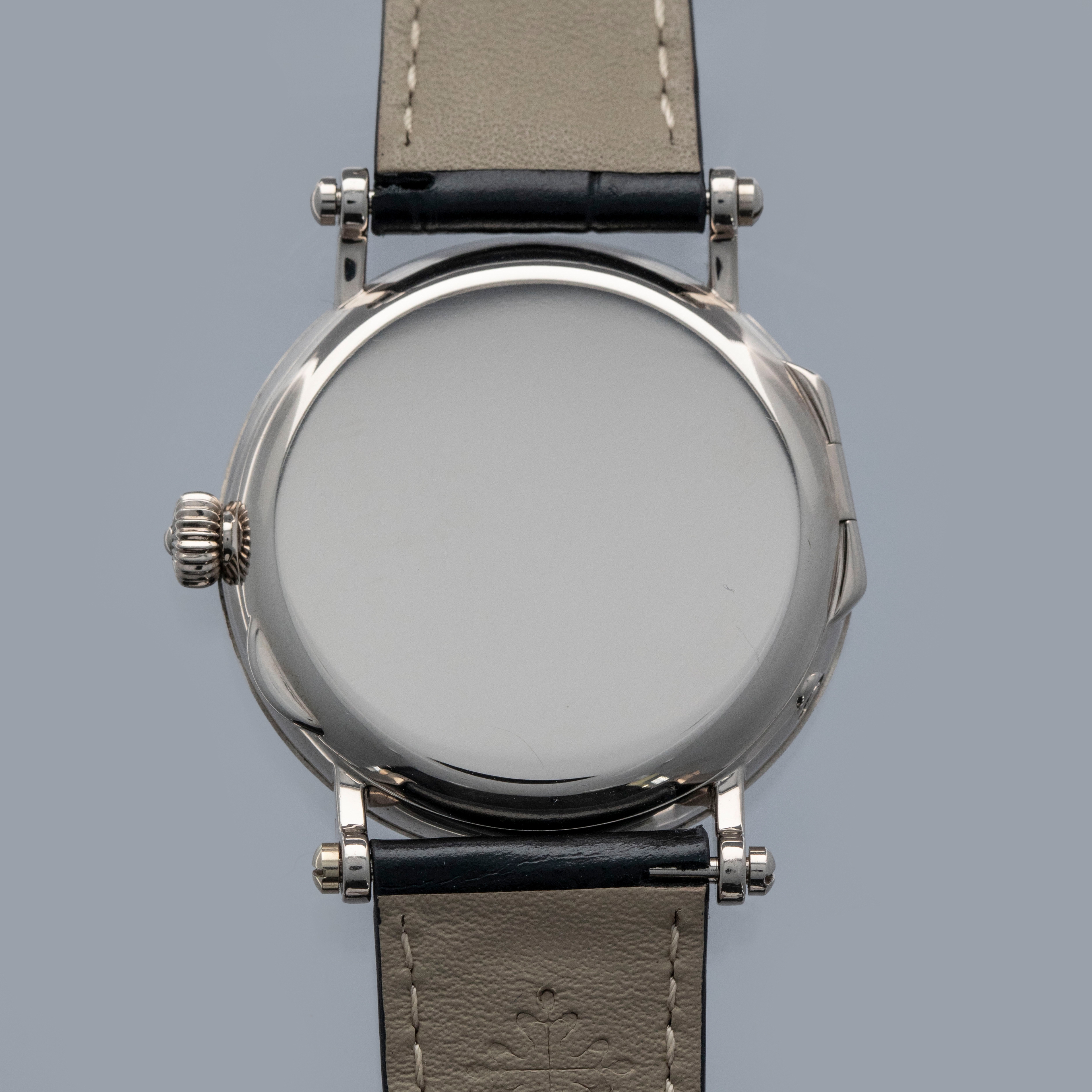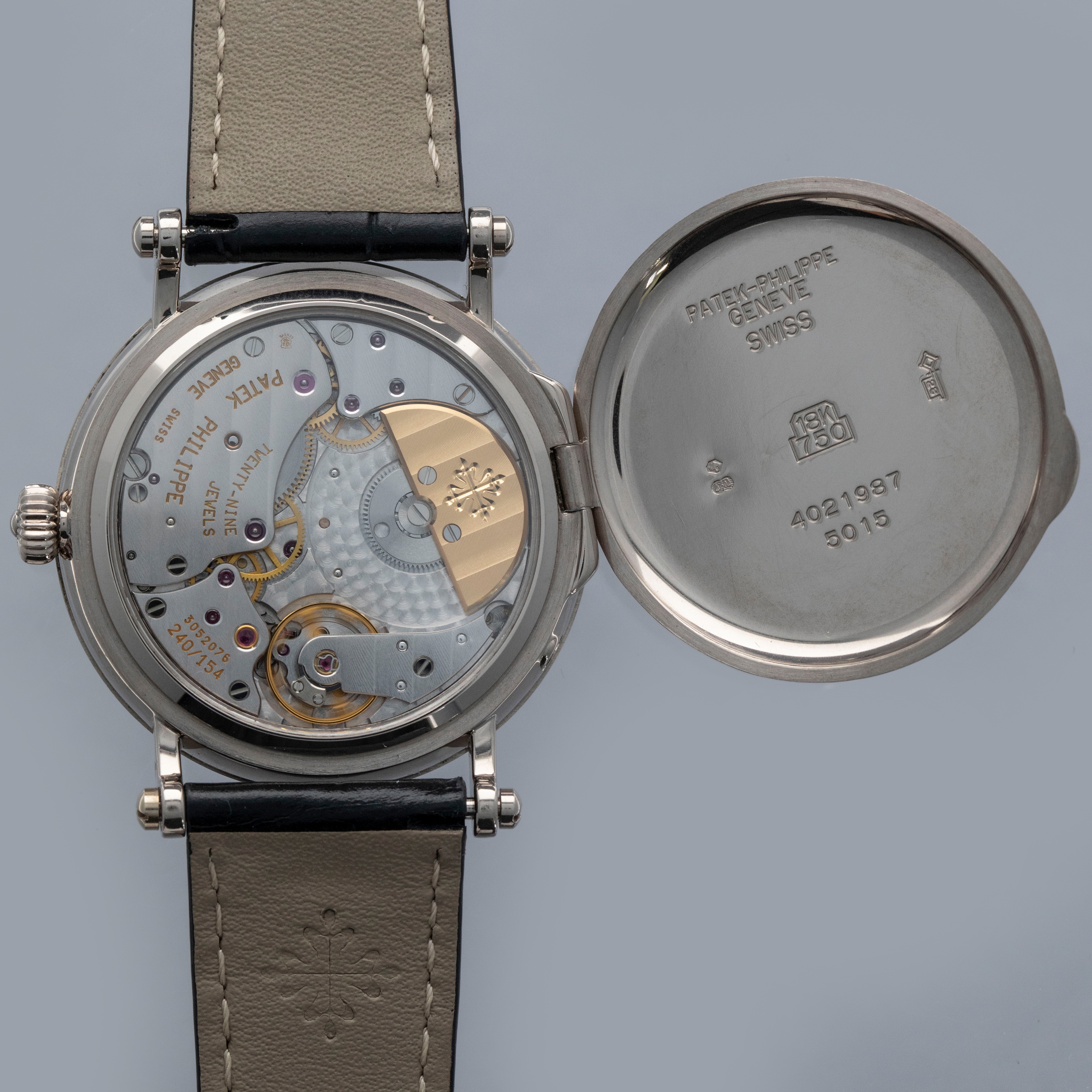 Released in 1994 and produced until 1999, the ref. 5015 is an exceptionally rare example of a Patek Philippe Calatrava Officer's Watch. It even has the title of being the first Patek moon phase timepiece that does not feature a perpetual calendar. With 3000 units made across a selection of metals, it features an incredible 36mm 18kt case construction with its signature sapphire crystal exhibition hinged-caseback, stepped beaded bezel, and iconic scrolled lugs with a case-matching 18kt white gold buckle. Continuing the same level of intricate detail as its 18kt white gold case, the ref. 5015G features a stunning white enamel dial with black painted radial Arabic numerals, a black oxidised gold spade handset, and a railway-style minute track found along its periphery. With a running sub-seconds dial at 4 o'clock, a moon phase aperture at 7 o'clock and a semi-circular 48-hour power reserve indicator at 10 o'clock, the 5015G's asymmetrical dial layout is immediately reminiscent of the modern Nautilus ref. 5712, and all thanks to its automatic cal. 240-152 movement, which is proudly on display behind its exhibition caseback, which is protected by its hinged 18kt white gold caseback.