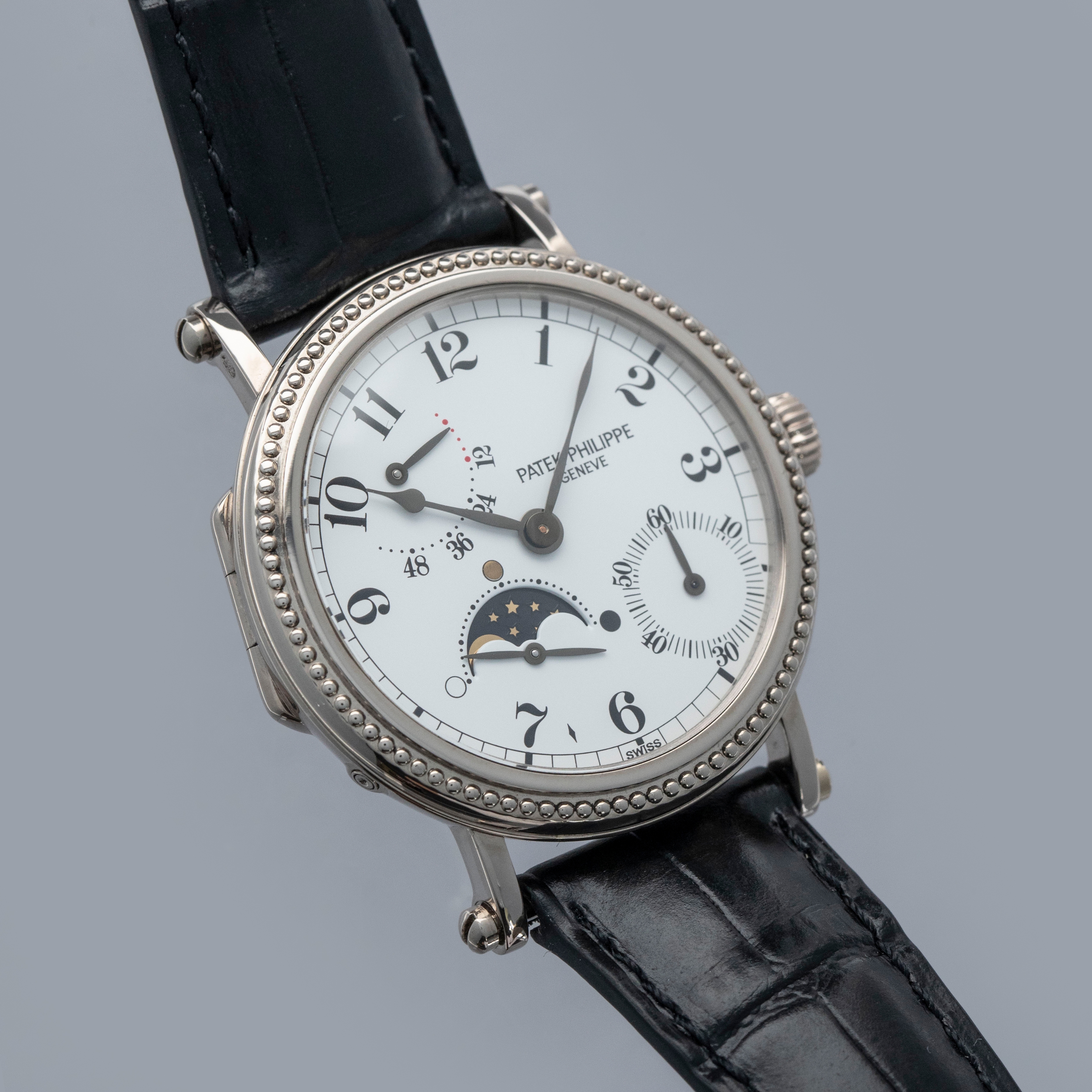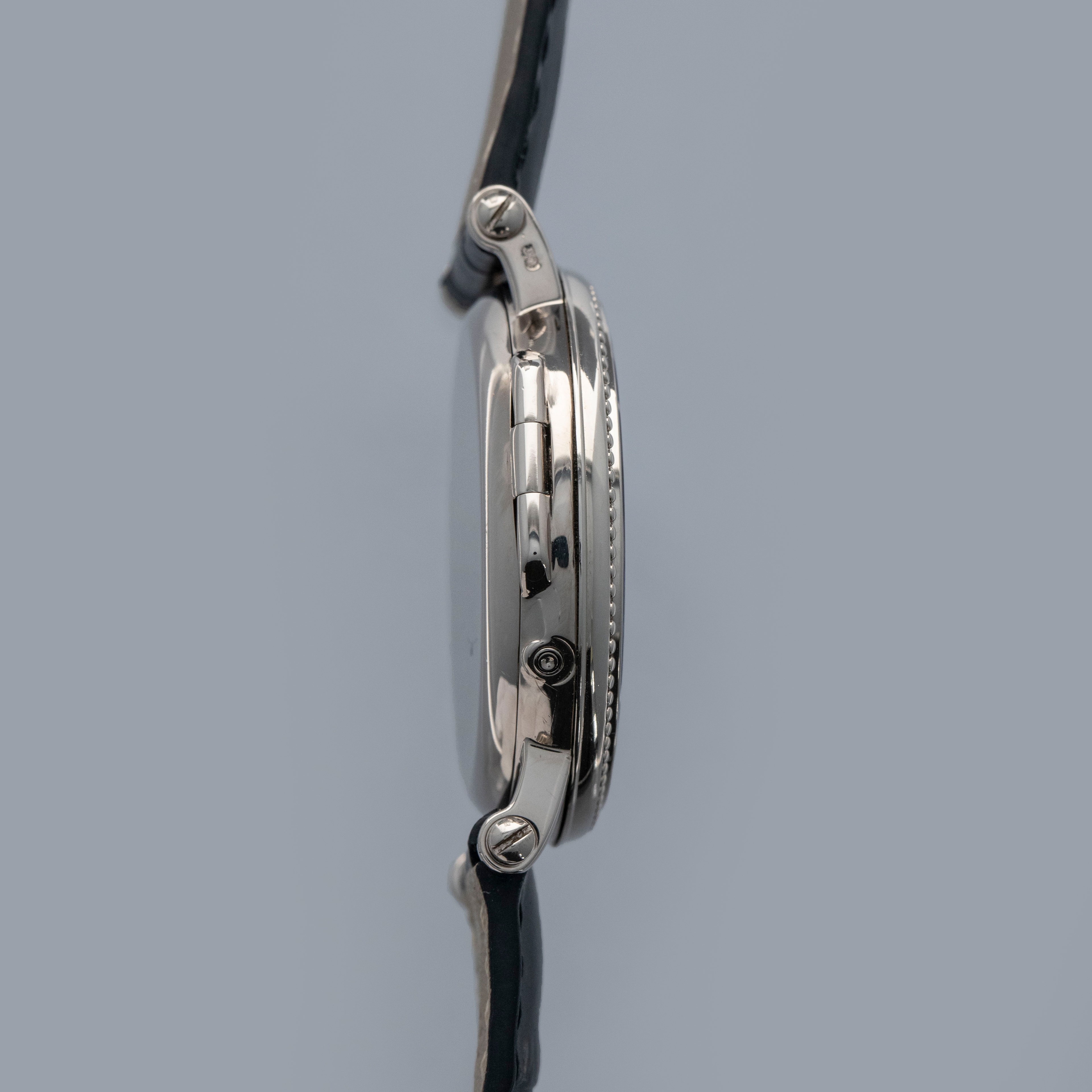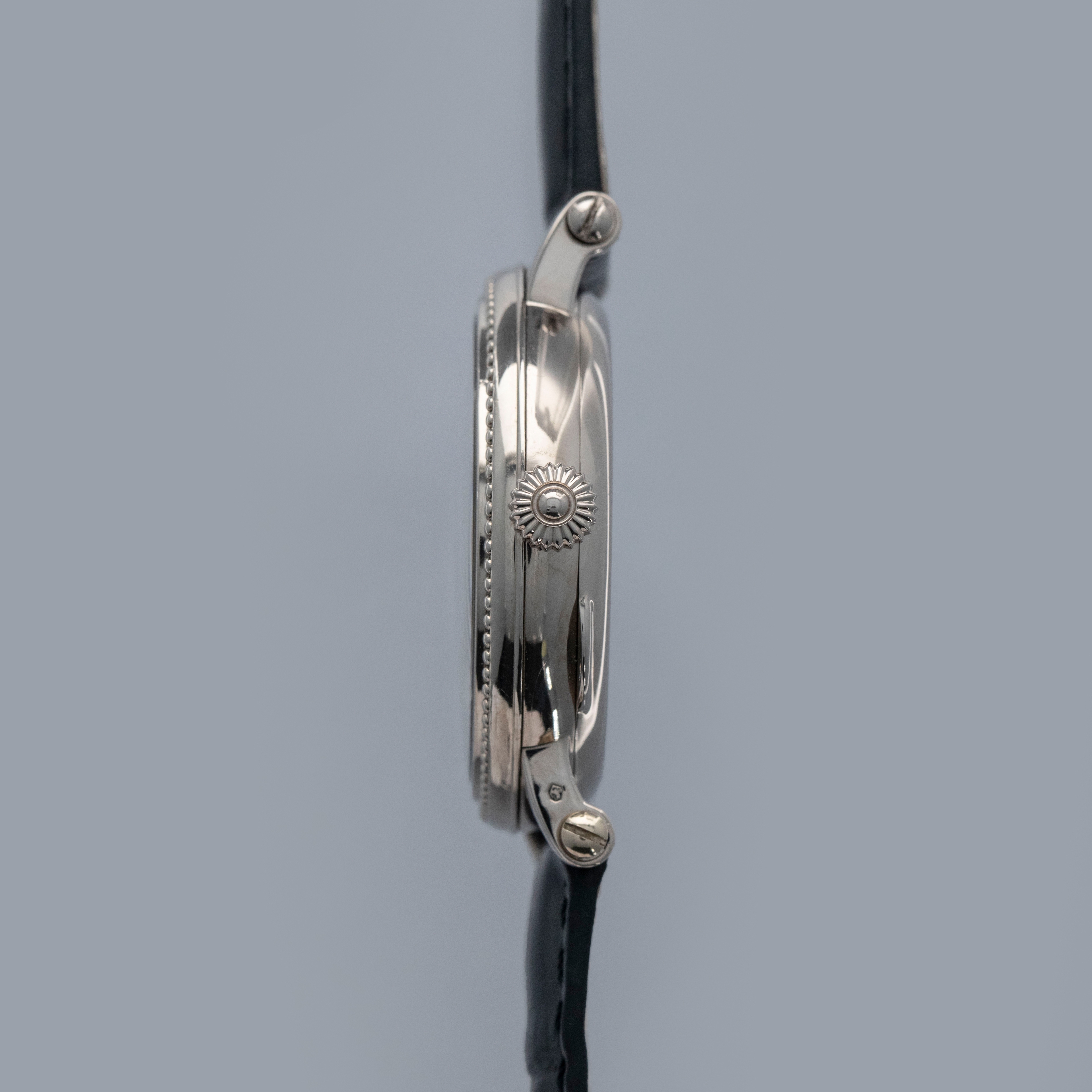 Watch is in overall near-mint condition. The white gold case shows only light signs of wear to the polished sections, while the beaded bezel remains well defined with some light surface marks present. The hallmarks on the case sides remain crisp and well defined, and the half-hunter inner case back retains like-new hallmarks and engravings. The dial remains like new, with very clean hands. It is fitted with a black alligator strap and a white gold Patek buckle showing light surface marks.