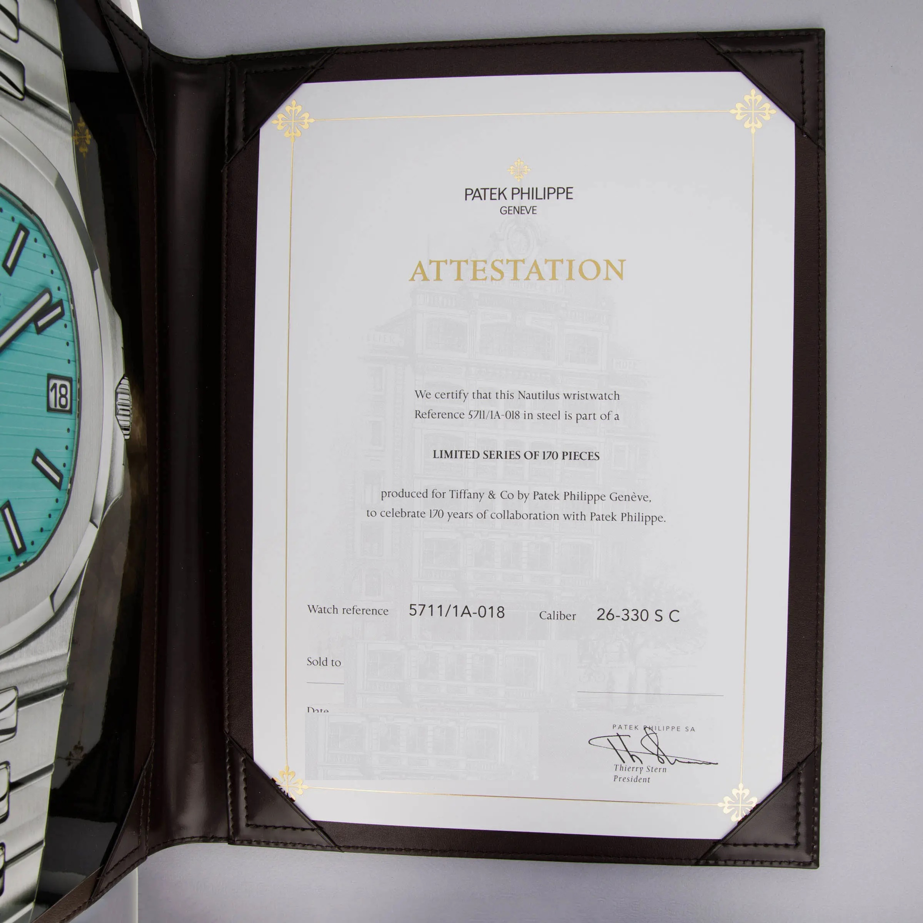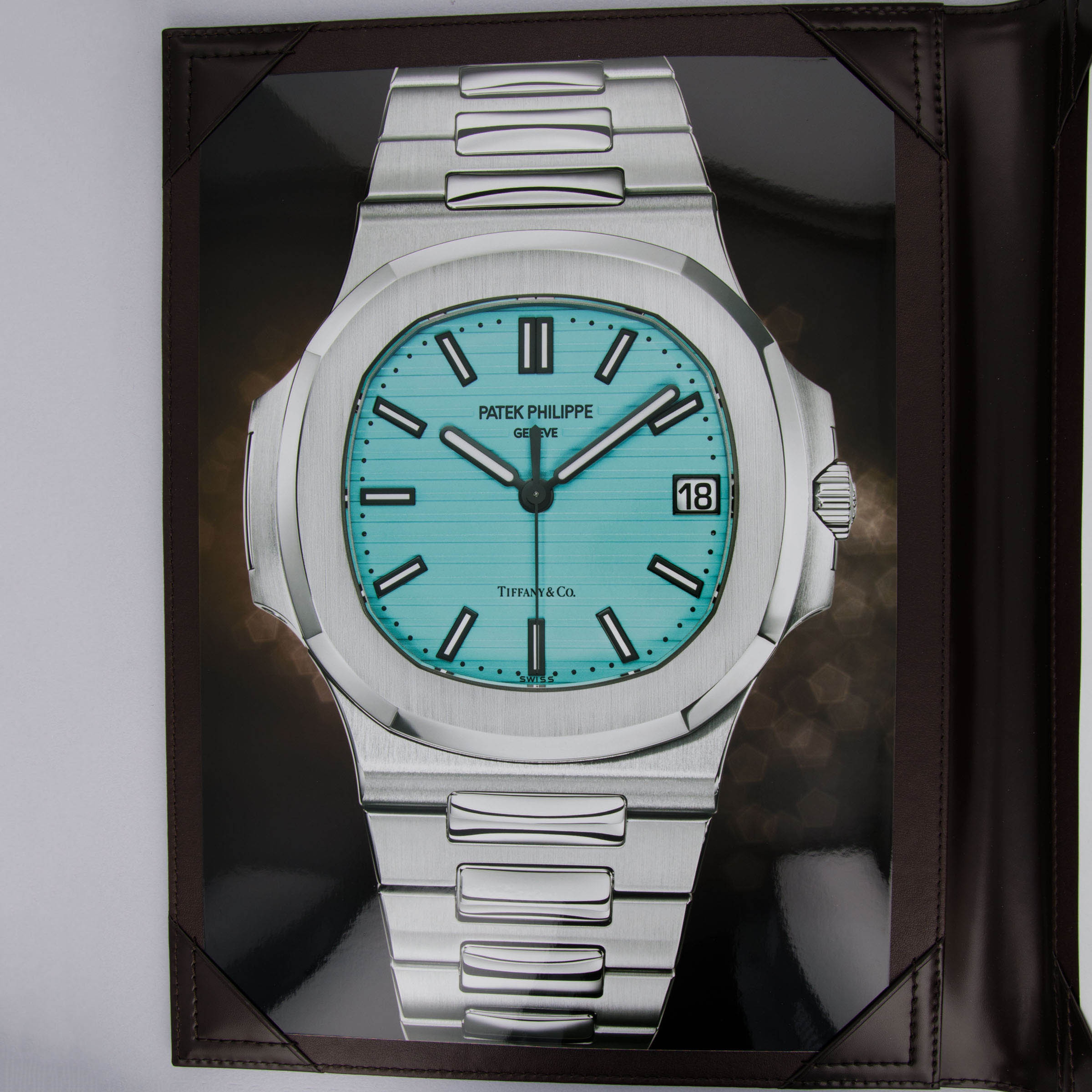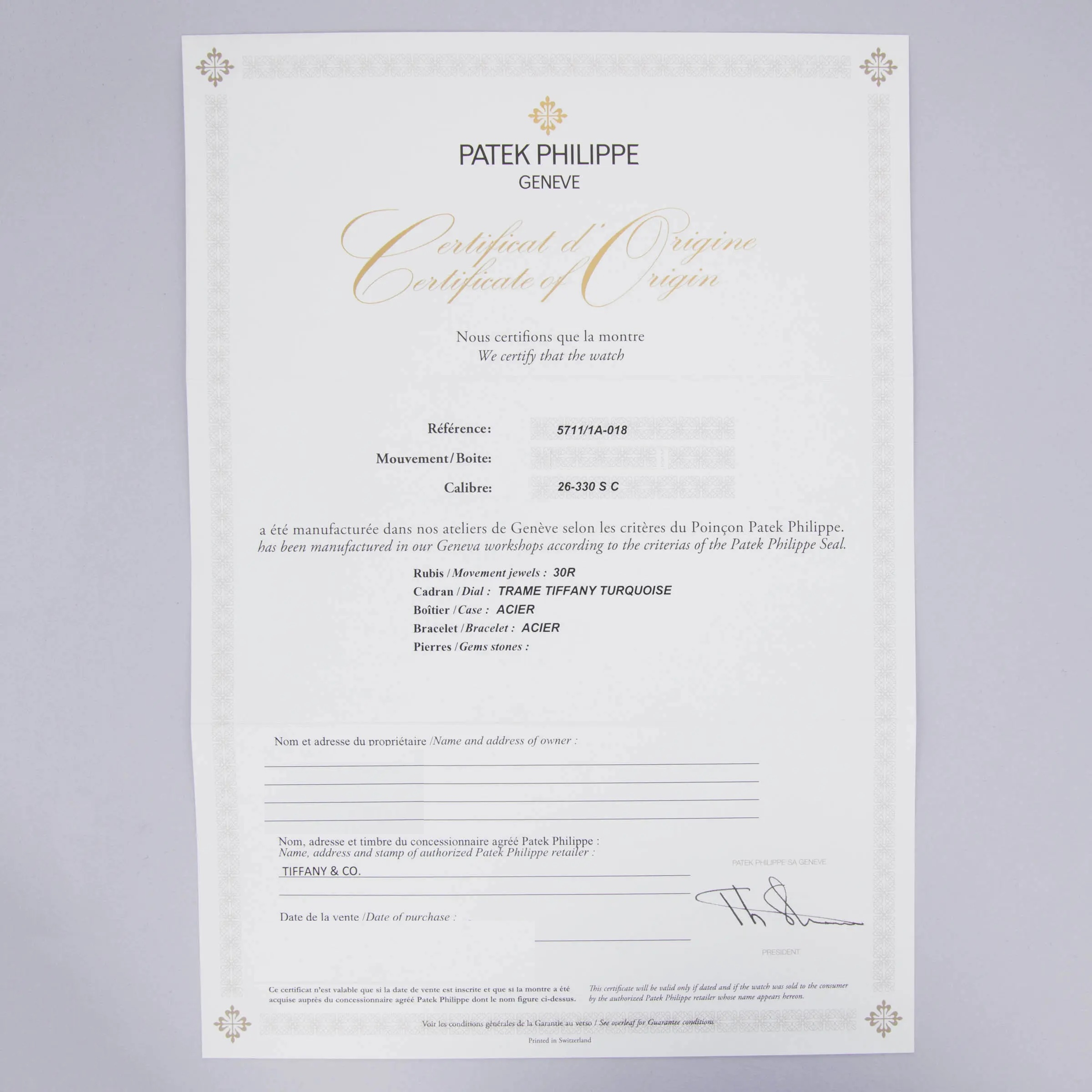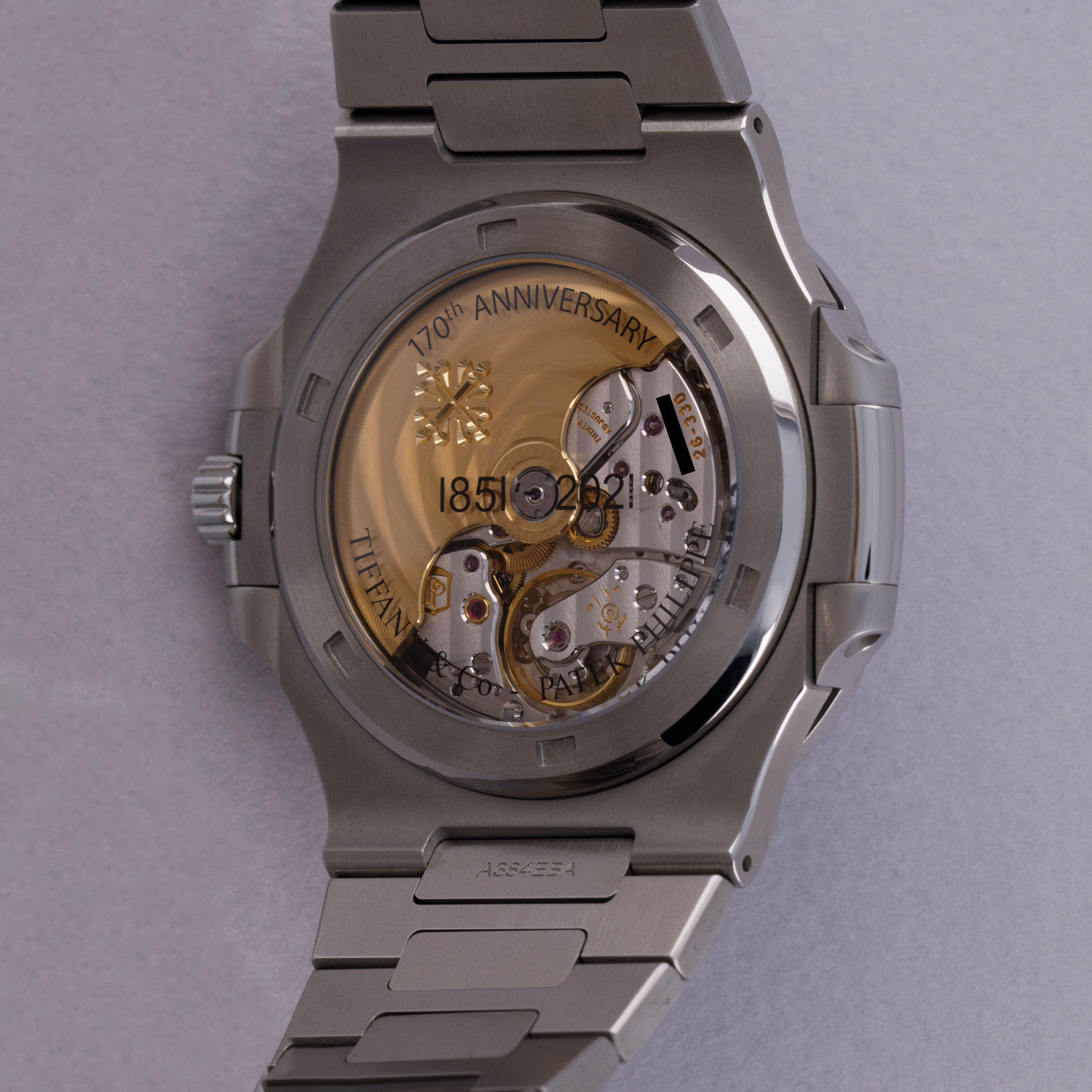 In conjuction with its Tiffany blue-colored dial, the ref. 5711/1A-018 also boasts a commemorative caseback with three lines of inscriptions that read "170th Anniversary – 1851-2021 – Tiffany & Co. - Patek Philippe."
