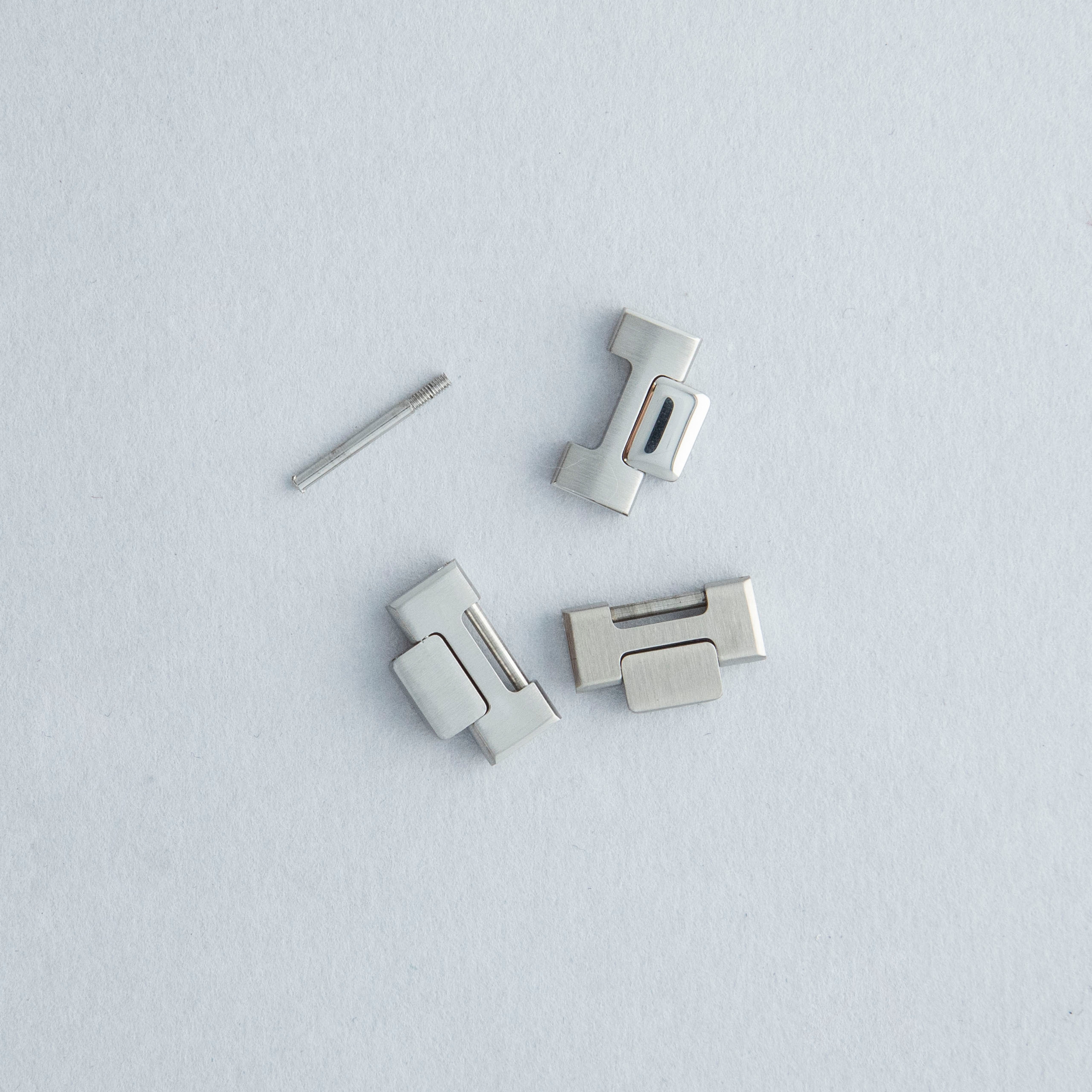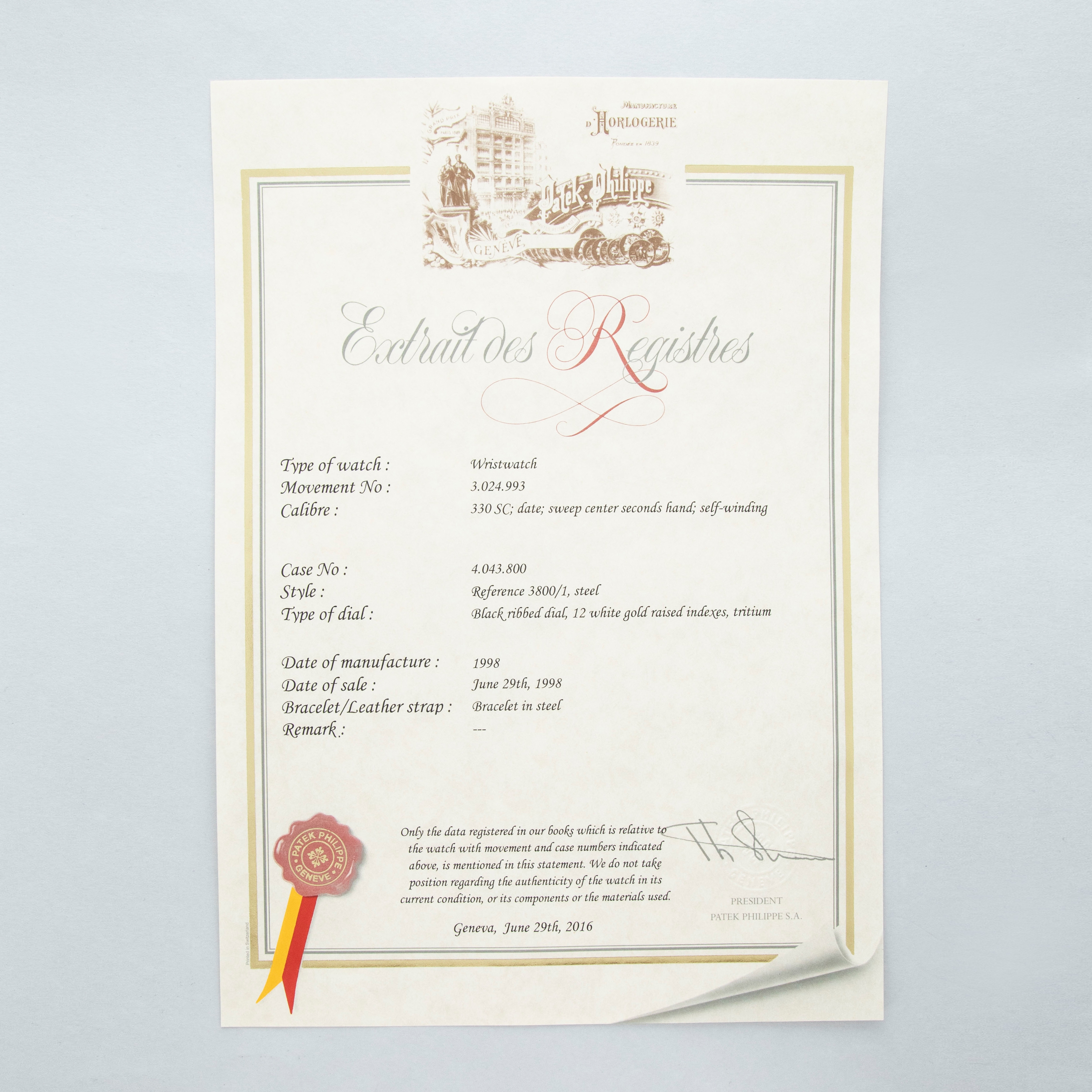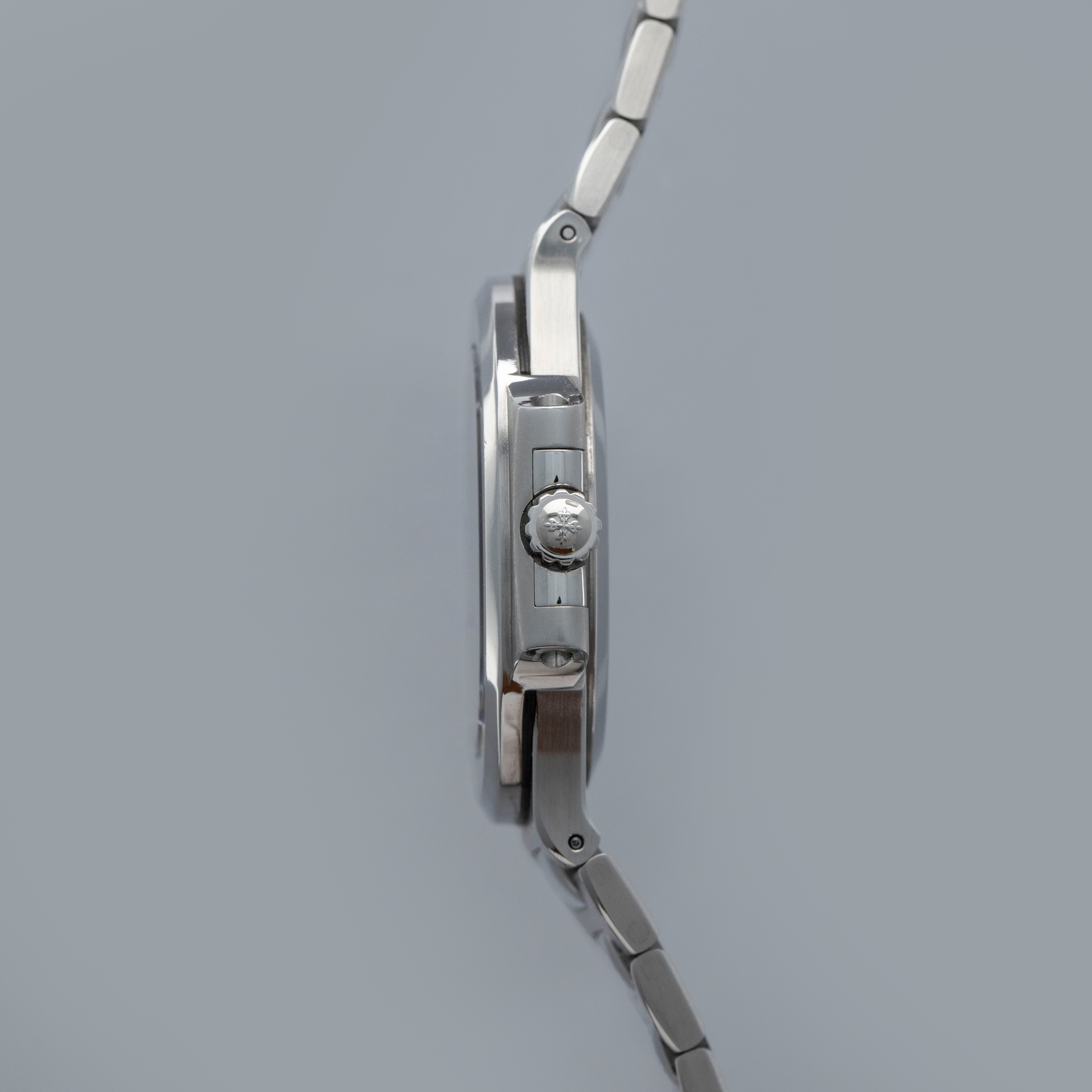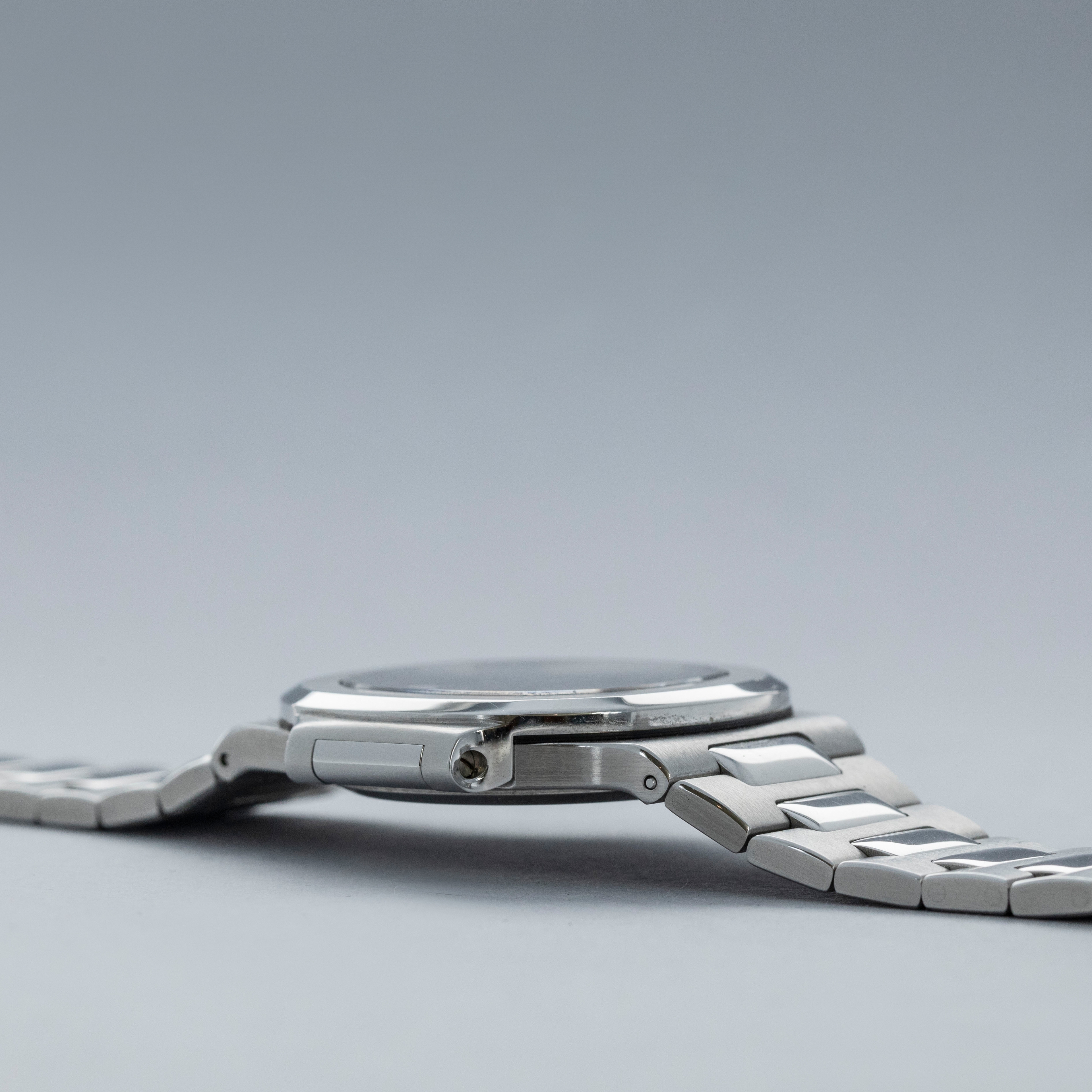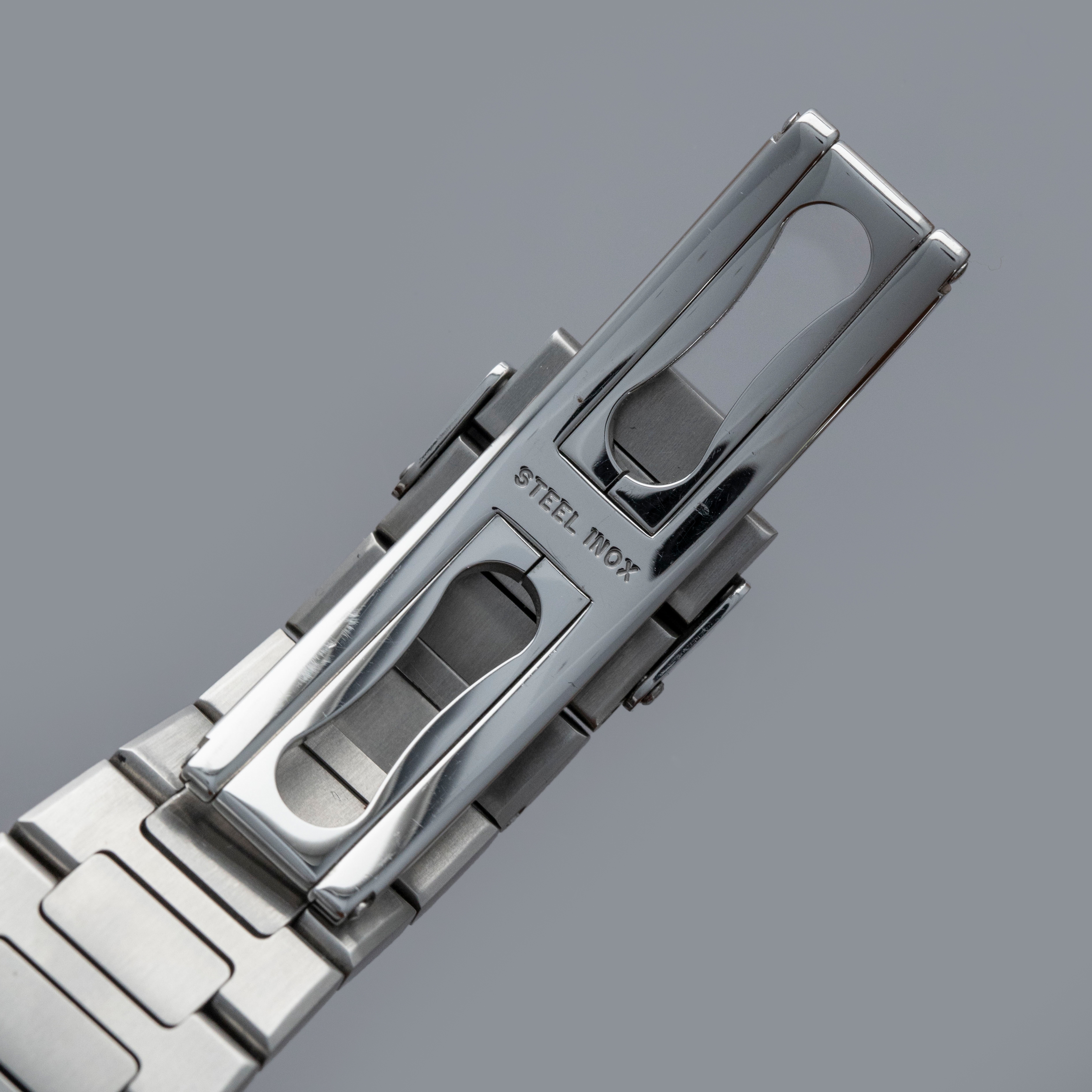 The watch is in overall excellent condition. The steel case is excellent, with surface marks and a few tiny nicks around the bezel edge. The case back has some light scratches. The sigma dial is near mint, with the lume in the hour markers having taken on a pleasing dark patina. The hands are very clean. The integrated steel bracelet has surface marks, particularly on the polished sections, and light play between the links. It is fitted with 20 links, 6 of which are removable, and fits approximately a 6 3/4” wrist. Three additional links are included. Comes with an Extract from the Archives, service paperwork dated 2006 (noting a customer request not to repolish the case), as well as a paper dated 2025 noting an adjustment done at Henry Stern NY "under warranty". A service pouch is also included.