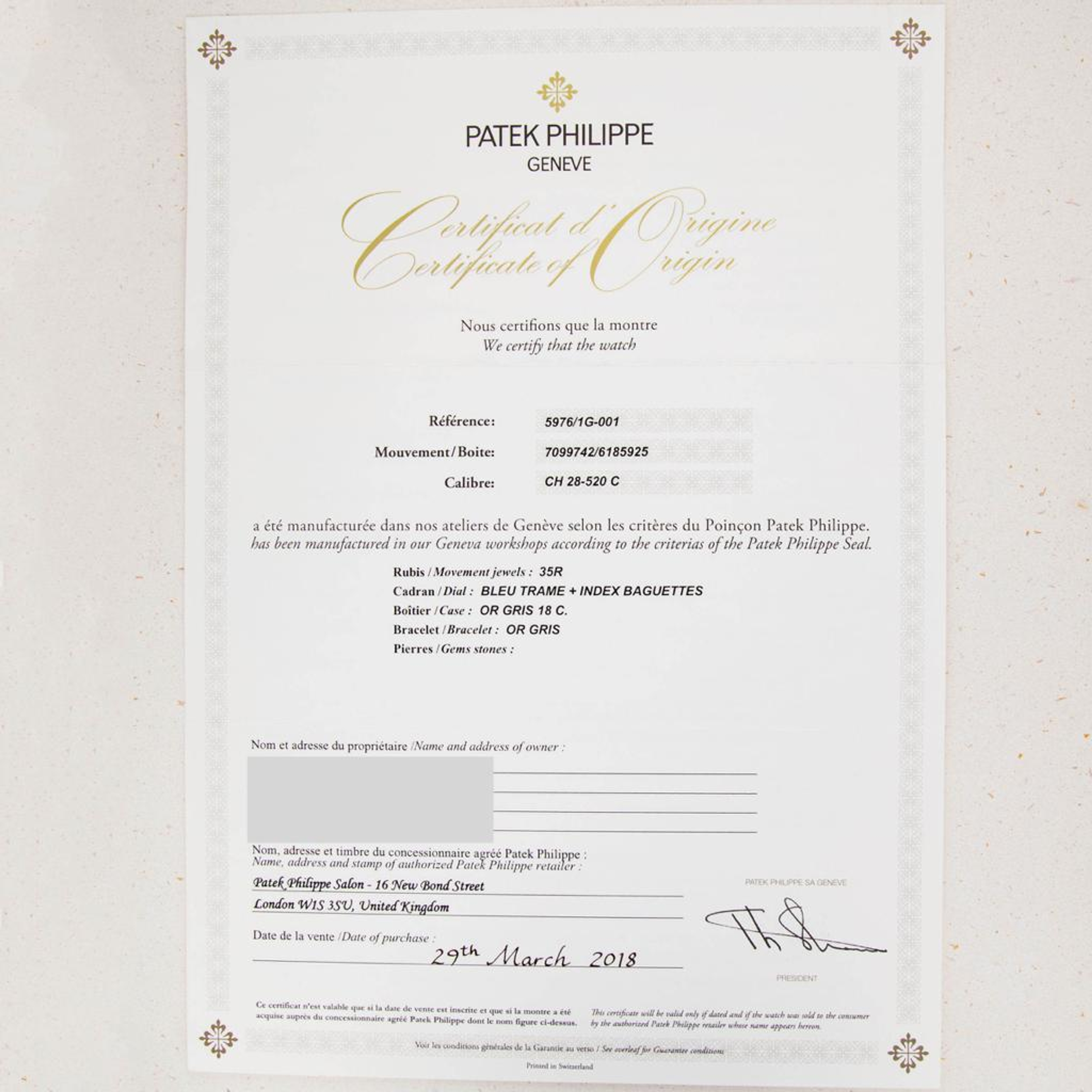 Featuring a bright blue dial with a subtle commemorative text at 12 o'clock and diamond-set hour markers throughout, the ref. 5976/1G subtly reveals its position as a special edition of the Nautilus, an edition limited to just 1300 pieces.