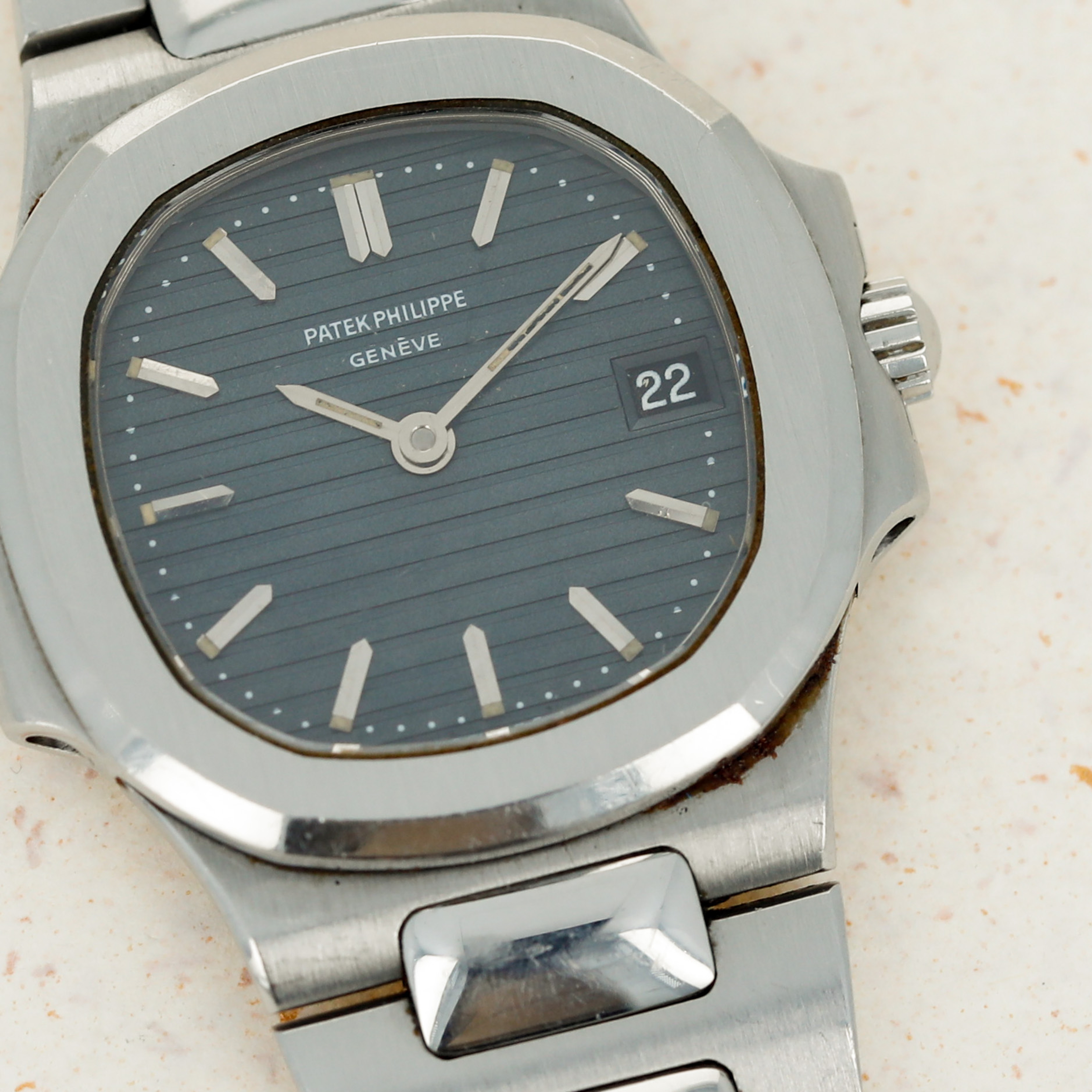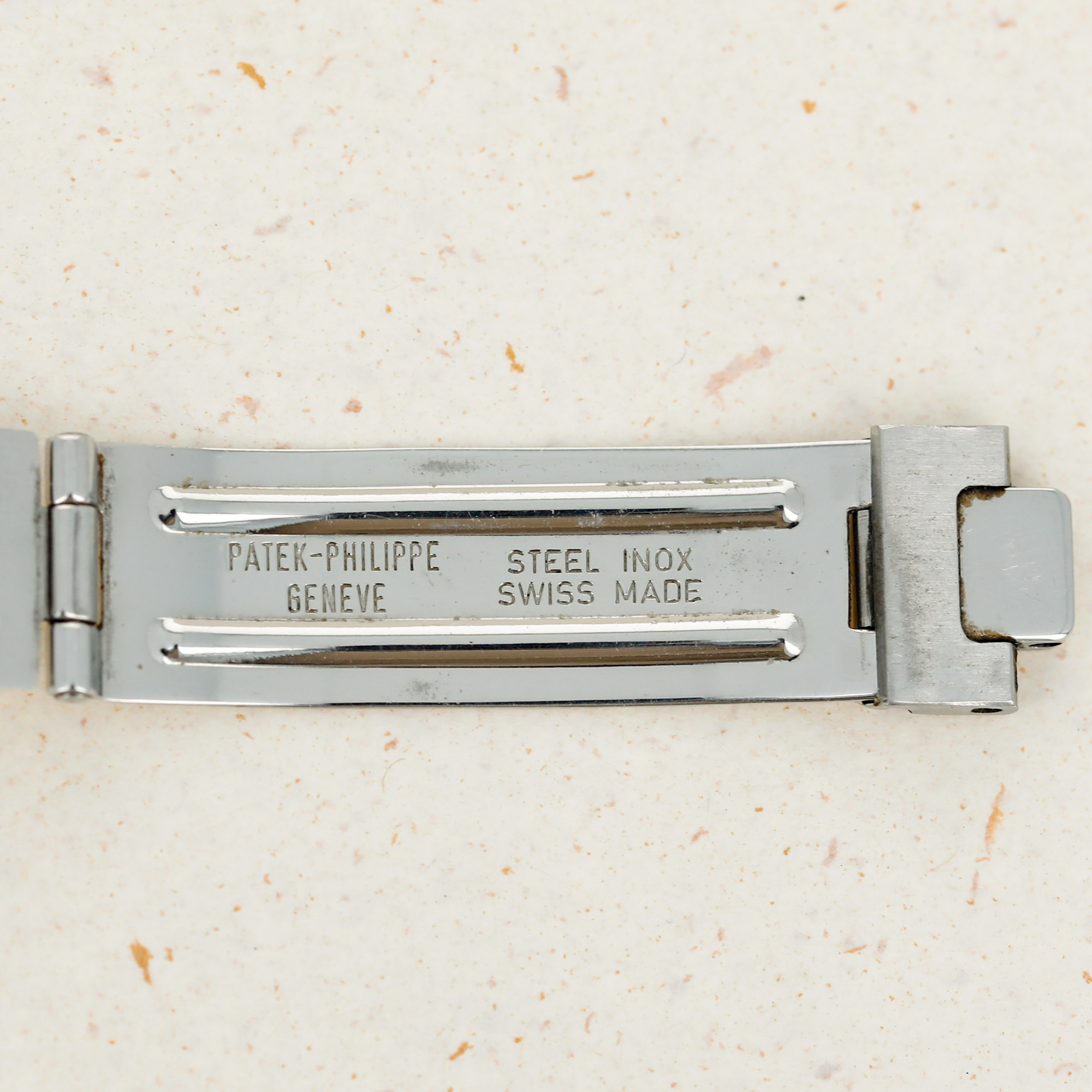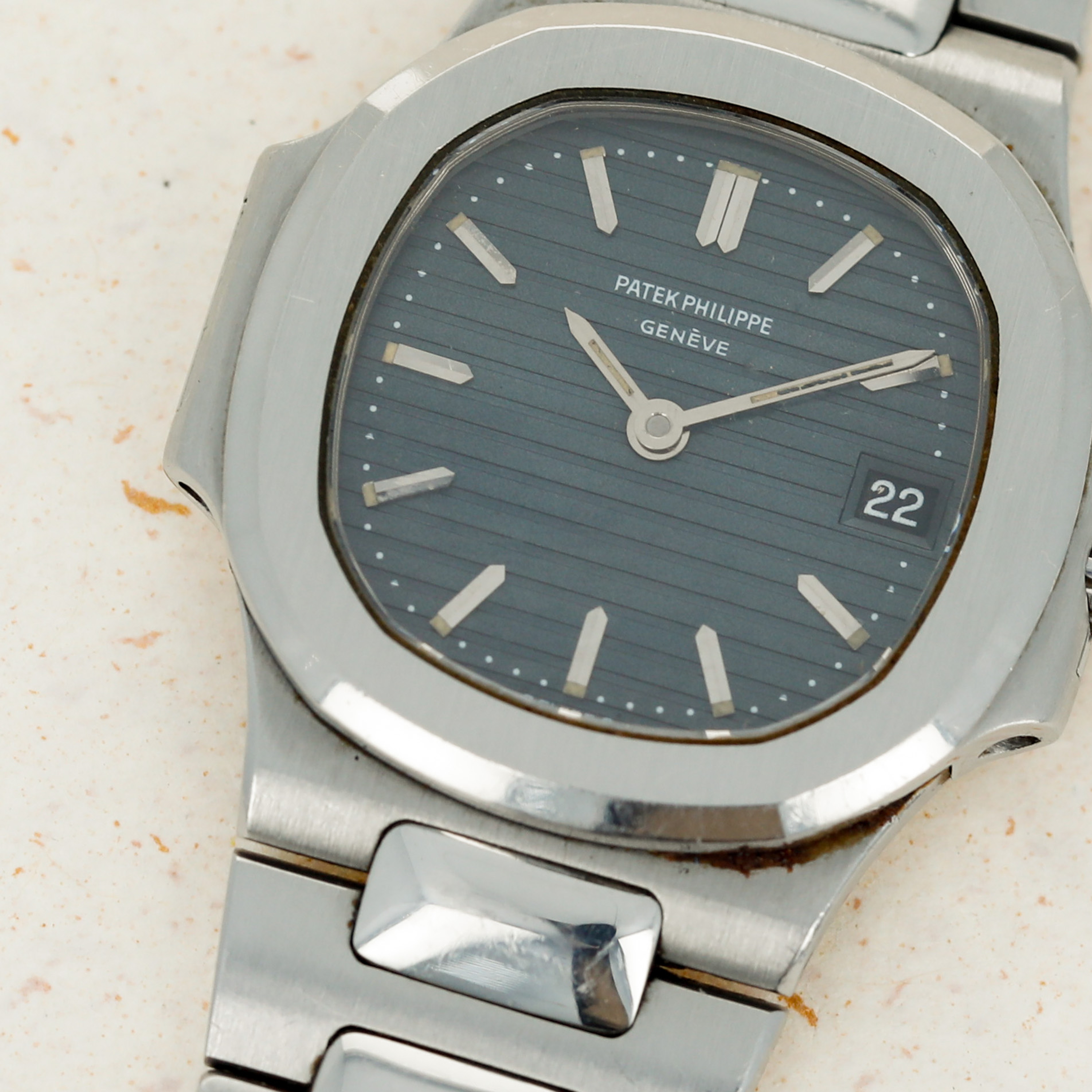 With its iconic blue-black dial featuring horizontally embossed stripes and unusually-shaped applied hour markers and hands for the Nautilus, this example's aesthetic is unique to the ref. 4700.