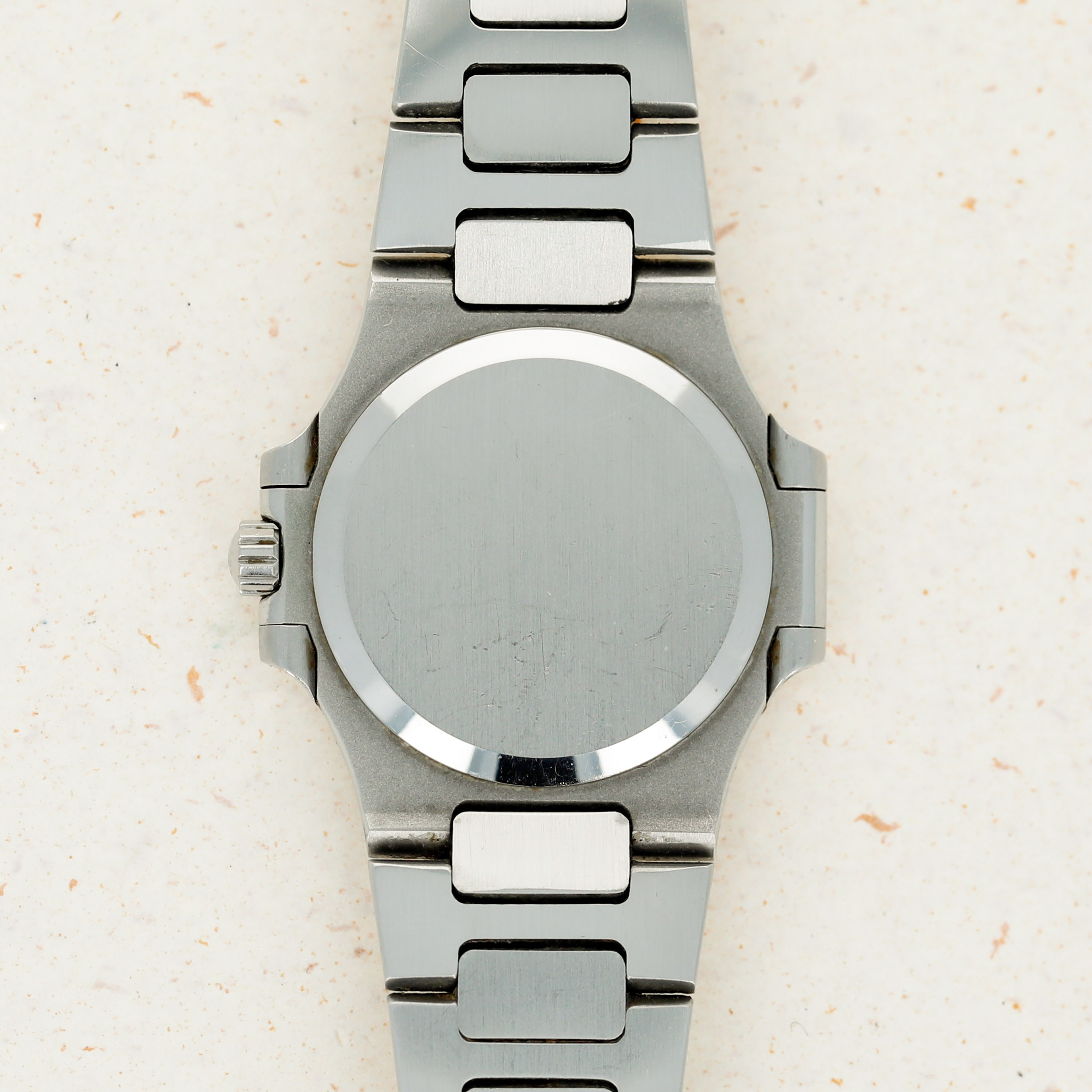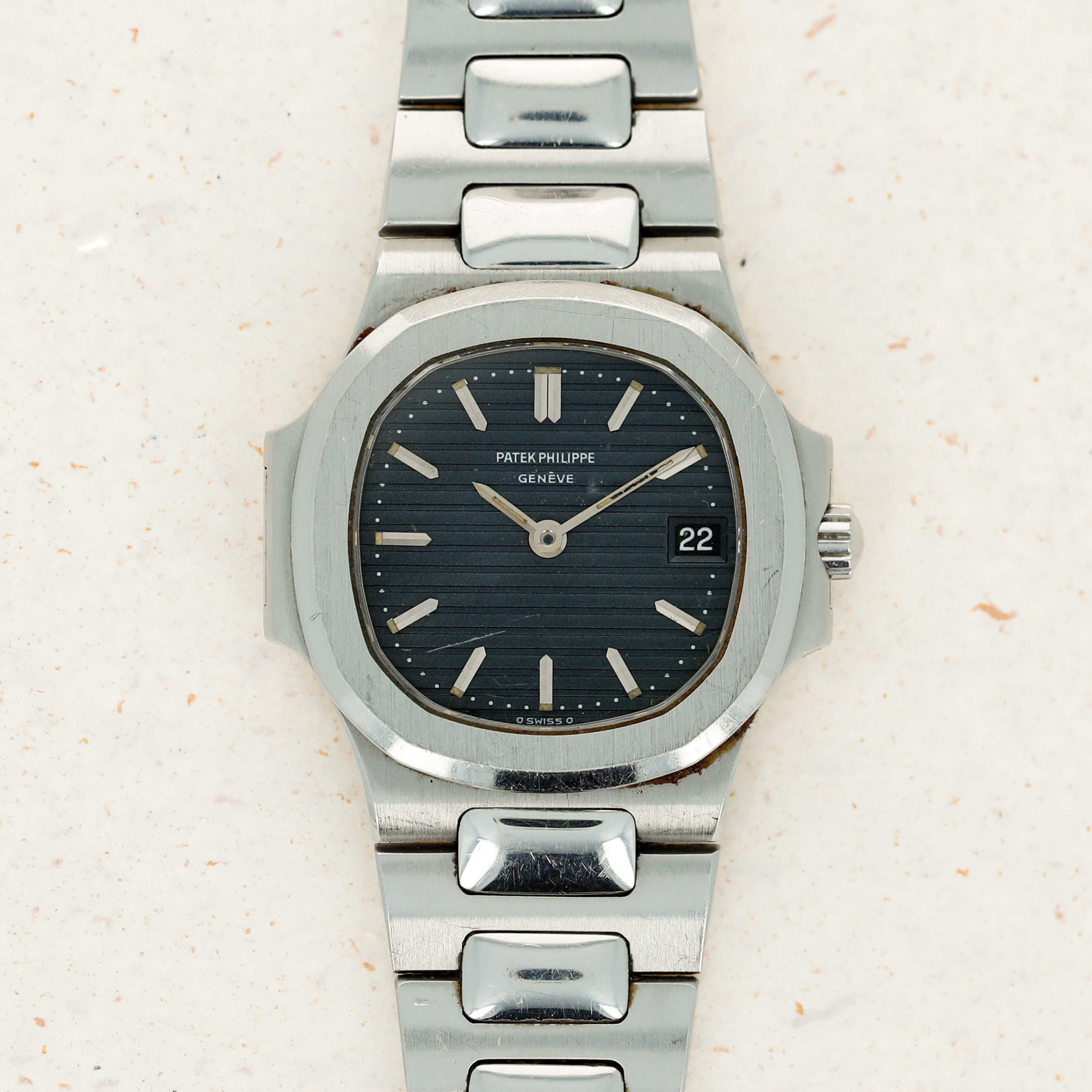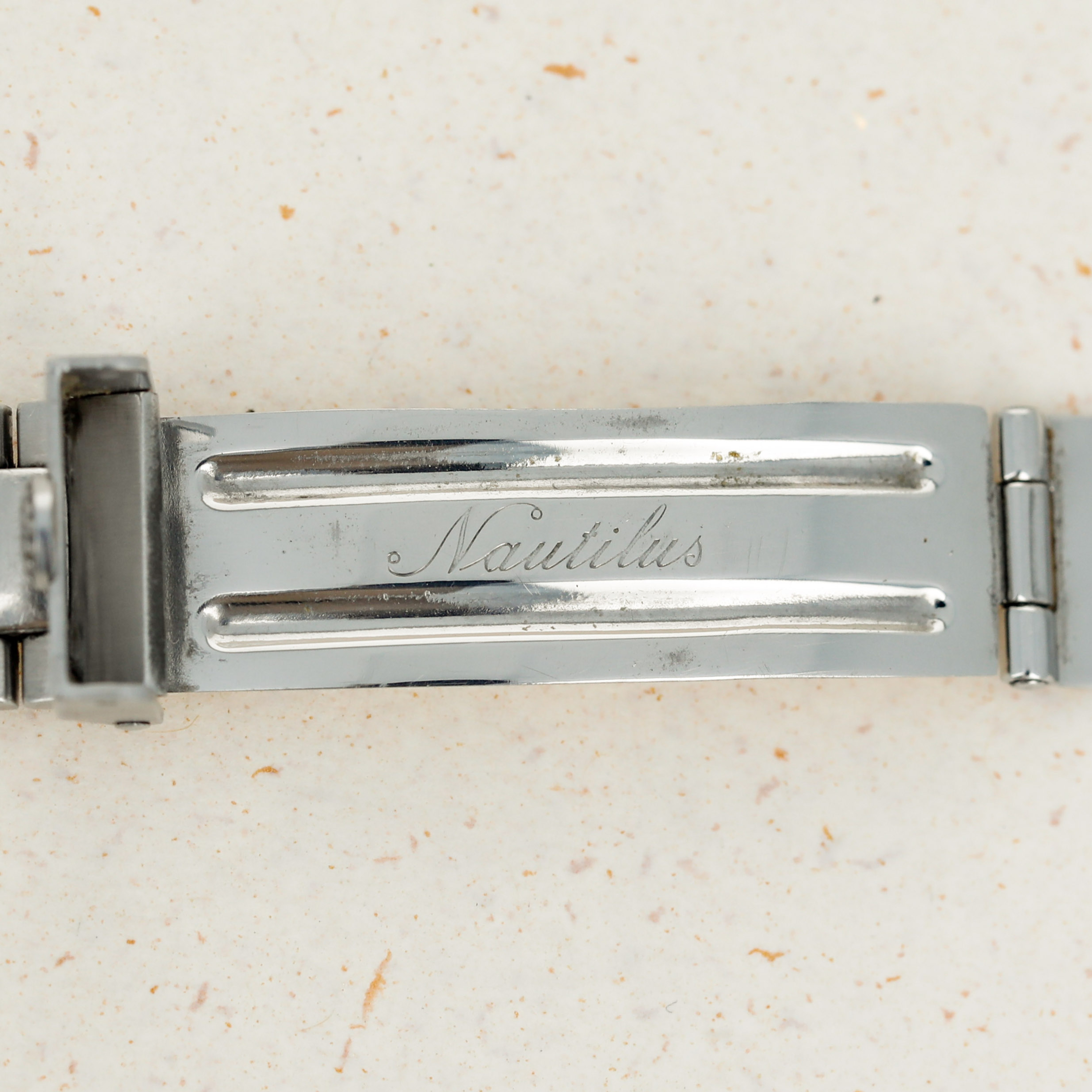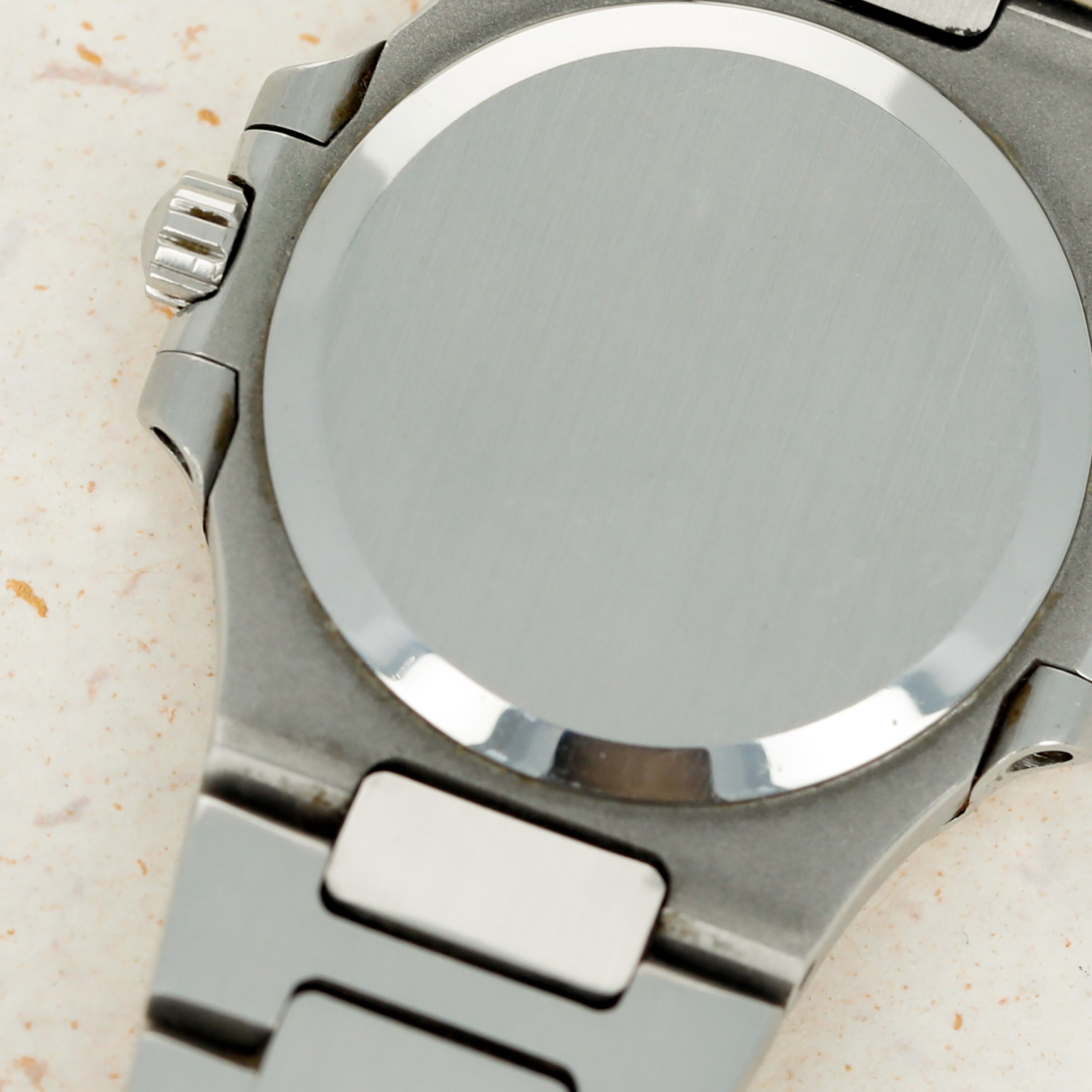 With its iconic blue-black dial featuring horizontally embossed stripes and unusually-shaped applied hour markers and hands for the Nautilus, this example's aesthetic is unique to the ref. 4700.