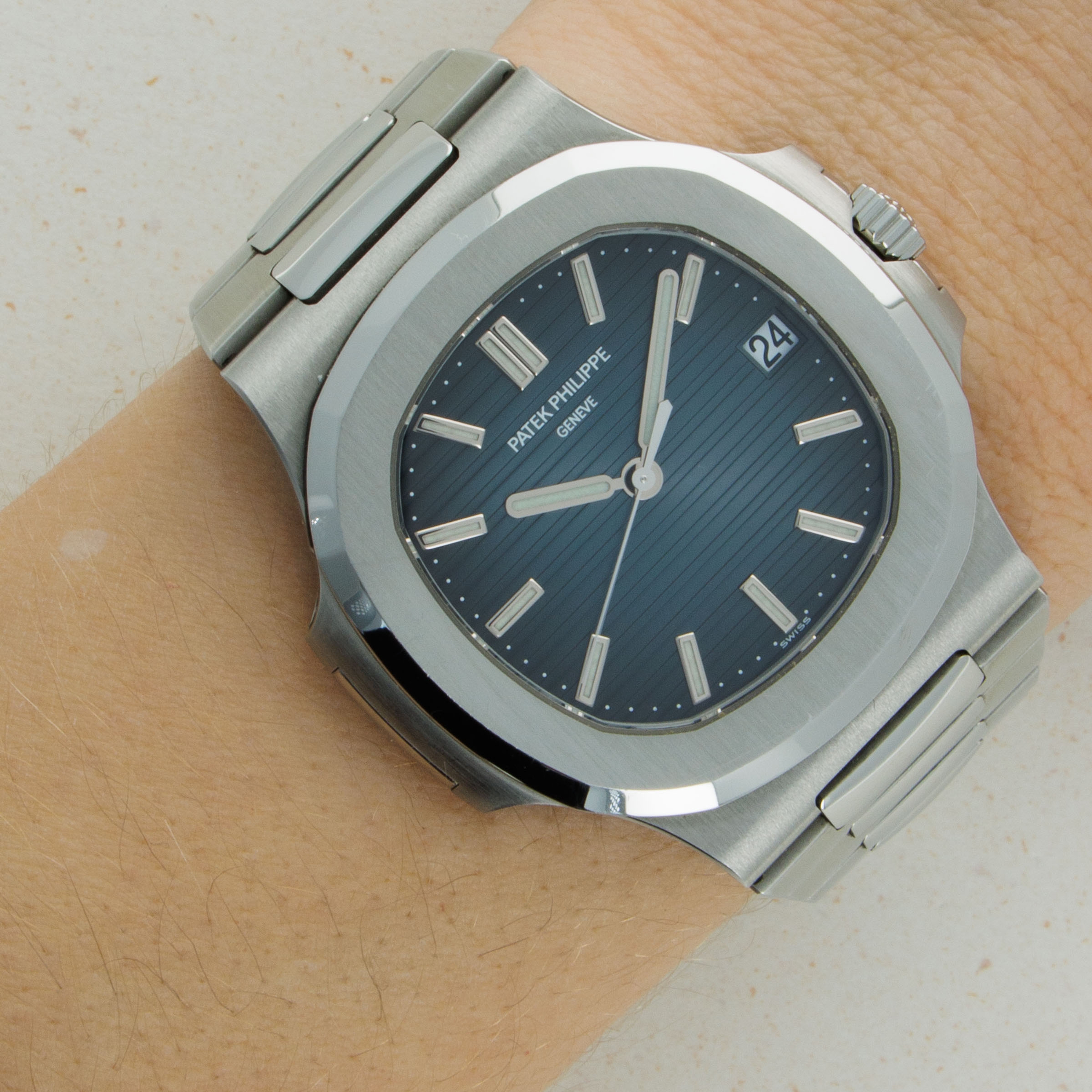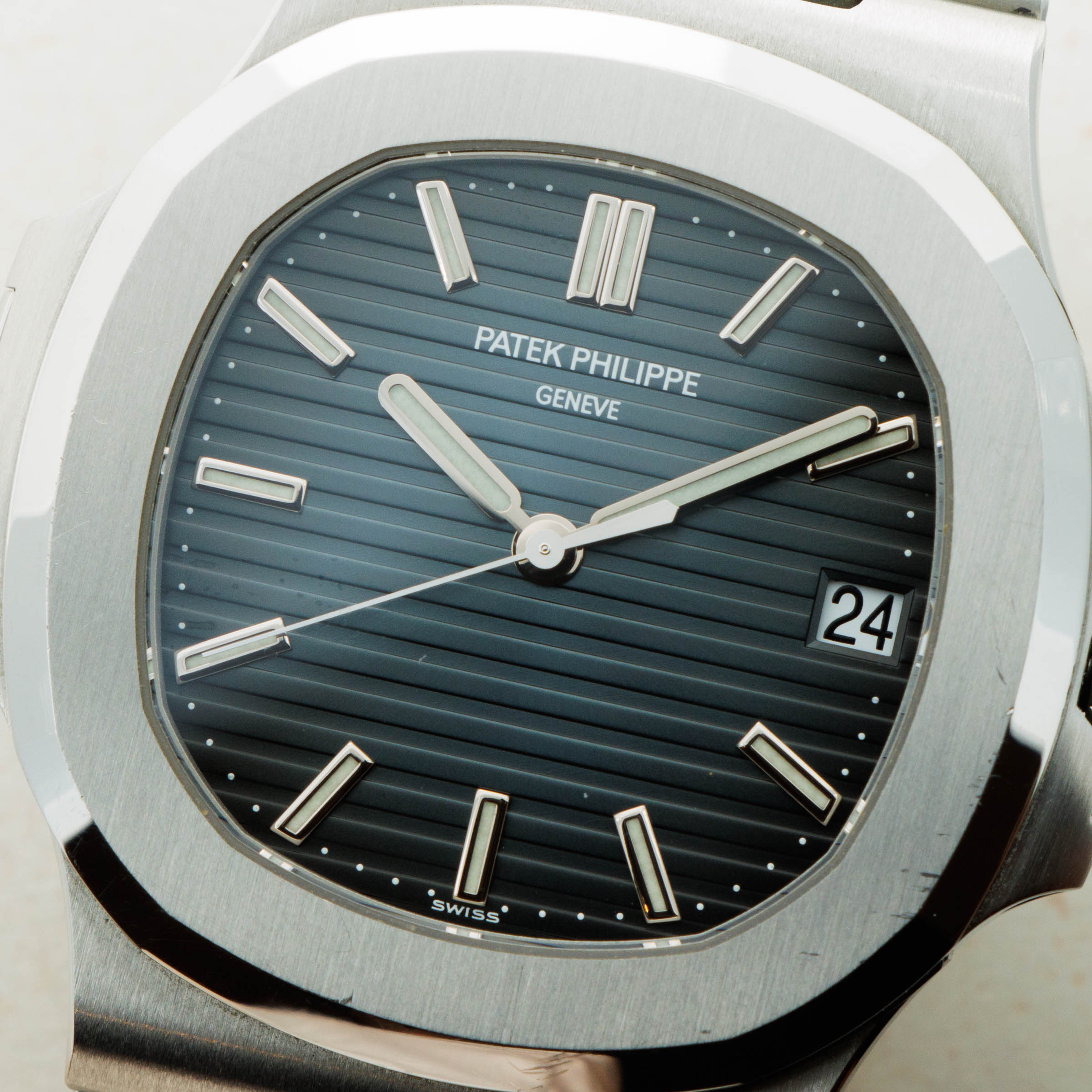 Easily one of watchmaking's most recognisable dials, the Nautilus sports horizontal embossing, a deep blue color and applied hour markers and a distinctive hand-set.