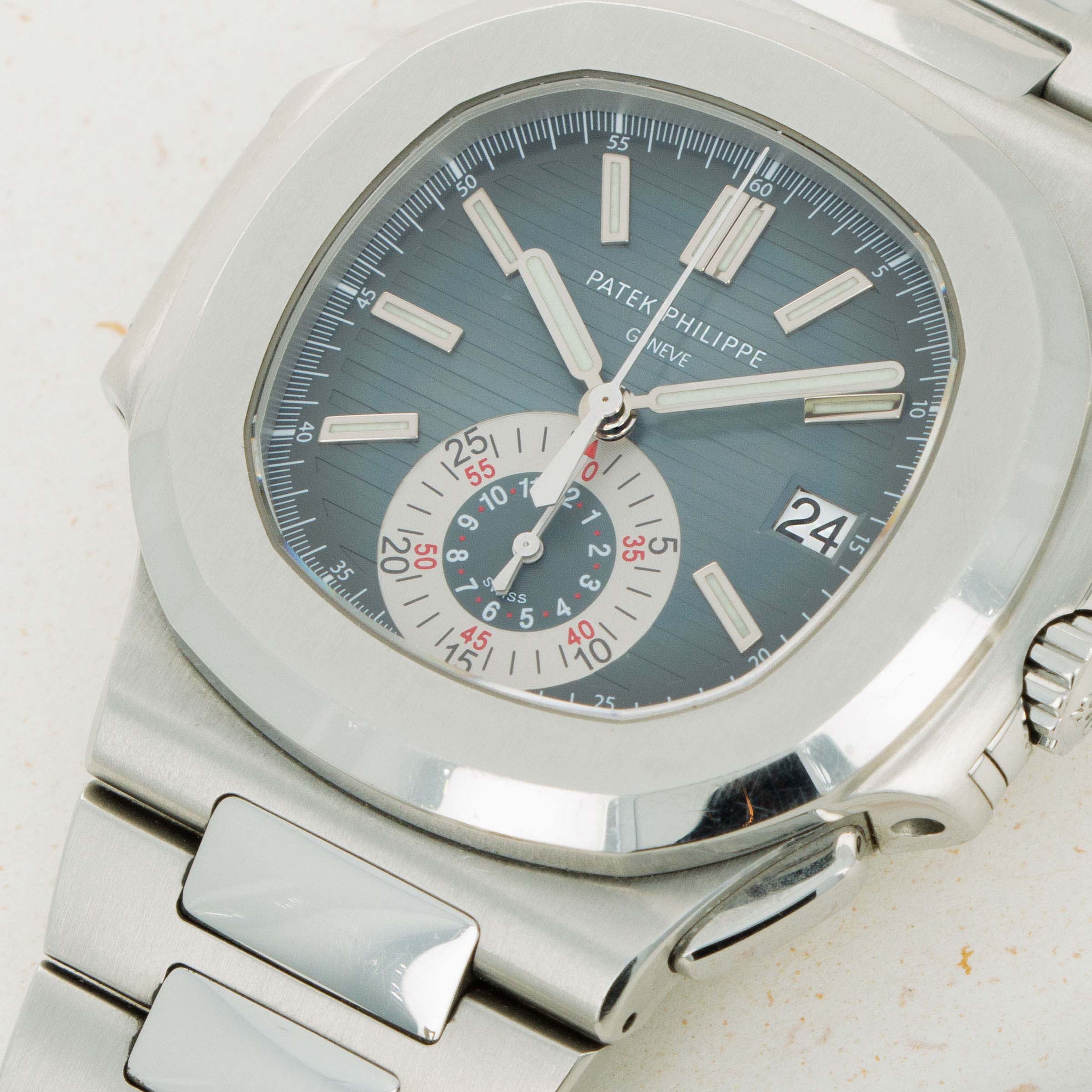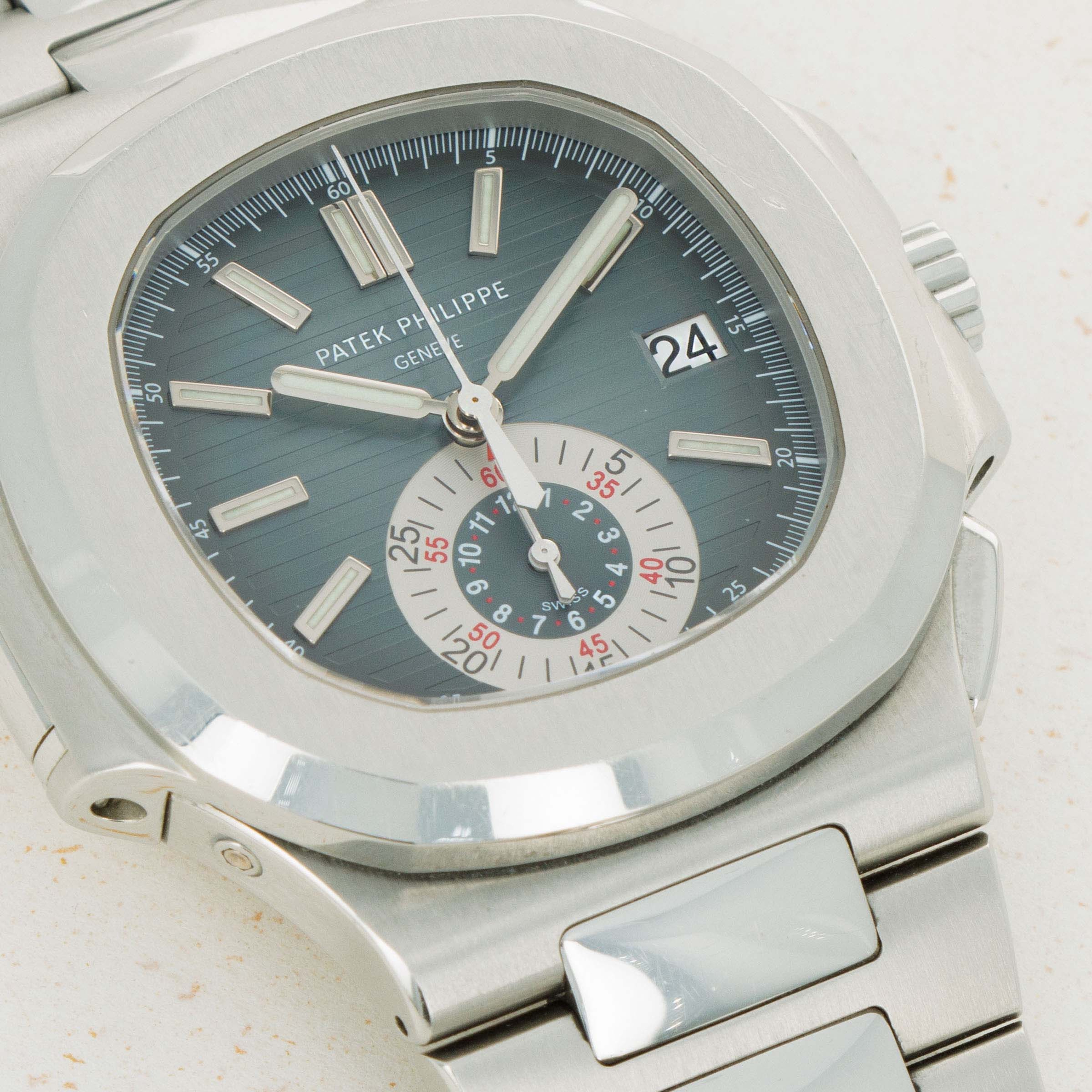 With its large white co-axial chronograph counter at 6 o’clock, the ref. 5980's stunning blue dial is visually distinctive from its time-only sibling, the ref. 5711.