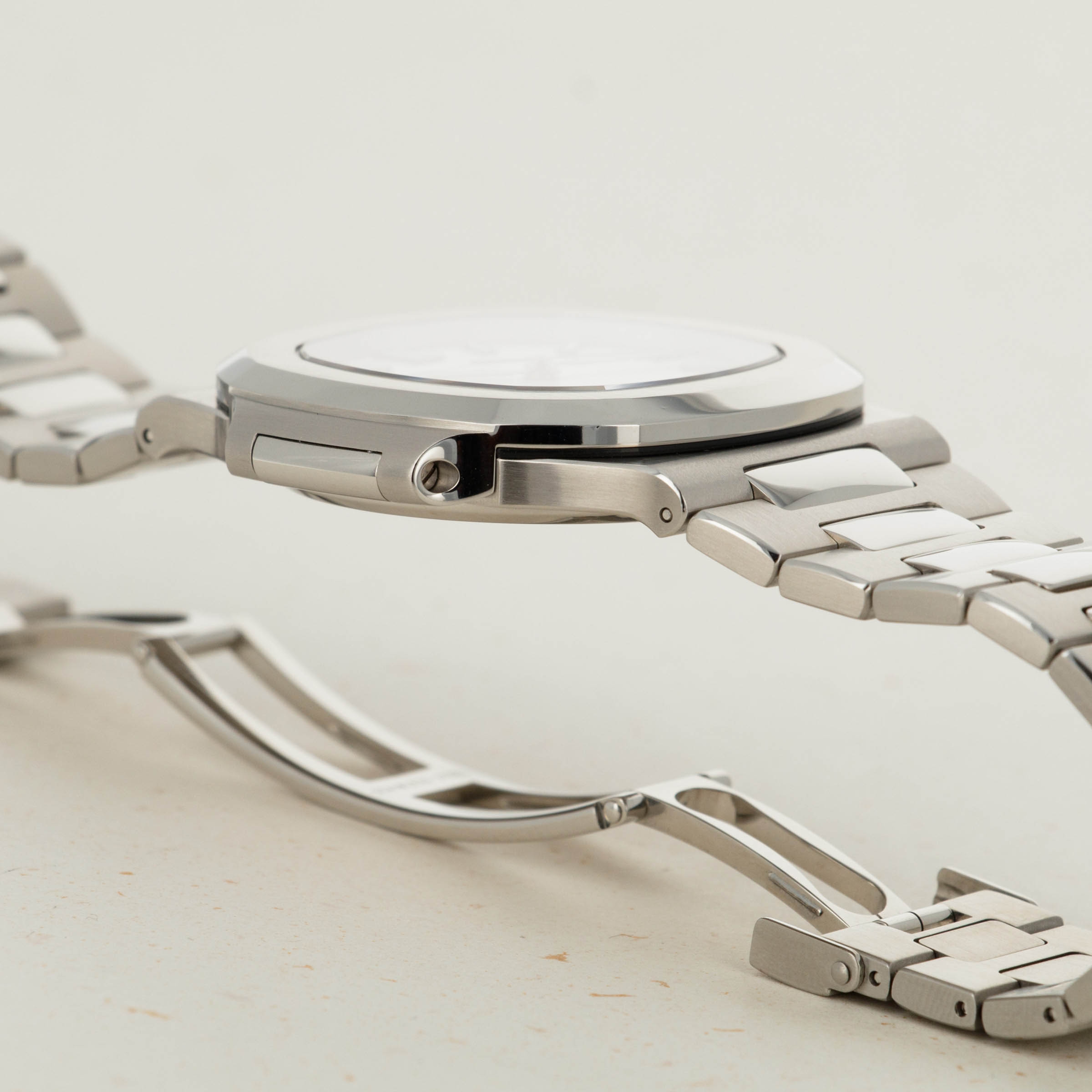 Released in 2006, the Patek Philippe Nautilus ref. 5711 has grown from some rather humble beginnings as an oft-ignored stainless steel sports watch from a brand renowned for their complications to one of the most exclusive and sought-after timepieces in the world. Following a stratospheric climb to fame, the Nautilus ref. 5711 was seen as the poster child of Patek's reign over the horological world. However, long before this climb, in 2012, Patek launched the silvery-white “Piano” dial Nautilus ref. 5711/1A that we have here and two sibling variants – a chronograph and annual calendar model. Produced from 2012 until its discontinuation in early 2020, the white dial ref. 5711 lived in the shadow of its blue-dialed cousin, and as such, would be a rarer sight on the wrists of collectors. Stepping forward to today, with its shorter production run, greater rarity, and incredibly unique silver-white dial and black hour markers and hands, the Piano ref. 5711 Nautilus has quickly risen the Nautilus ranks and exists as a favorite for many collectors seeking a Nautilus that steps out from the collection’s typical design language and does something rather new.