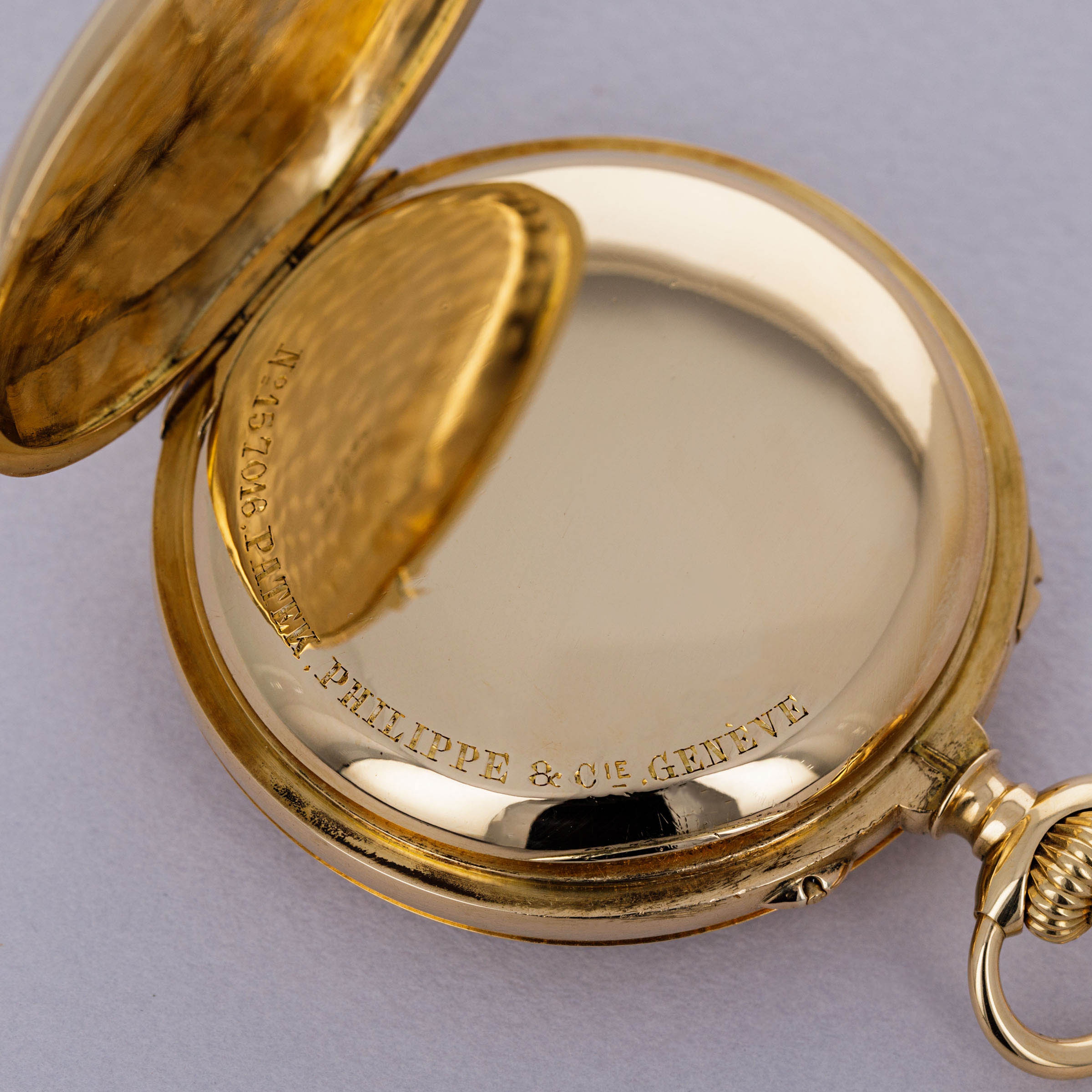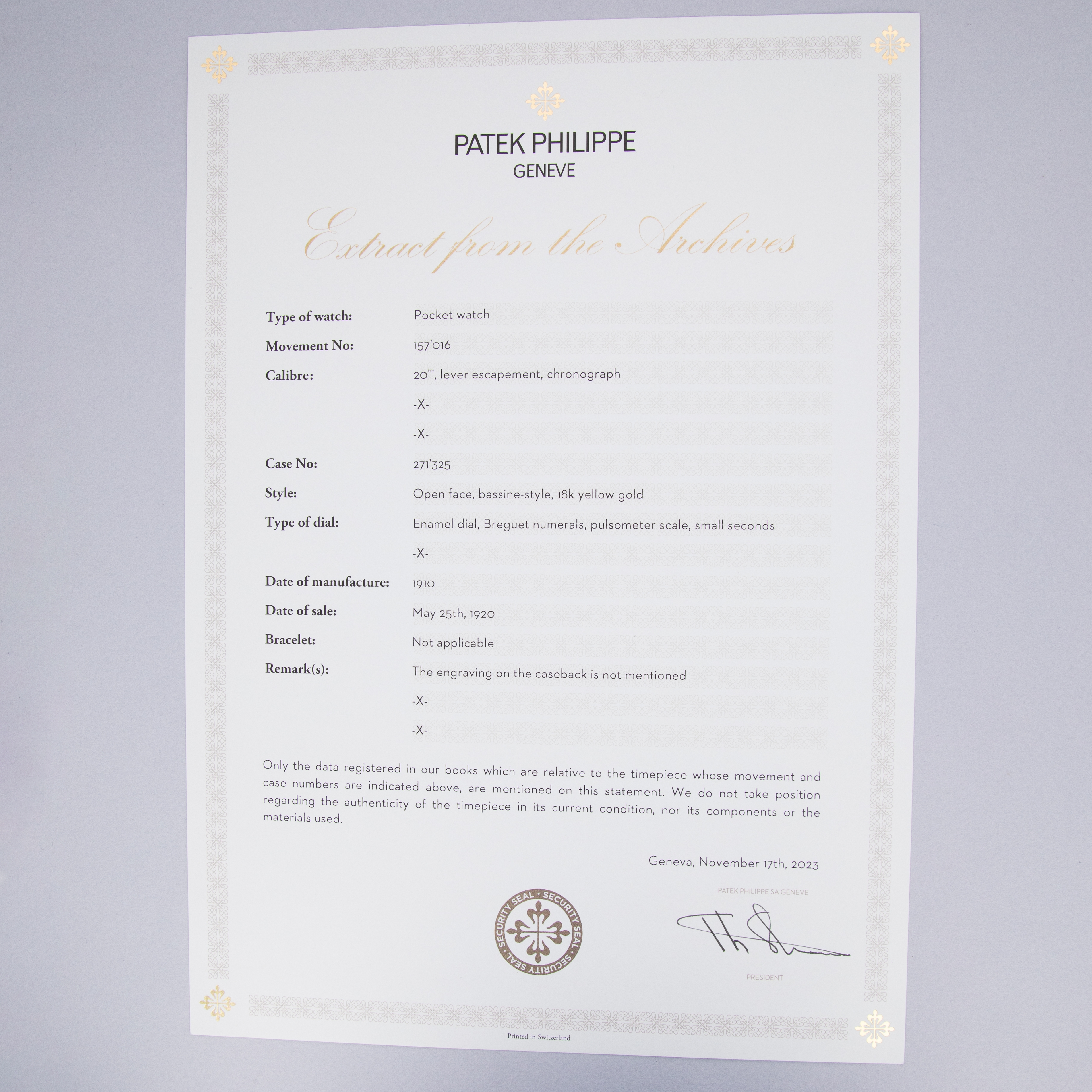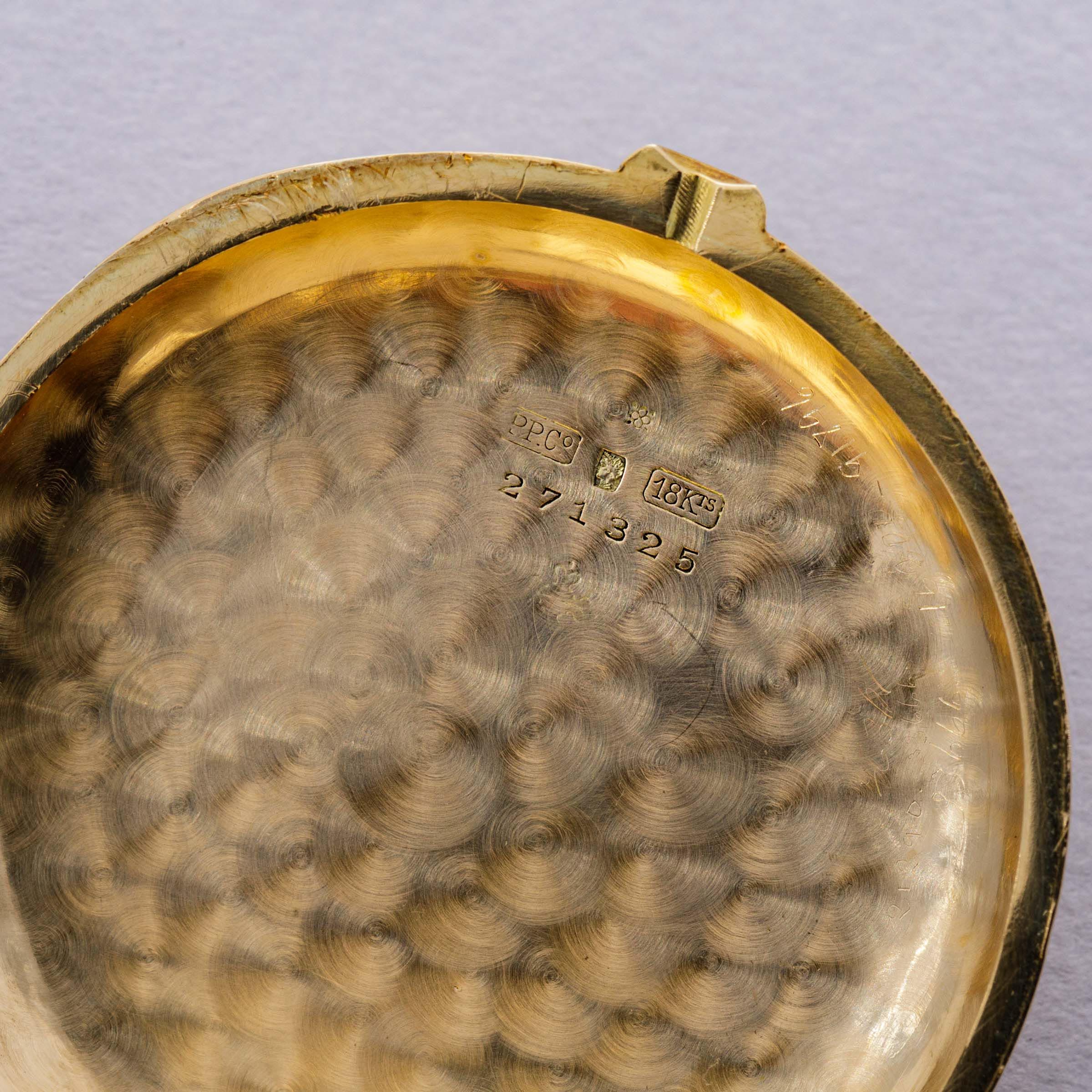 Pocket watch is in excellent overall condition. Case shows minor superficial wear, with some fine scratches and marks visible along the case. Engravings are all crisp and lean, and the serial number and PP Co stamps on the case are fully visible. There is a monogram on the outer surface of the case as seen in the images. The original enamel dial is near-mint, with no hairlines visible. The Extract of the Archives is included with the watch and confirms both the Breguet indexes and Pulsation scale.