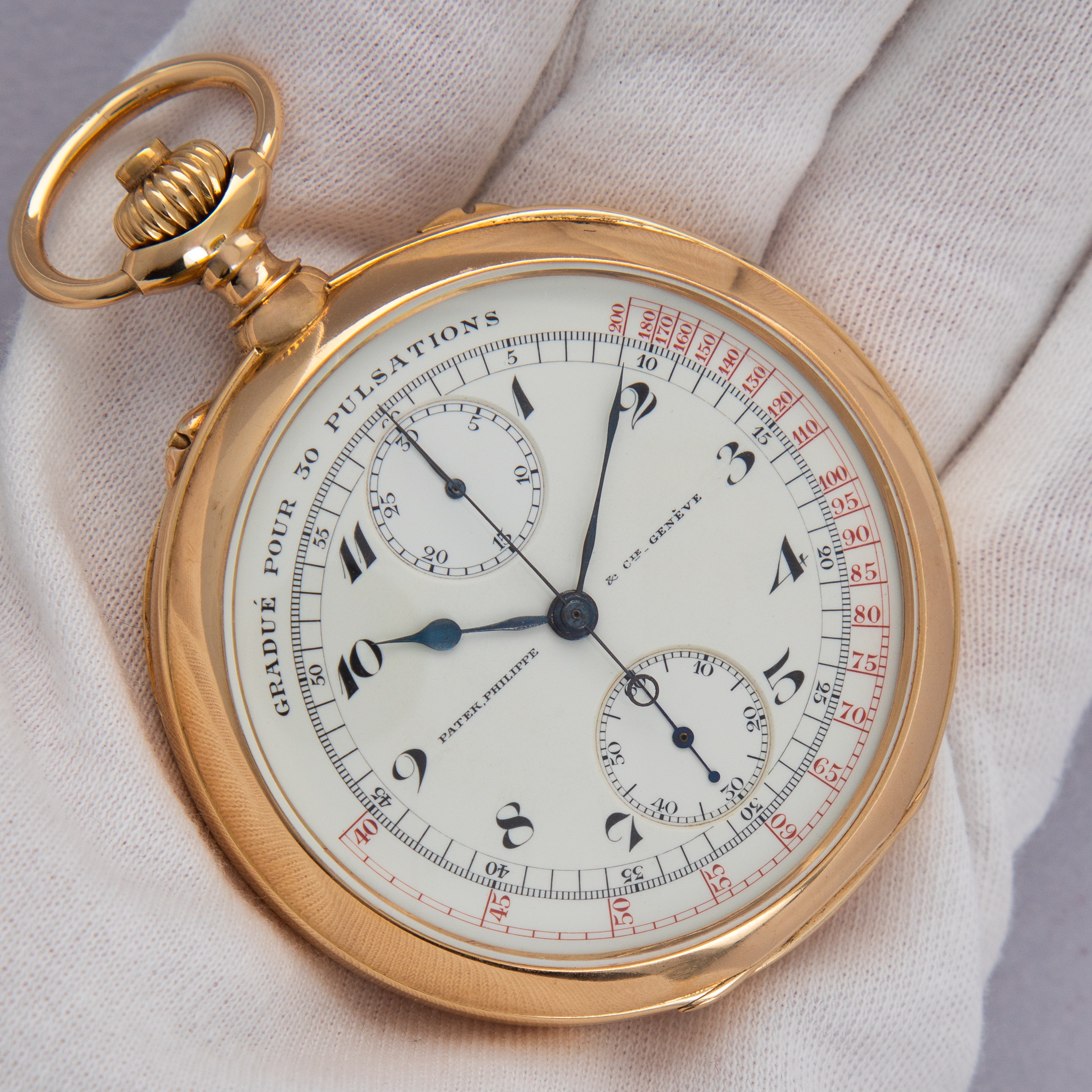 This watch can literally make your heart stop. It’s sheer beauty and rarity cannot be overstated. First, the dial is one of the rarest configurations of a pulsation dial we have ever seen. It’s a three part dial graduated for pulsations on the outer chapter, hand painted in black and red on white enamel. The massive case is nicely preserved and the recently overhauled movement is ready for you to count the beats per second of a loved one. For the collector of important Patek Philippe chronographs, new and old, this timepiece is not to be overlooked. Accompanied by its Extract from the Archives confirming the original date of sale on May 25, 1920 and an enamel dial with ‘pulsometer scale’.