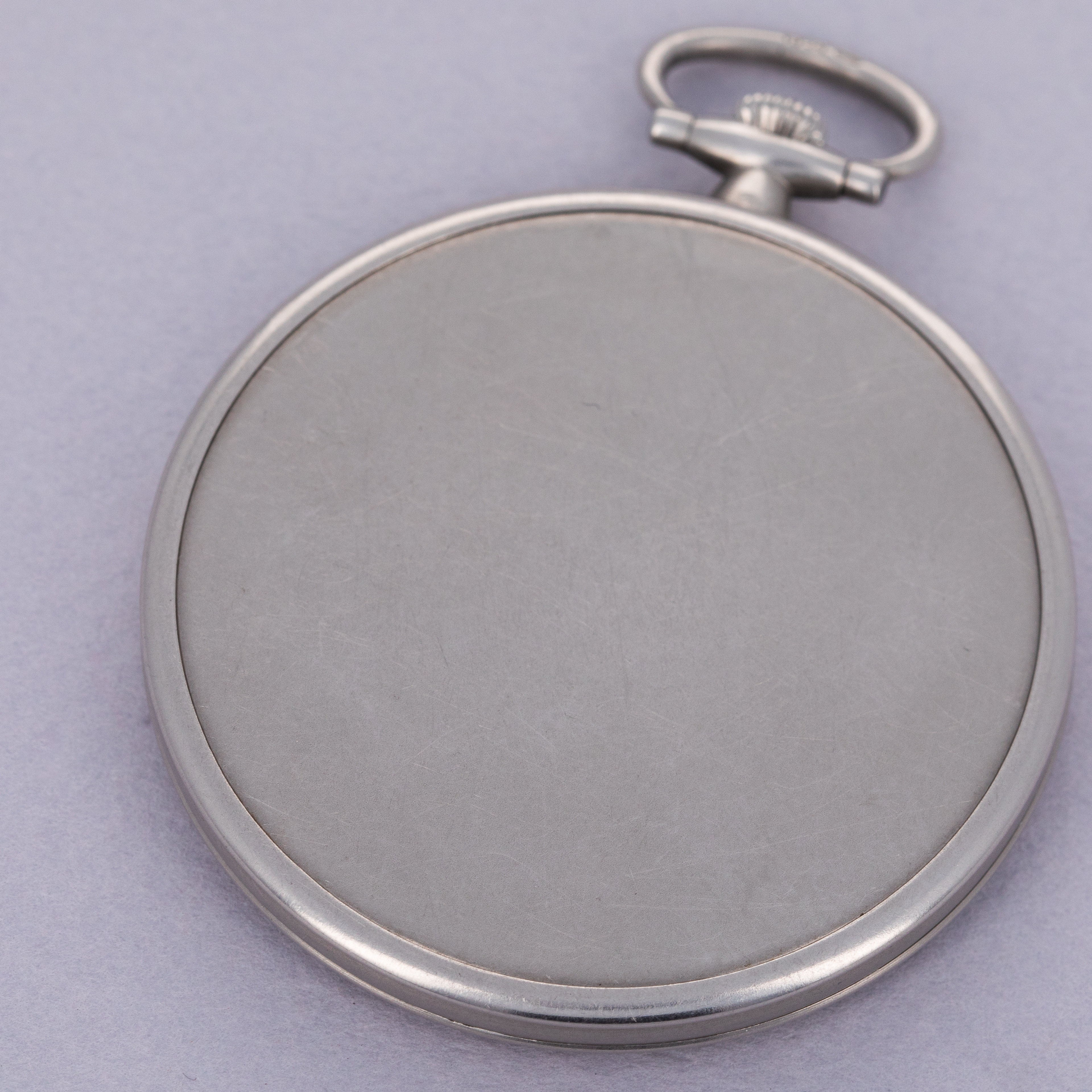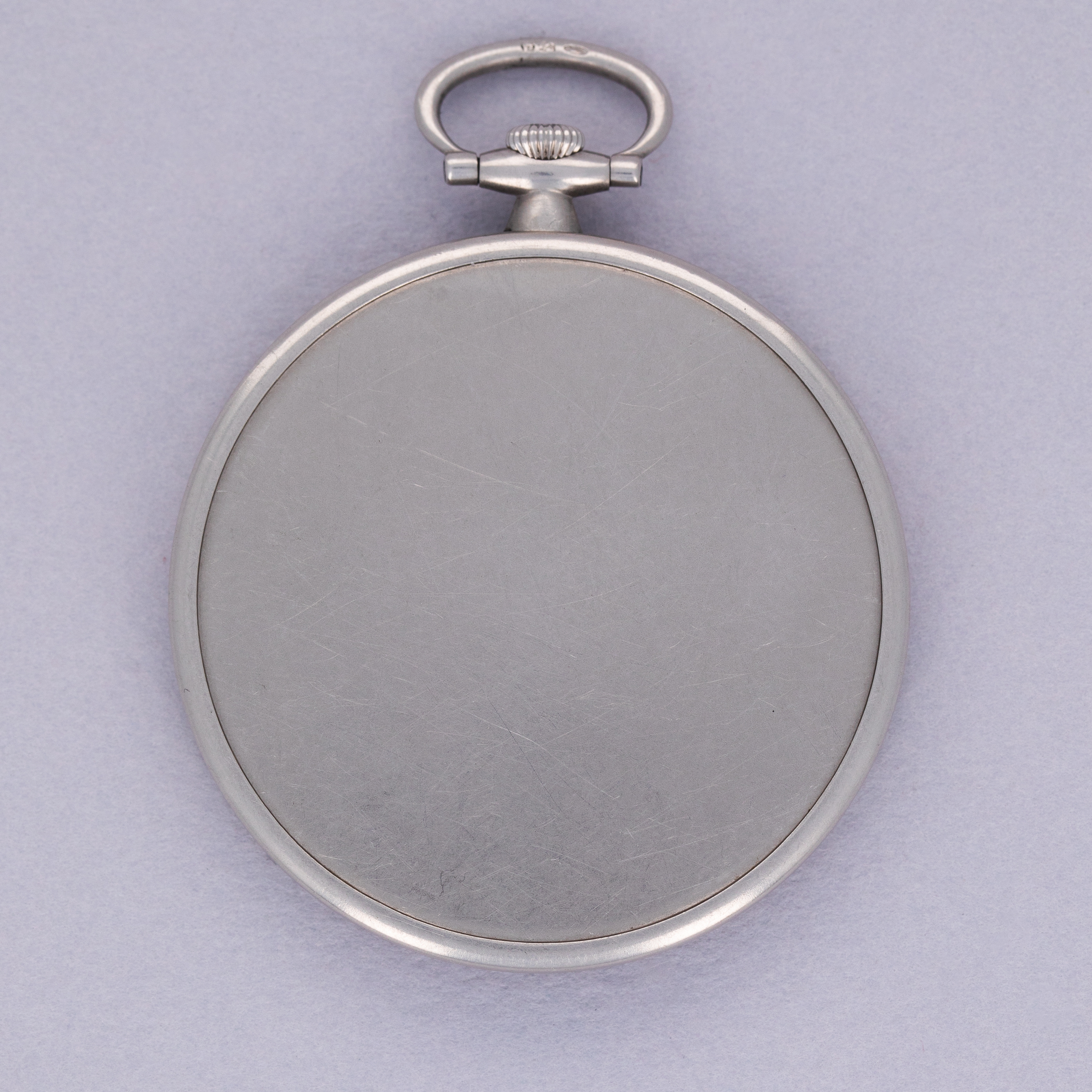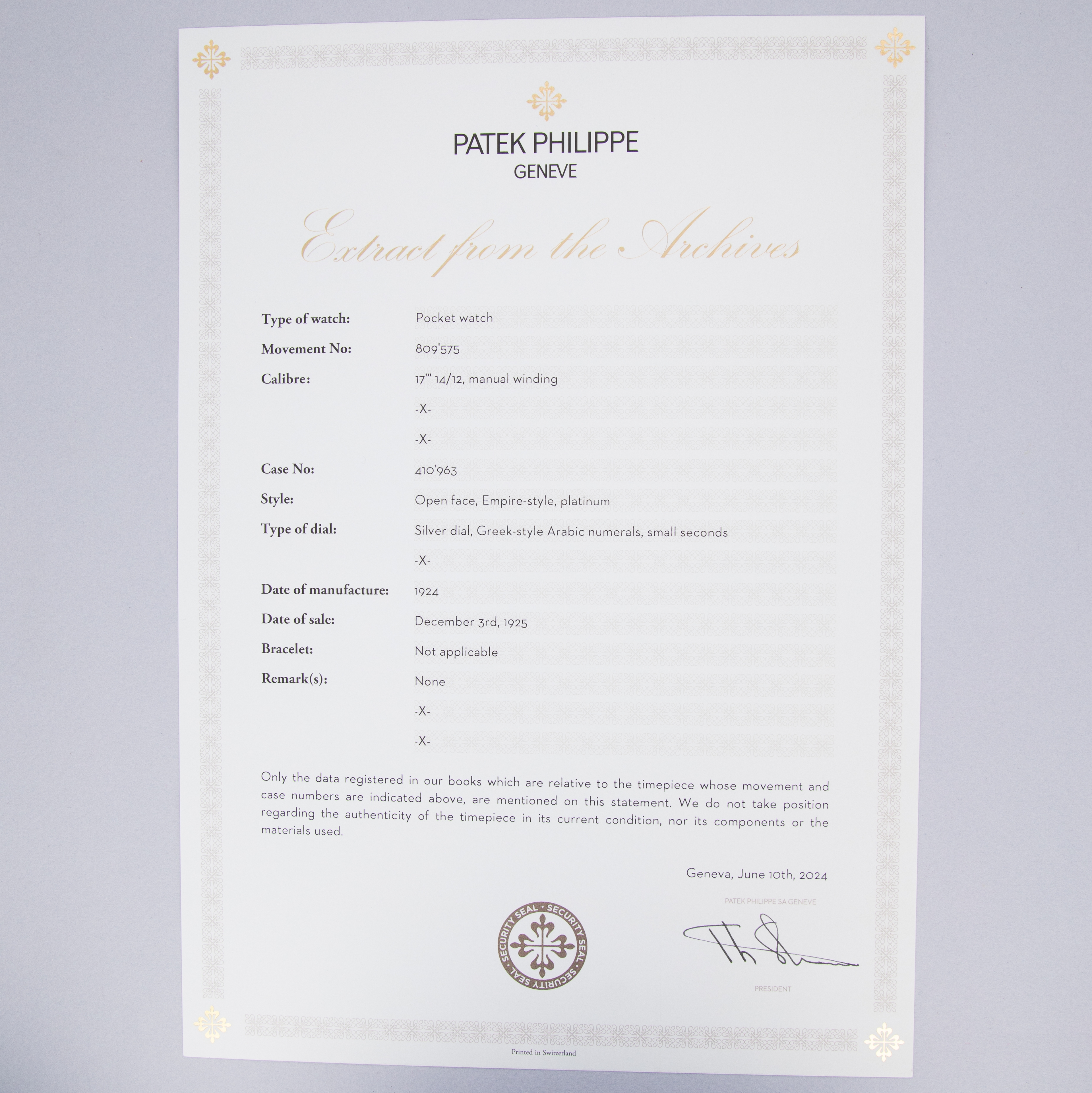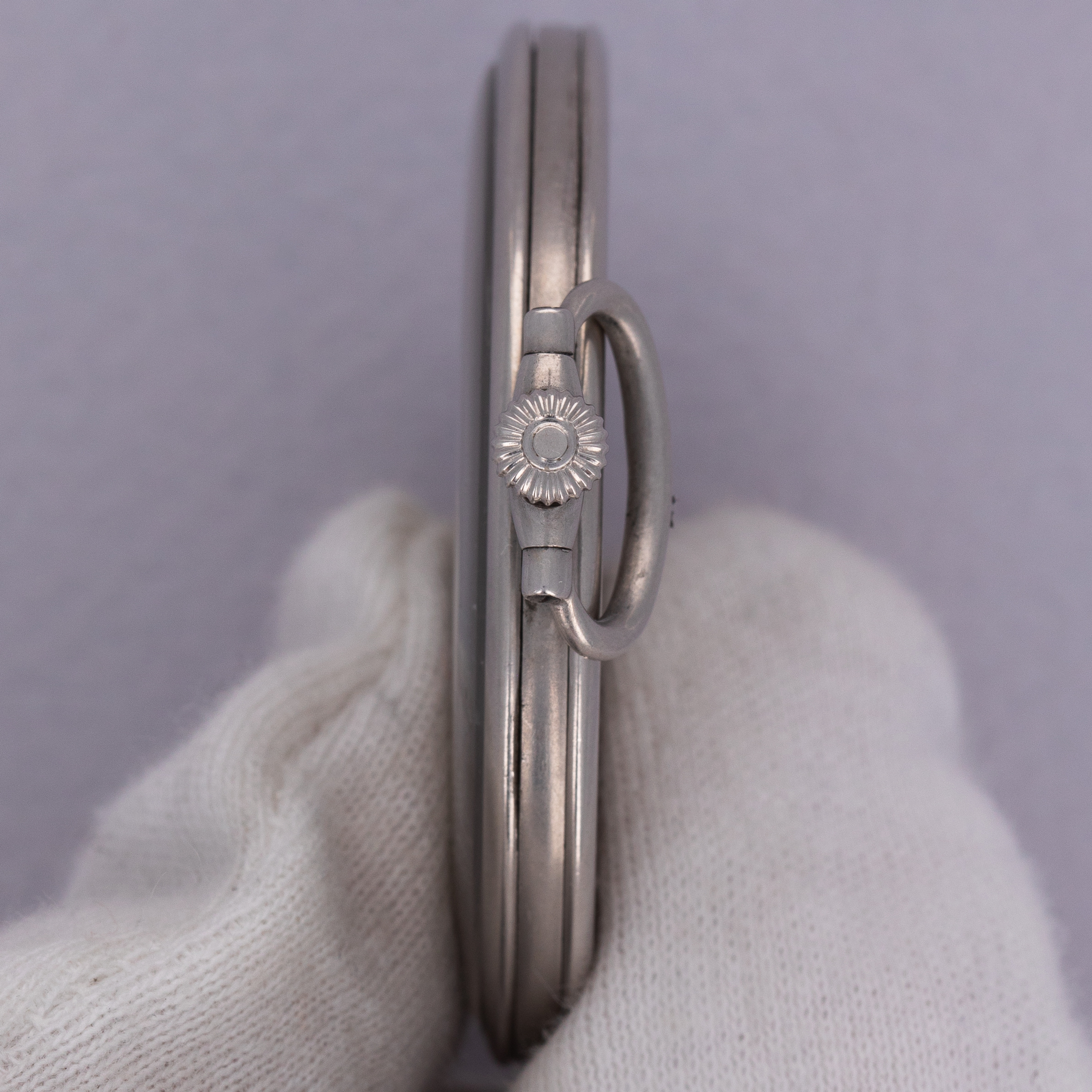 Want to own the most interesting watch at your next dinner party? This elegant Art Deco-style platinum Patek Philippe pocket watch from 1924 was first sold in 1925 and features a silvered dial with Greek style Arabic numerals. Rarity, beauty, and absolute value. You can one this for less than the price of a modern Patek Philippe platinum folding clasp.