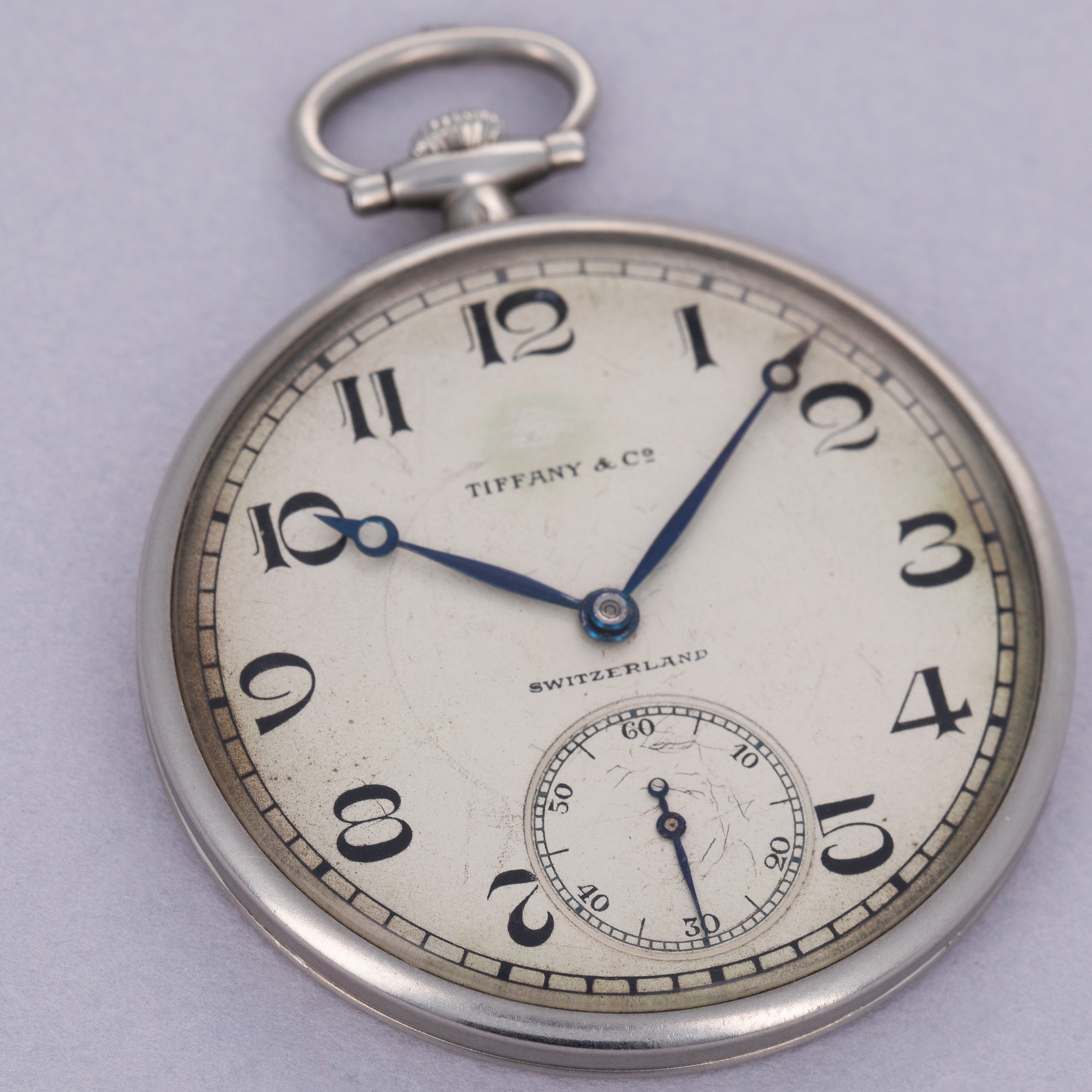 Watch is in very good overall condition. Case shows some surface wear, with light marks and scratches visible. The platinum hallmark is sharp and visible on the stem area of the case. The original engraved enamel dial is in good overall condition. The Tiffany & Co dial exhibits moderate signs of aging and wear, with a darkened edge, as well as various surface marks along the dial surface, including a light hand drag around the middle, as wella as dark marks in the subdial. The "Greek Style Arabic Numerals" are mentioned on the archive paper which is included.