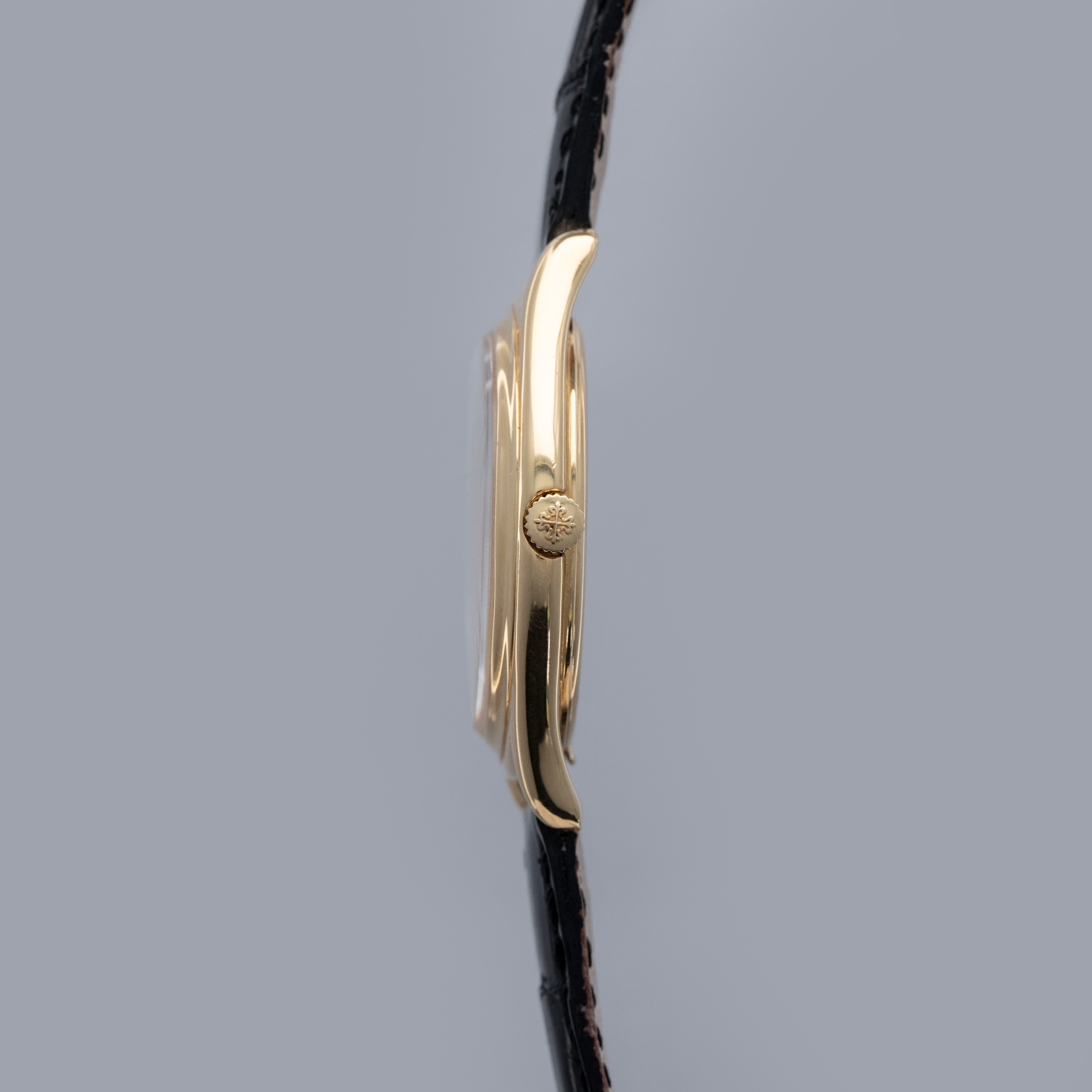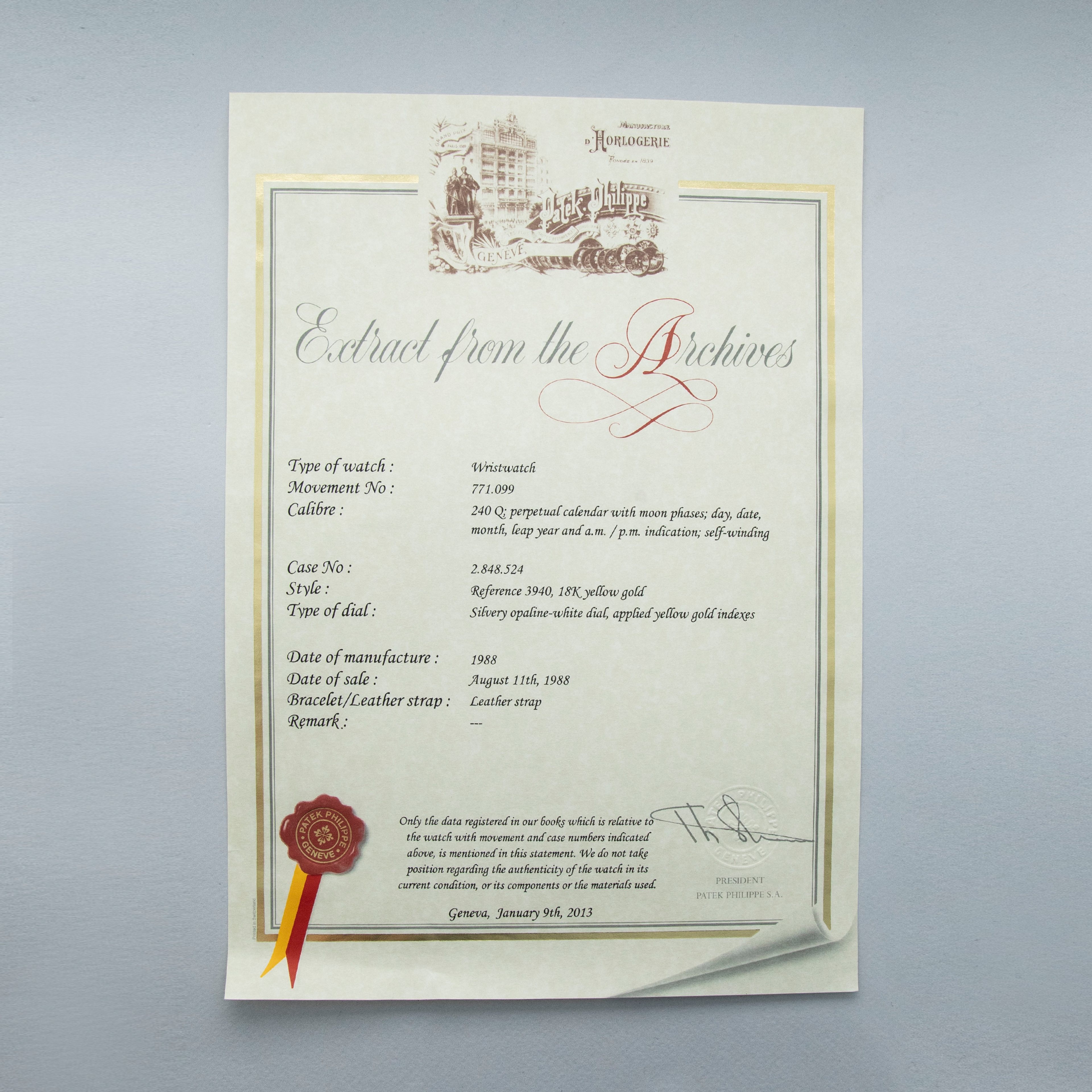 The watch is in overall excellent condition. The yellow gold case shows some light surface marks and a couple of very small nicks. The case back retains a legible stamp, and the corrector remains well defined. The watch is a second series example, but is fitted with a later dial which was replaced at service. It is in near-mint condition. Watch is fitted with a black alligator Patek Philippe strap and a yellow gold Patek Philippe deployant clasp in excellent condition. The watch comes with its card box and a Patek Philippe archive extract.