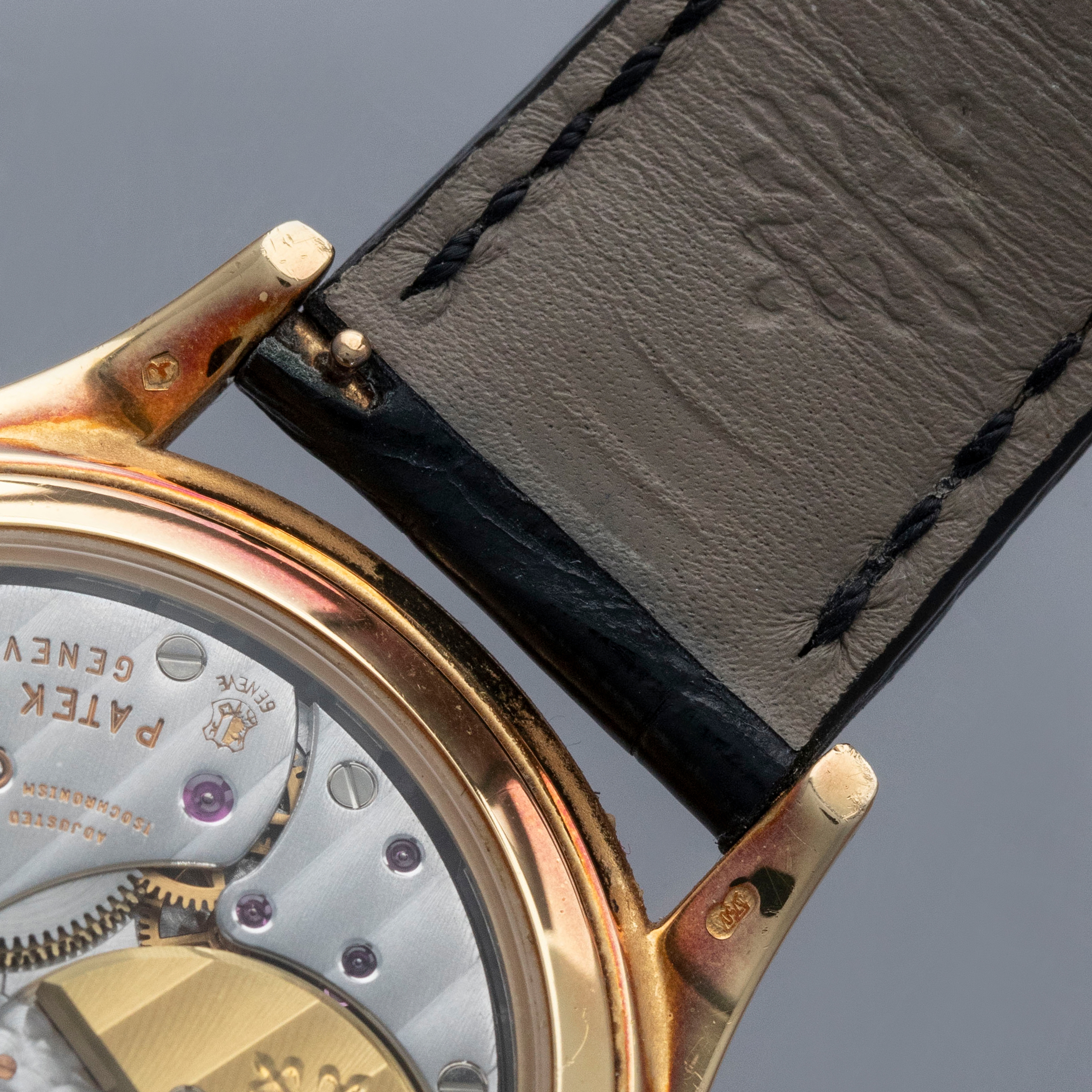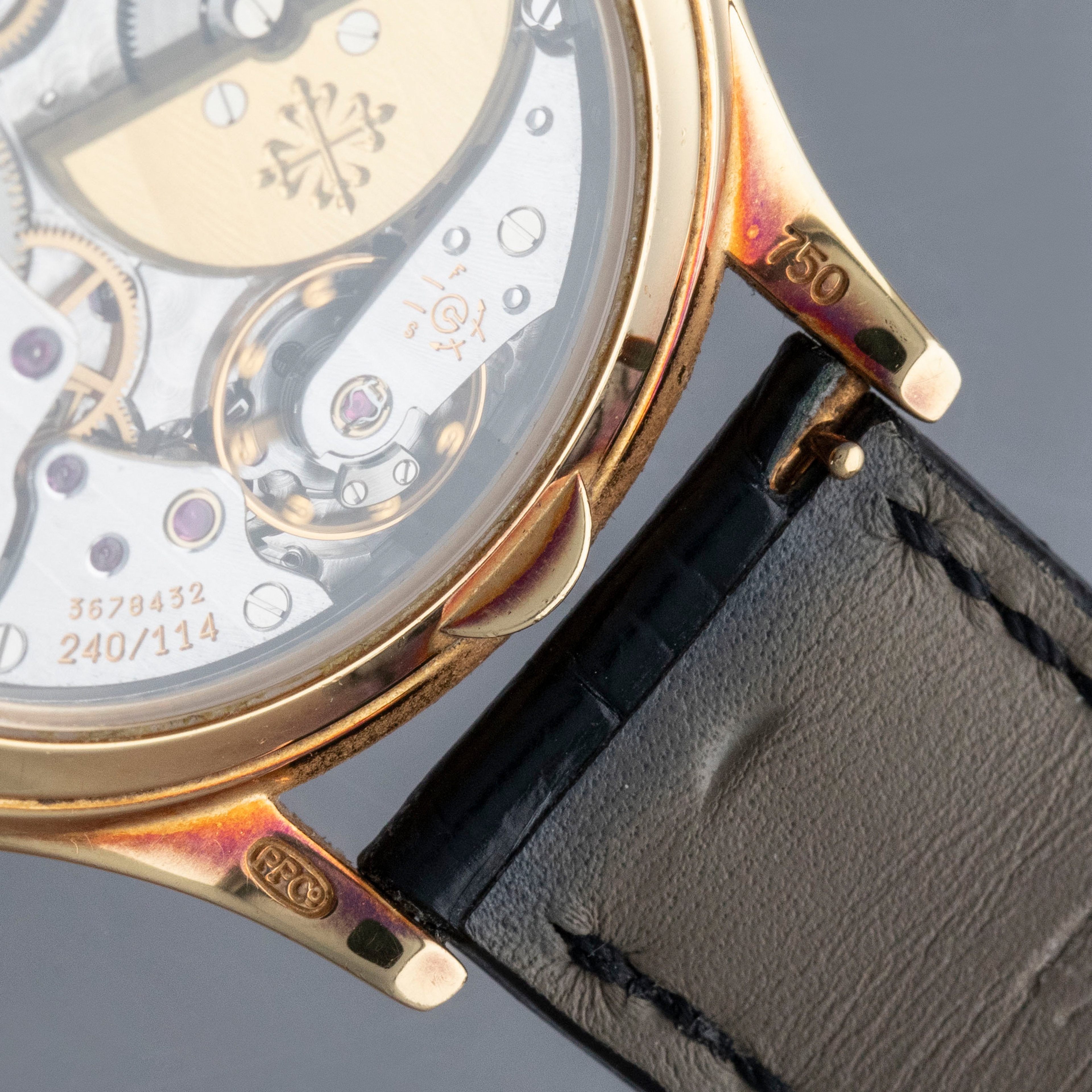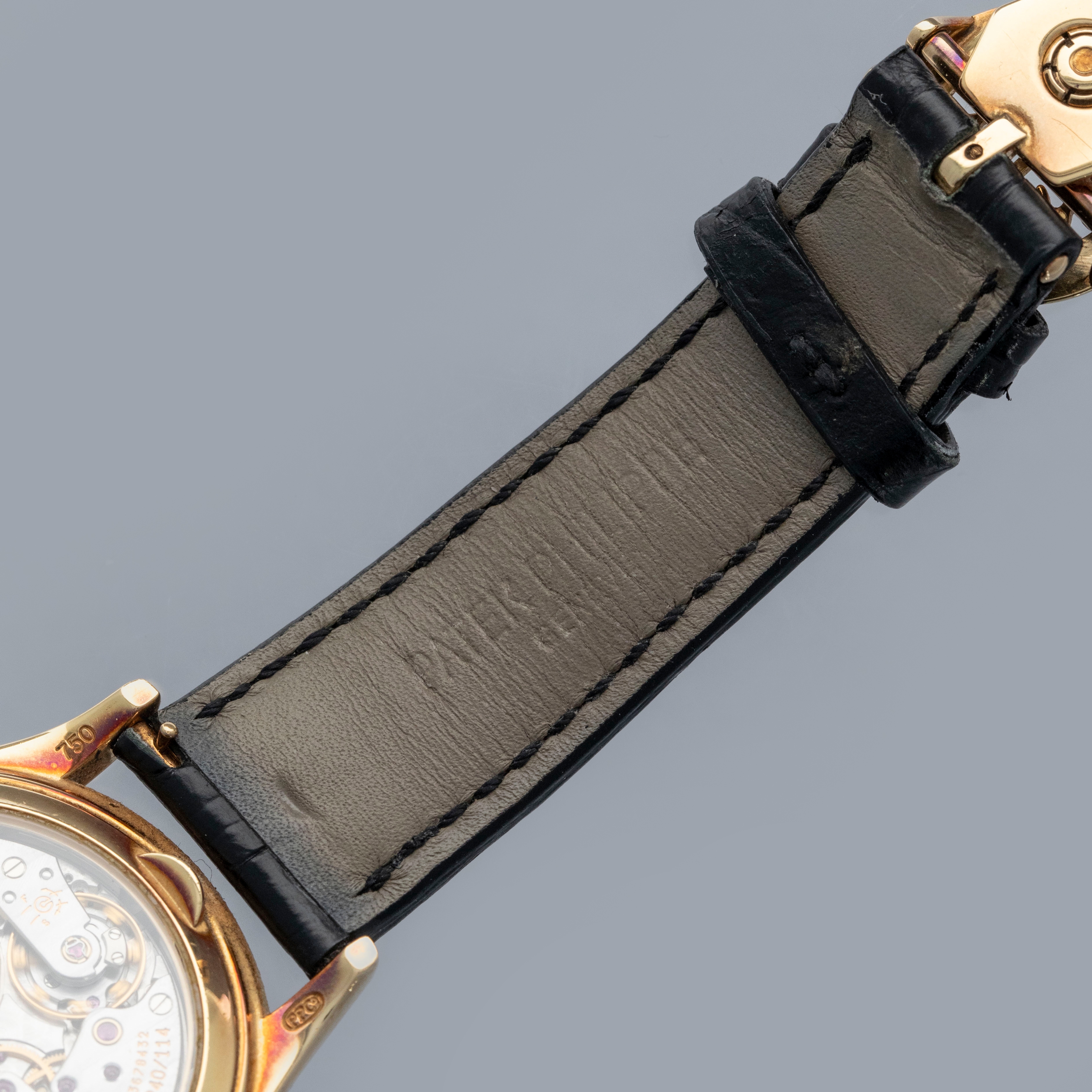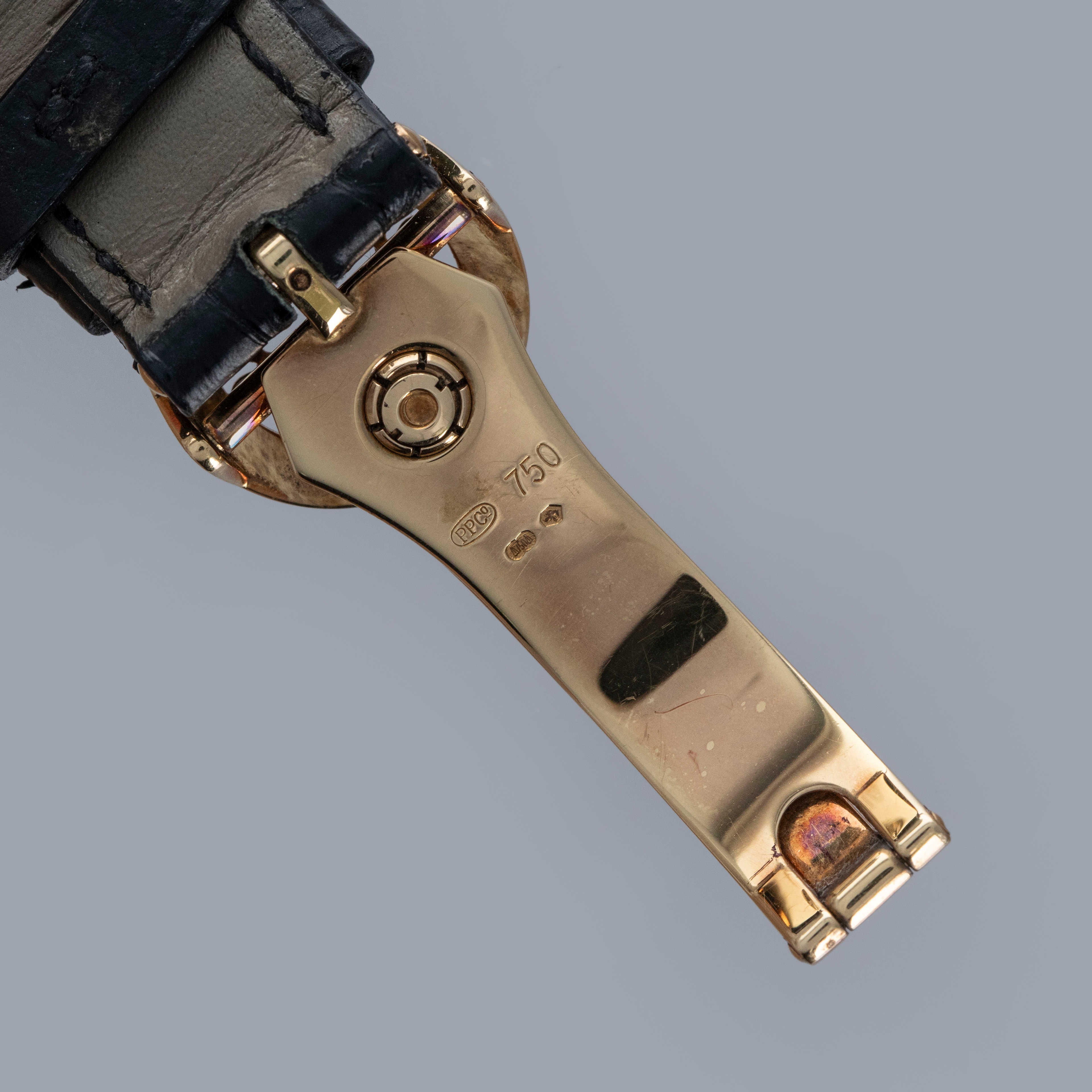 Watch is in very good overall condition. Case shows signs of wear on the case, with surface marks and scratches visible. Lugs and bezel show some softness along the edges as well. There is a nice warm rainbow patina that has developed along the 12 o'clock side of the bezel and along the caseback edges. Hallmarks on back of lugs are full and legible. Dial is near-mint, and shows little to no signs of aging. Watch comes on a strap with its original PP signed deployant buckle. It shows commensurate age to the rest of the watch.