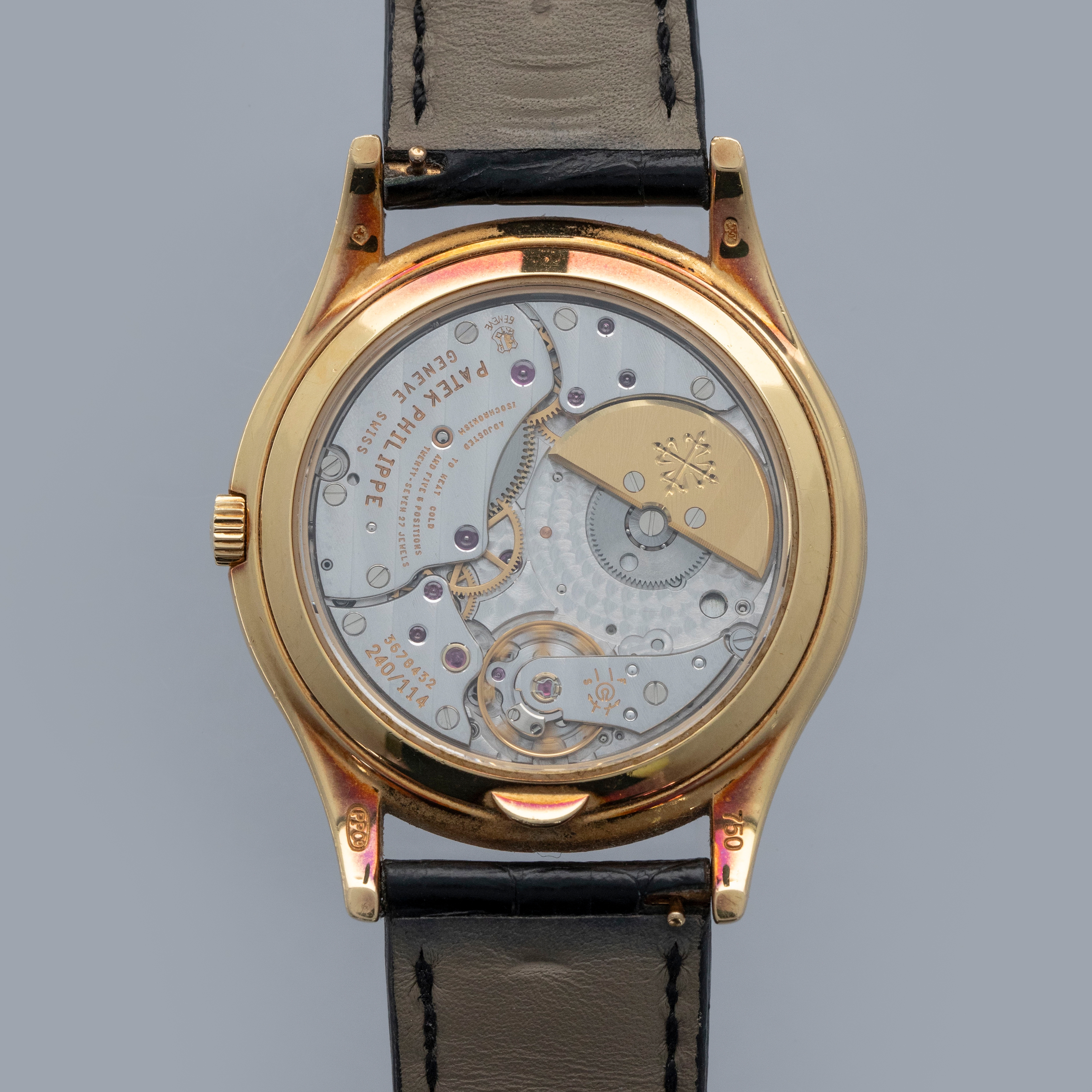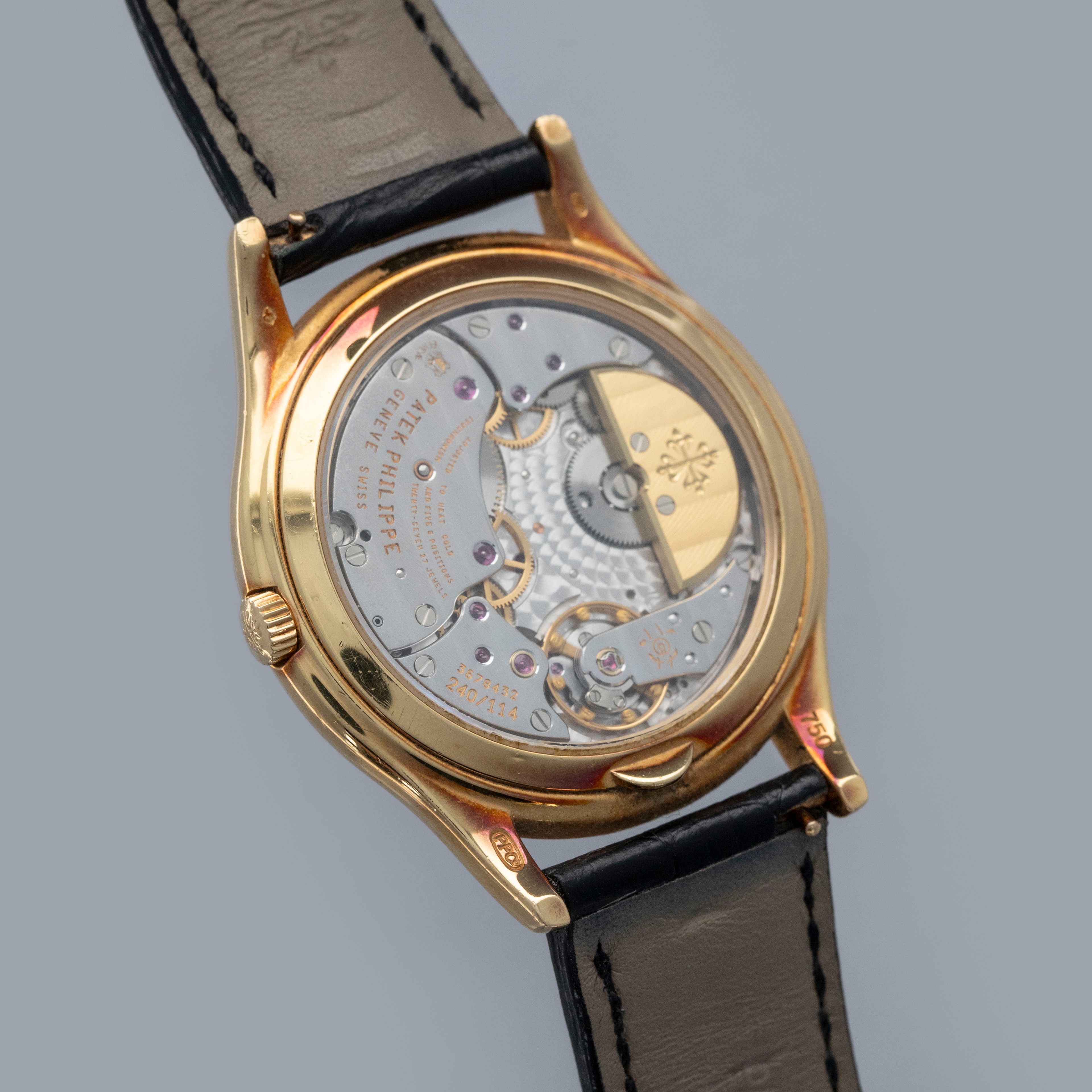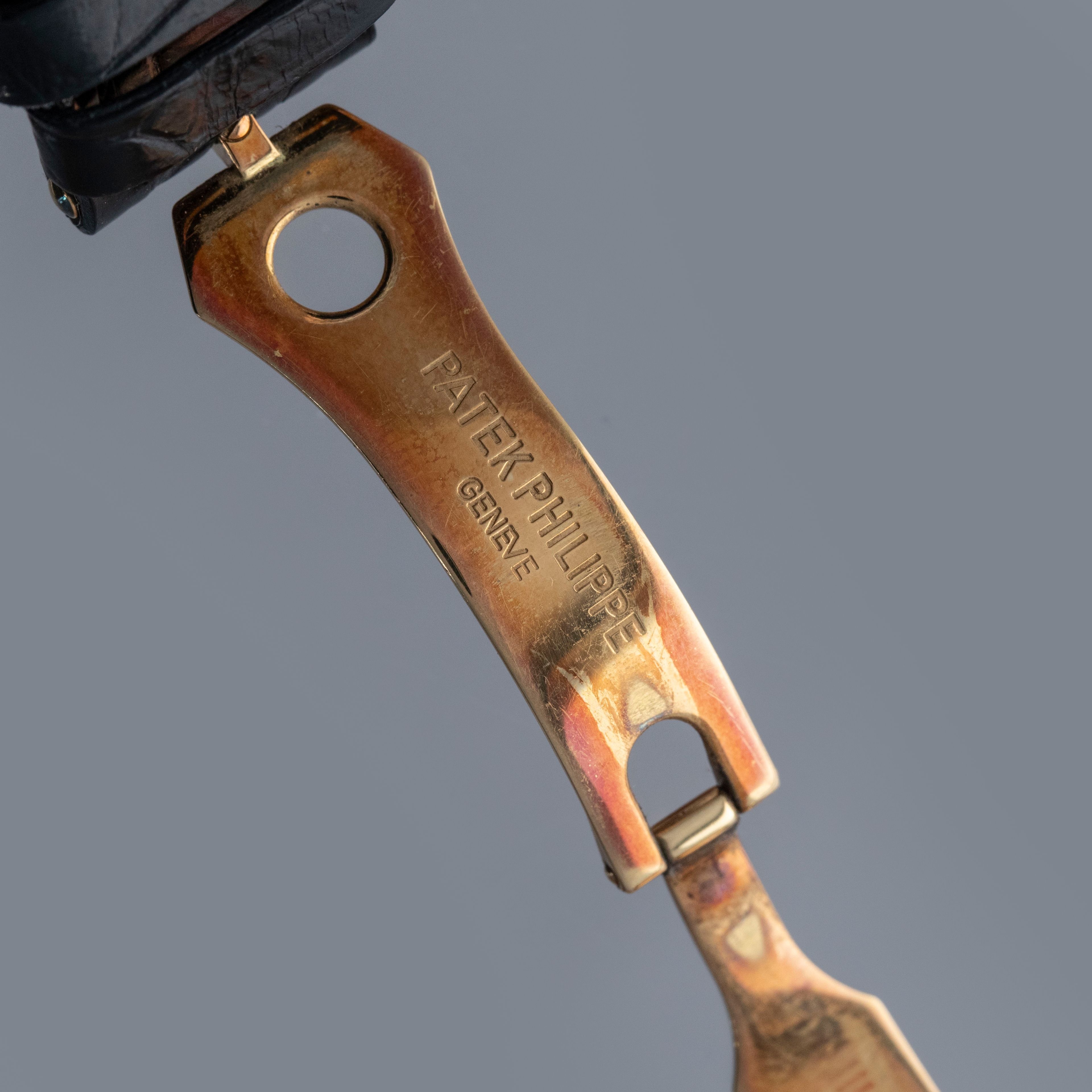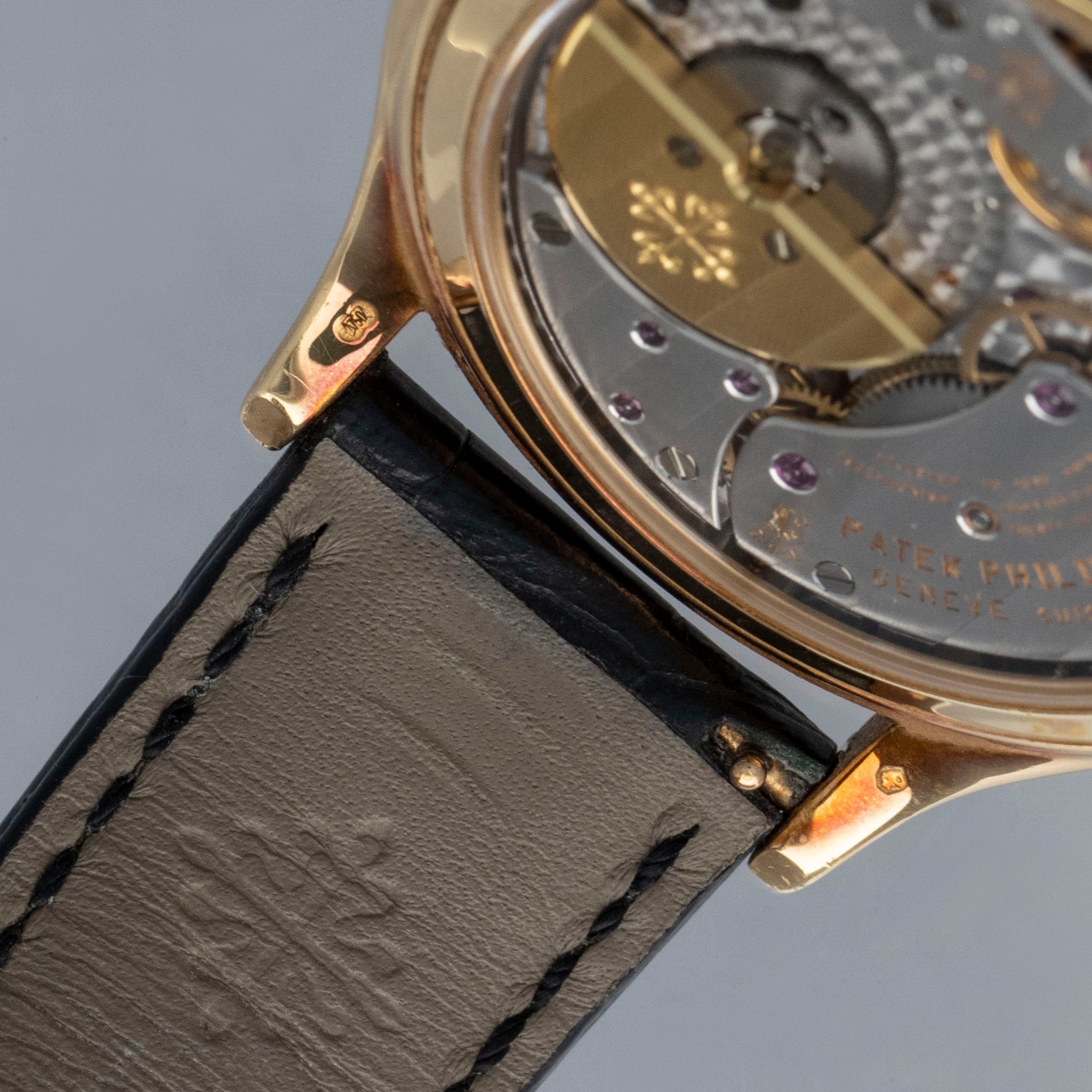 Watch is in very good overall condition. Case shows signs of wear on the case, with surface marks and scratches visible. Lugs and bezel show some softness along the edges as well. There is a nice warm rainbow patina that has developed along the 12 o'clock side of the bezel and along the caseback edges. Hallmarks on back of lugs are full and legible. Dial is near-mint, and shows little to no signs of aging. Watch comes on a strap with its original PP signed deployant buckle. It shows commensurate age to the rest of the watch.