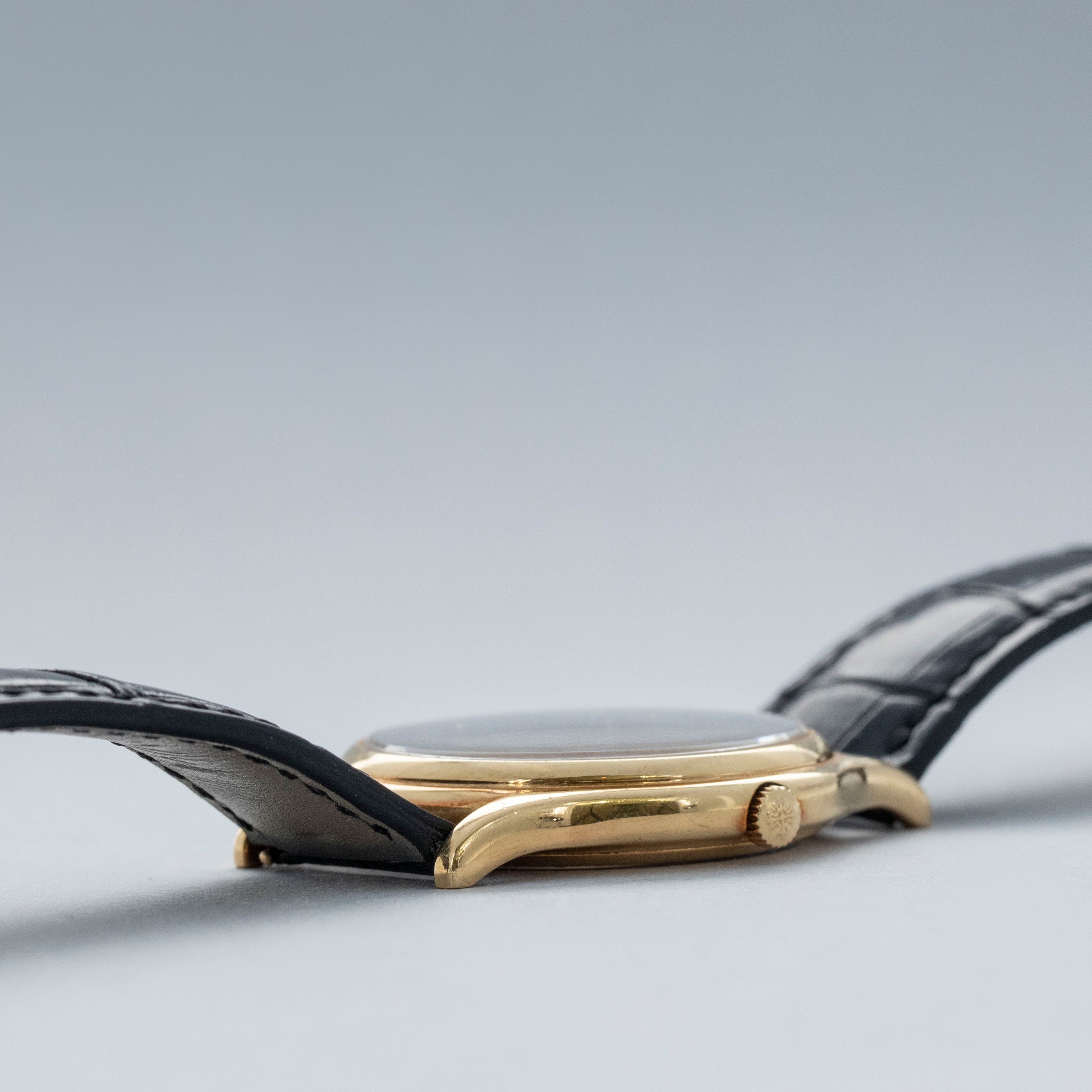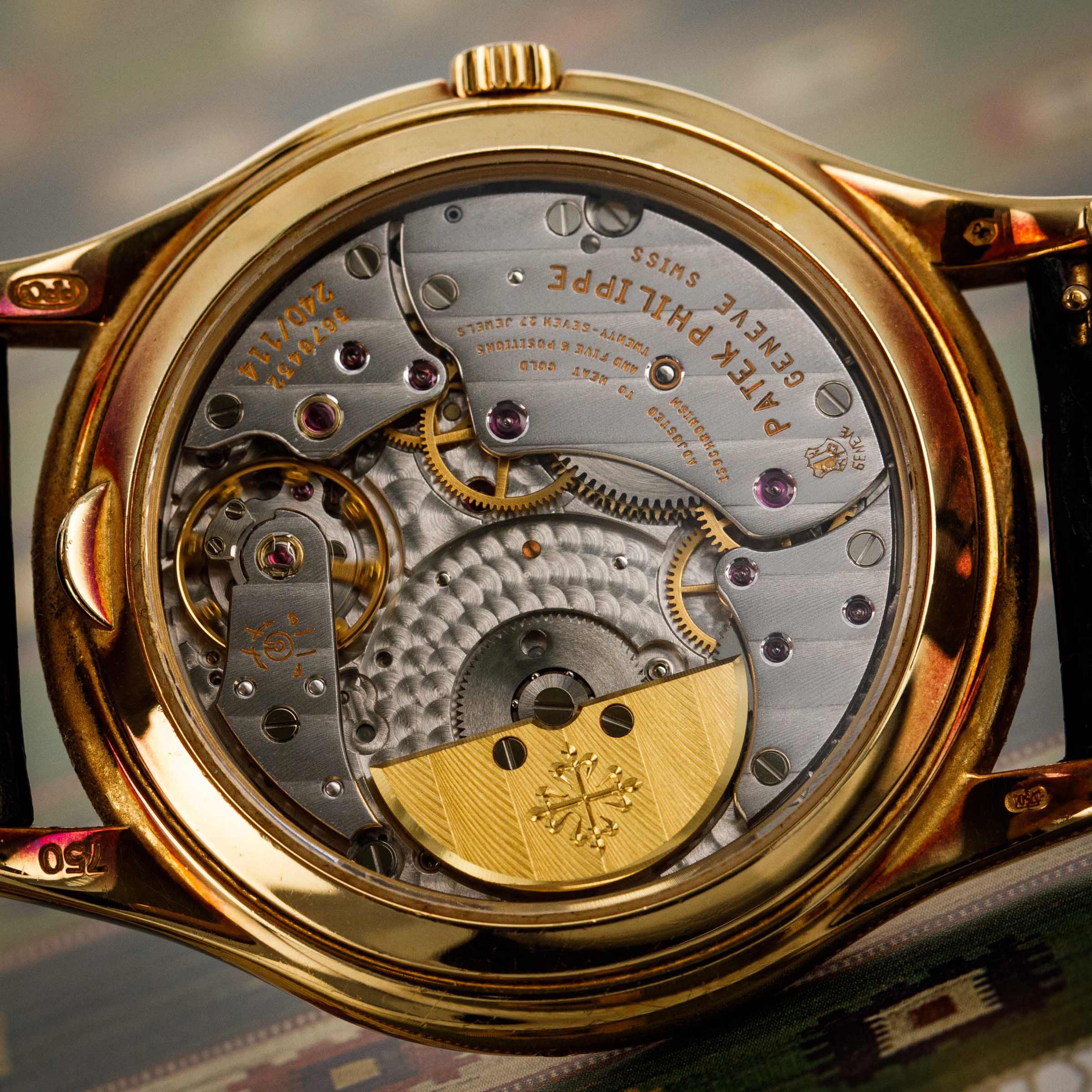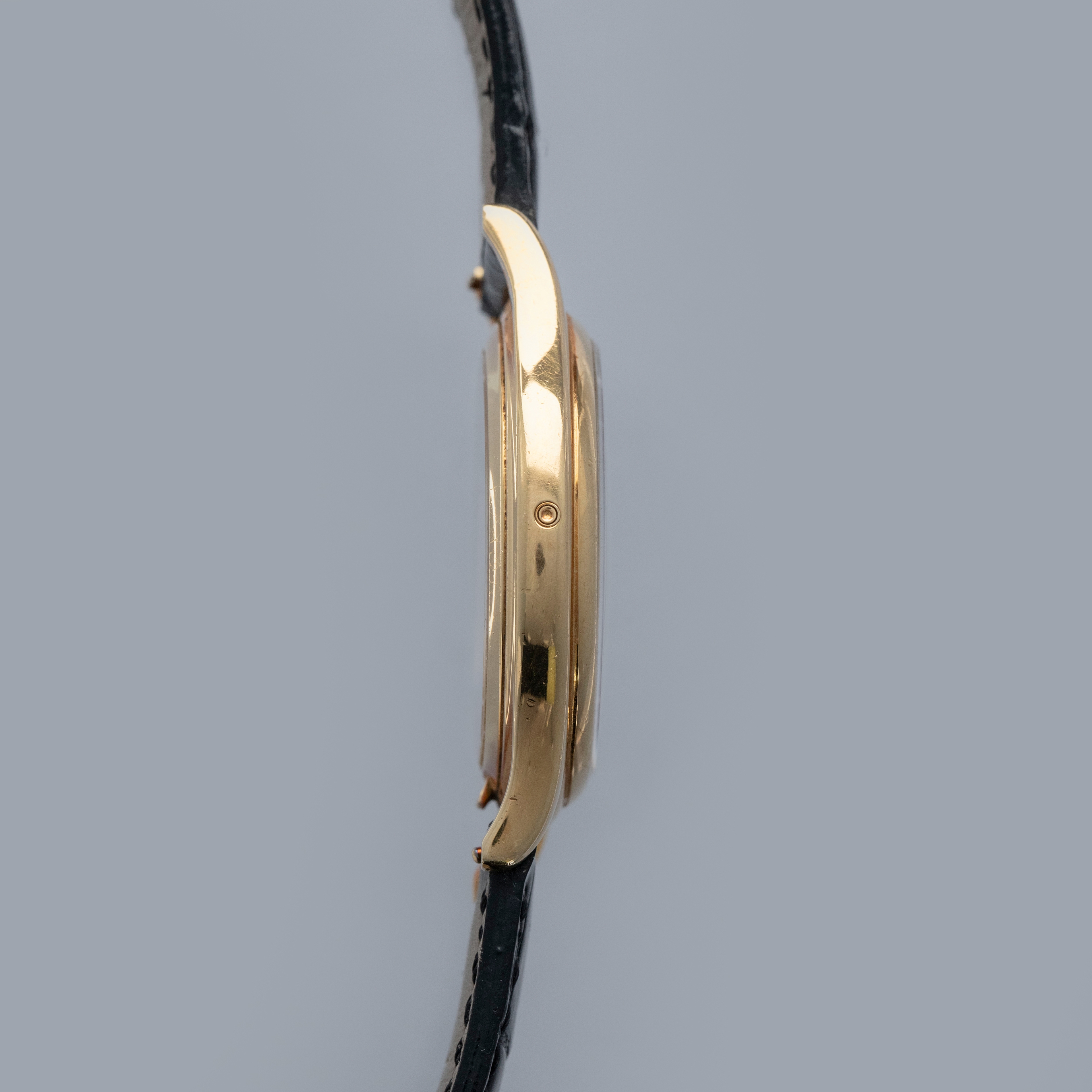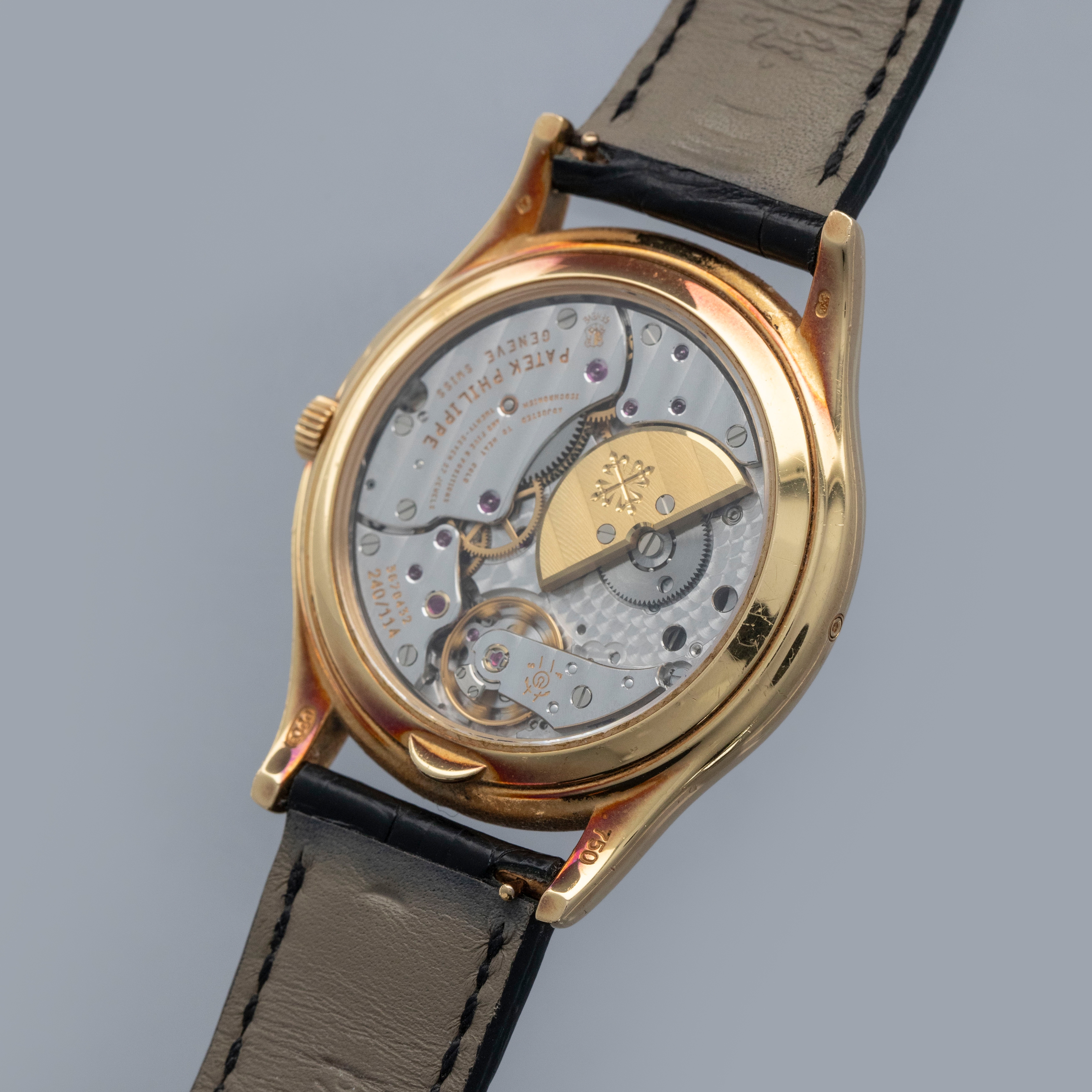 Watch is in very good overall condition. Case shows signs of wear on the case, with surface marks and scratches visible. Lugs and bezel show some softness along the edges as well. There is a nice warm rainbow patina that has developed along the 12 o'clock side of the bezel and along the caseback edges. Hallmarks on back of lugs are full and legible. Dial is near-mint, and shows little to no signs of aging. Watch comes on a strap with its original PP signed deployant buckle. It shows commensurate age to the rest of the watch.