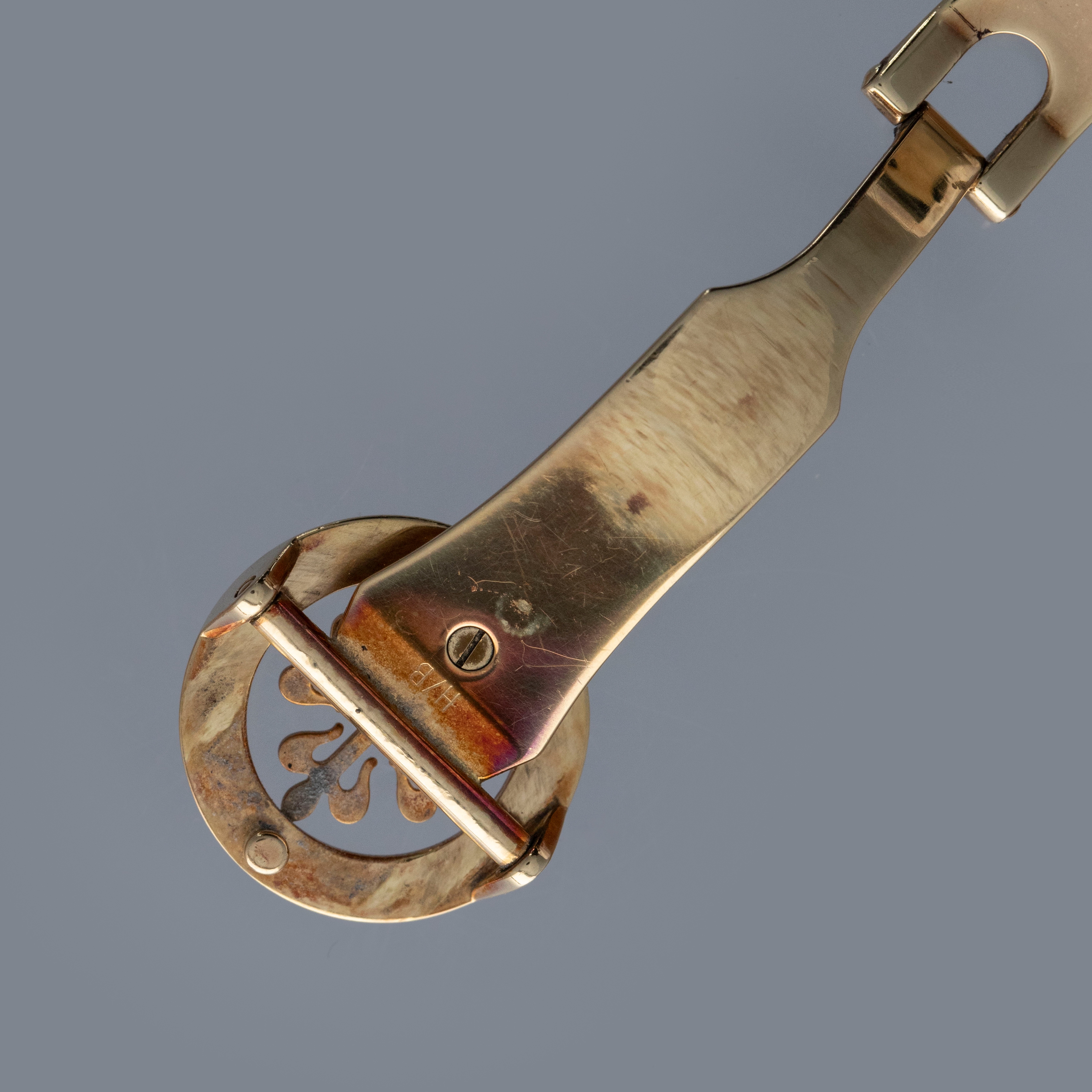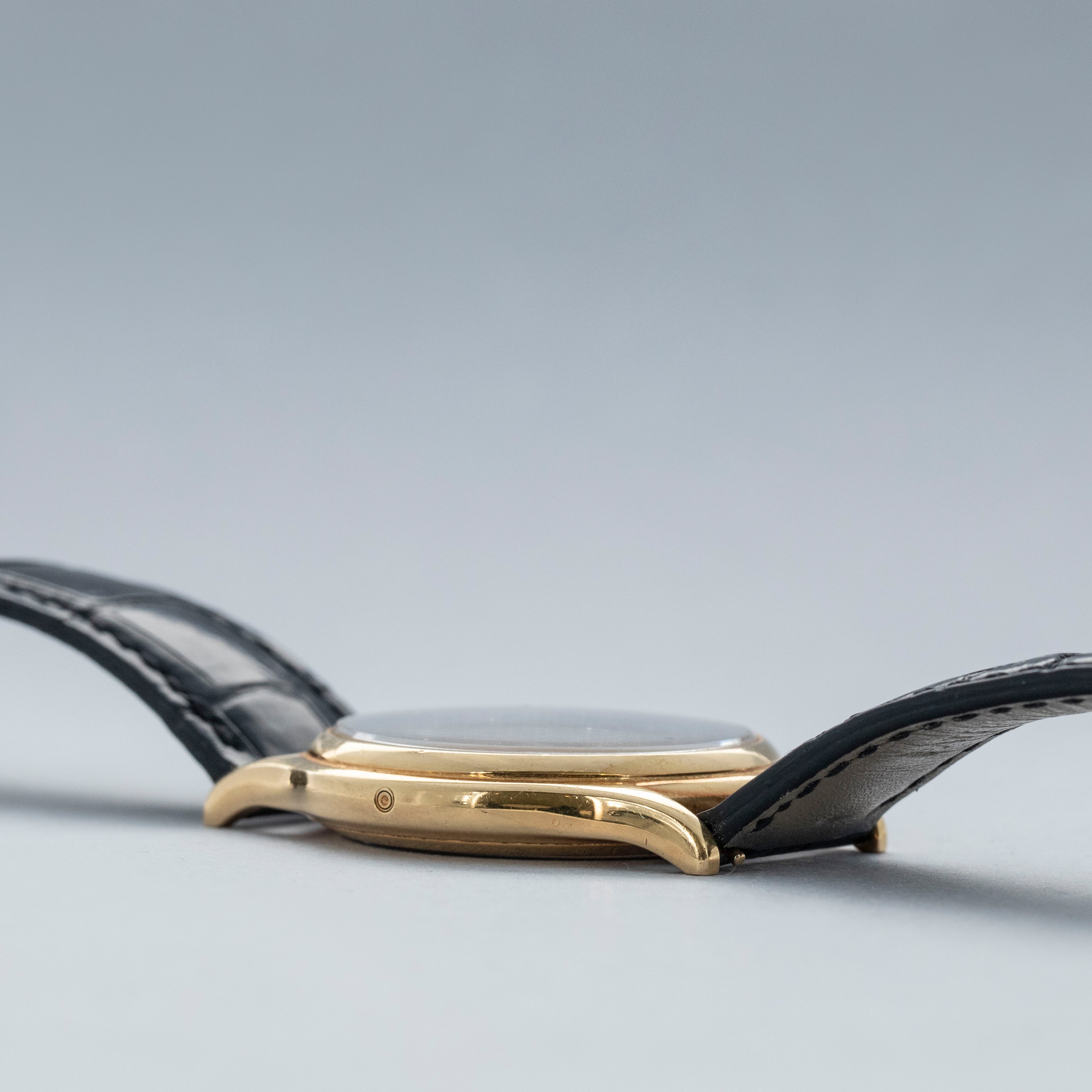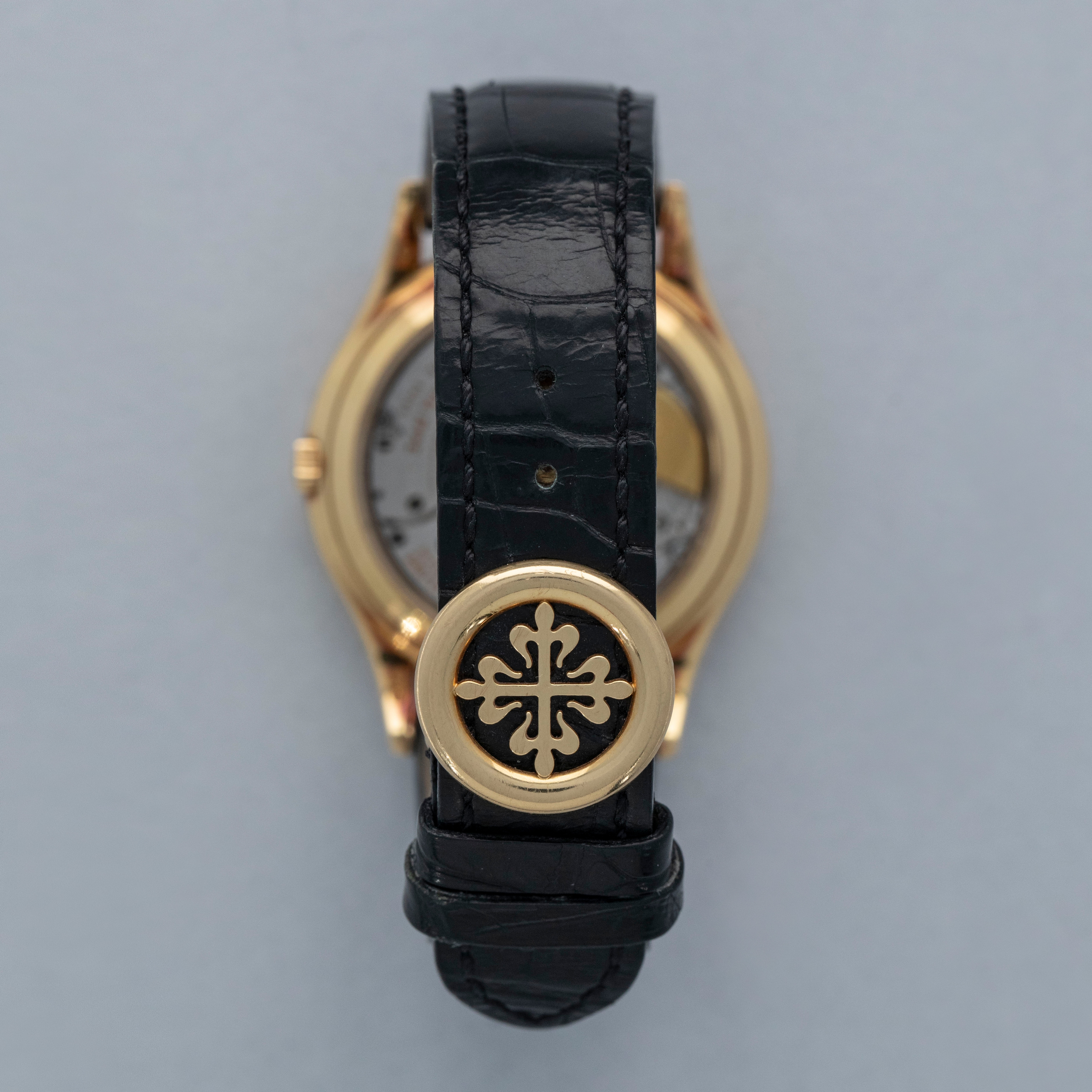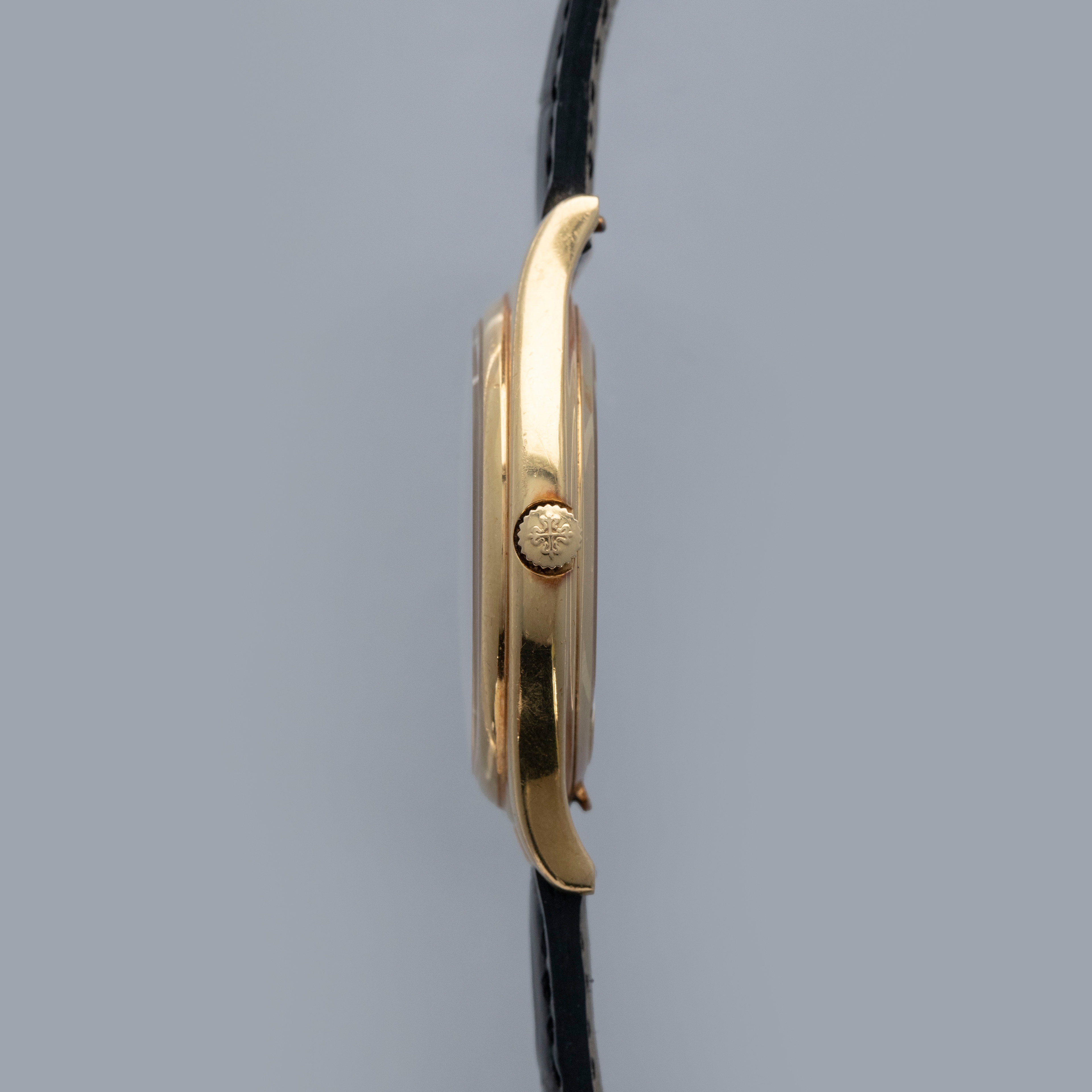 Watch is in very good overall condition. Case shows signs of wear on the case, with surface marks and scratches visible. Lugs and bezel show some softness along the edges as well. There is a nice warm rainbow patina that has developed along the 12 o'clock side of the bezel and along the caseback edges. Hallmarks on back of lugs are full and legible. Dial is near-mint, and shows little to no signs of aging. Watch comes on a strap with its original PP signed deployant buckle. It shows commensurate age to the rest of the watch.