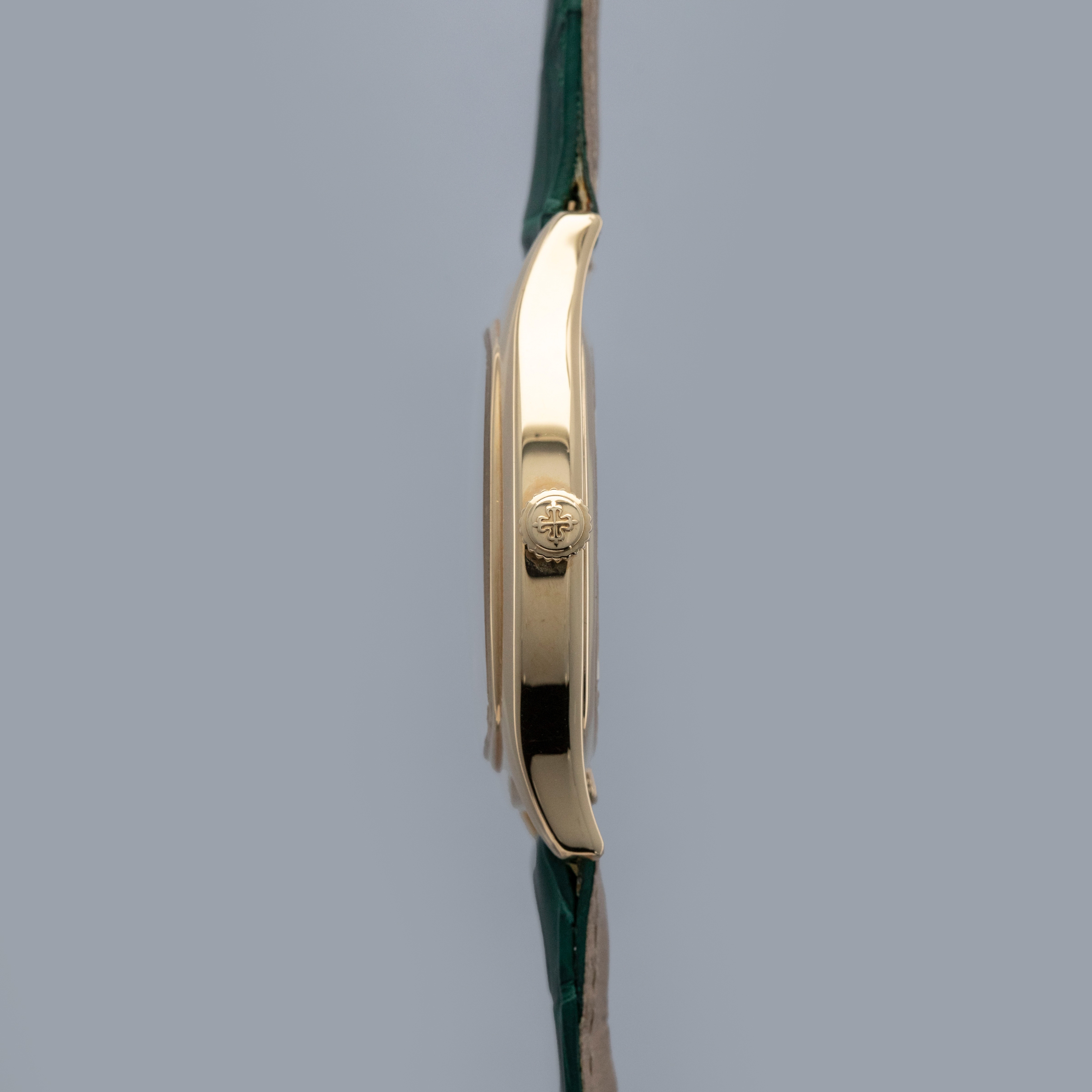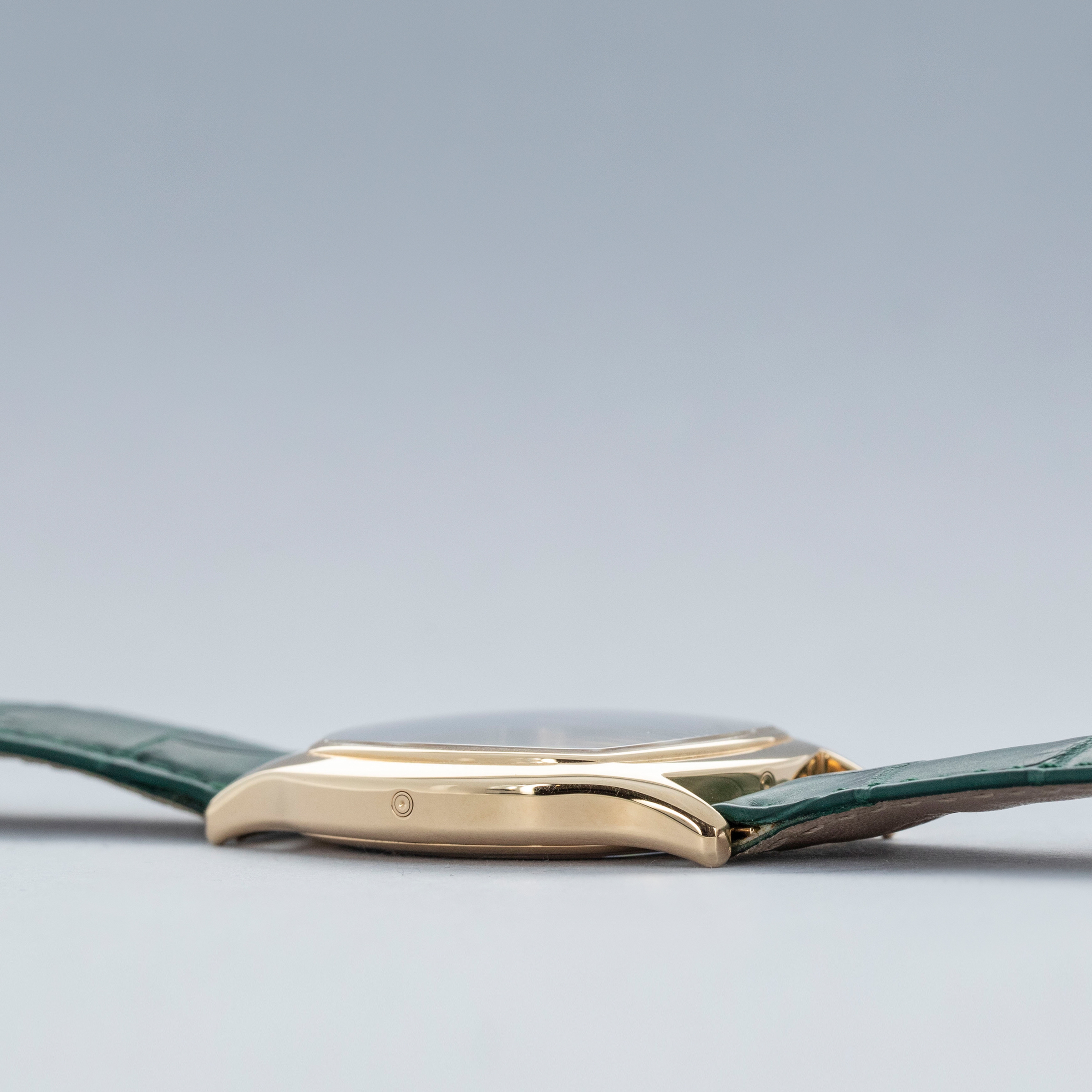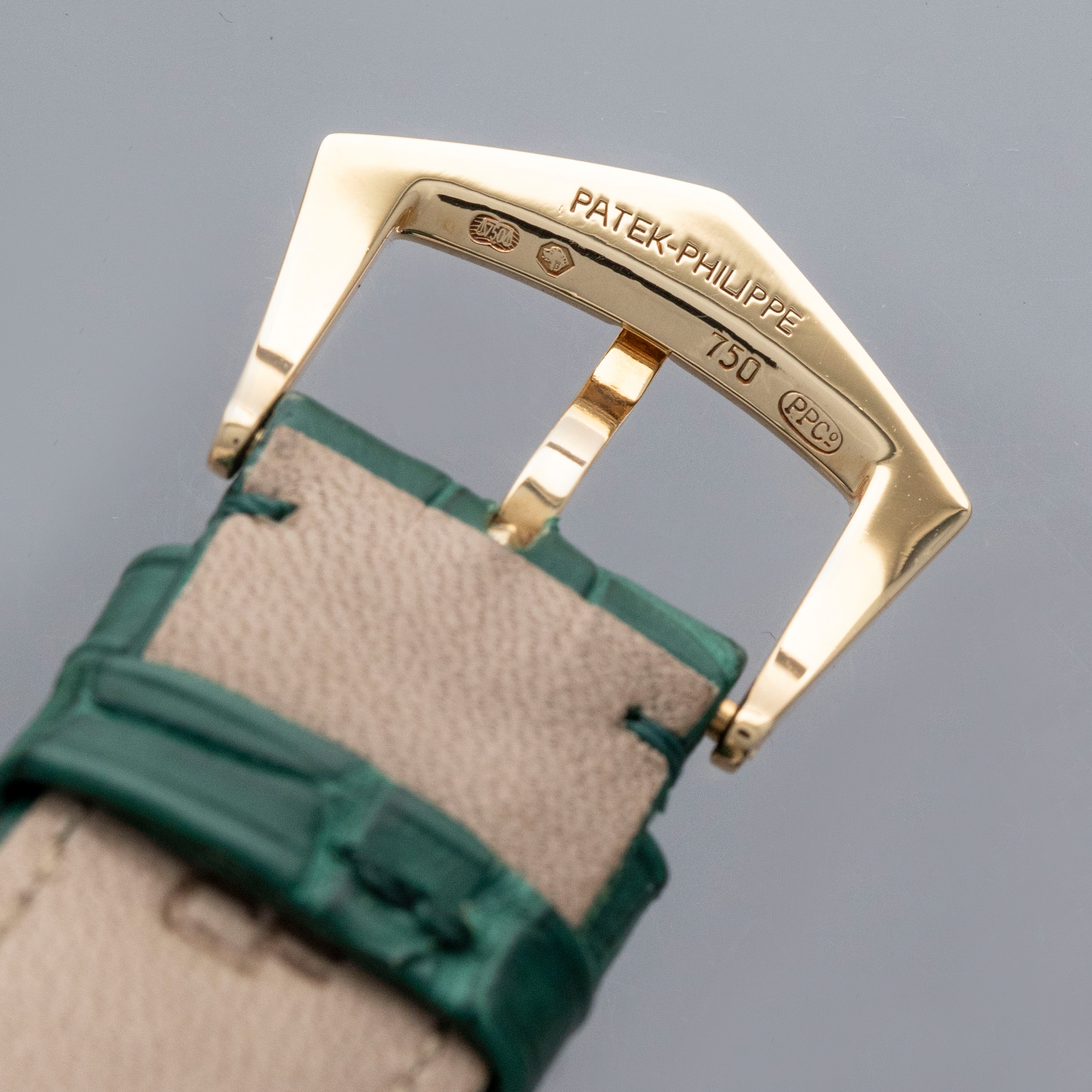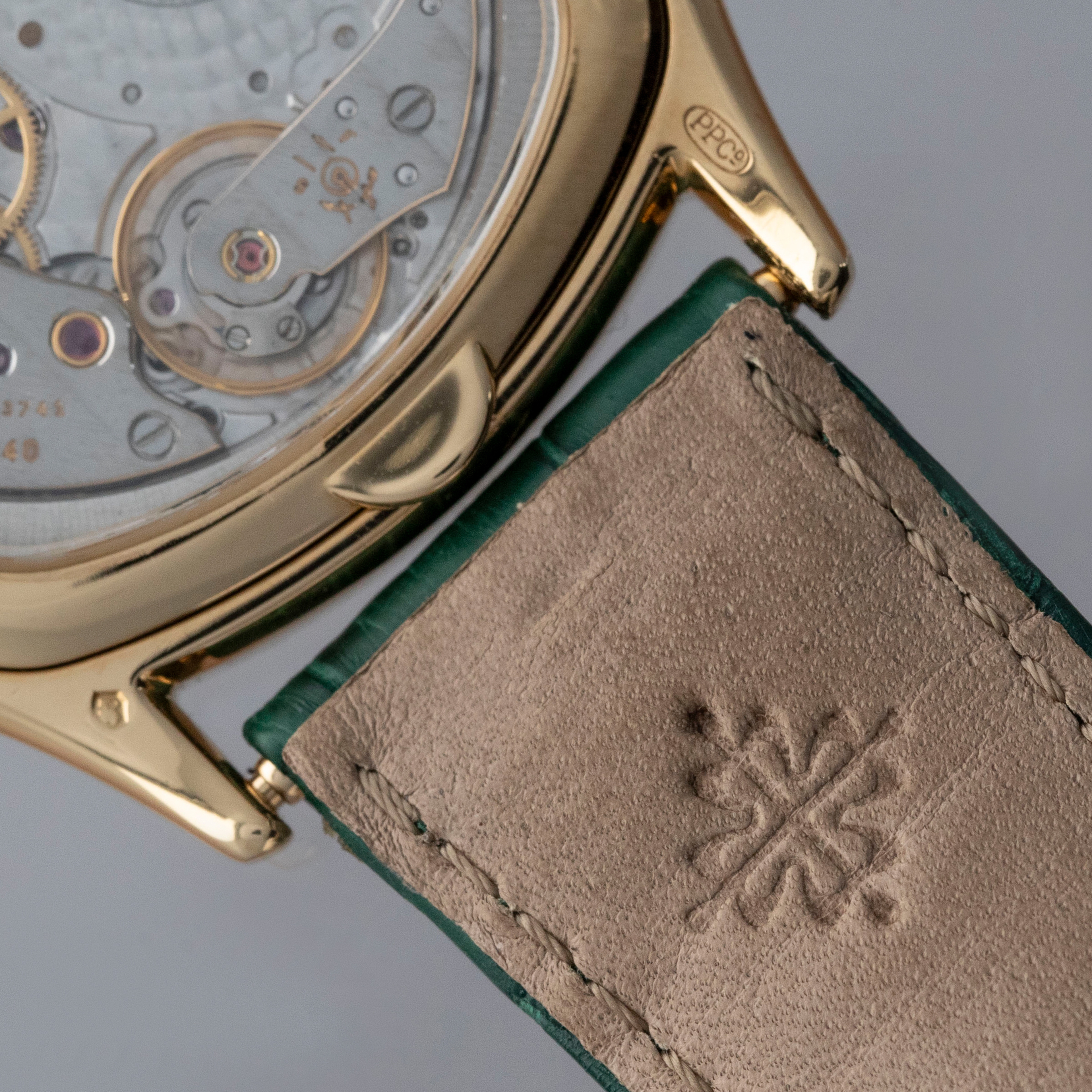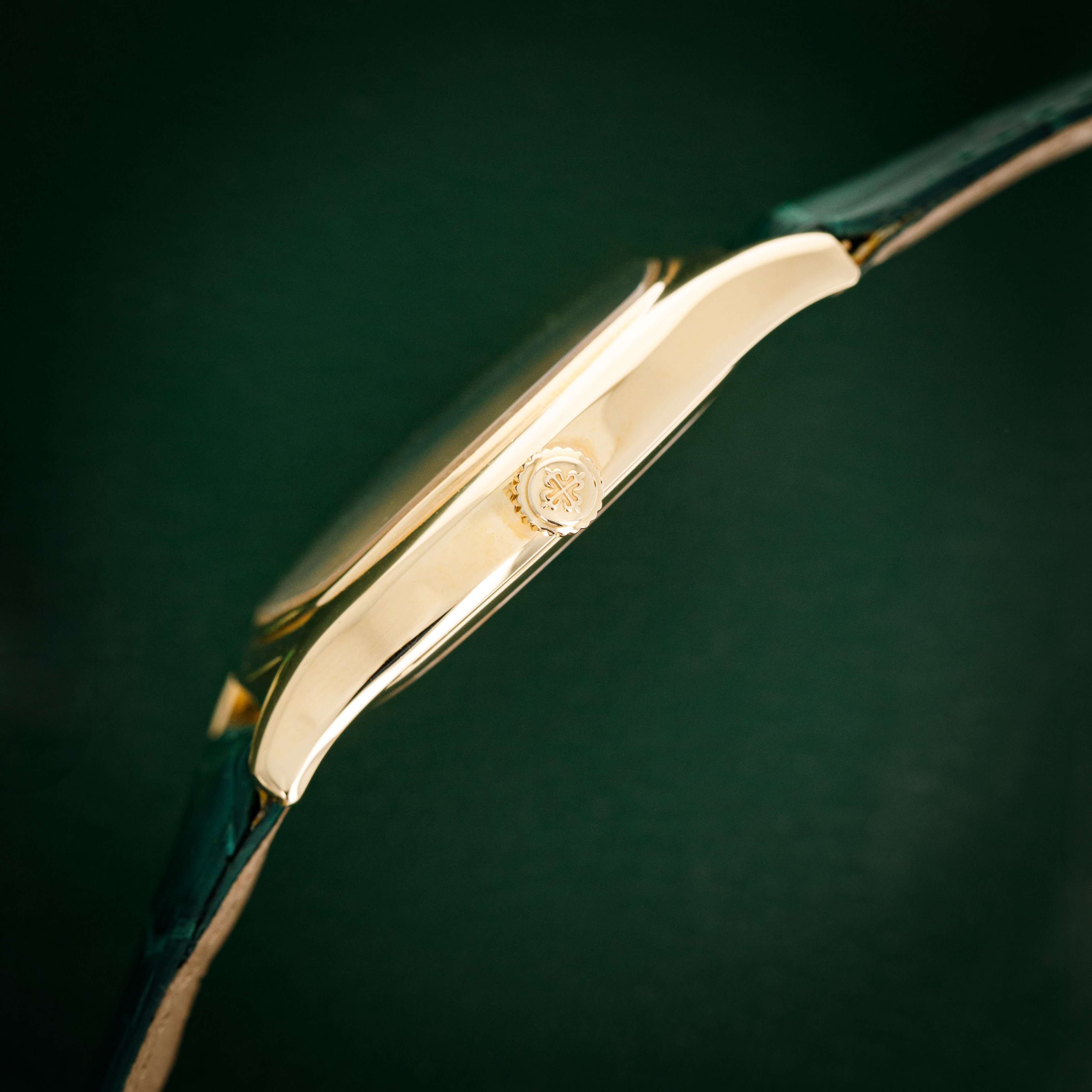 The watch is in overall near-mint condition. The yellow gold case shows a few very light marks and scratches from careful wear, with all hallmarks and stamps on the rear lugs remaining crisp. The Calatrava cross-embossed crown is in near-mint condition, and the dial and hands are like new. The watch is fitted with its original green Patek alligator strap, which appears slightly narrower than standard, and a yellow gold Patek pin buckle in near-mint condition. It retains its original gold easy-release spring bars and comes complete with inner and outer boxes, original certificate, and leather wallet.