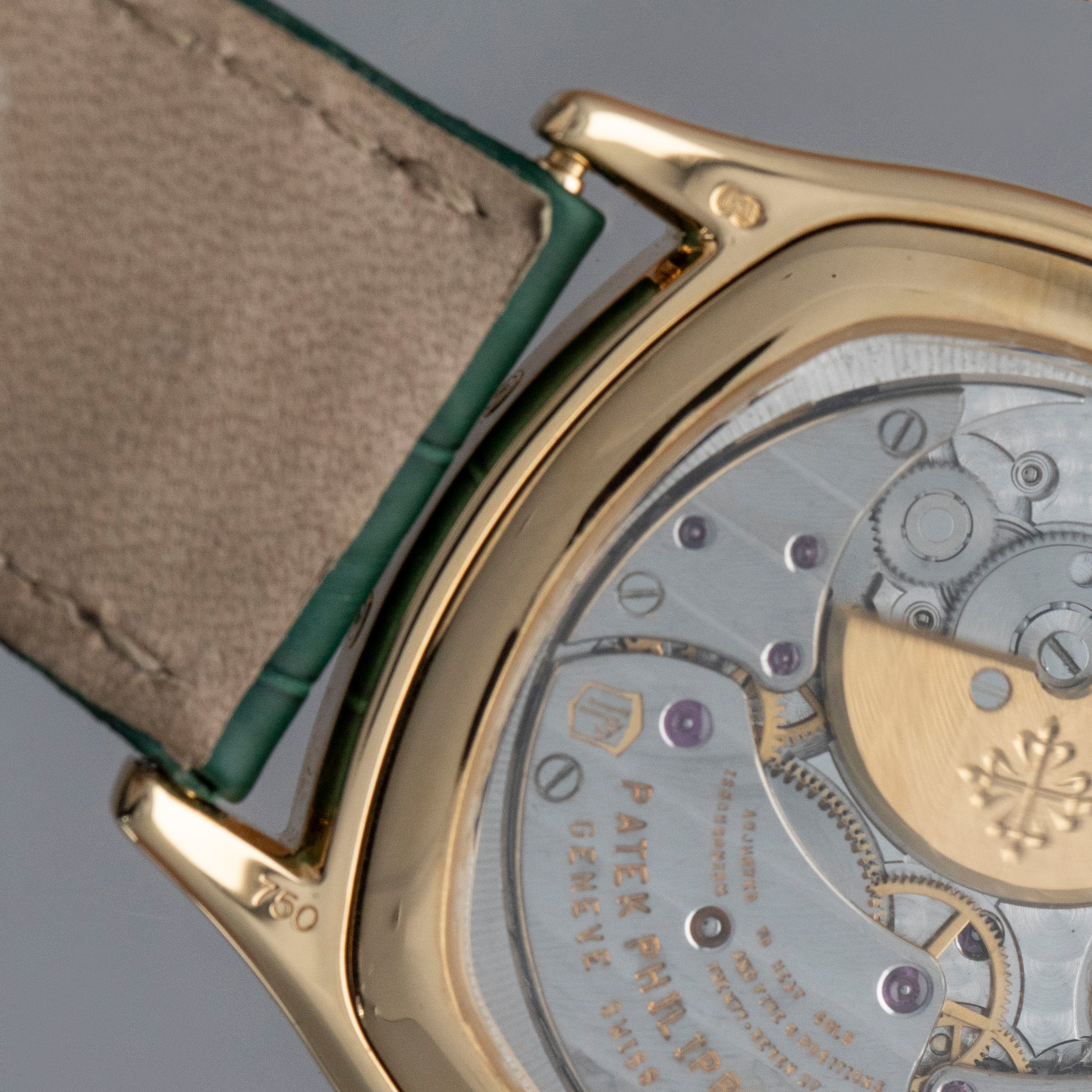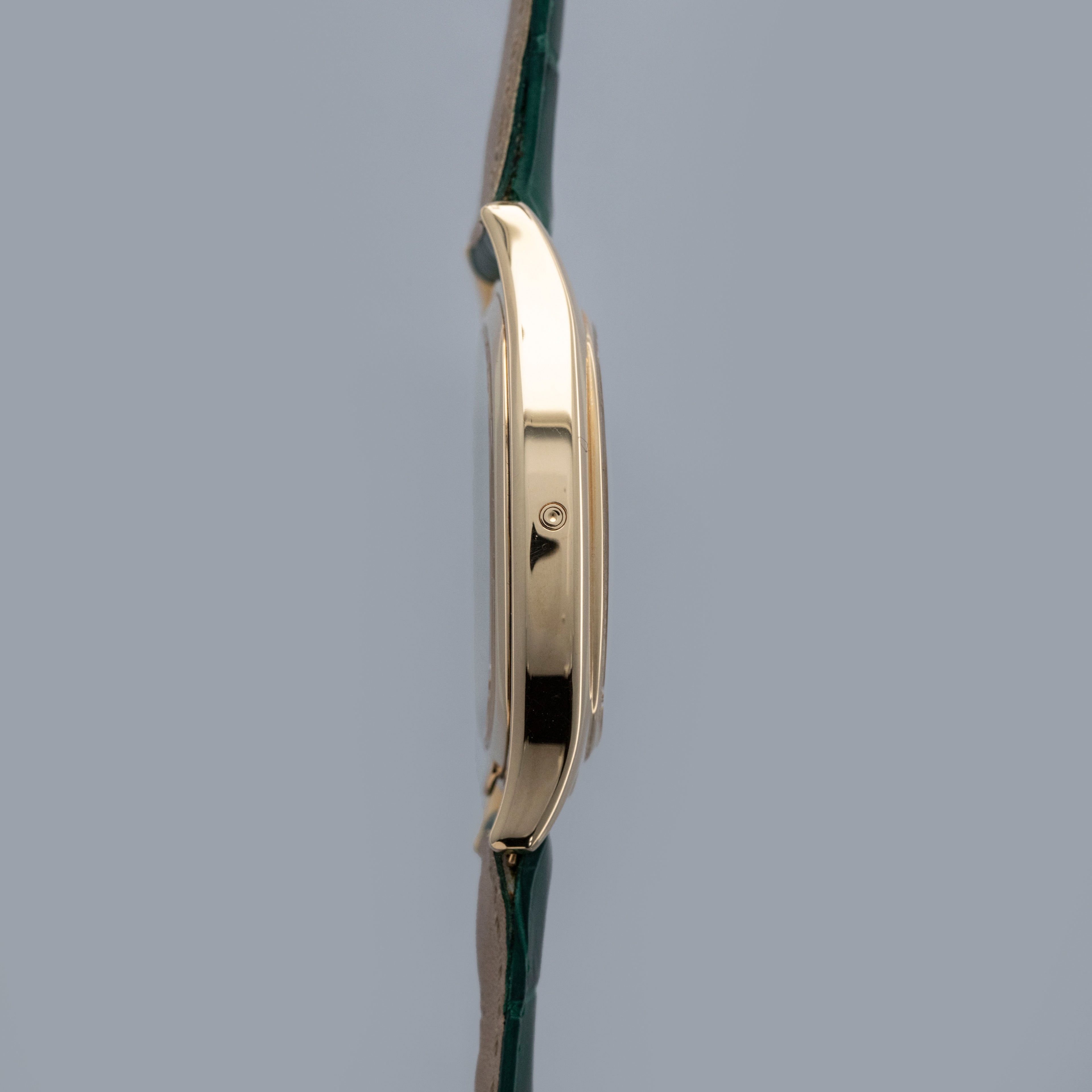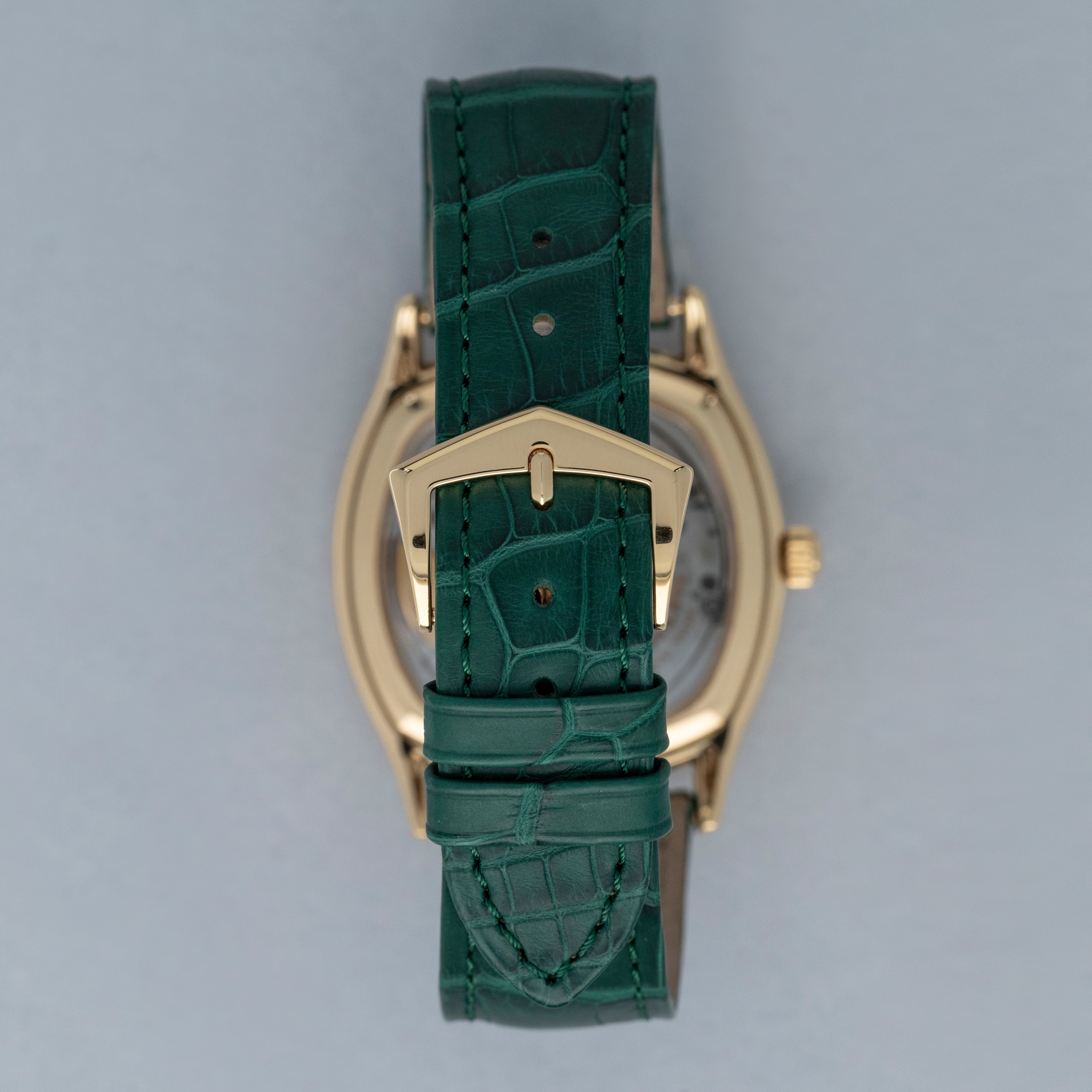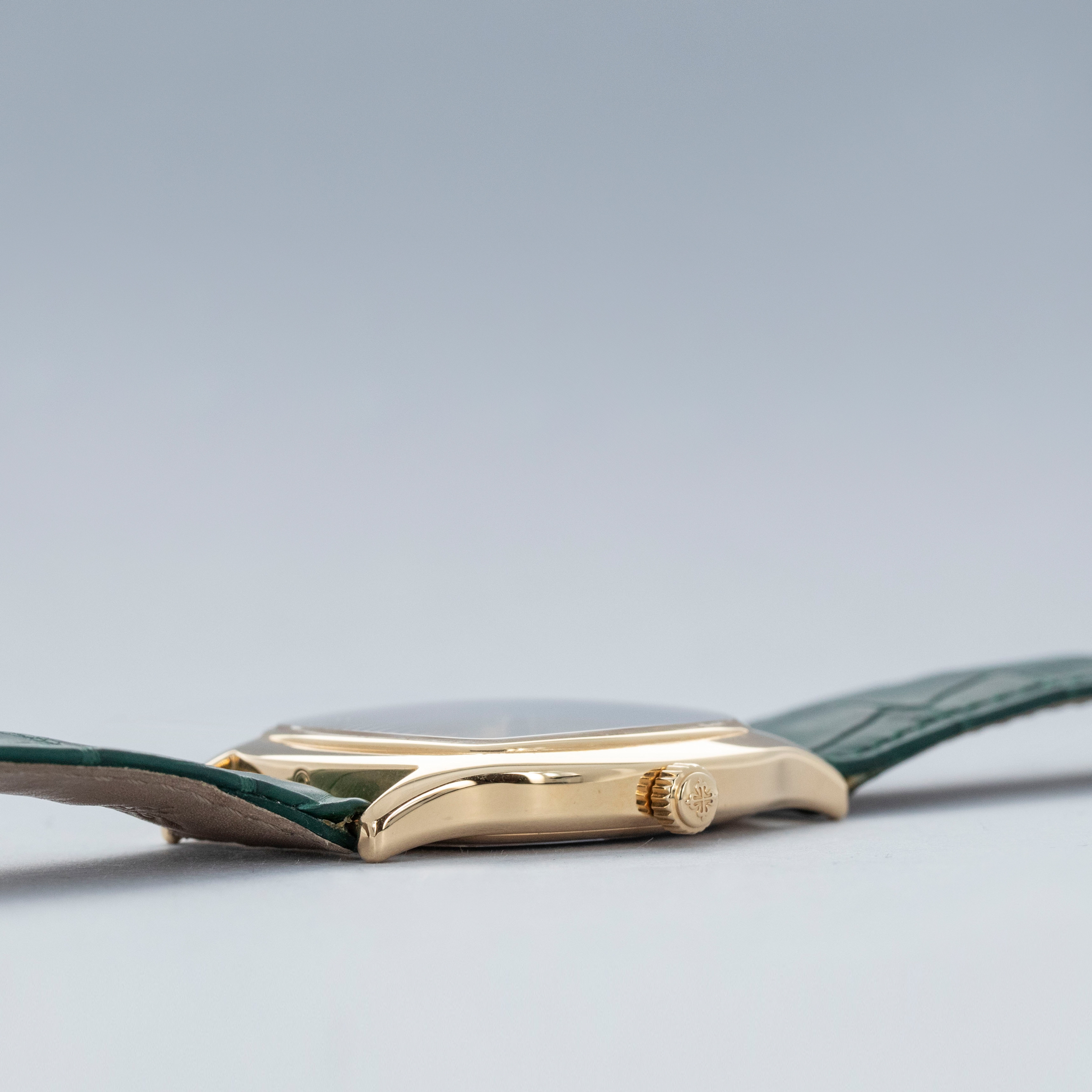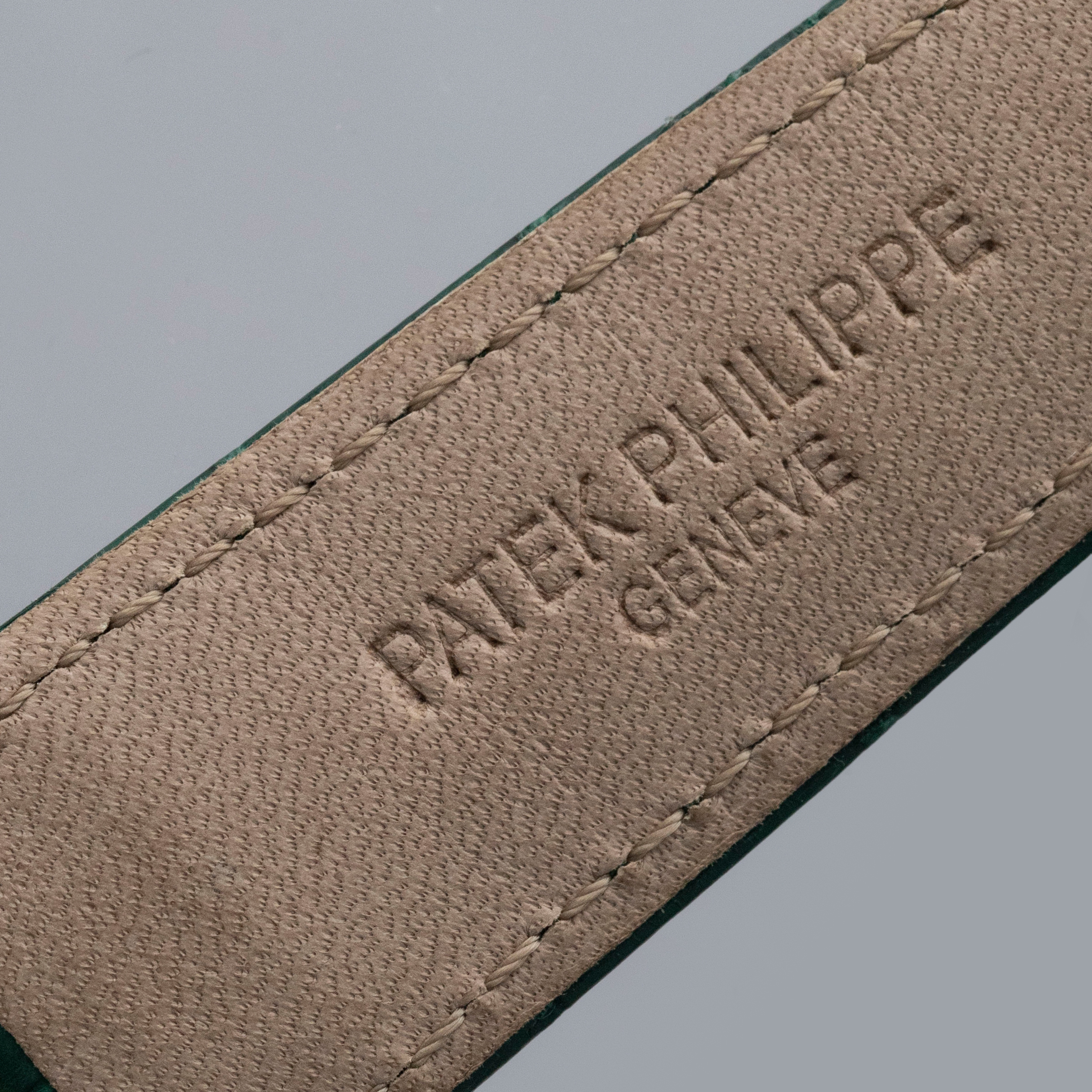 The watch is in overall near-mint condition. The yellow gold case shows a few very light marks and scratches from careful wear, with all hallmarks and stamps on the rear lugs remaining crisp. The Calatrava cross-embossed crown is in near-mint condition, and the dial and hands are like new. The watch is fitted with its original green Patek alligator strap, which appears slightly narrower than standard, and a yellow gold Patek pin buckle in near-mint condition. It retains its original gold easy-release spring bars and comes complete with inner and outer boxes, original certificate, and leather wallet.