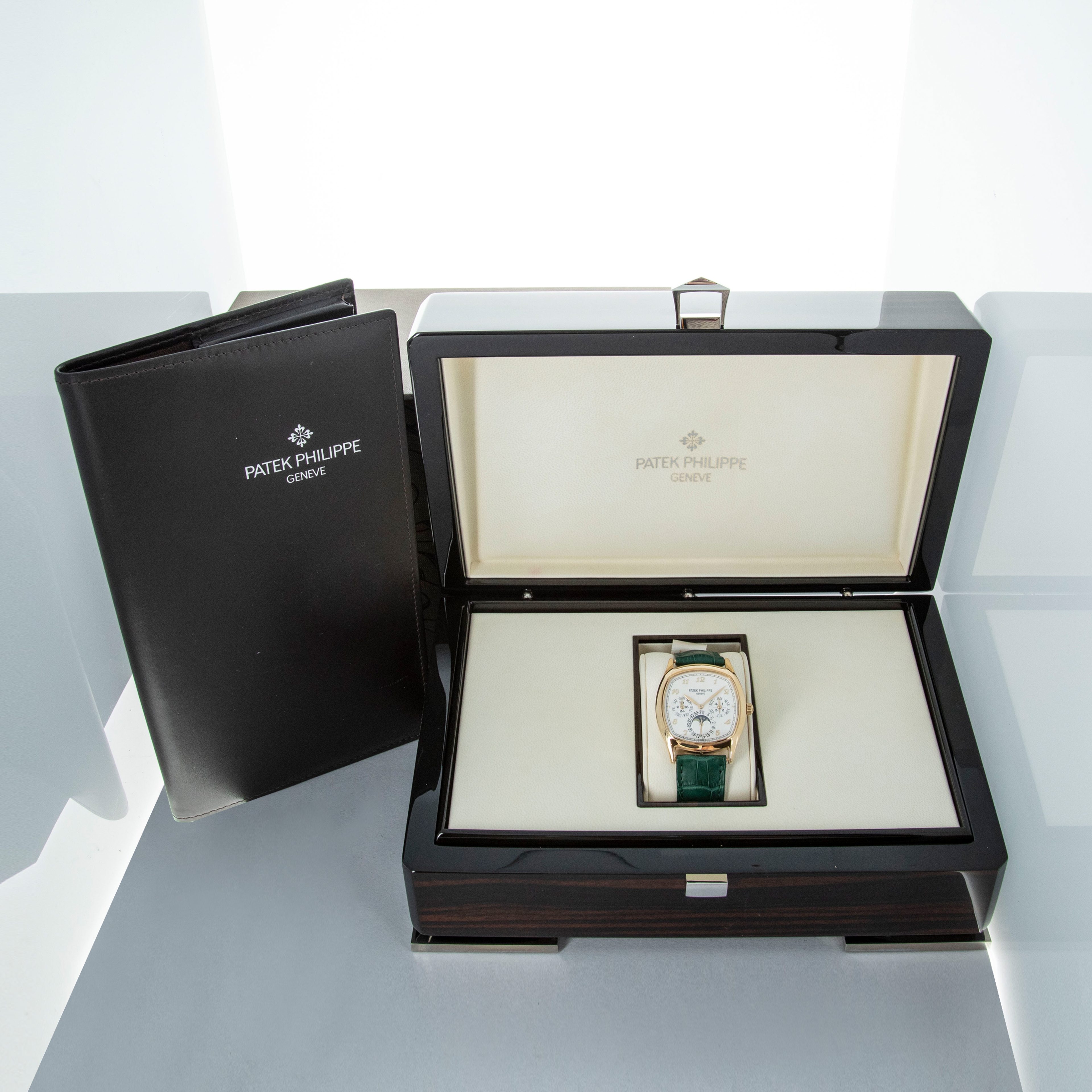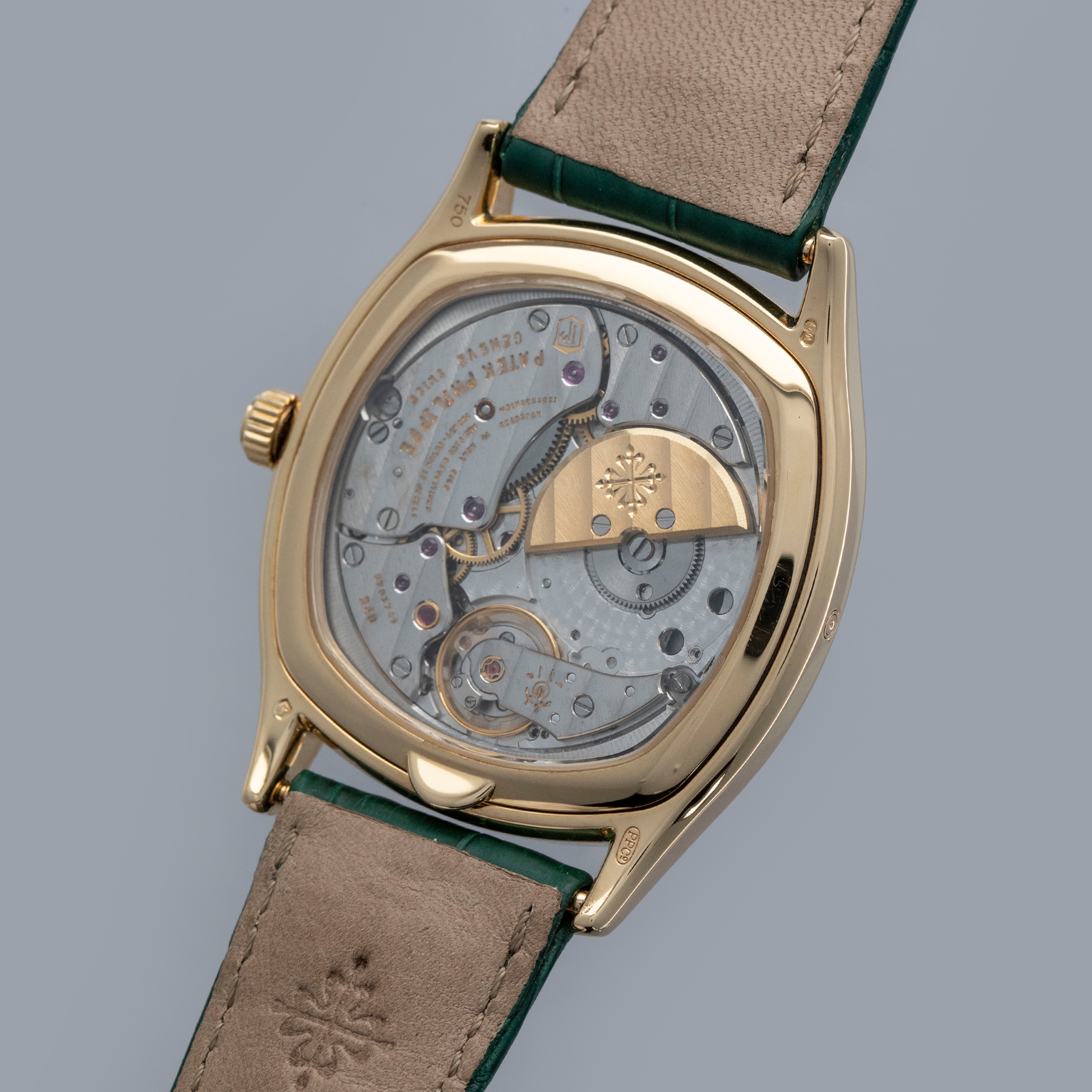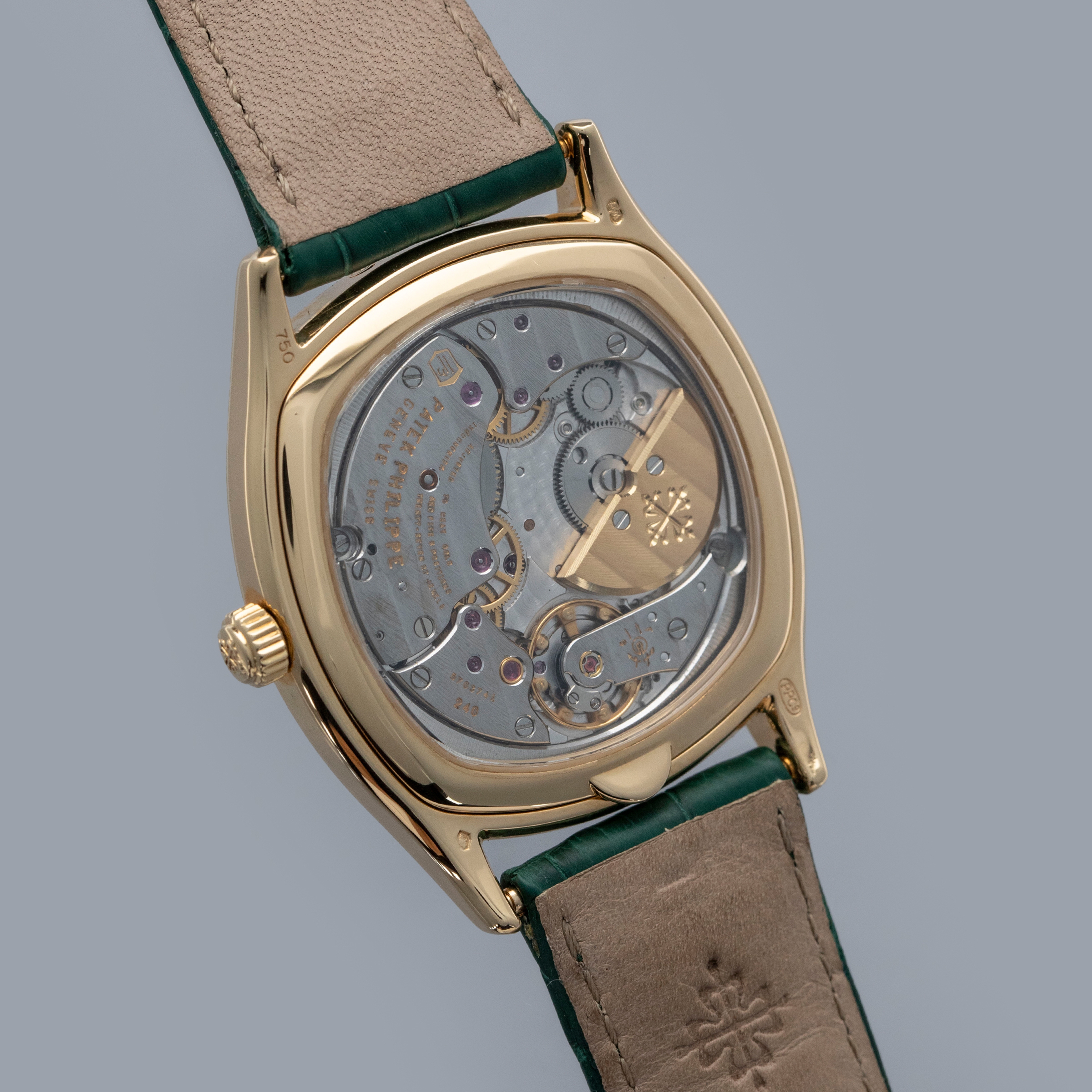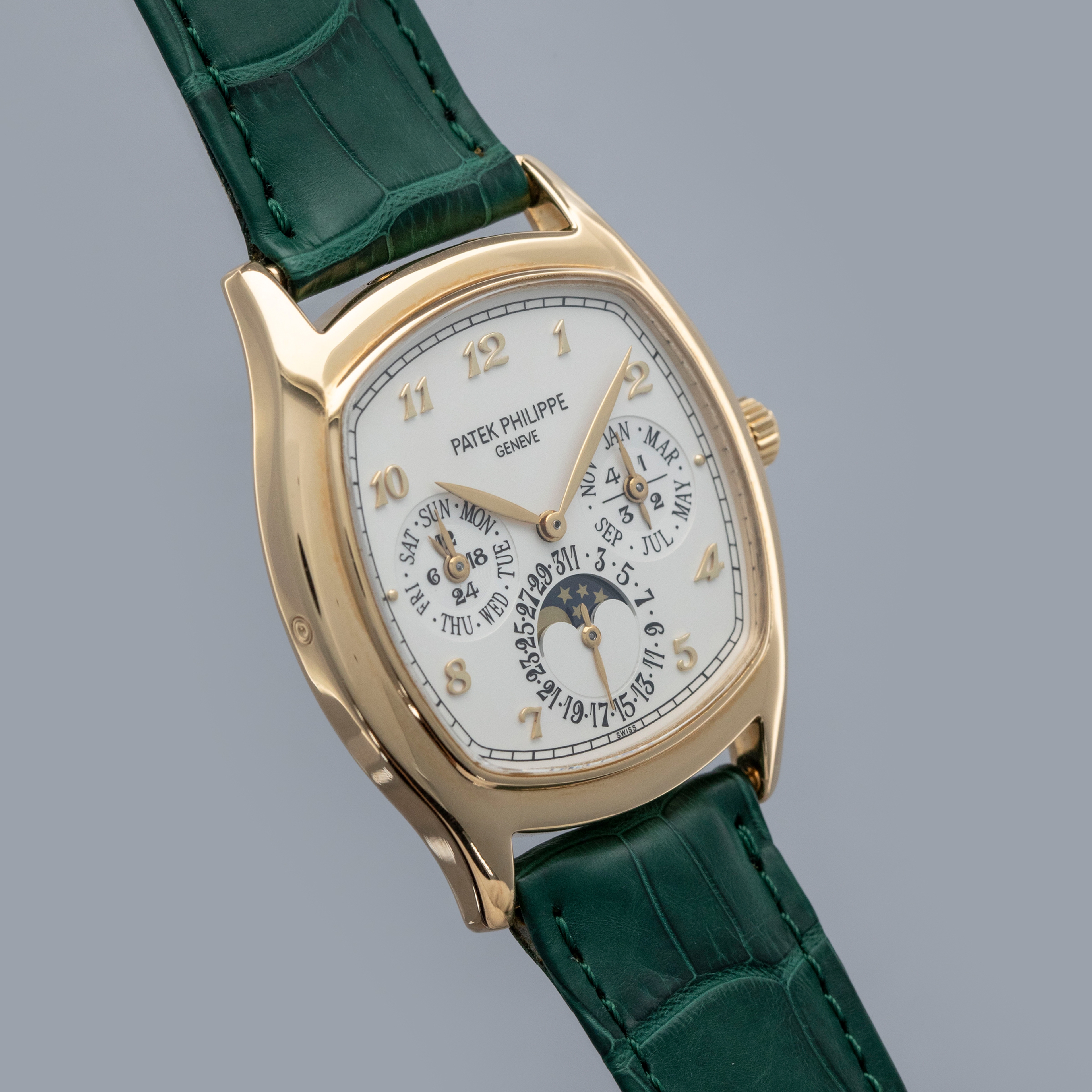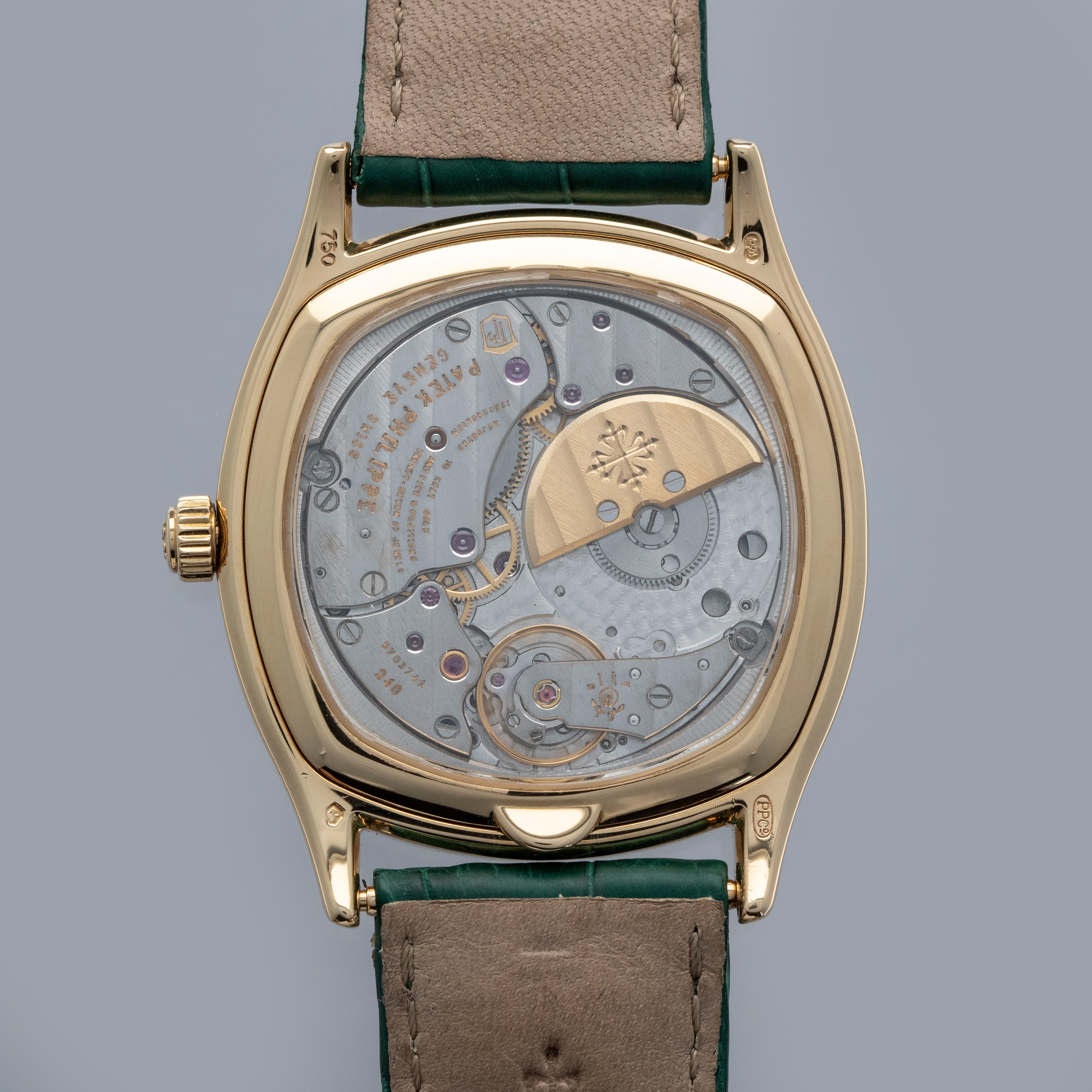 The watch is in overall near-mint condition. The yellow gold case shows a few very light marks and scratches from careful wear, with all hallmarks and stamps on the rear lugs remaining crisp. The Calatrava cross-embossed crown is in near-mint condition, and the dial and hands are like new. The watch is fitted with its original green Patek alligator strap, which appears slightly narrower than standard, and a yellow gold Patek pin buckle in near-mint condition. It retains its original gold easy-release spring bars and comes complete with inner and outer boxes, original certificate, and leather wallet.