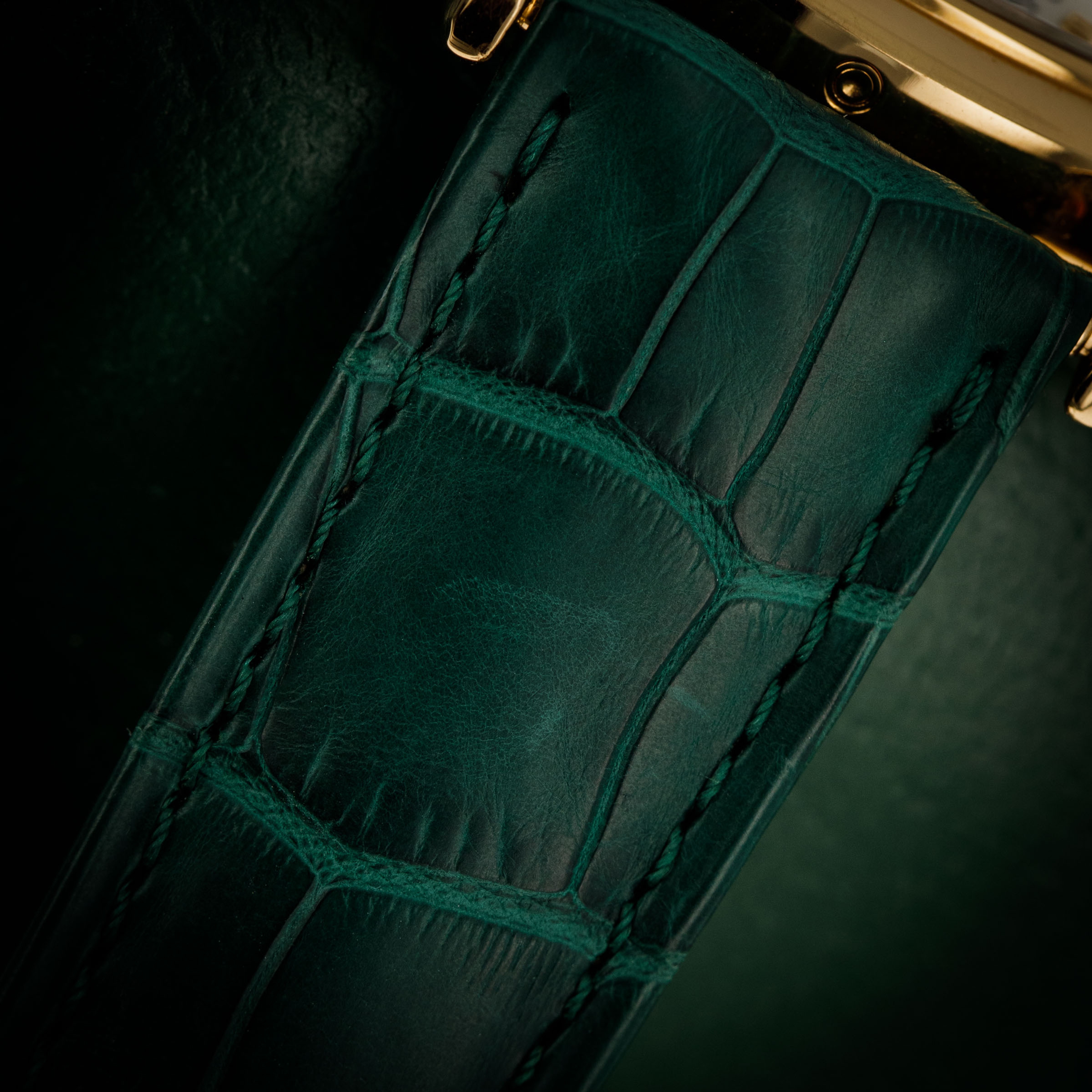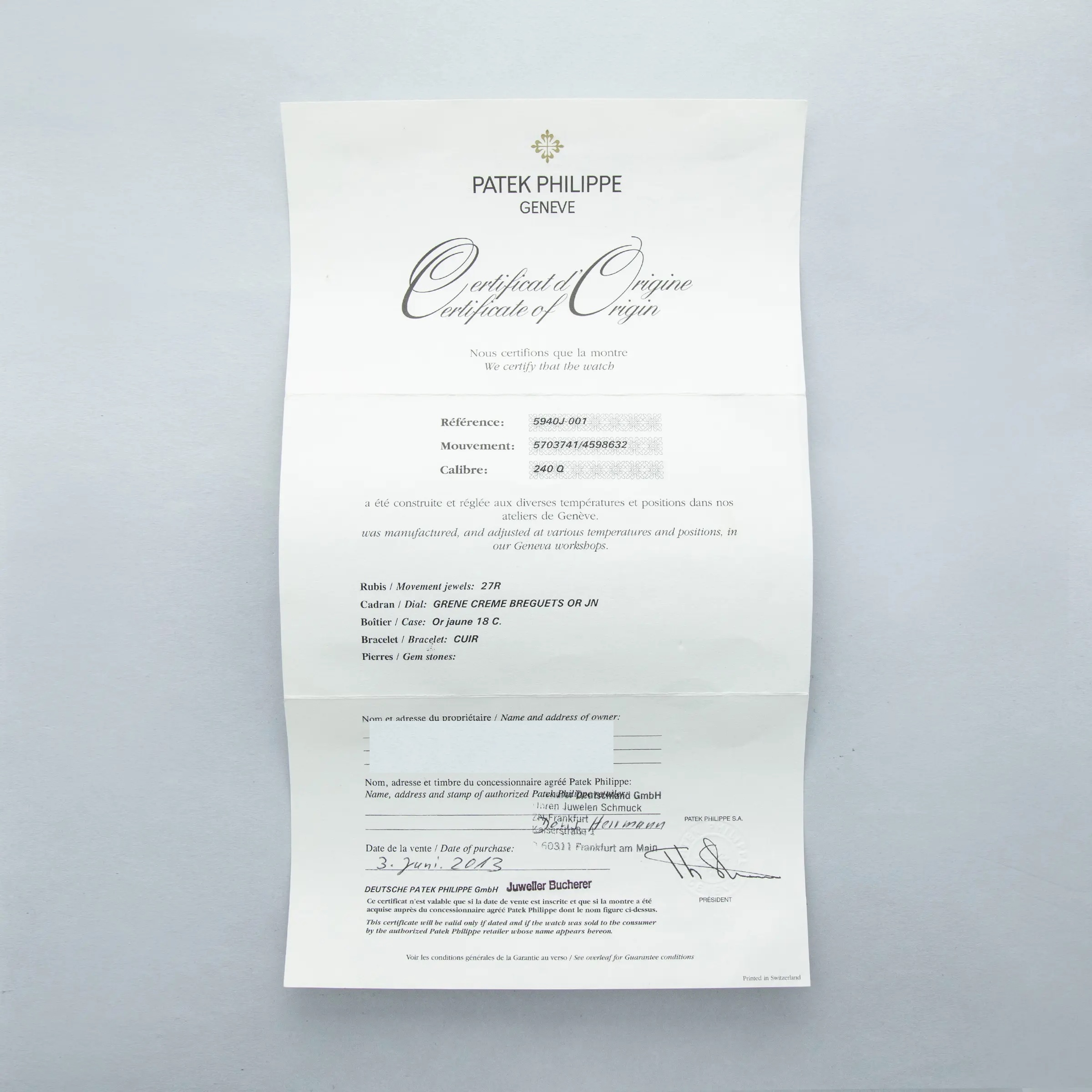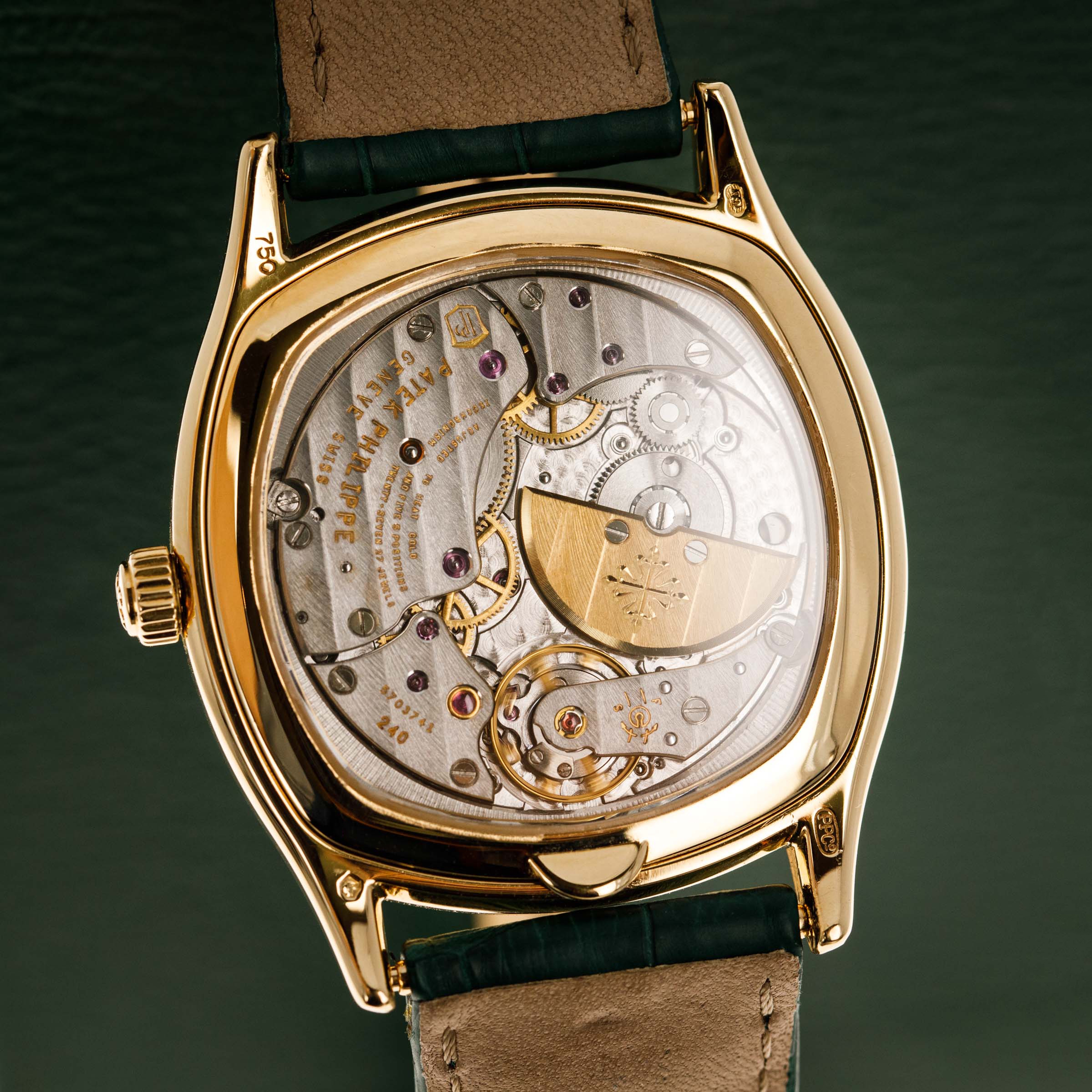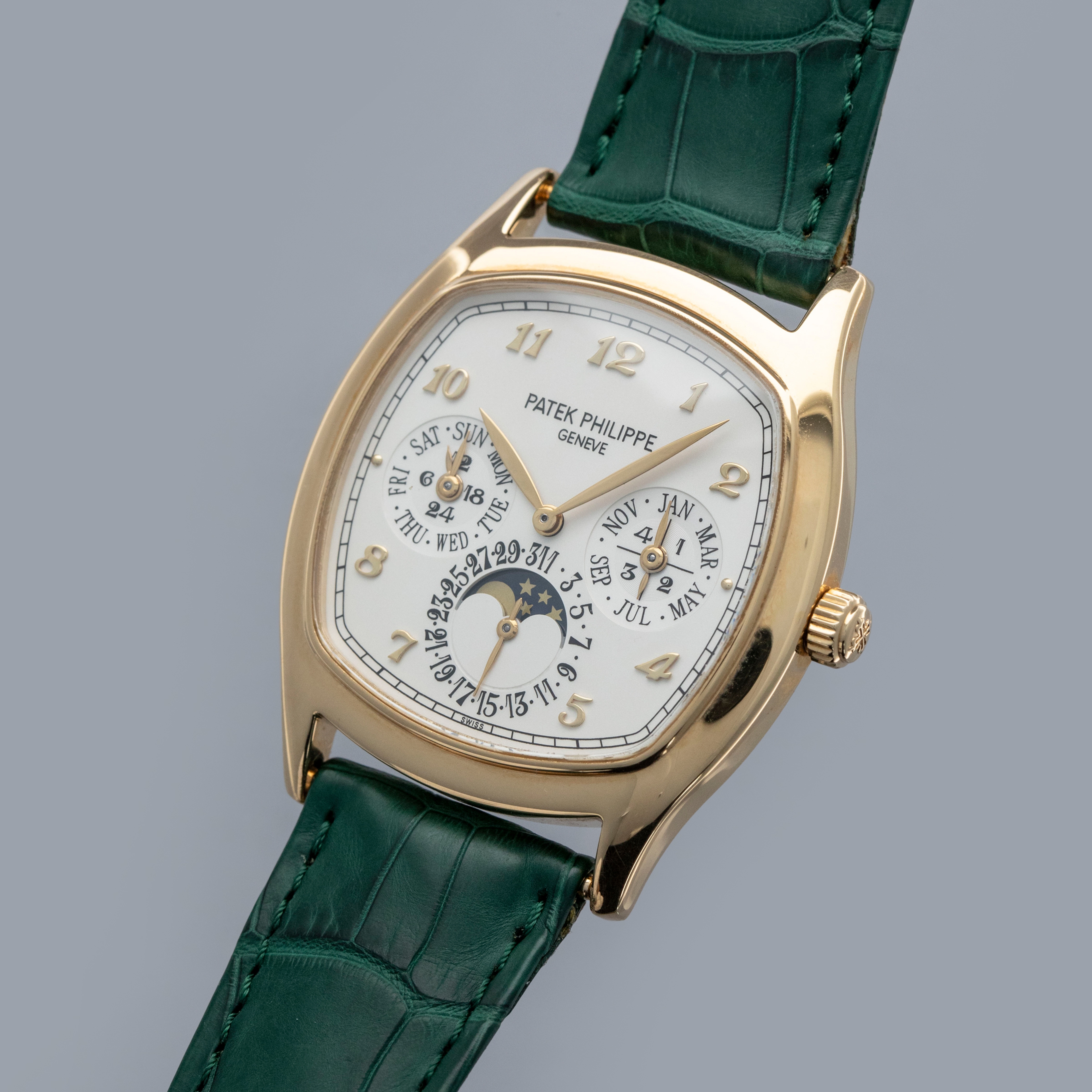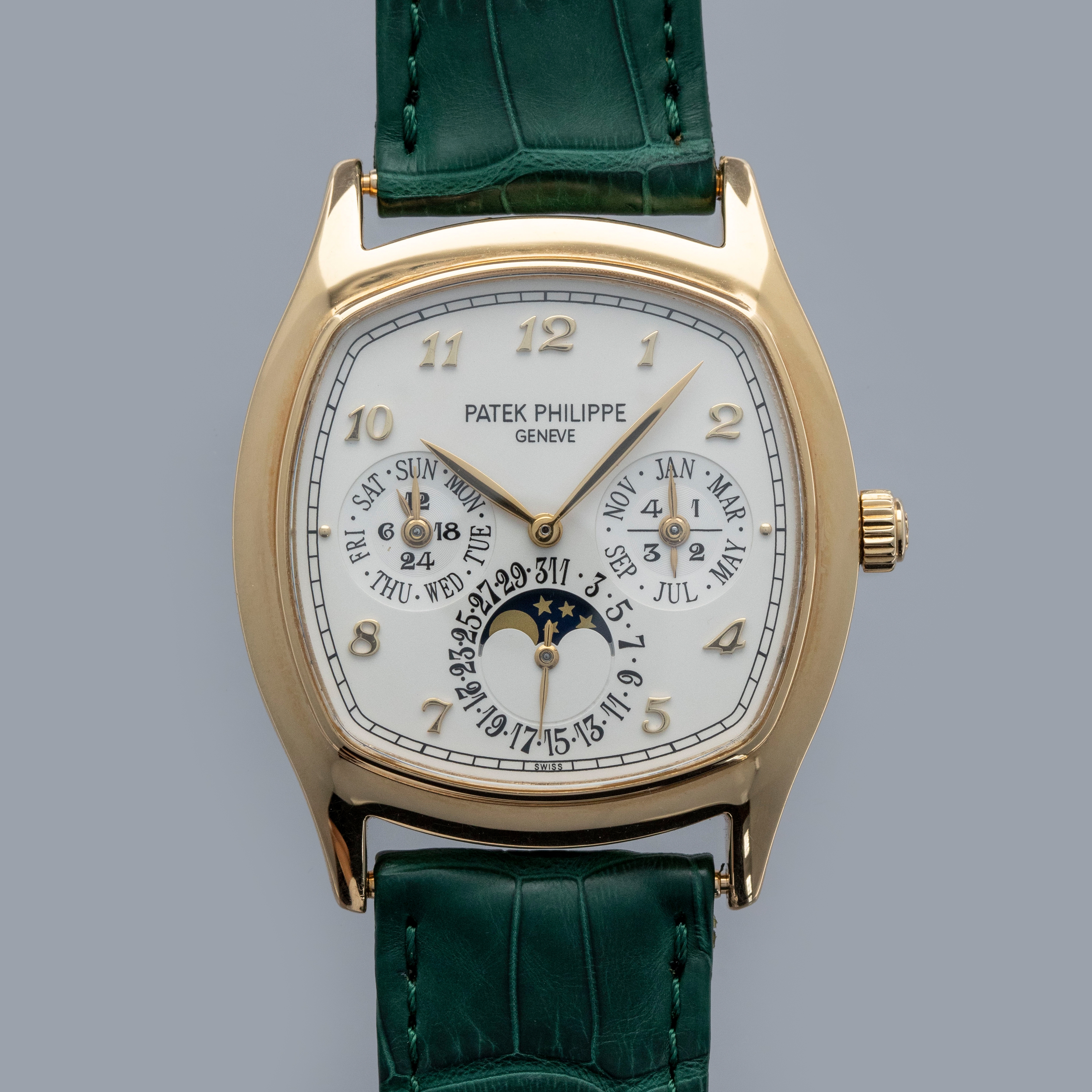 The watch is in overall near-mint condition. The yellow gold case shows a few very light marks and scratches from careful wear, with all hallmarks and stamps on the rear lugs remaining crisp. The Calatrava cross-embossed crown is in near-mint condition, and the dial and hands are like new. The watch is fitted with its original green Patek alligator strap, which appears slightly narrower than standard, and a yellow gold Patek pin buckle in near-mint condition. It retains its original gold easy-release spring bars and comes complete with inner and outer boxes, original certificate, and leather wallet.