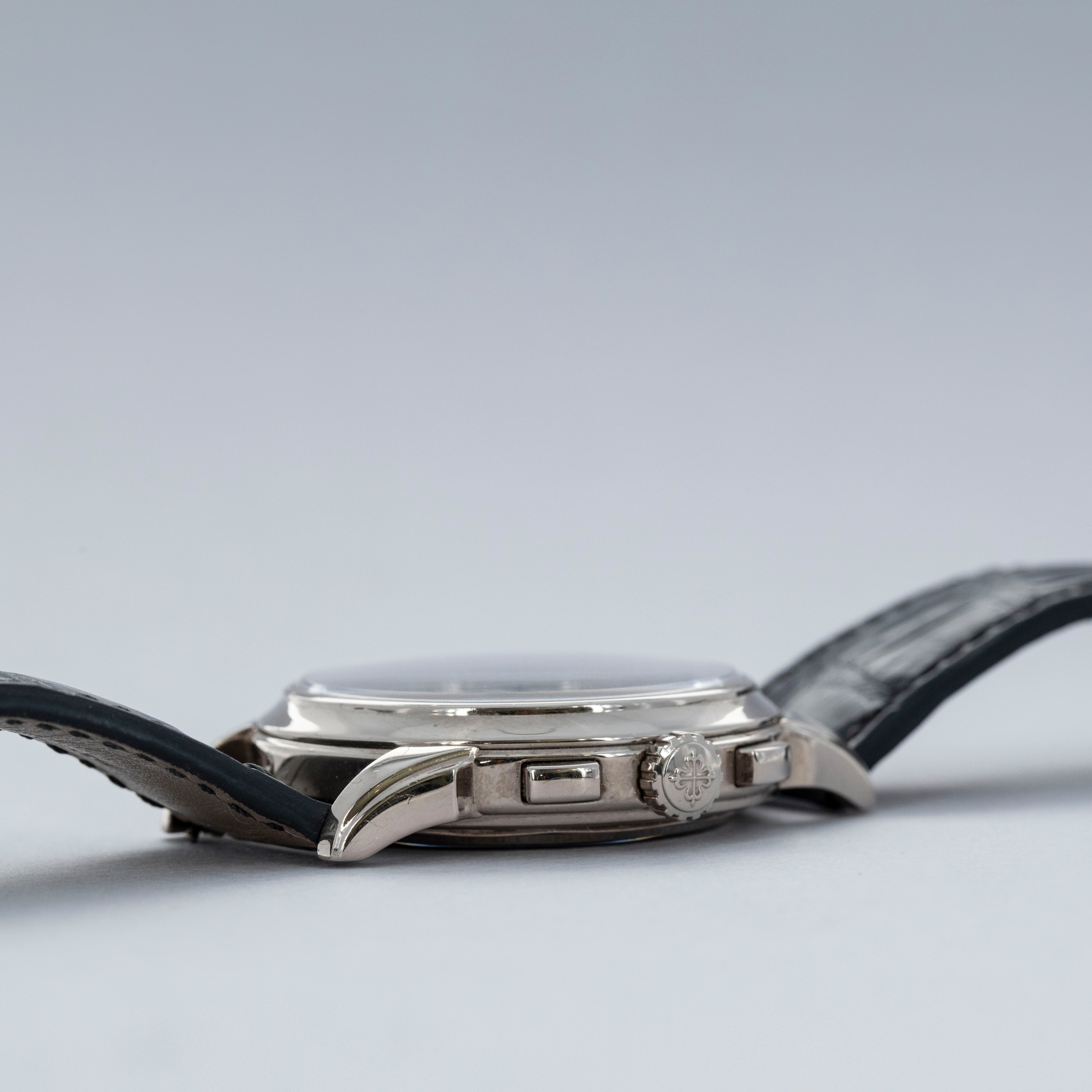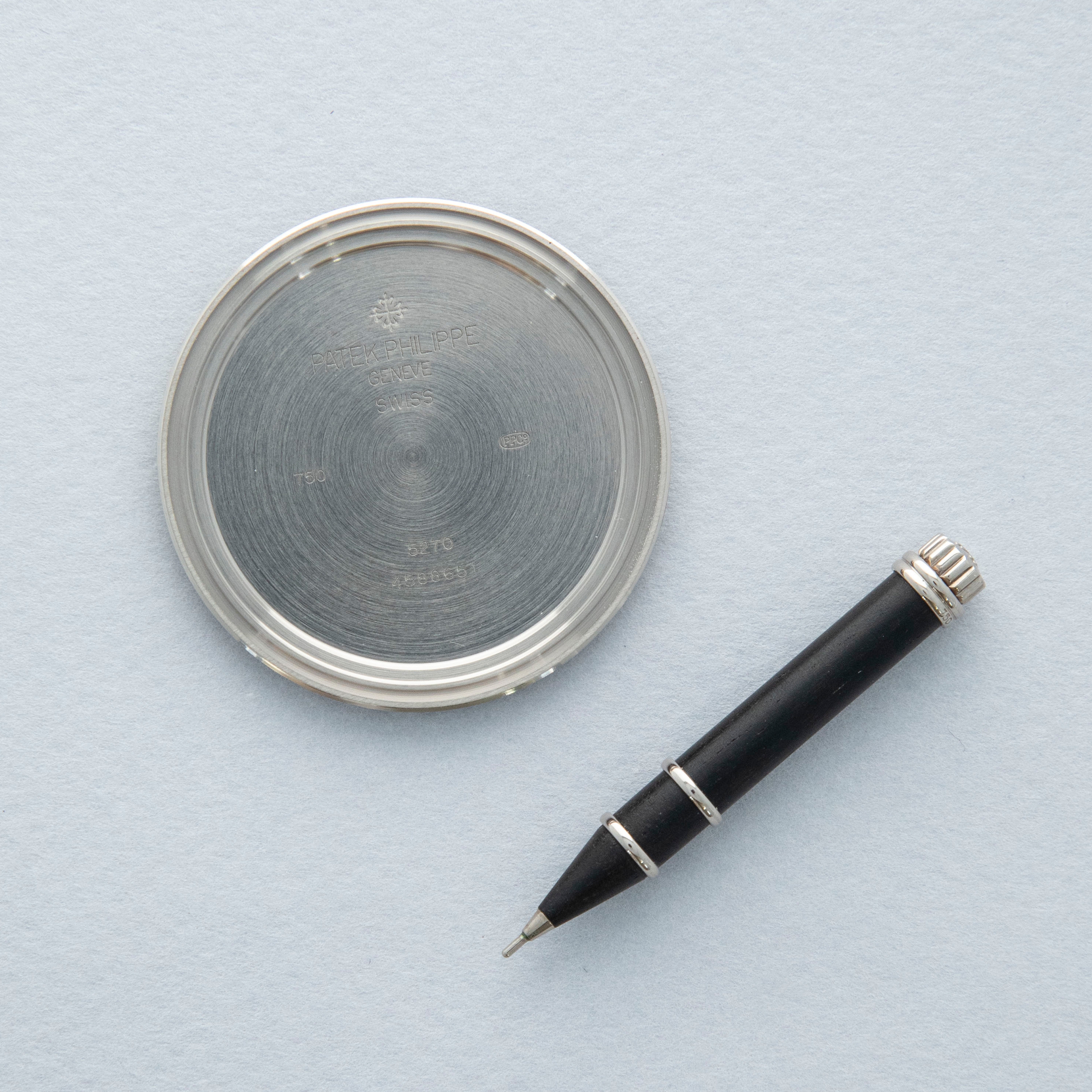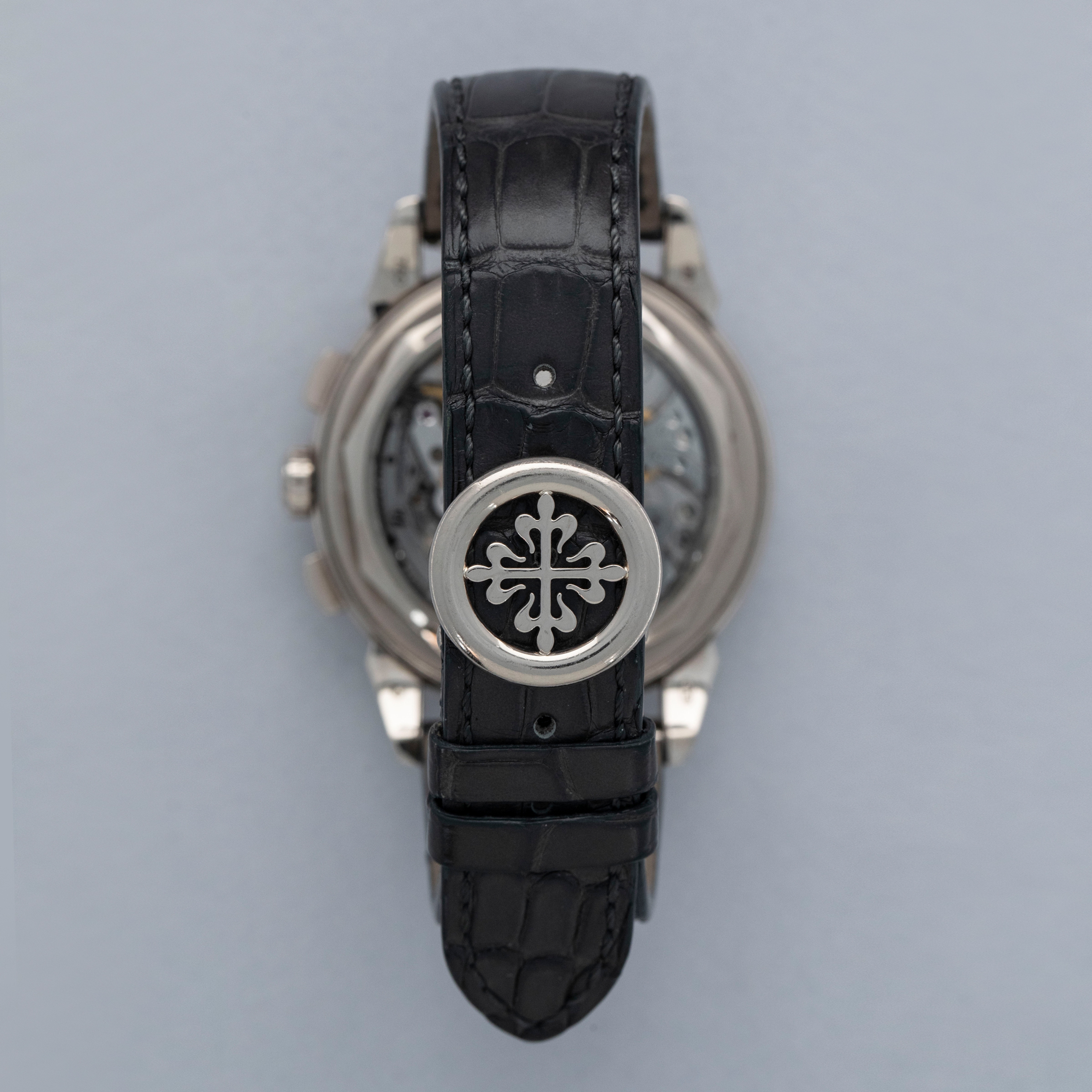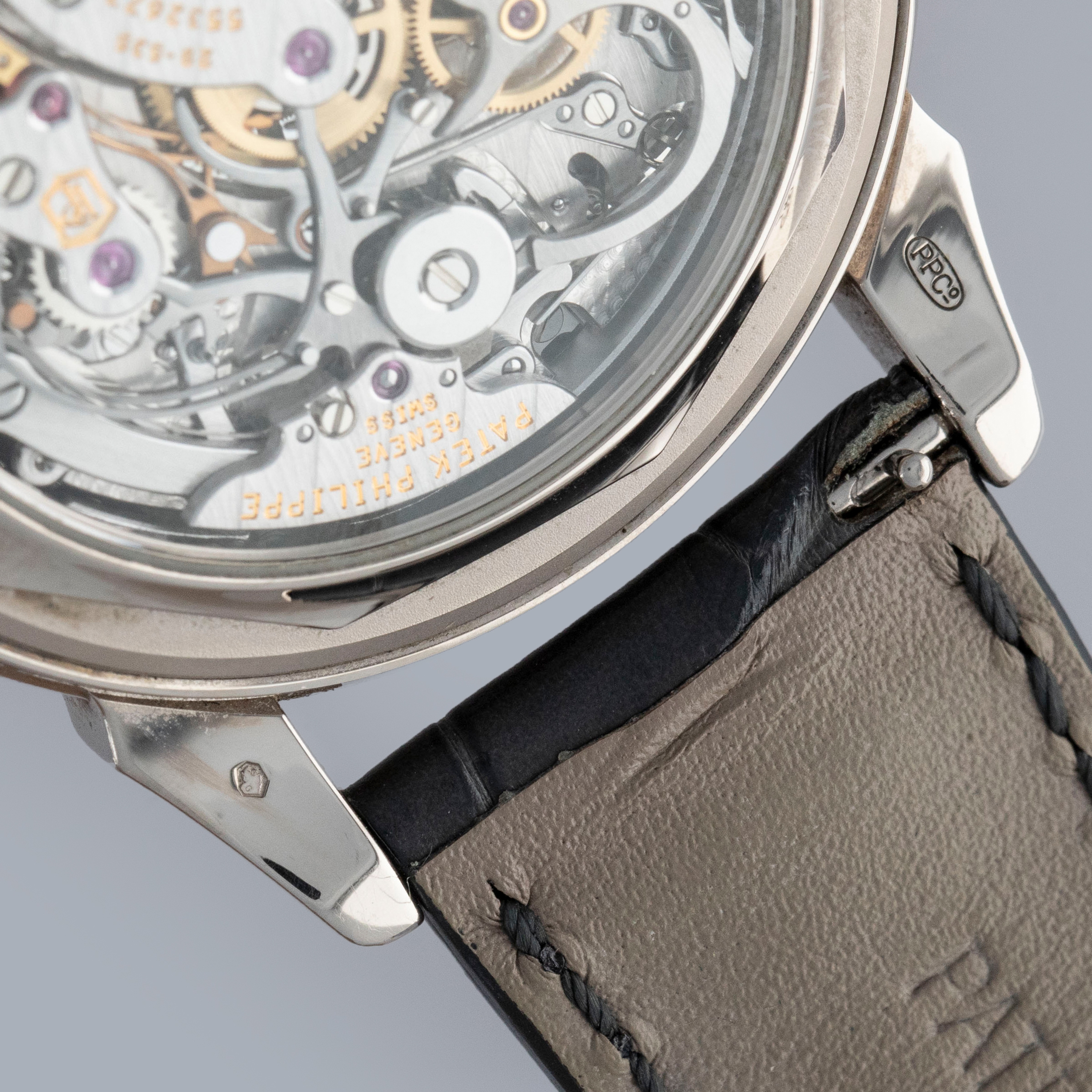 The watch is in overall excellent condition. The white gold case shows light scratches and a couple of small nicks, with crisp hallmarks on the rear of the lugs. The display case back is clean, with some light scratches on the white gold outer edge. The dial and hands are like new. It is fitted with a Patek Philippe alligator strap and a white gold deployant clasp in excellent condition. The watch is accompanied by its inner and outer boxes, original certificate, booklets, wallet, hang tag, spare solid case back, and setting pin.