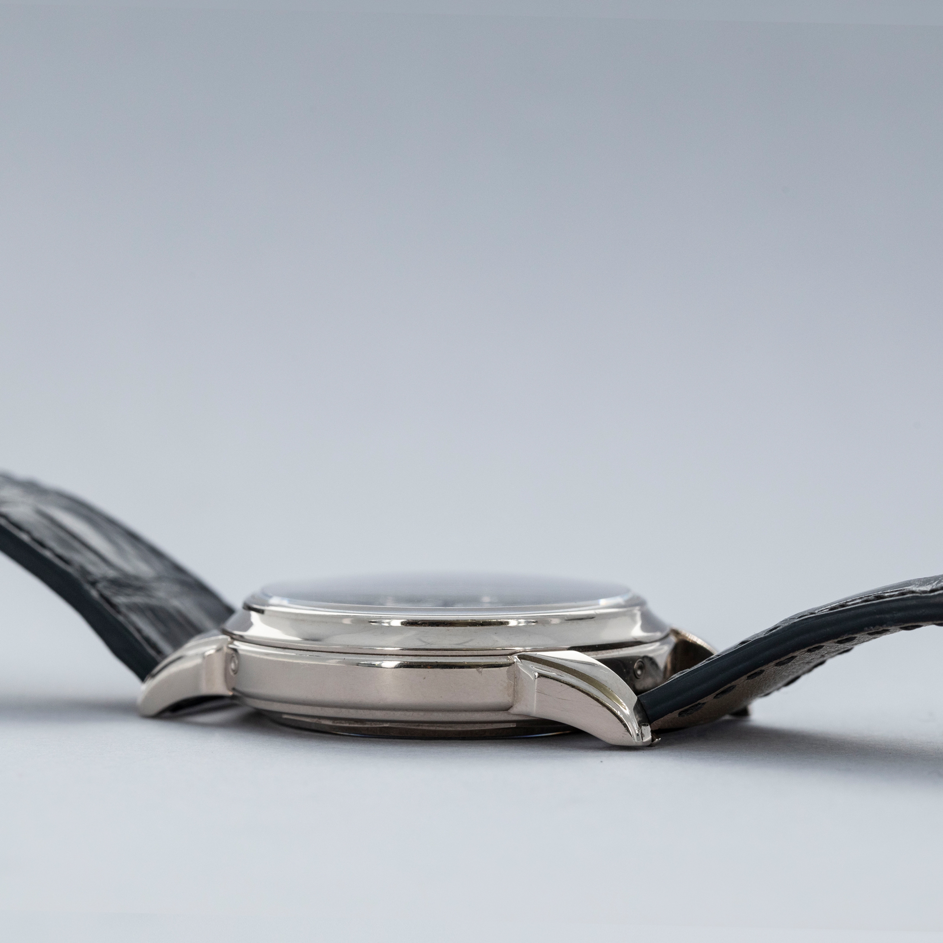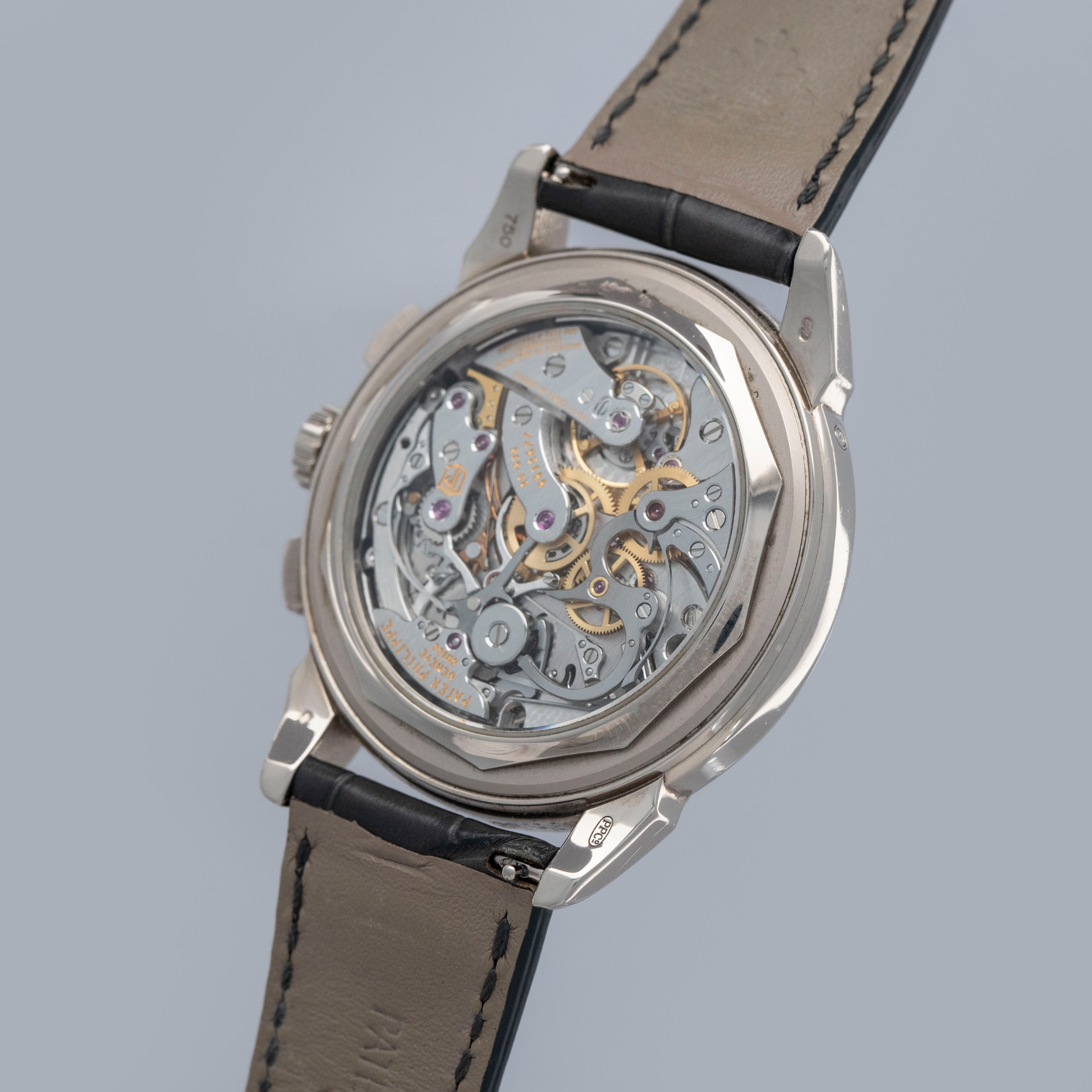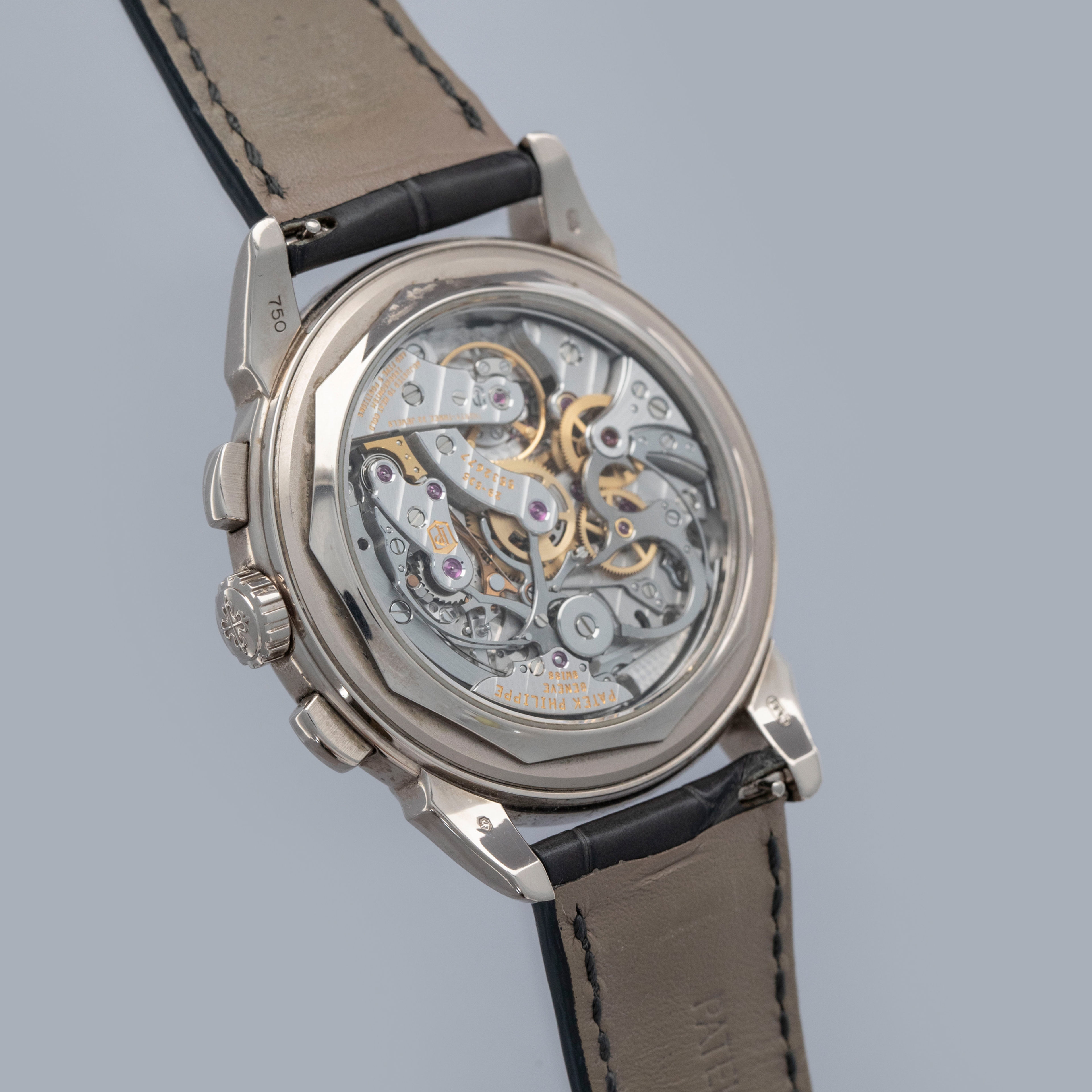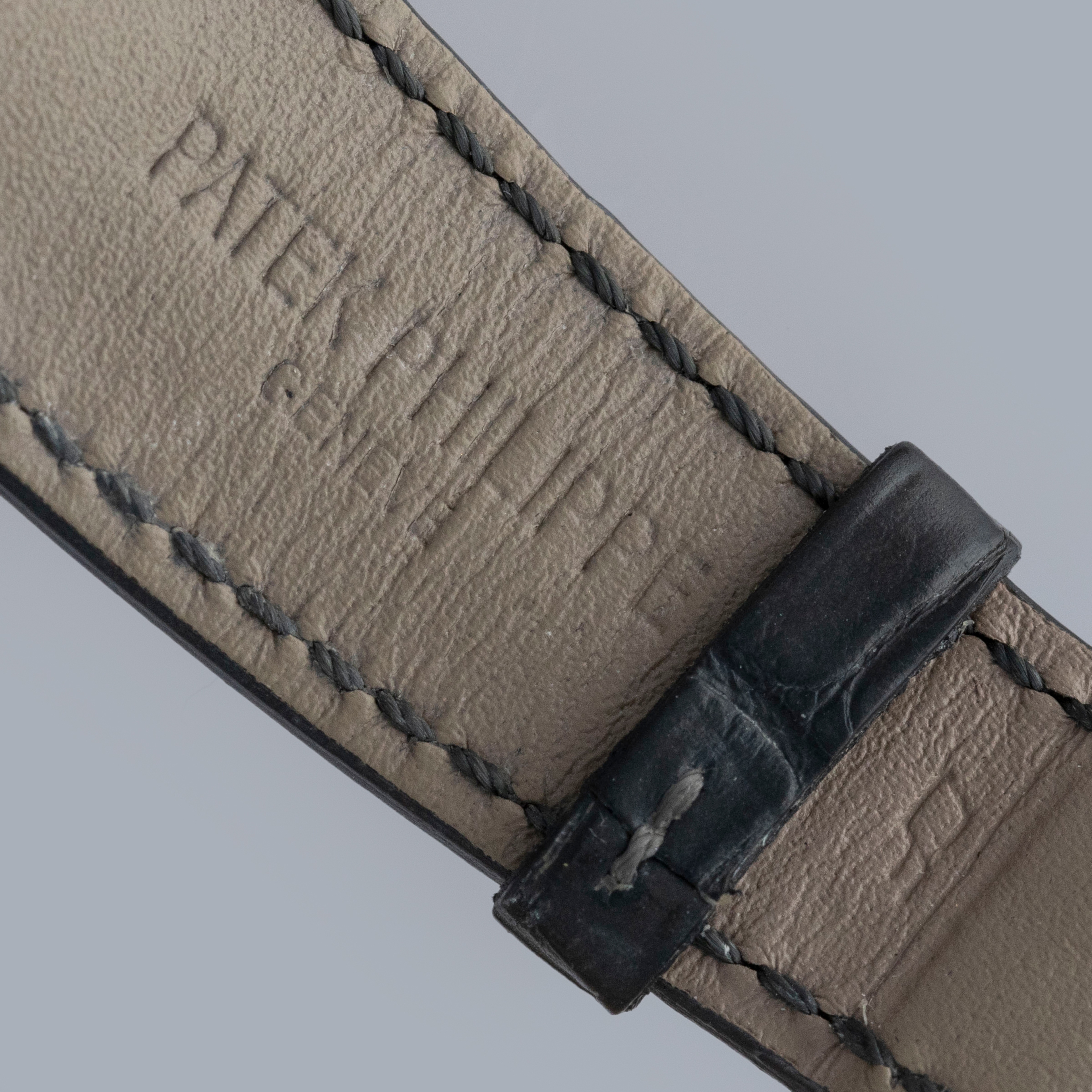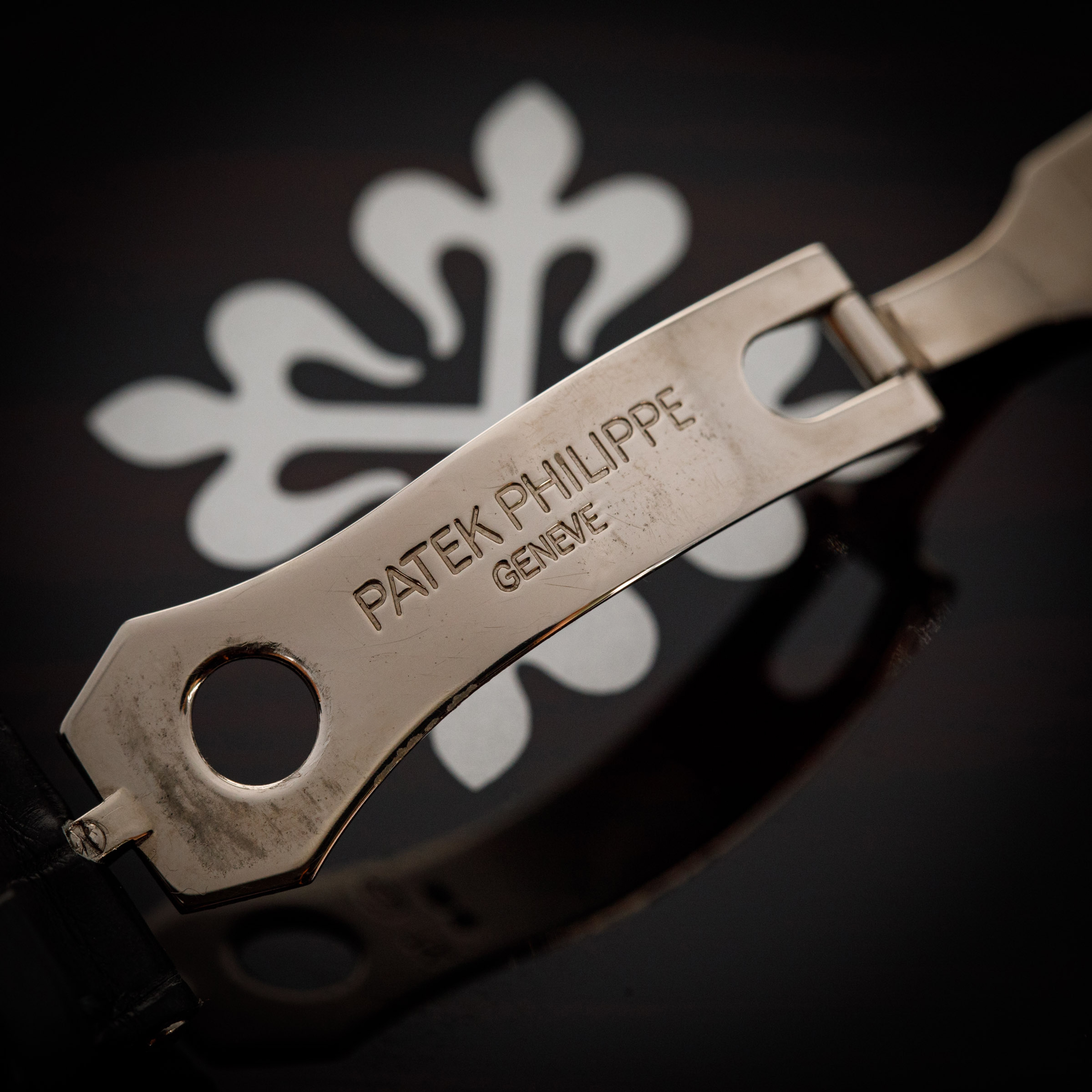 The watch is in overall excellent condition. The white gold case shows light scratches and a couple of small nicks, with crisp hallmarks on the rear of the lugs. The display case back is clean, with some light scratches on the white gold outer edge. The dial and hands are like new. It is fitted with a Patek Philippe alligator strap and a white gold deployant clasp in excellent condition. The watch is accompanied by its inner and outer boxes, original certificate, booklets, wallet, hang tag, spare solid case back, and setting pin.
